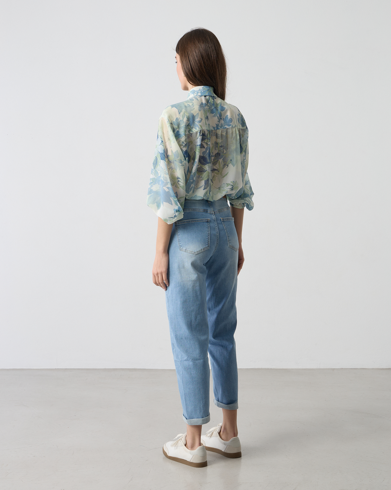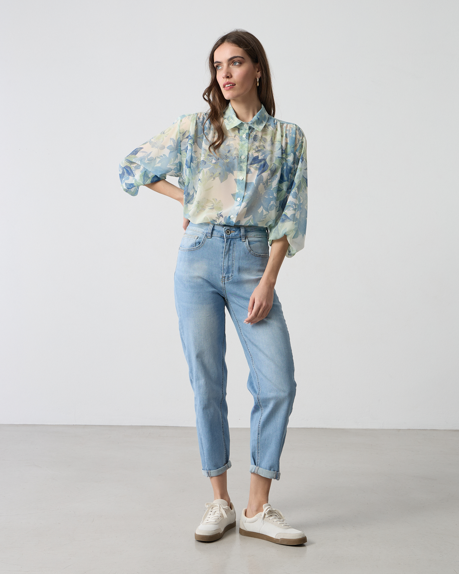 Τζην ψηλόμεσο mom fit με τσέπες, κλείσιμο με φερμουάρ και κουμπί, σε κανονική γραμμή