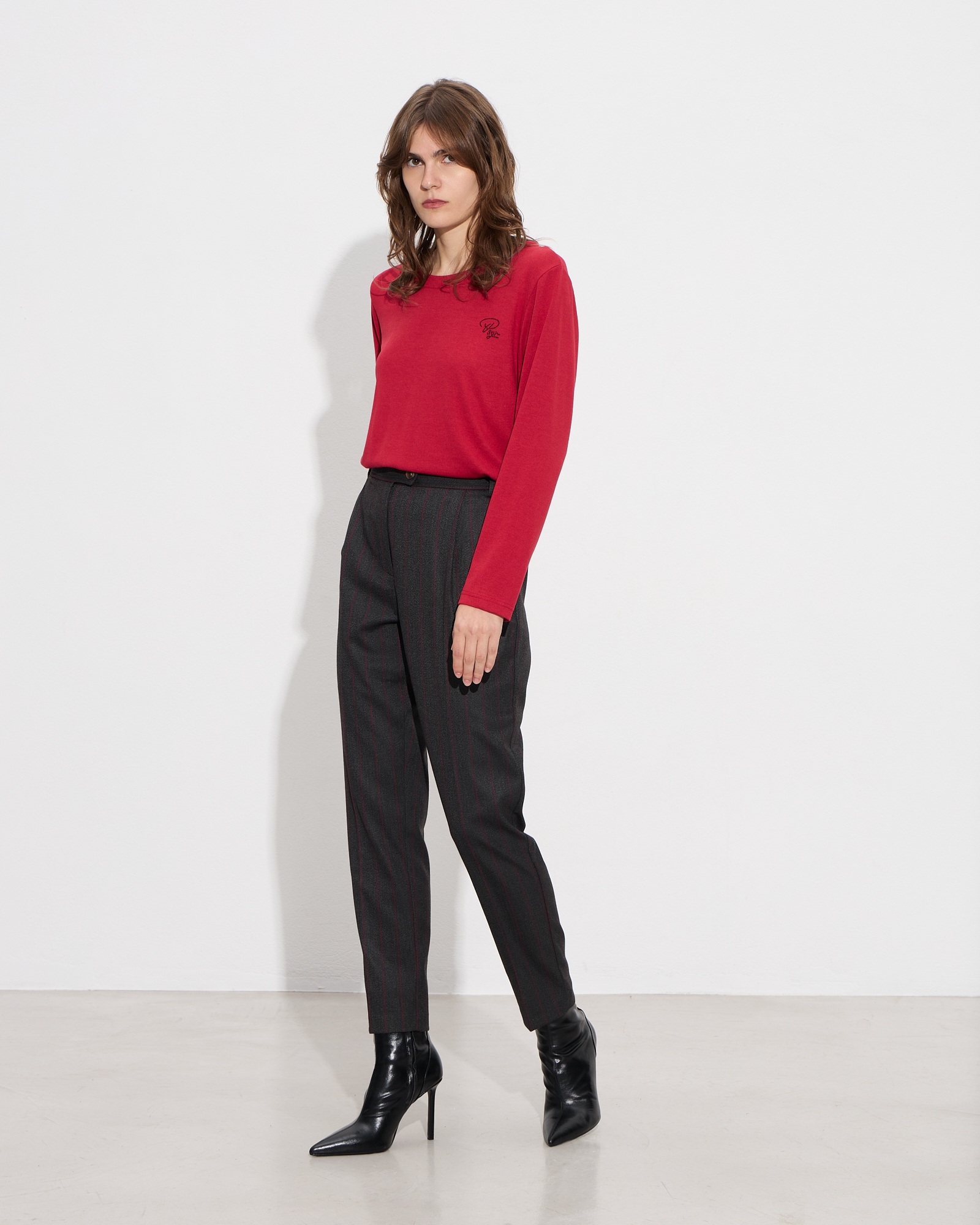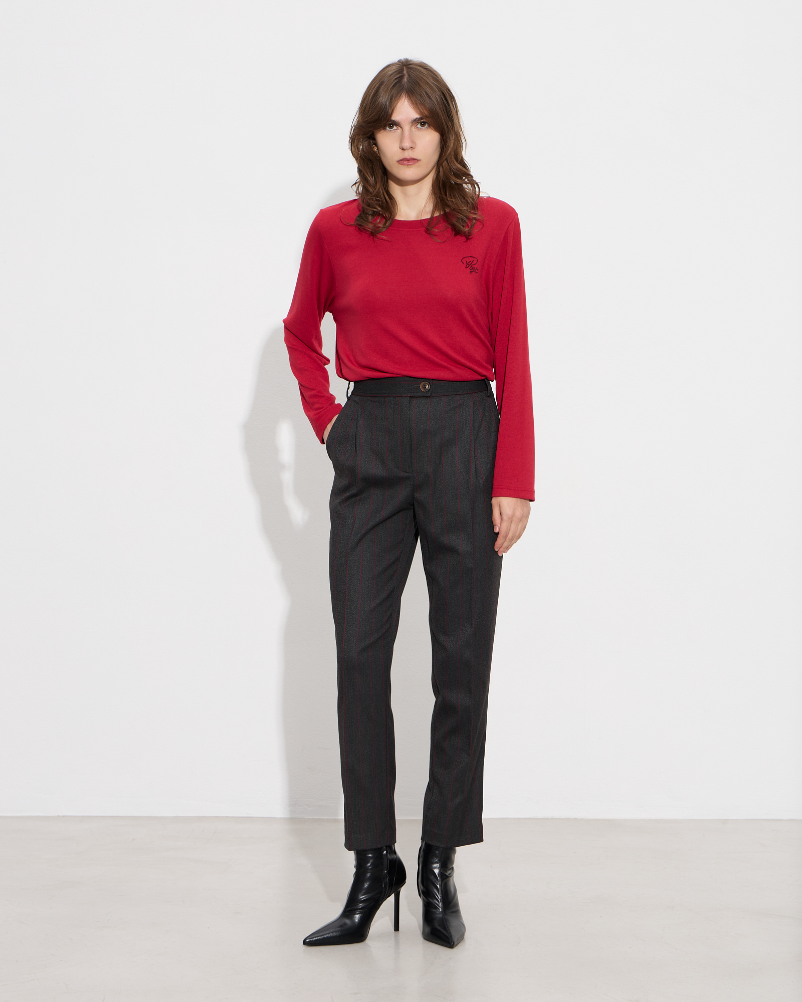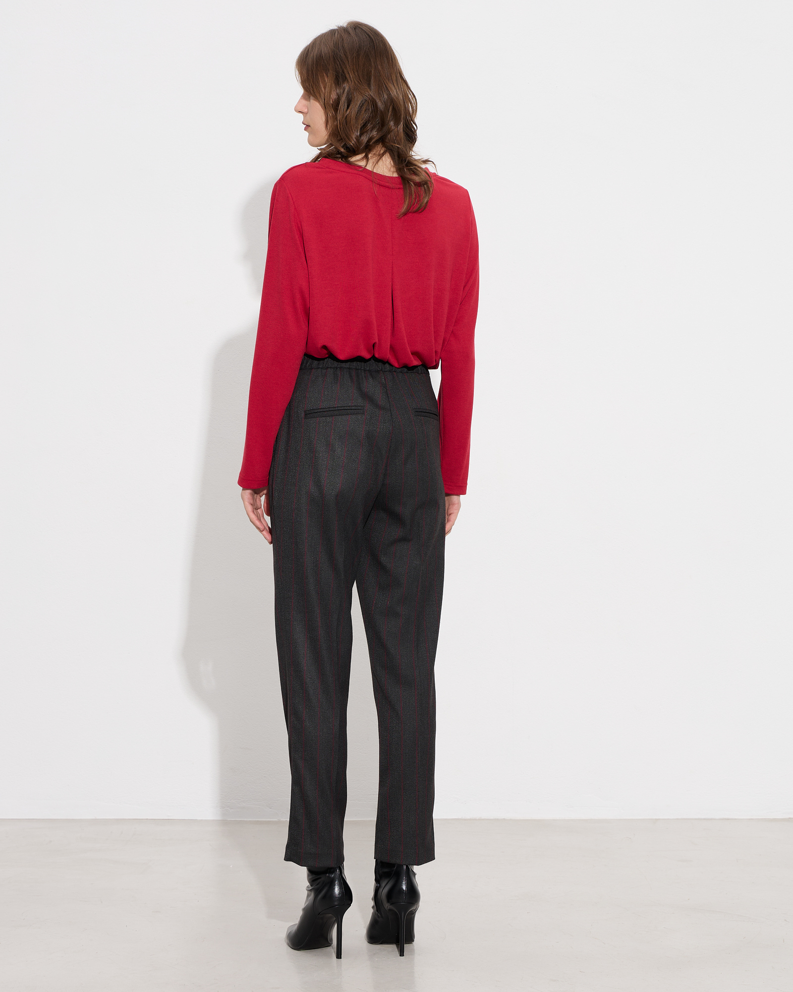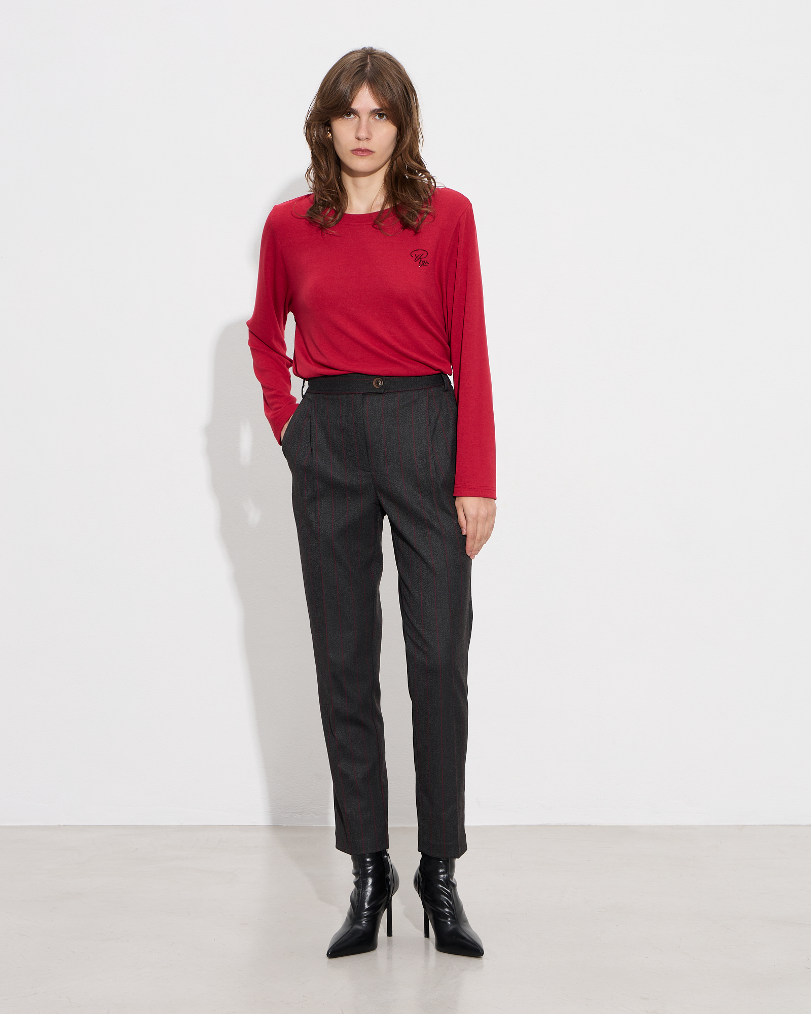 Παντελόνι ψηλόμεσο ρίγα cigarette με πιέτες και πλαϊνές τσέπες, κλείσιμο με κουμπί και φερμουάρ μπροστά, σε κανονική γραμμή
