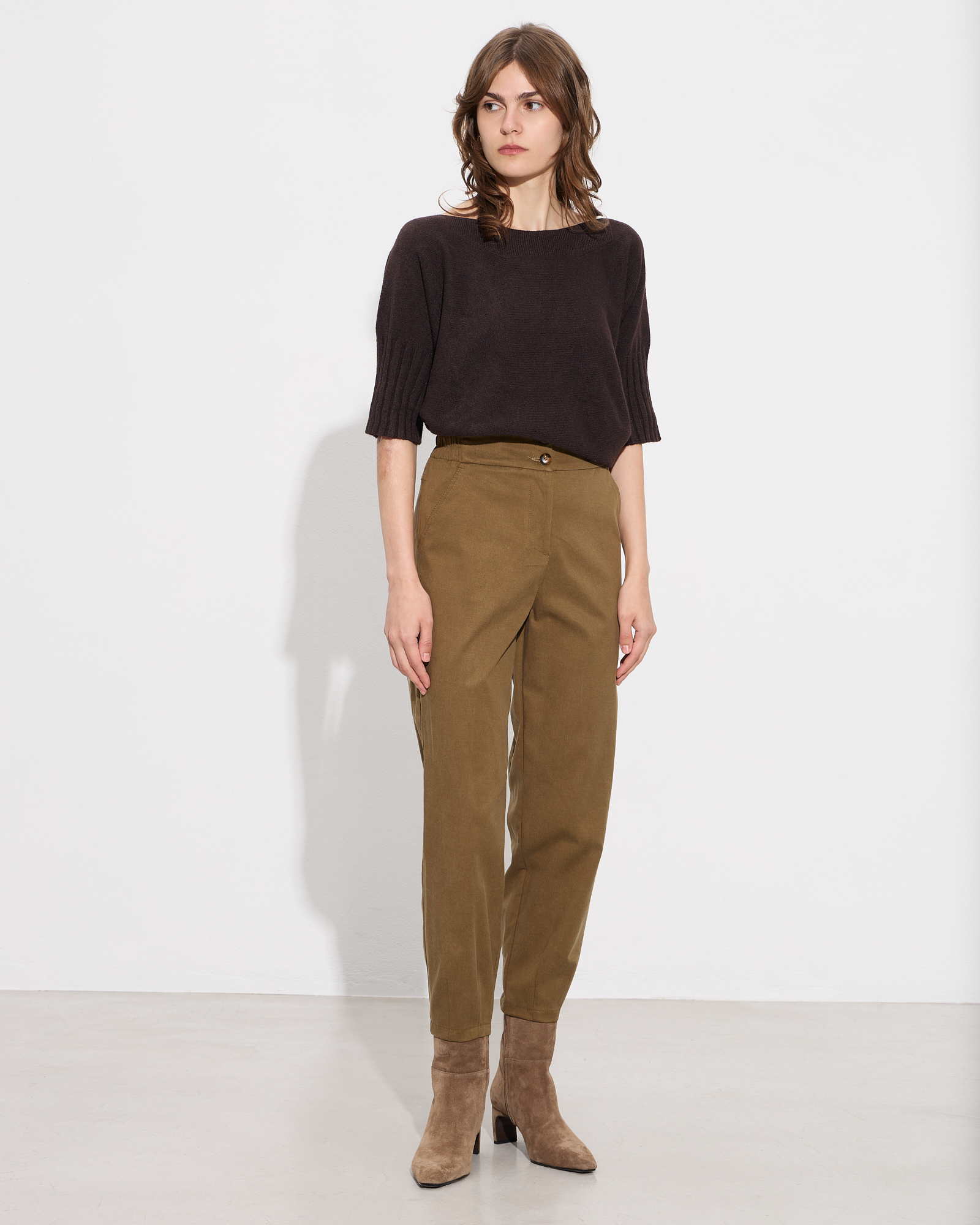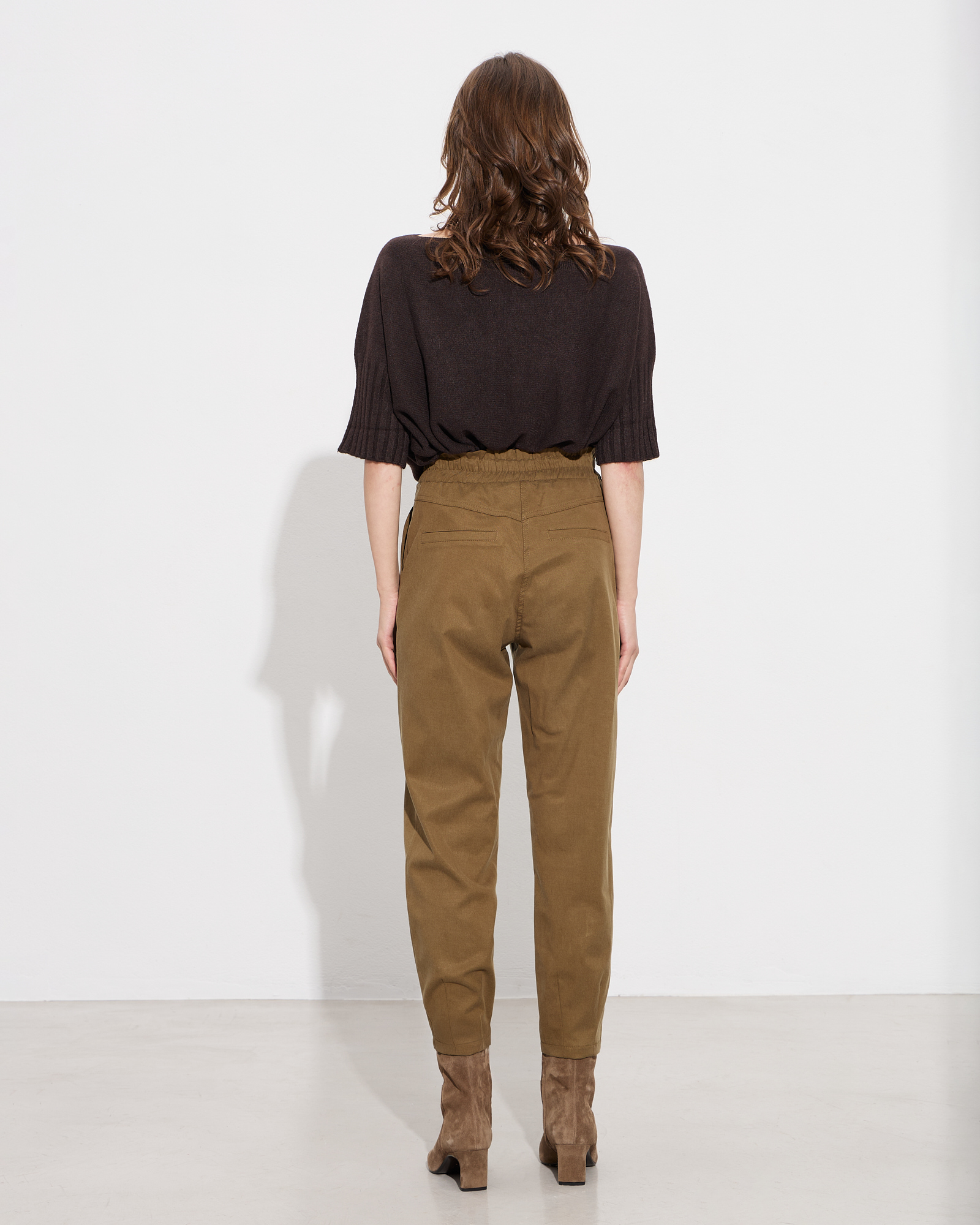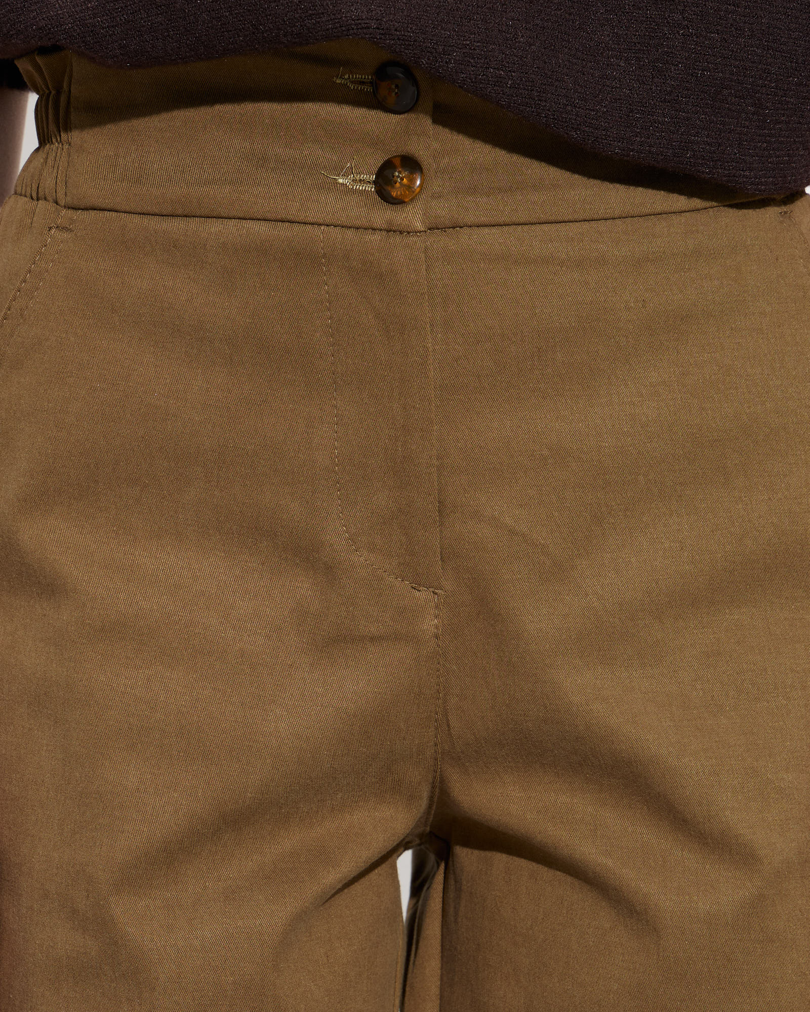 Παντελόνι ψηλόμεσο με λάστιχο στο πίσω μέρος, κλείσιμο με διπλό κουμπί και φερμουάρ, πλαϊνές τσέπες, μέχρι στον αστράγαλο, σε κανονική γραμμή
