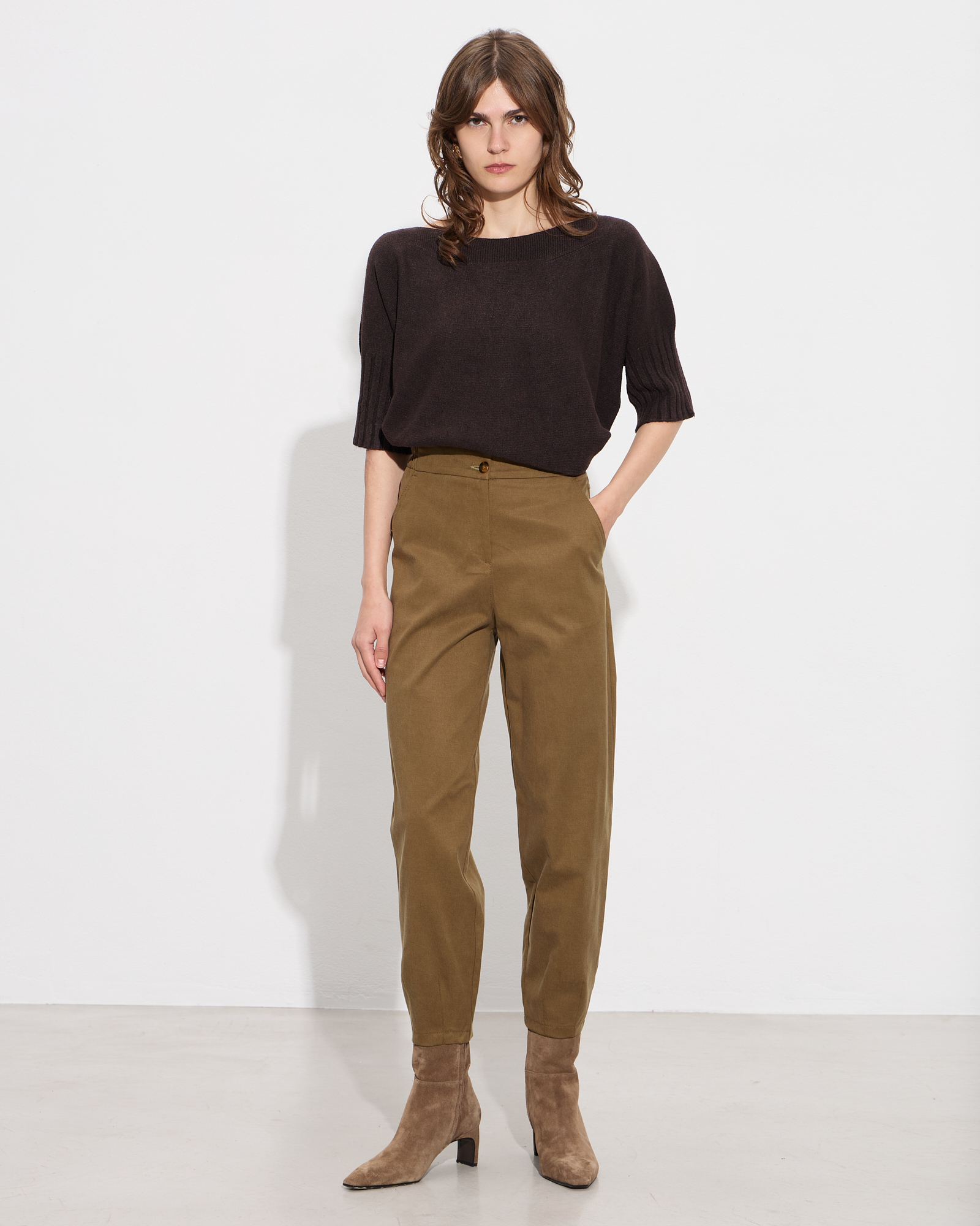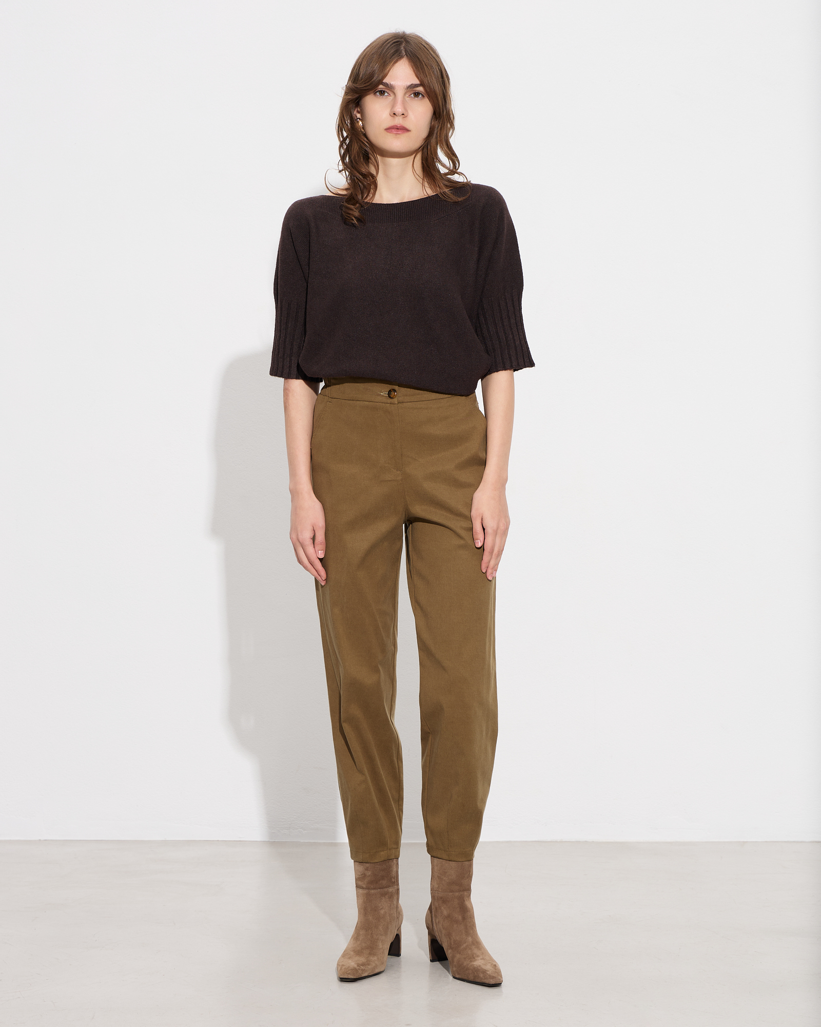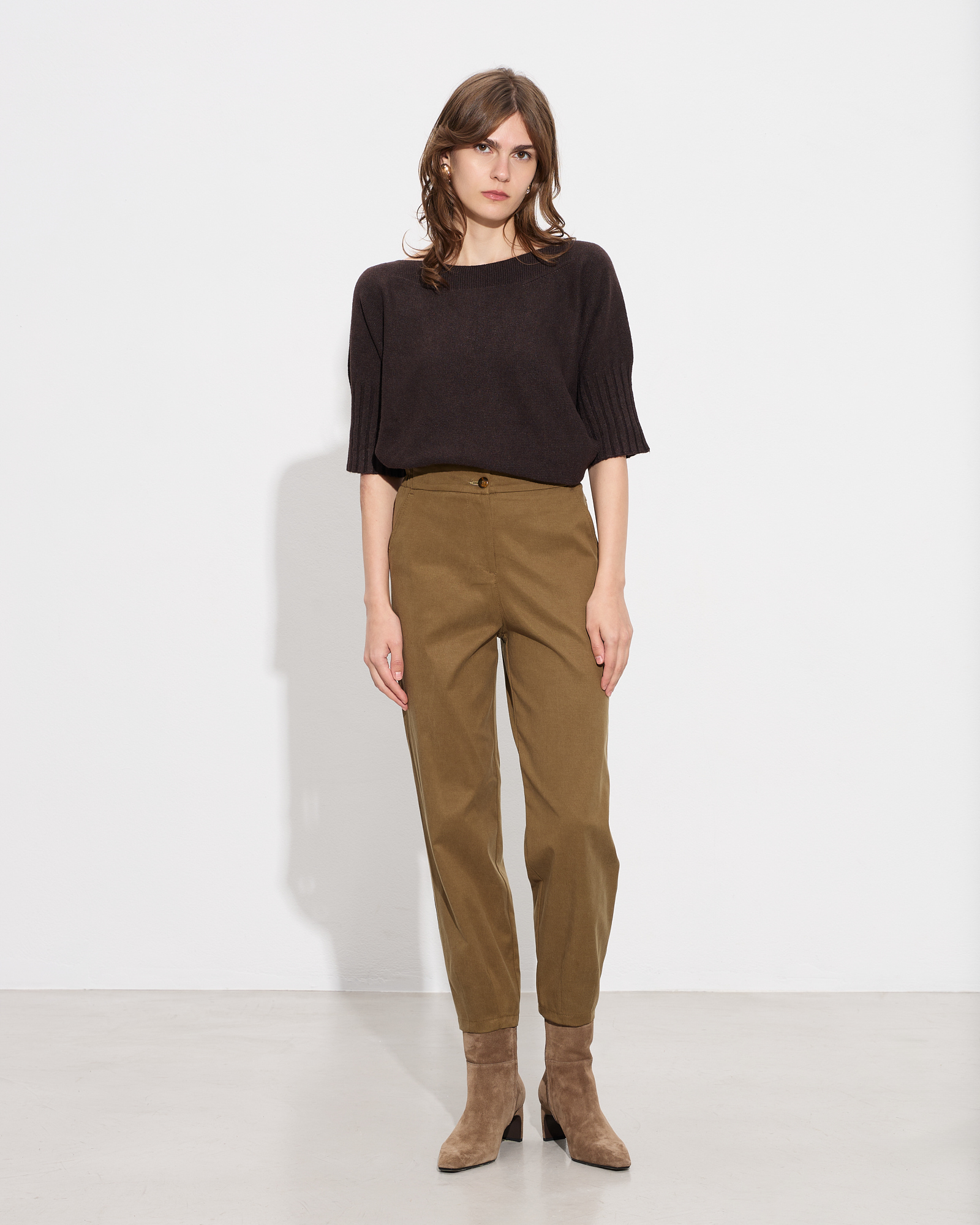 Παντελόνι ψηλόμεσο με λάστιχο στο πίσω μέρος, κλείσιμο με διπλό κουμπί και φερμουάρ, πλαϊνές τσέπες, μέχρι στον αστράγαλο, σε κανονική γραμμή