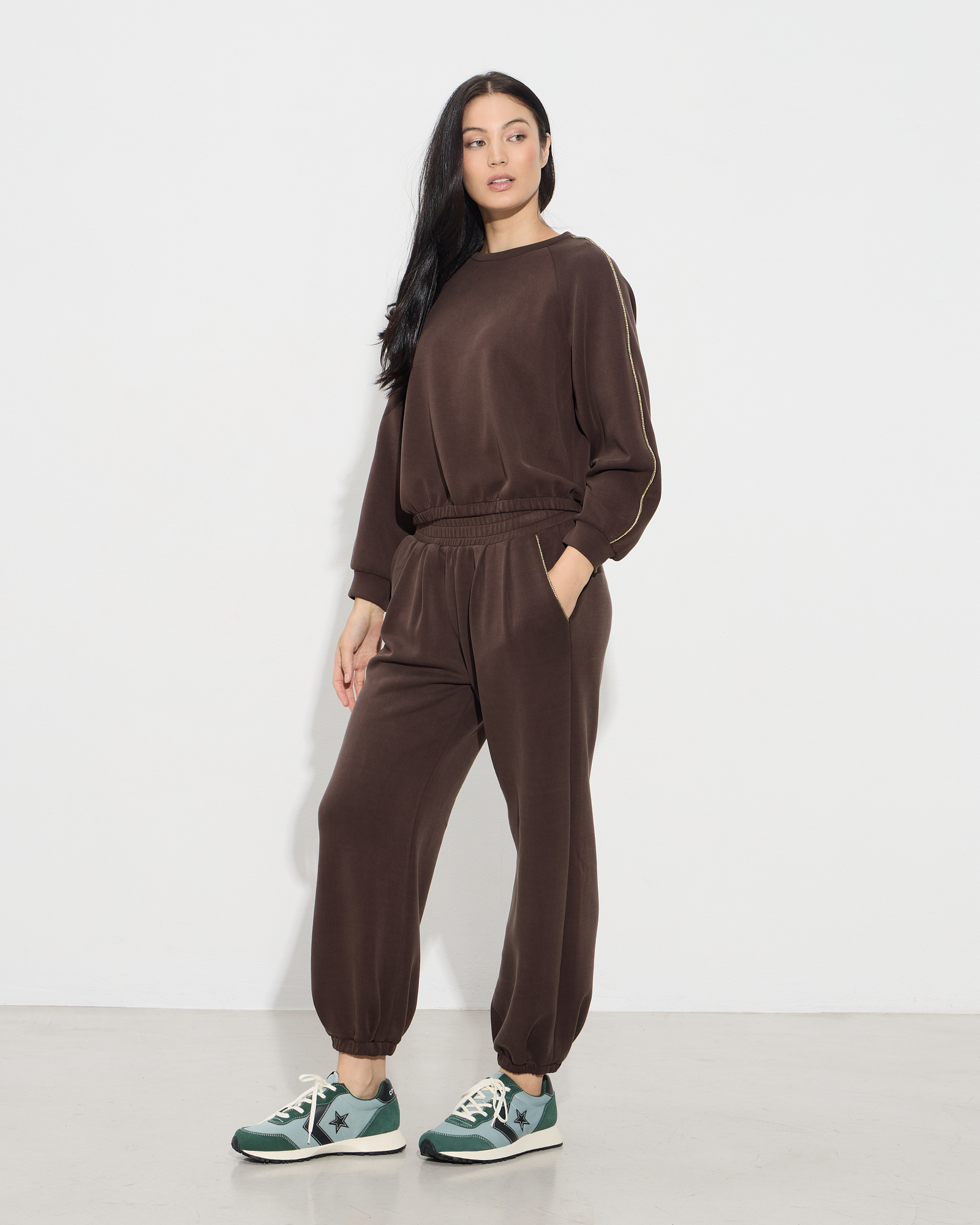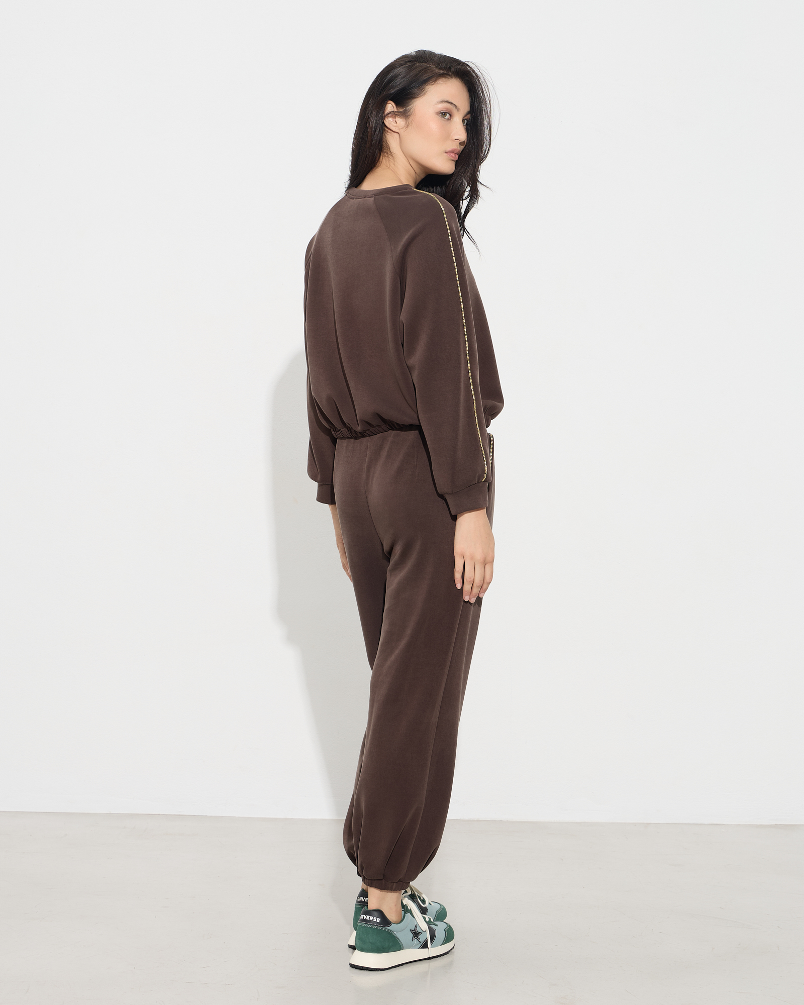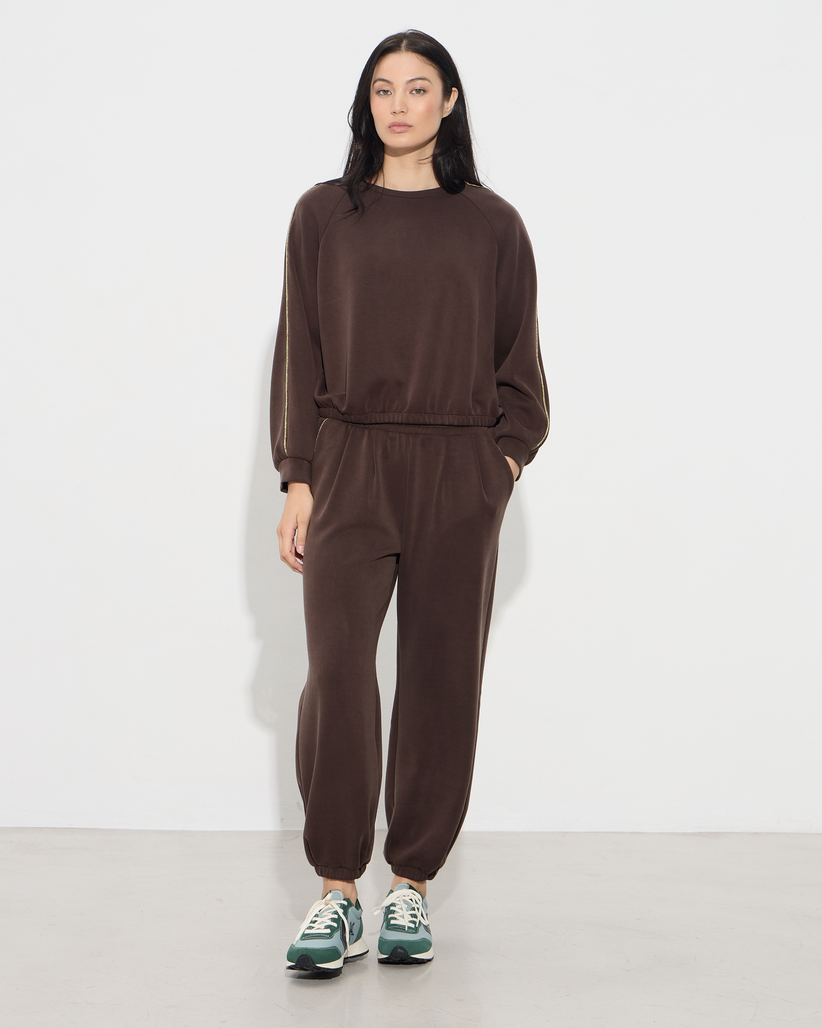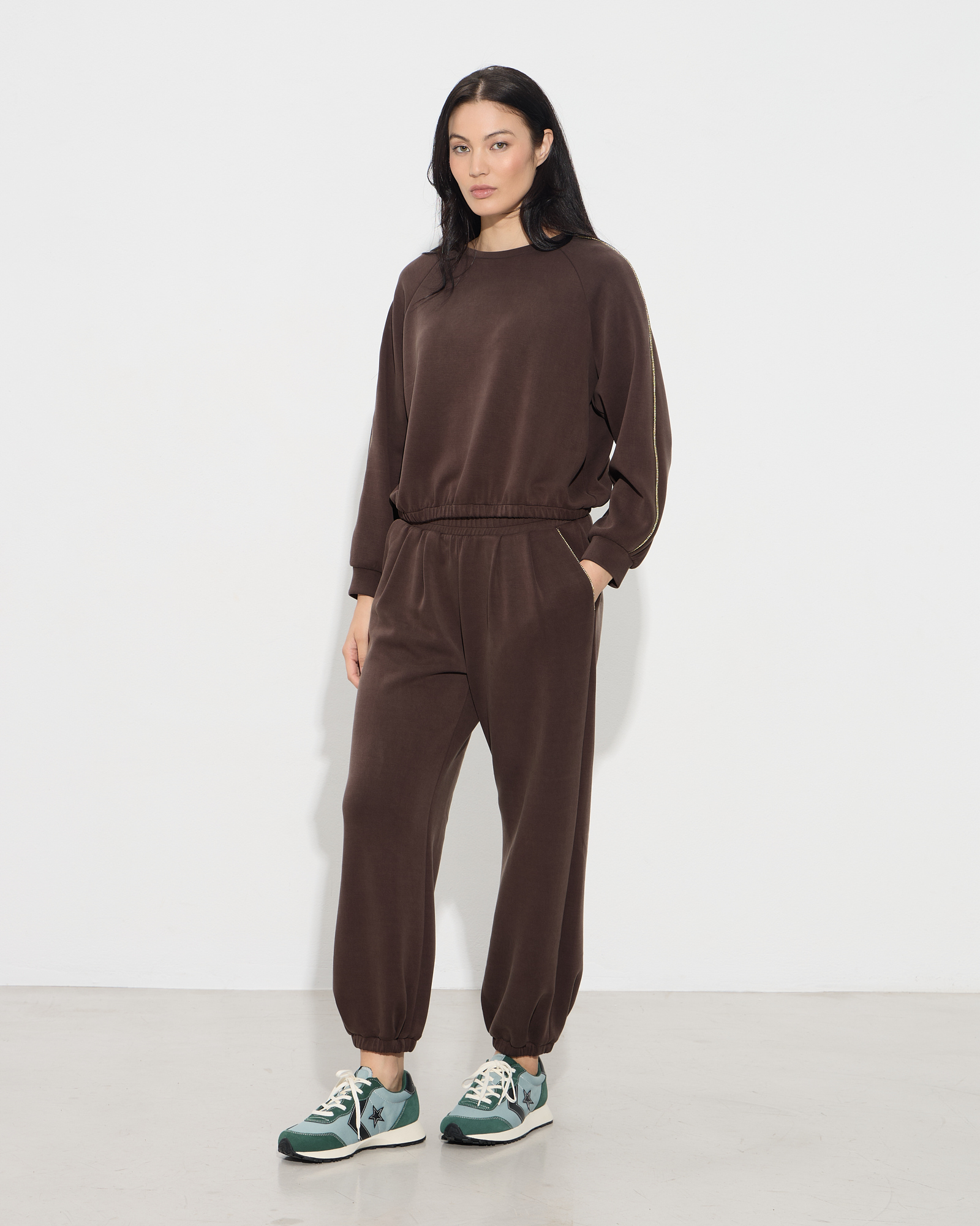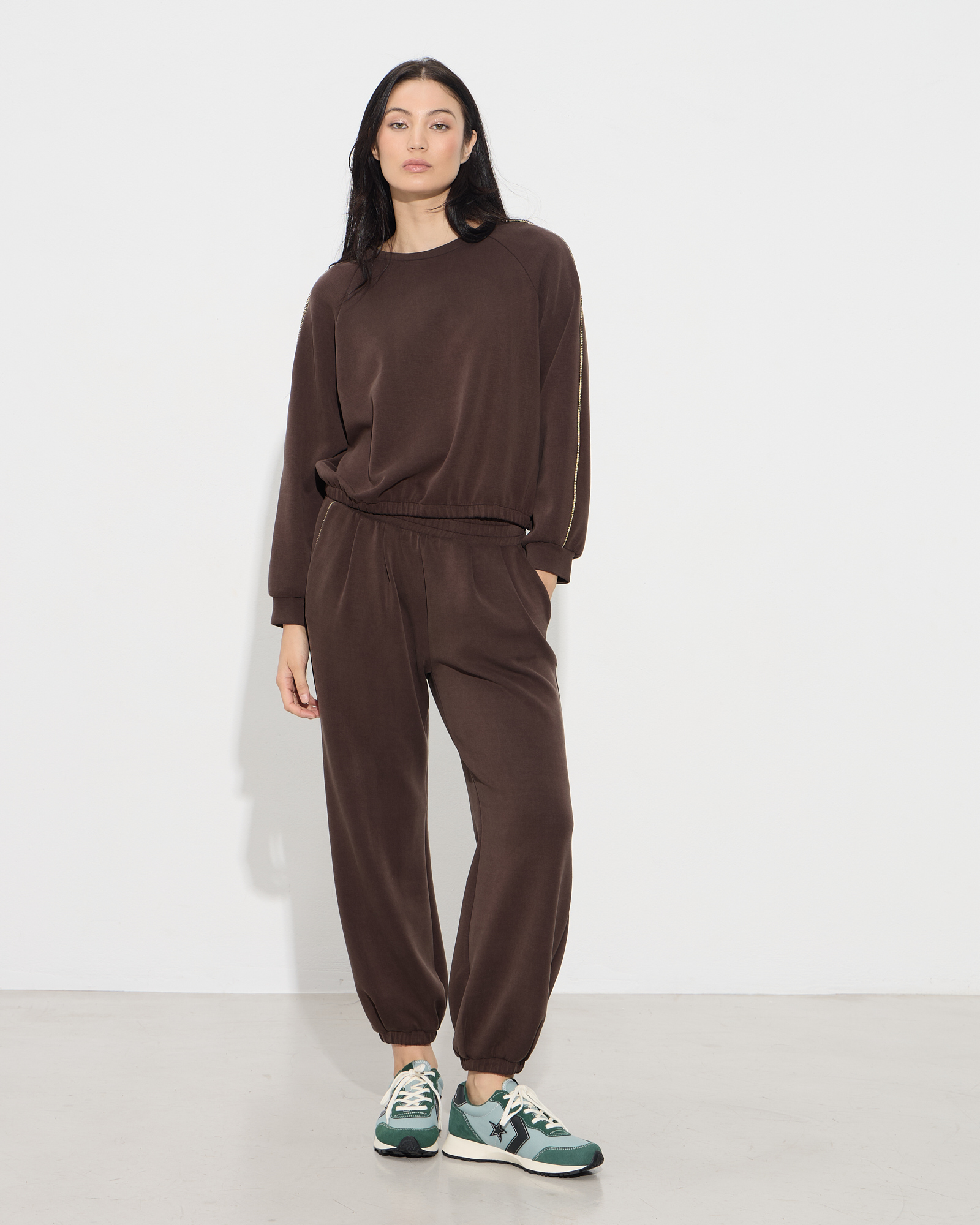 Παντελόνι με ψηλή μέση και ελαστική ζώνη, με πιέτες στο μπροστινό μέρος, πλαϊνές τσέπες και λάστιχο στο τελείωμα, σε φαρδιά γραμμή