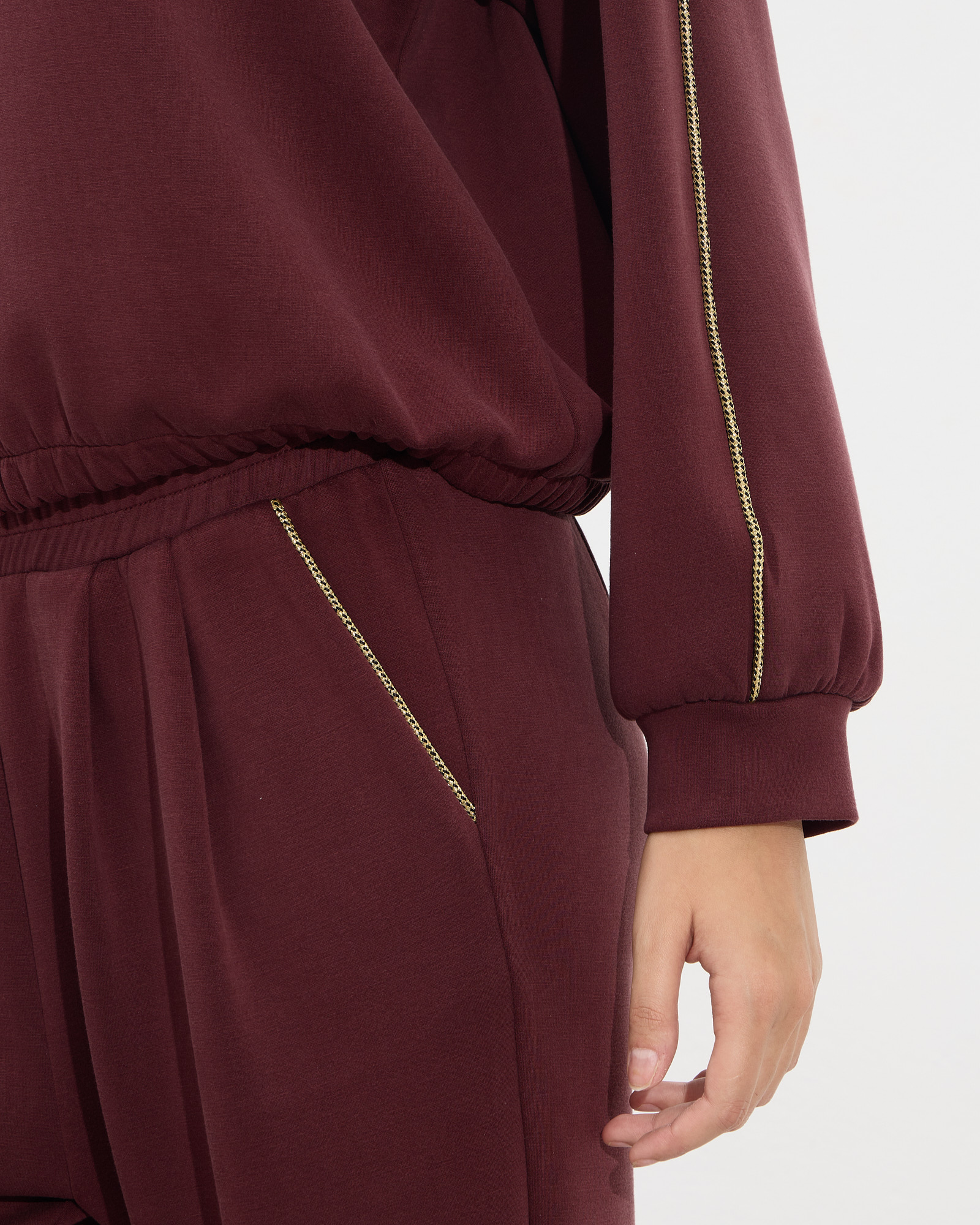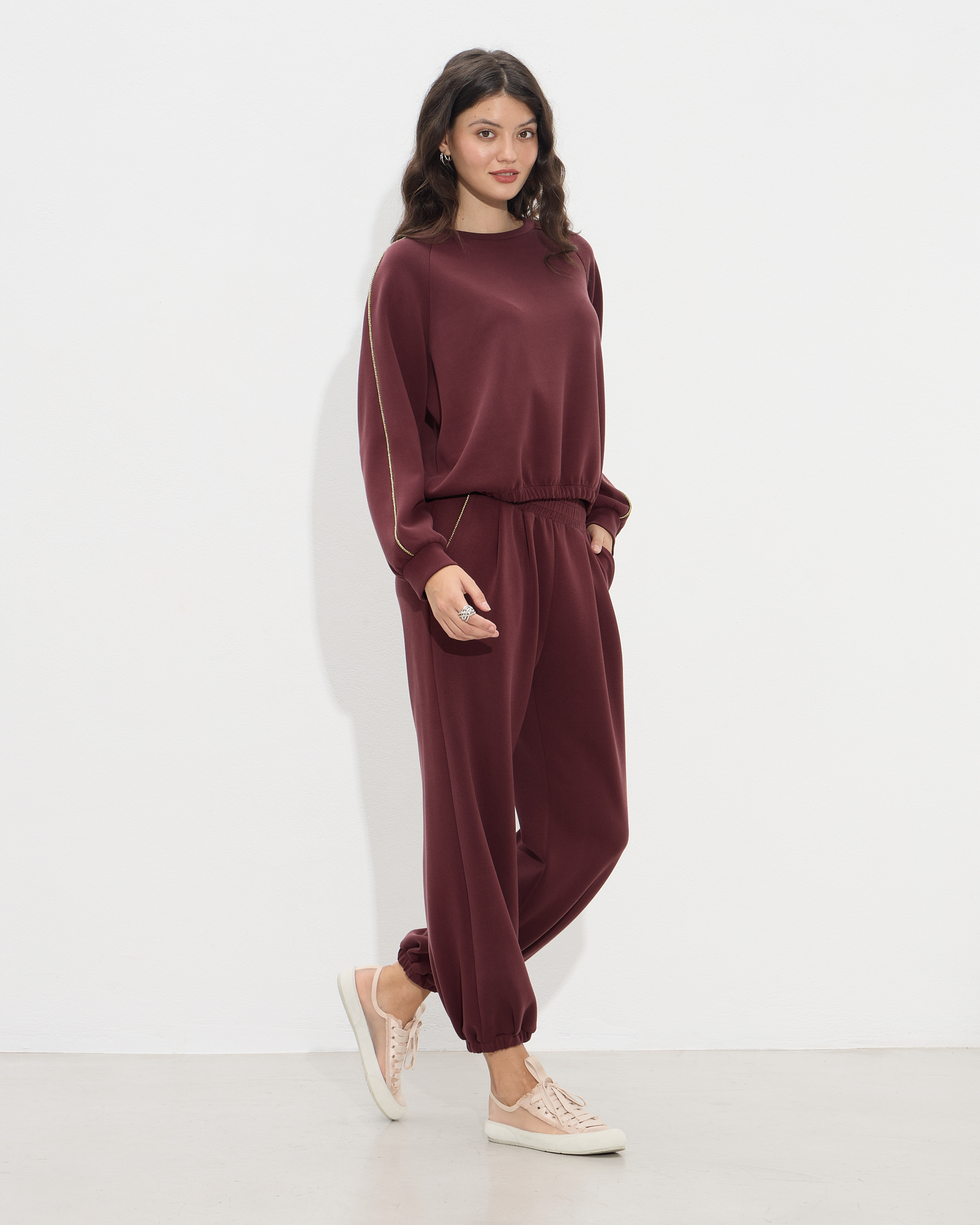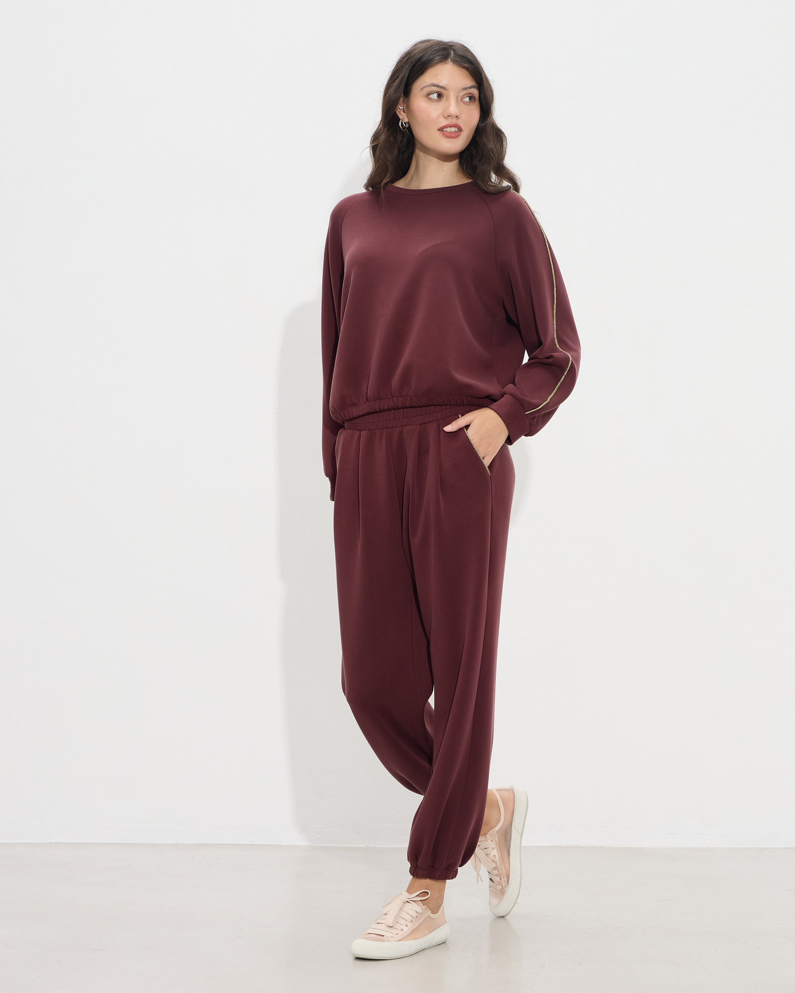 Παντελόνι με ψηλή μέση και ελαστική ζώνη, με πιέτες στο μπροστινό μέρος, πλαϊνές τσέπες και λάστιχο στο τελείωμα, σε φαρδιά γραμμή