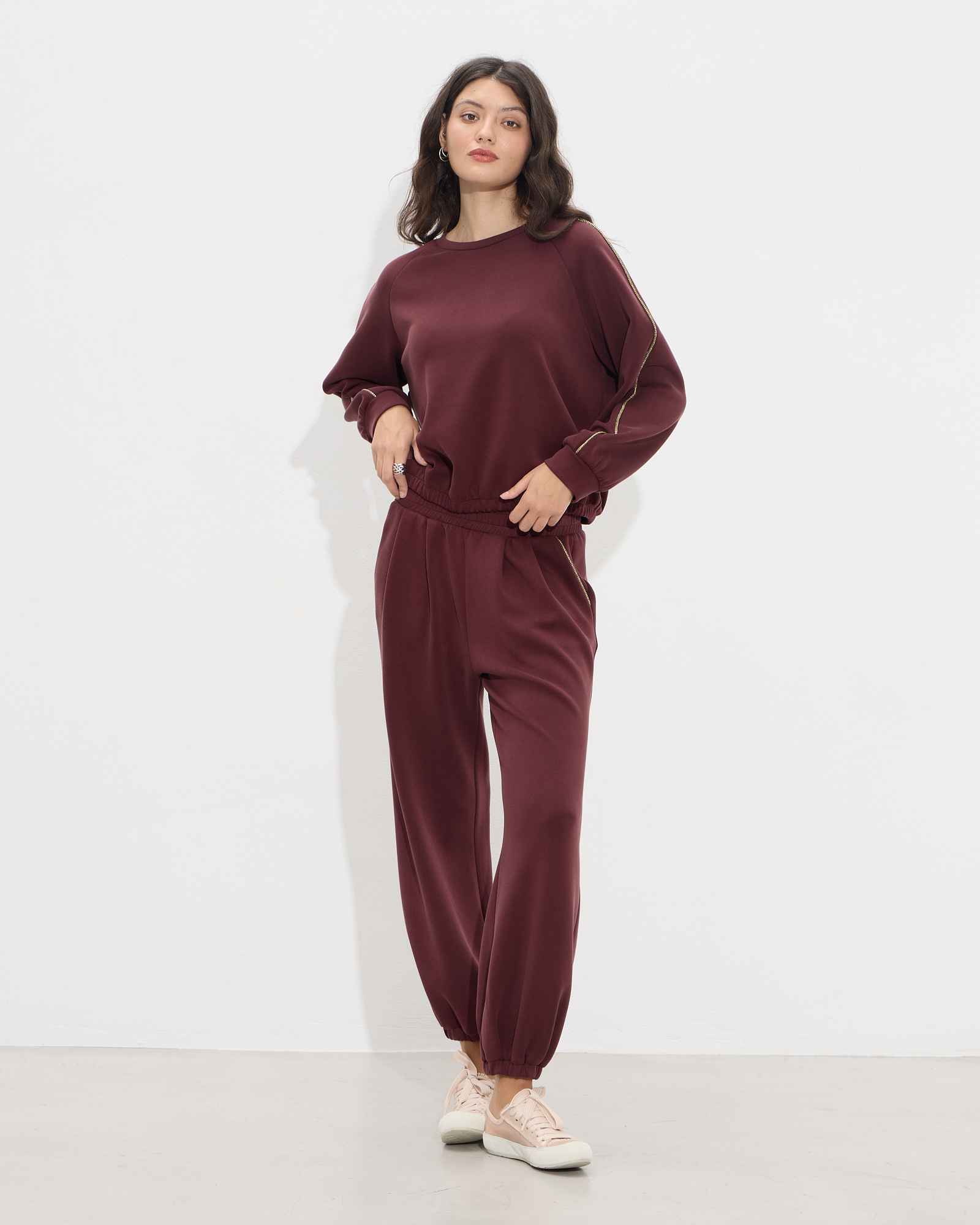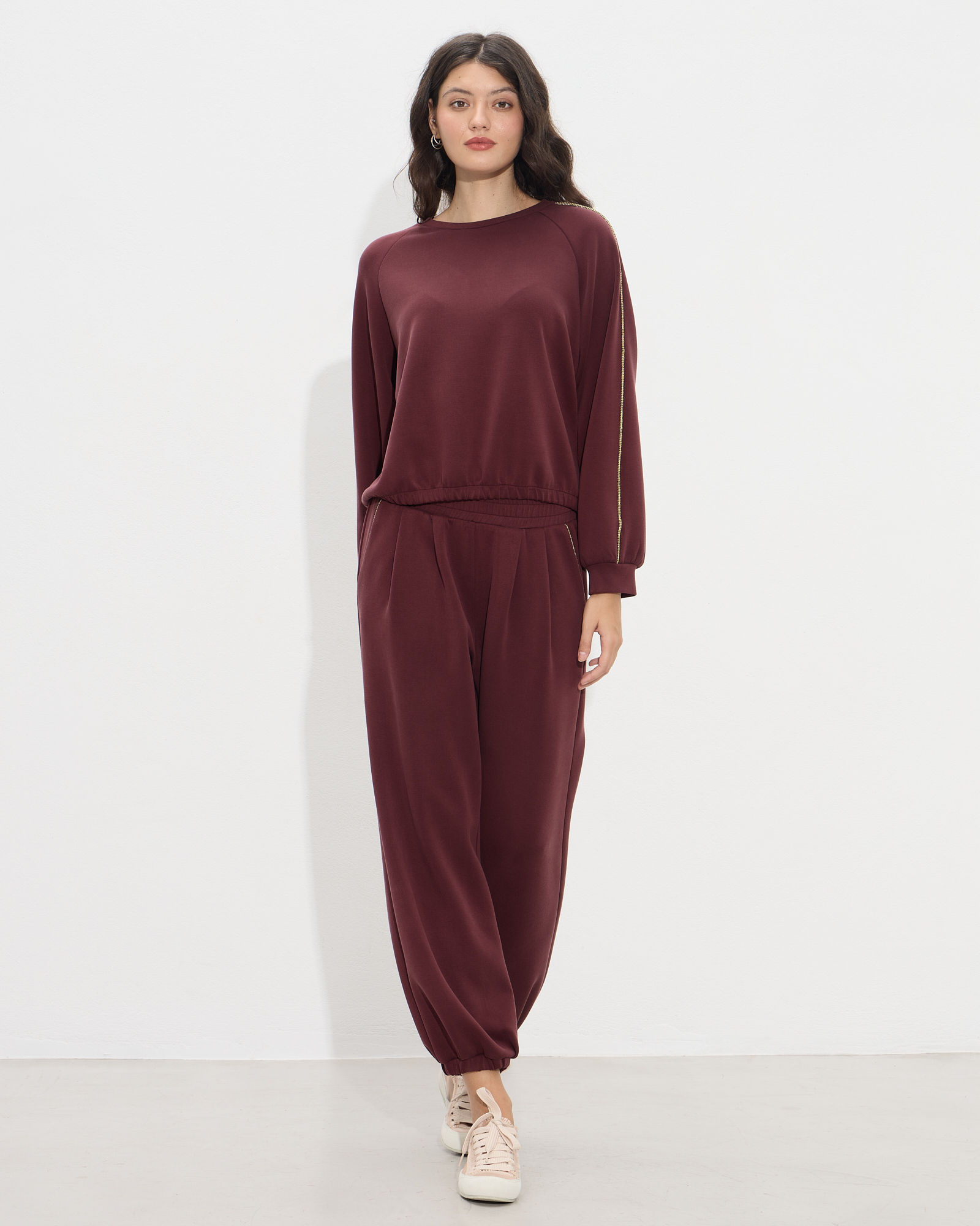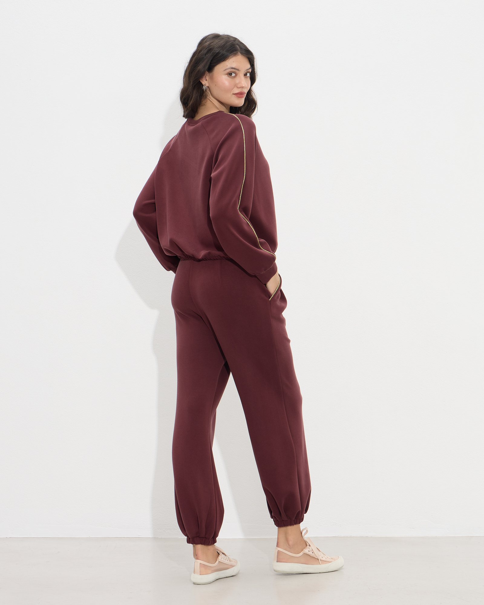 Παντελόνι με ψηλή μέση και ελαστική ζώνη, με πιέτες στο μπροστινό μέρος, πλαϊνές τσέπες και λάστιχο στο τελείωμα, σε φαρδιά γραμμή