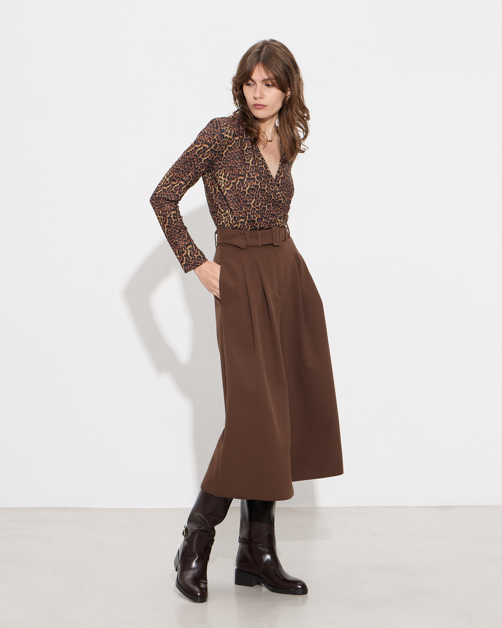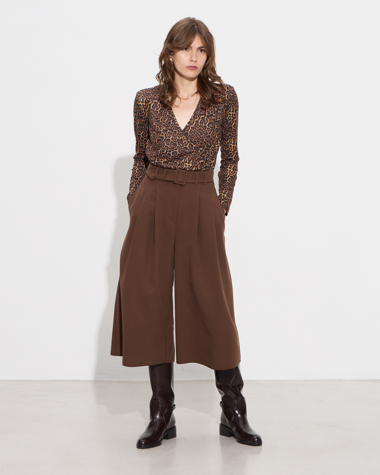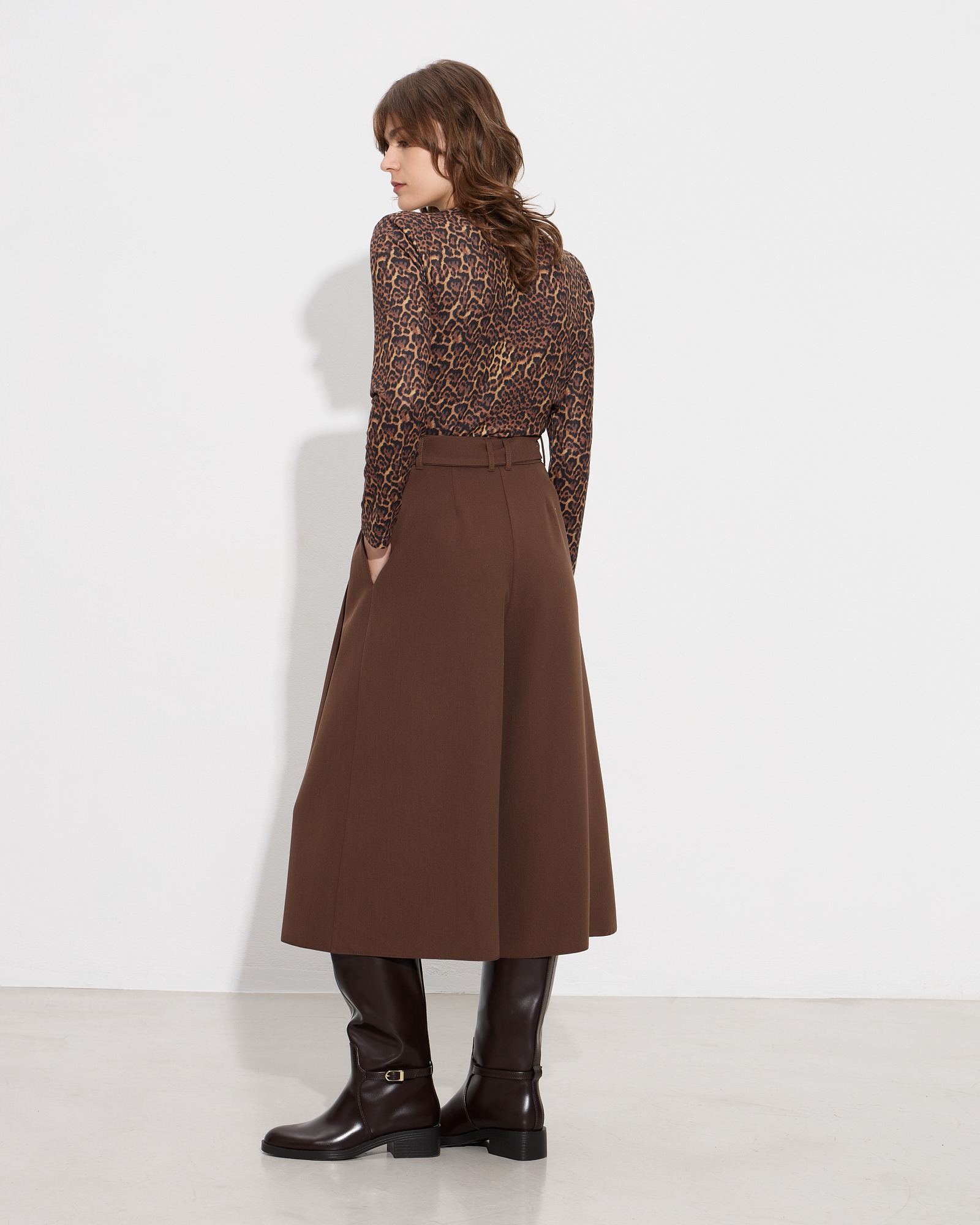 Ζιπ κιλότ μονόχρωμη με ζώνη απο το ίδιο ύφασμα, κλείσιμο με φερμουάρ μπροστά, με πιέτες, πλαϊνές τσέπες, σε κανονική γραμμή