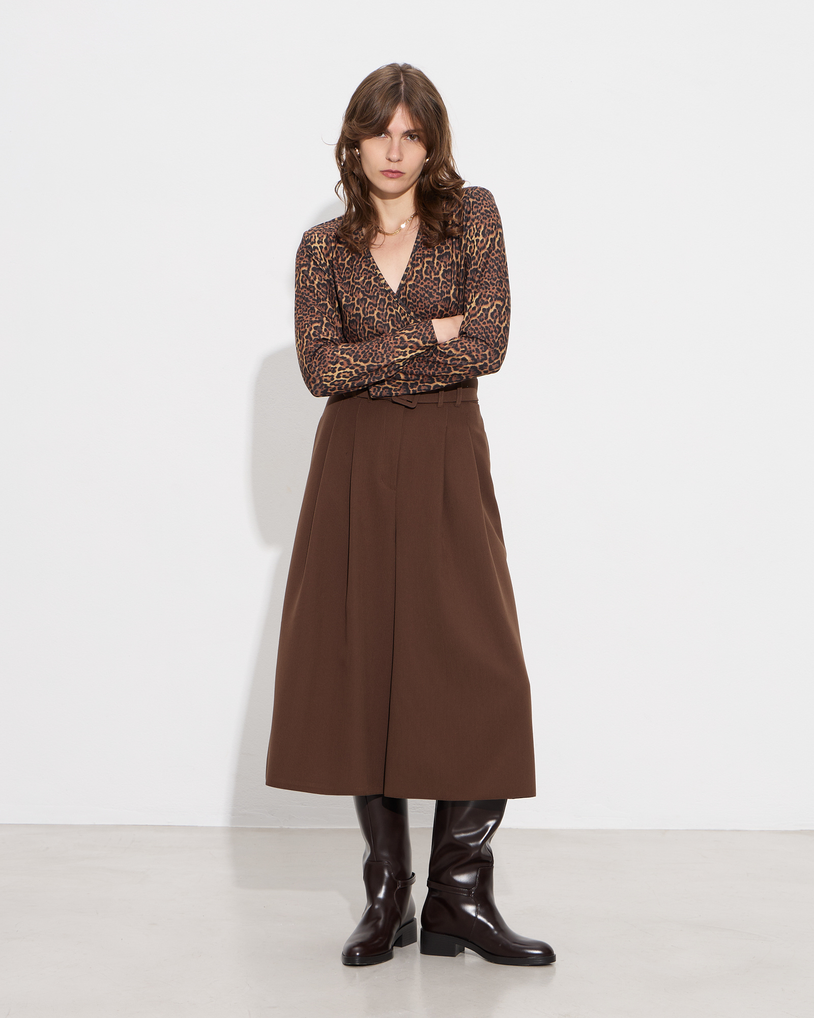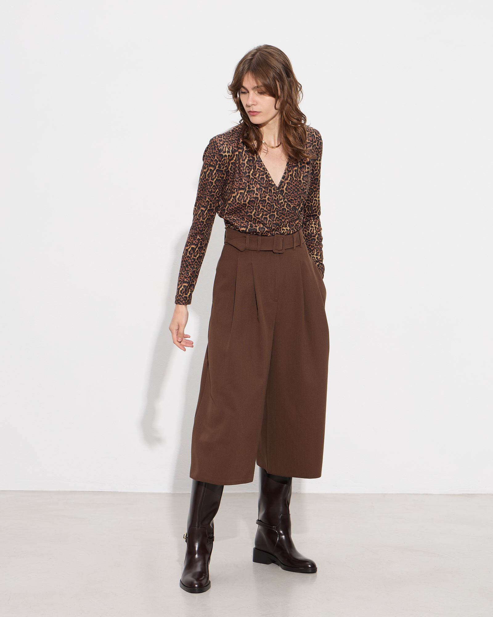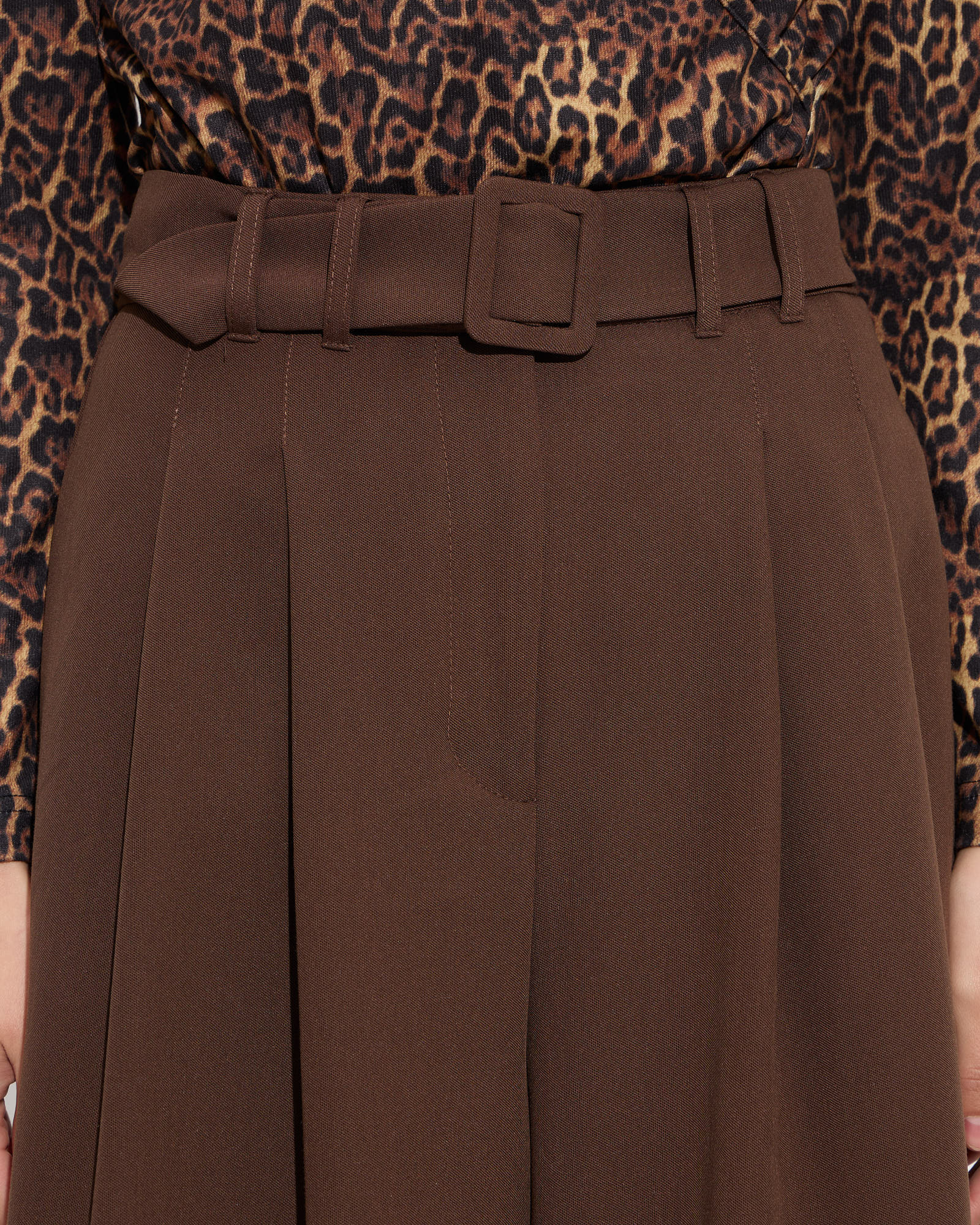 Ζιπ κιλότ μονόχρωμη με ζώνη απο το ίδιο ύφασμα, κλείσιμο με φερμουάρ μπροστά, με πιέτες, πλαϊνές τσέπες, σε κανονική γραμμή