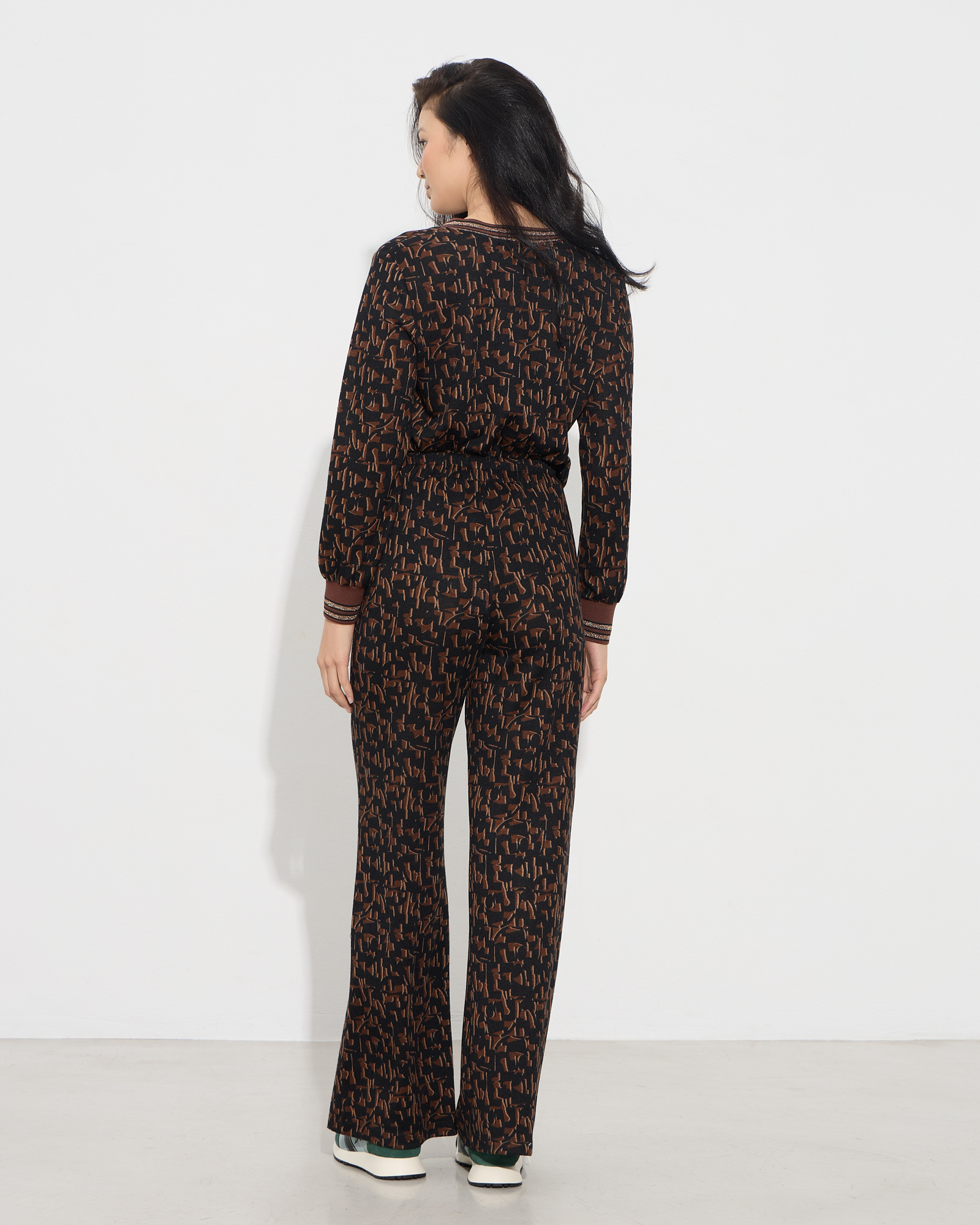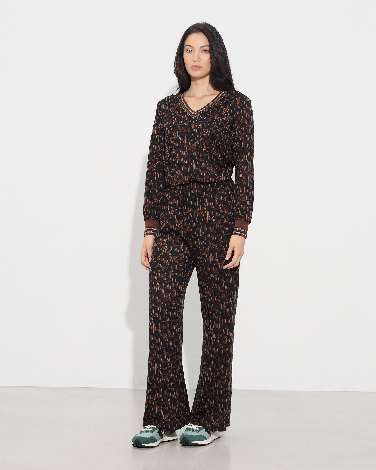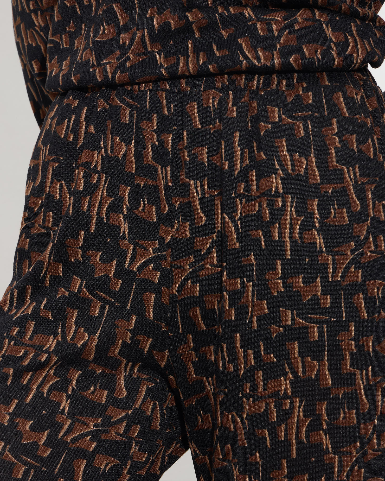 Παντελόνα πλεκτή σε abstract print με λάστιχο στη μέση, τσέπες στο πλάι, σε ίσια γραμμή, κανονική εφαρμογή