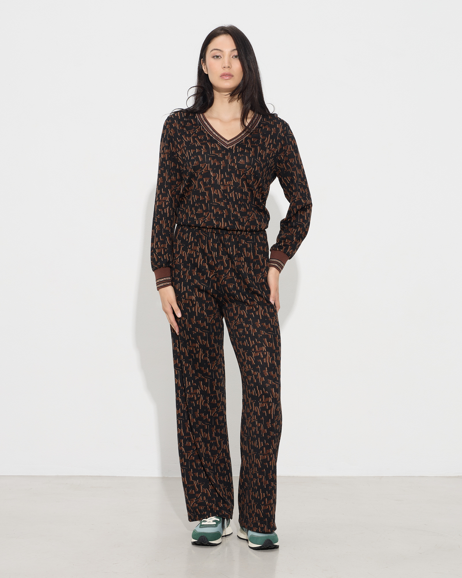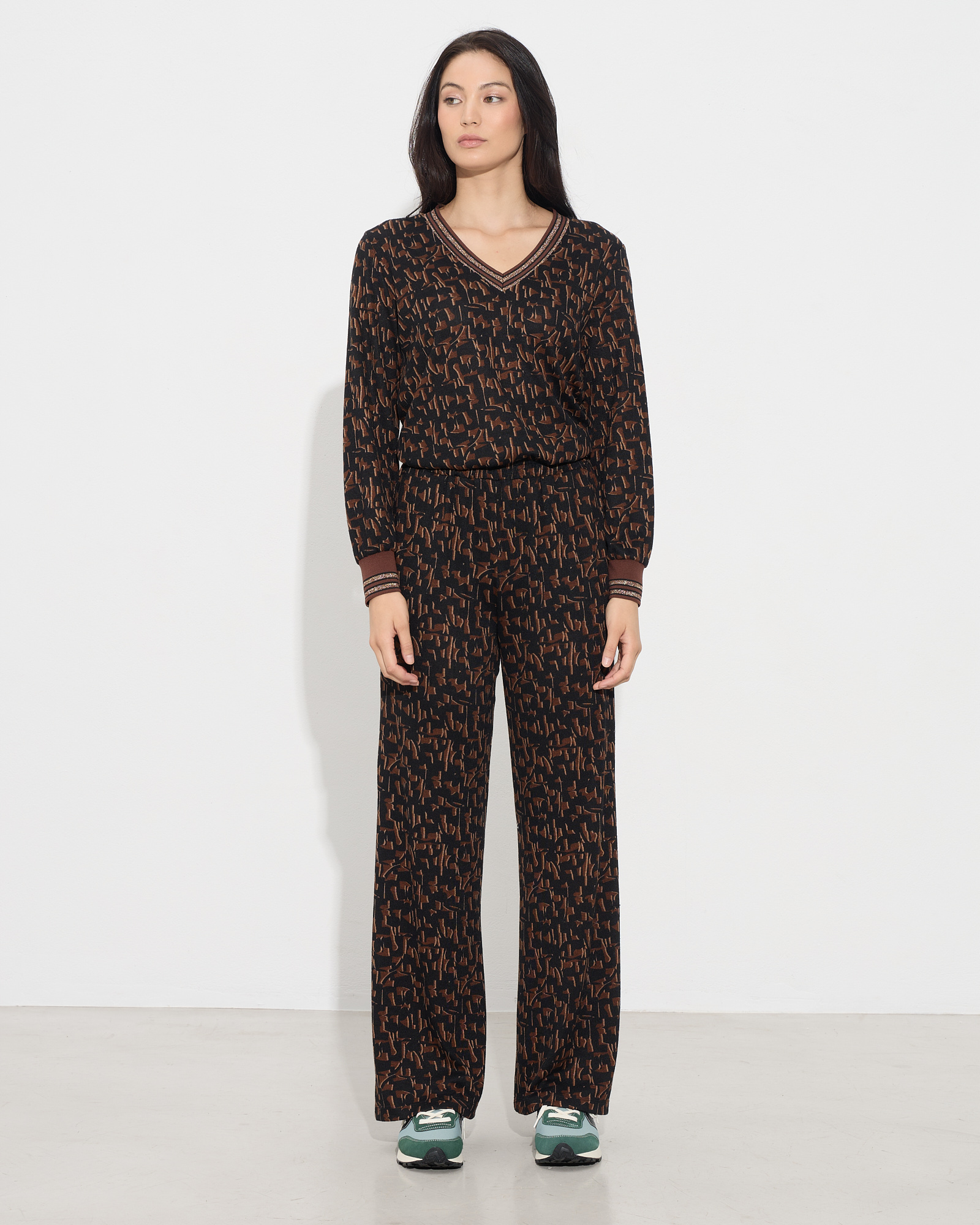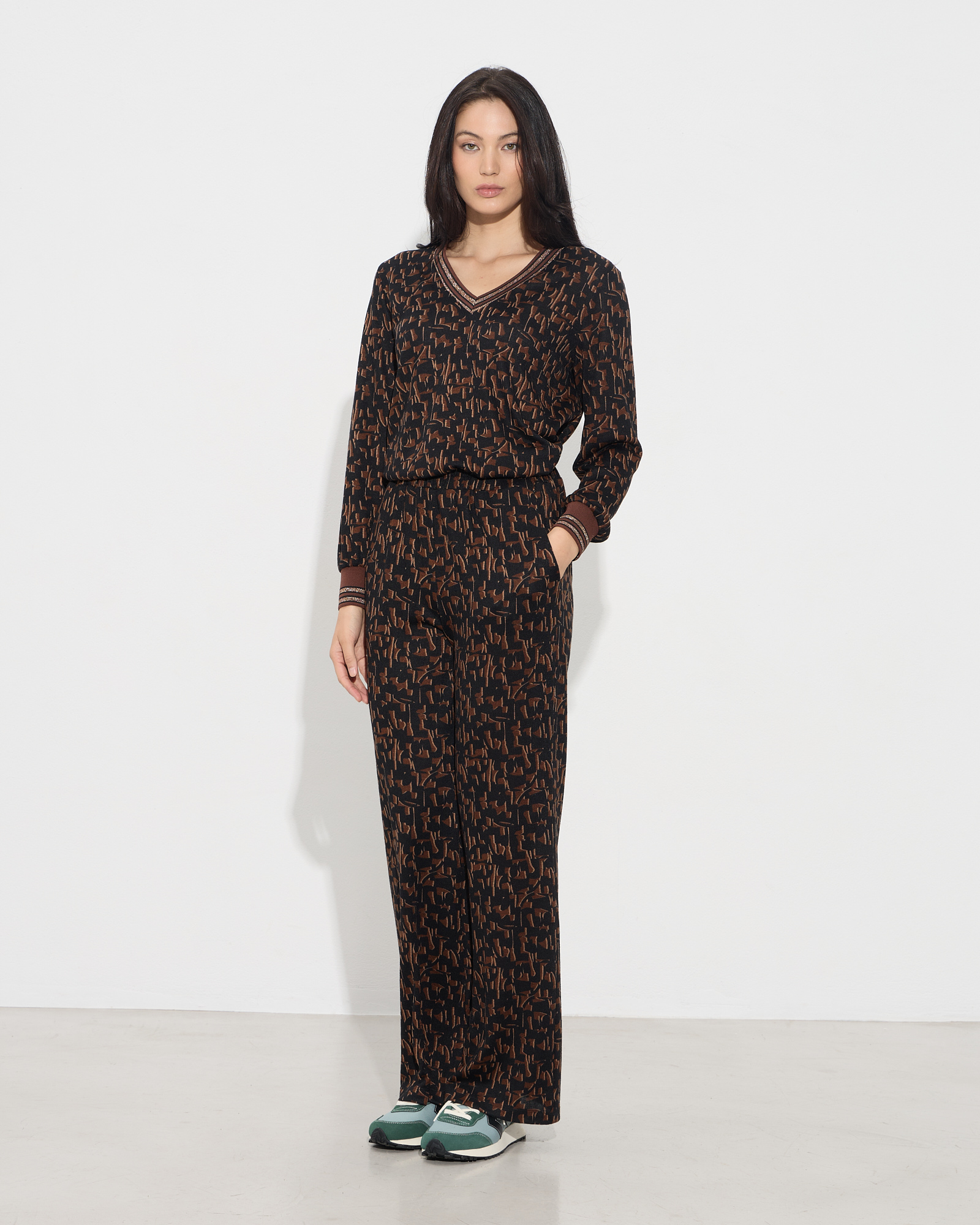 Παντελόνα πλεκτή σε abstract print με λάστιχο στη μέση, τσέπες στο πλάι, σε ίσια γραμμή, κανονική εφαρμογή