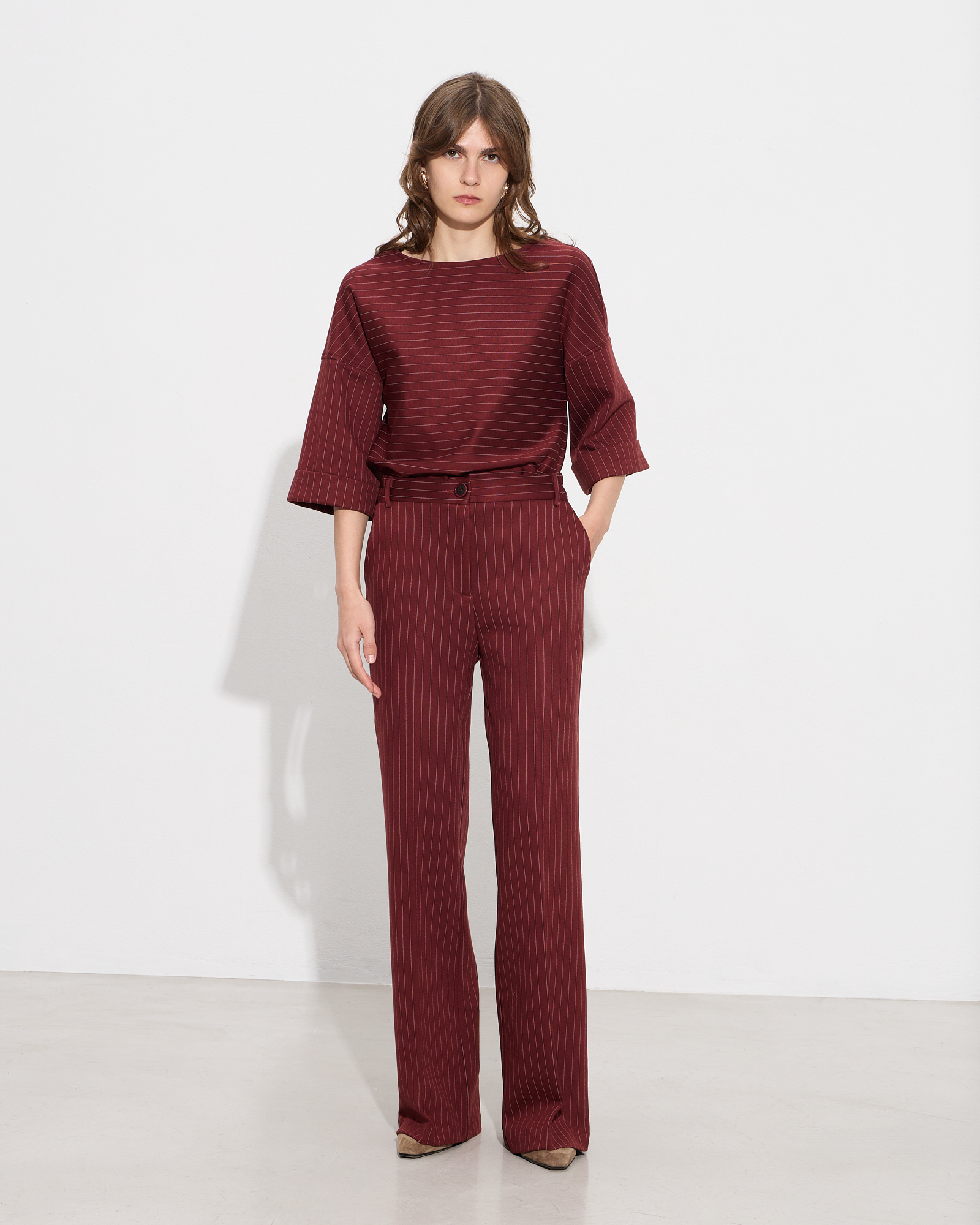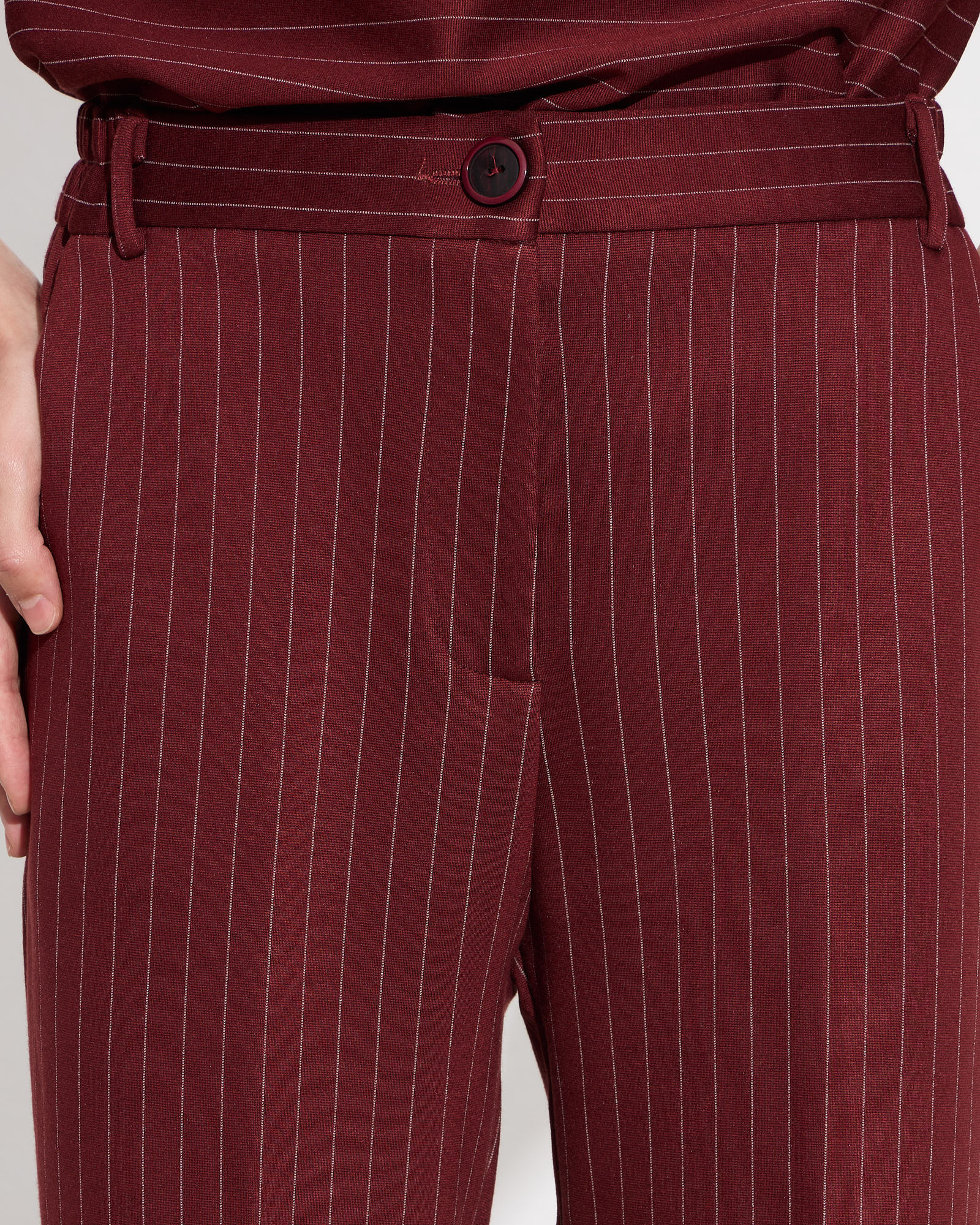 Παντελόνα ρίγα ψηλόμεση με λάστιχο στο πίσω μέρος, κλείσιμο με φερμουάρ μπροστά και κουμπί, πλαϊνές τσέπες, σε κανονική εφαρφογή