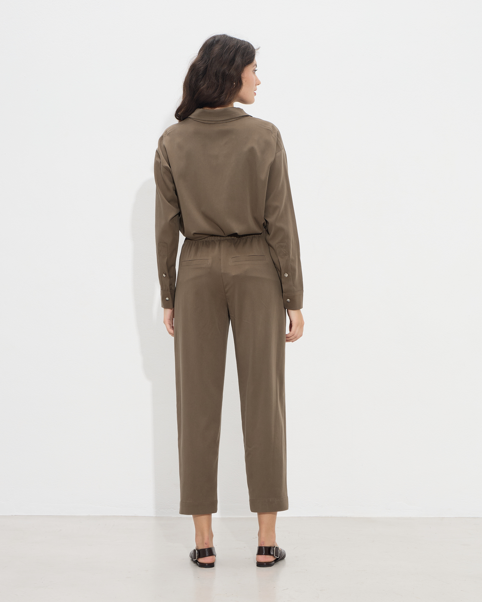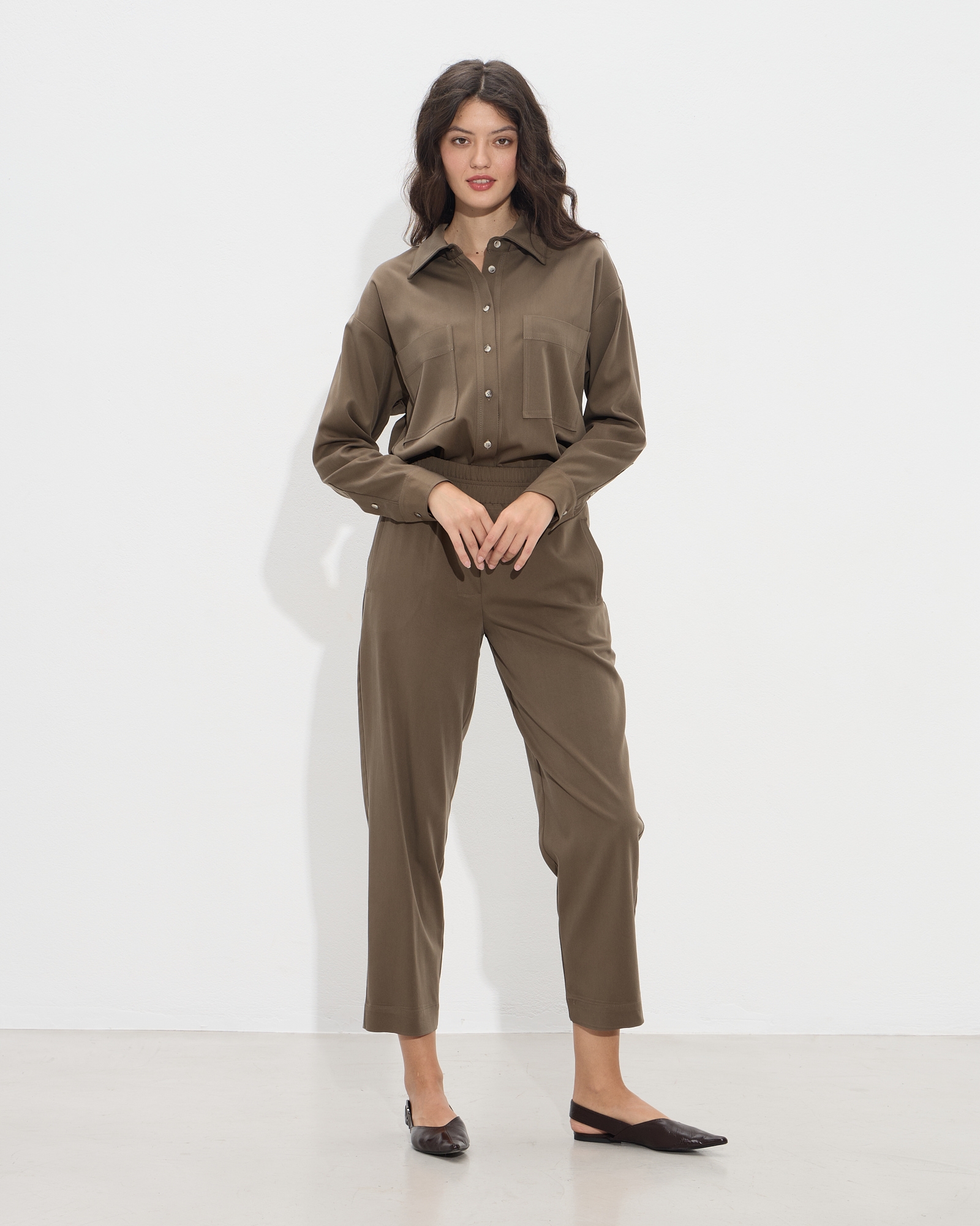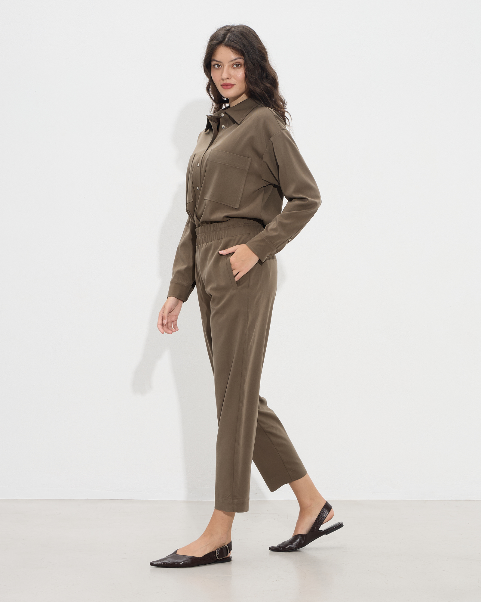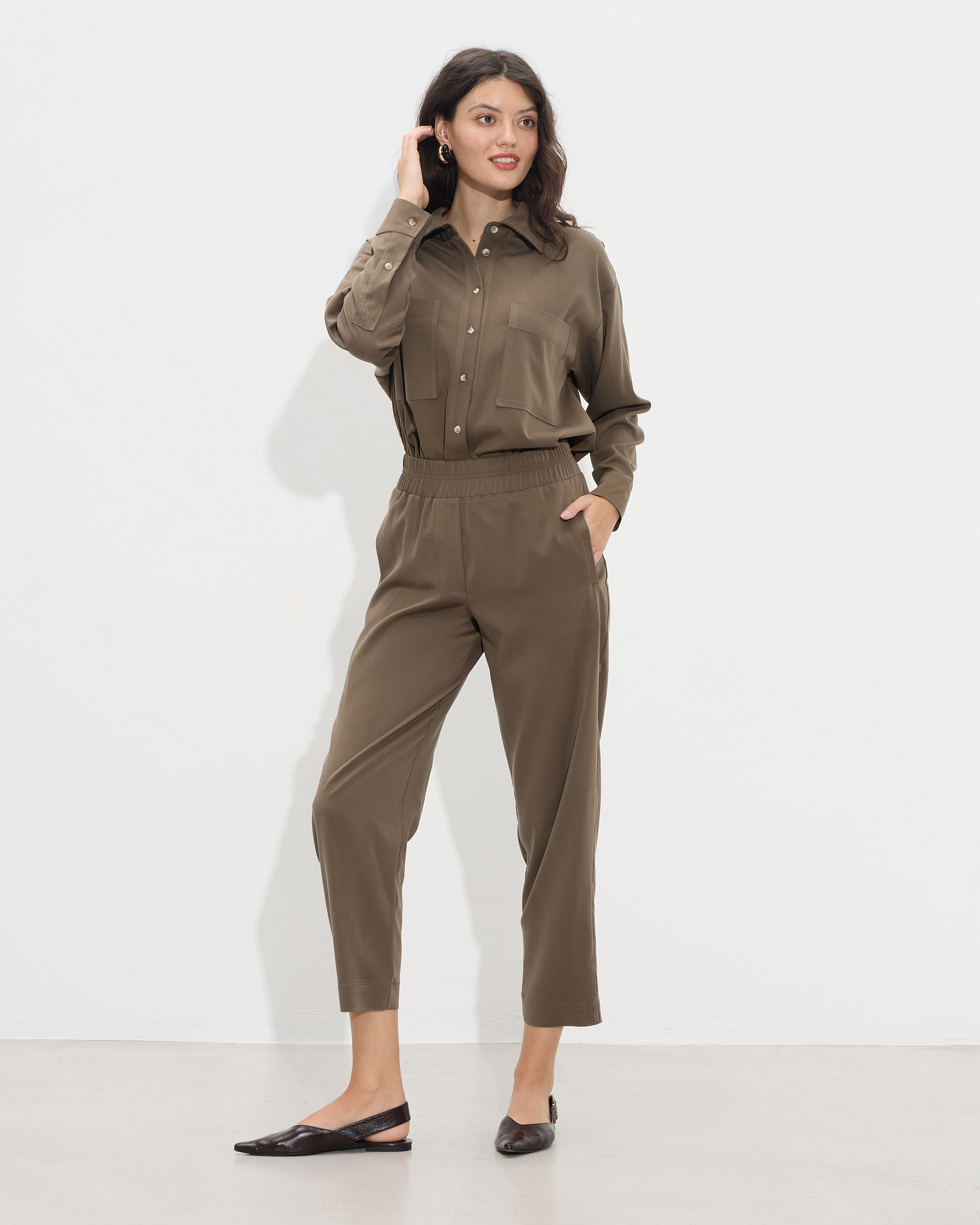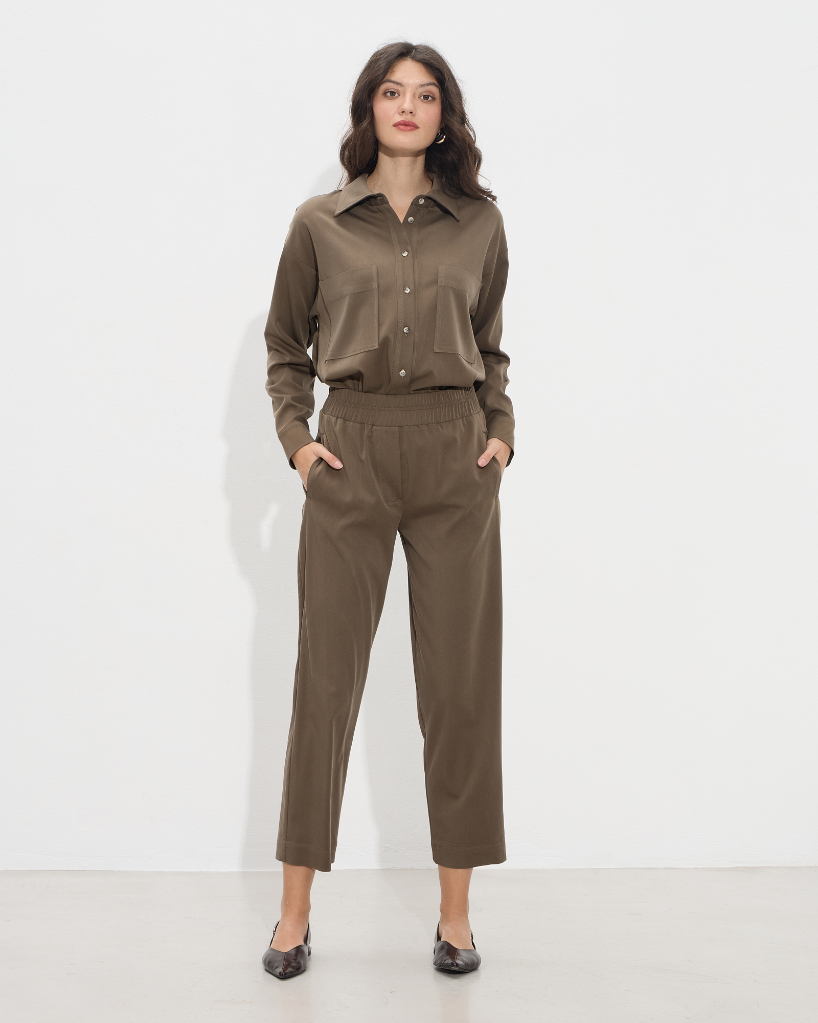 Παντελόνι ψηλόμεσο με λάστιχο στη μέση, μονόχρωμο με τσέπες στο πλάι, σε κανονική γραμμή