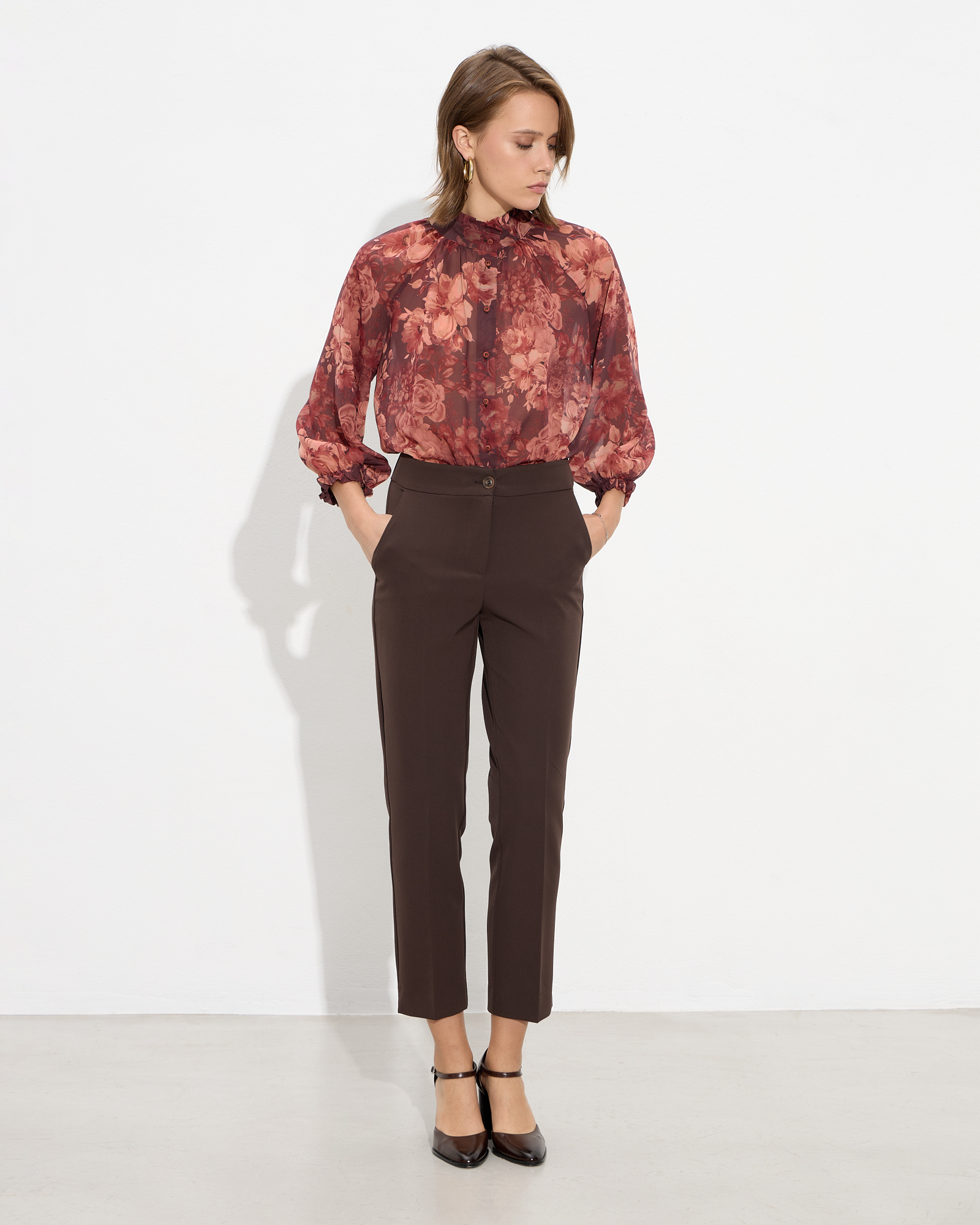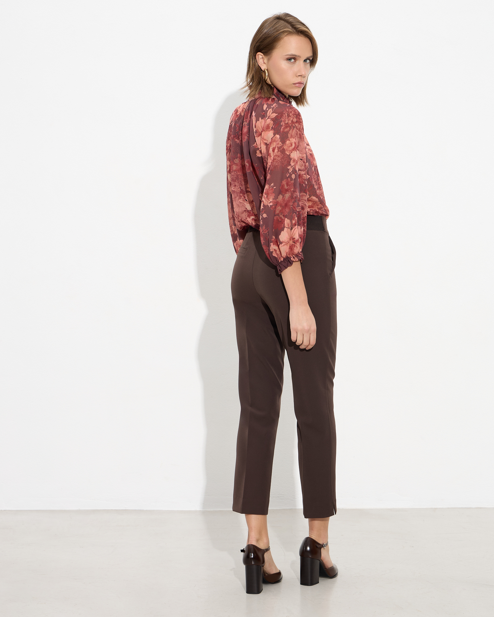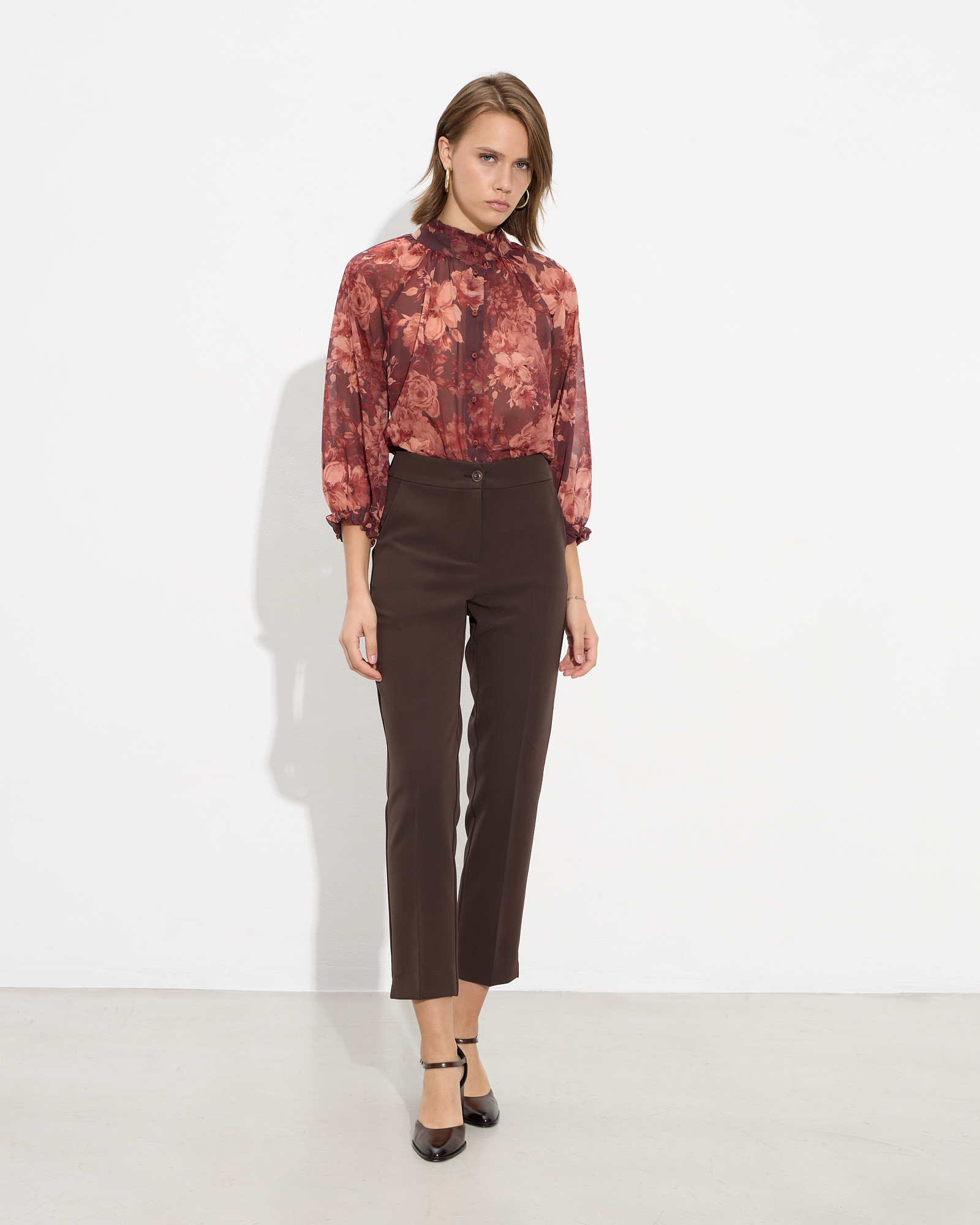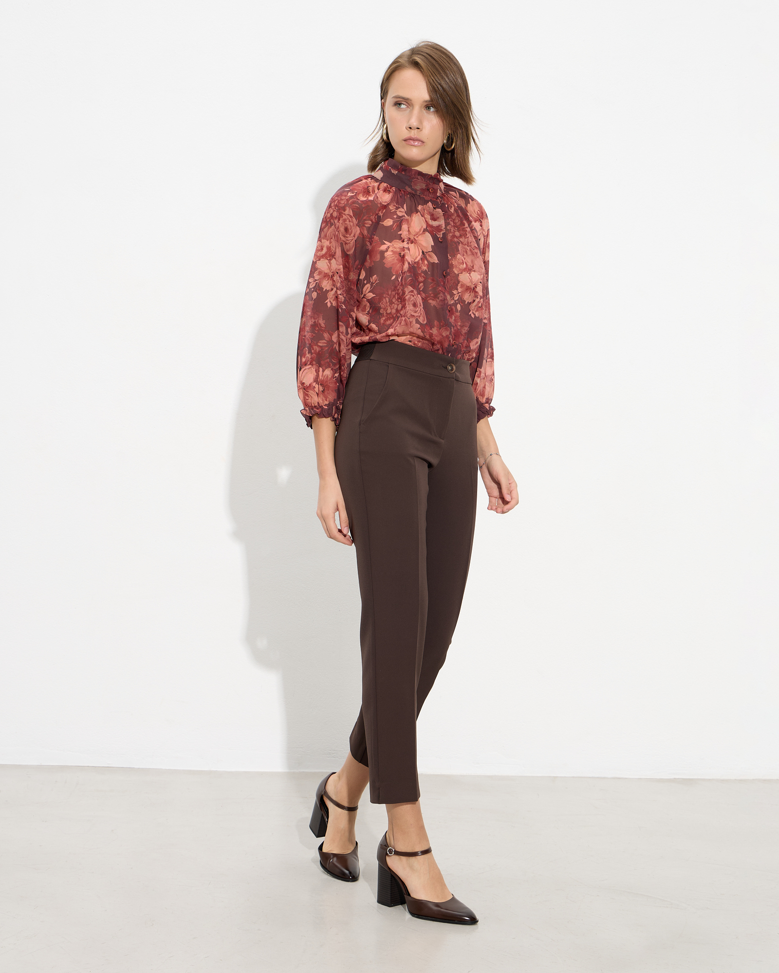 Παντελόνι cigarette ψηλόμεσο με λάστιχο στο πίσω μέρος, κλείσιμο με φερμουάρ και κουμπί, πλαϊνές τσέπες, σε κανονική εφαρμογή