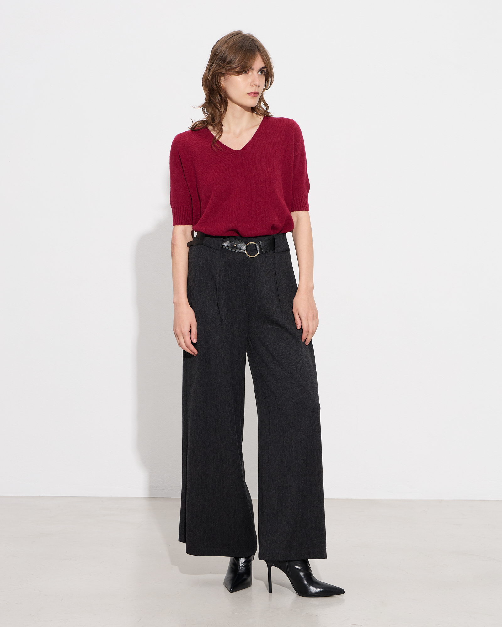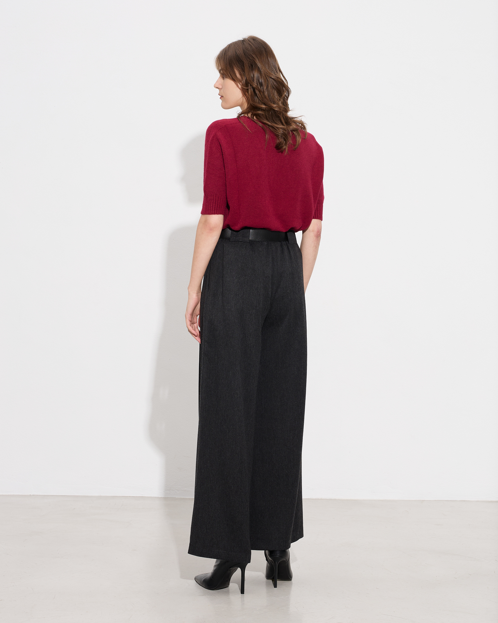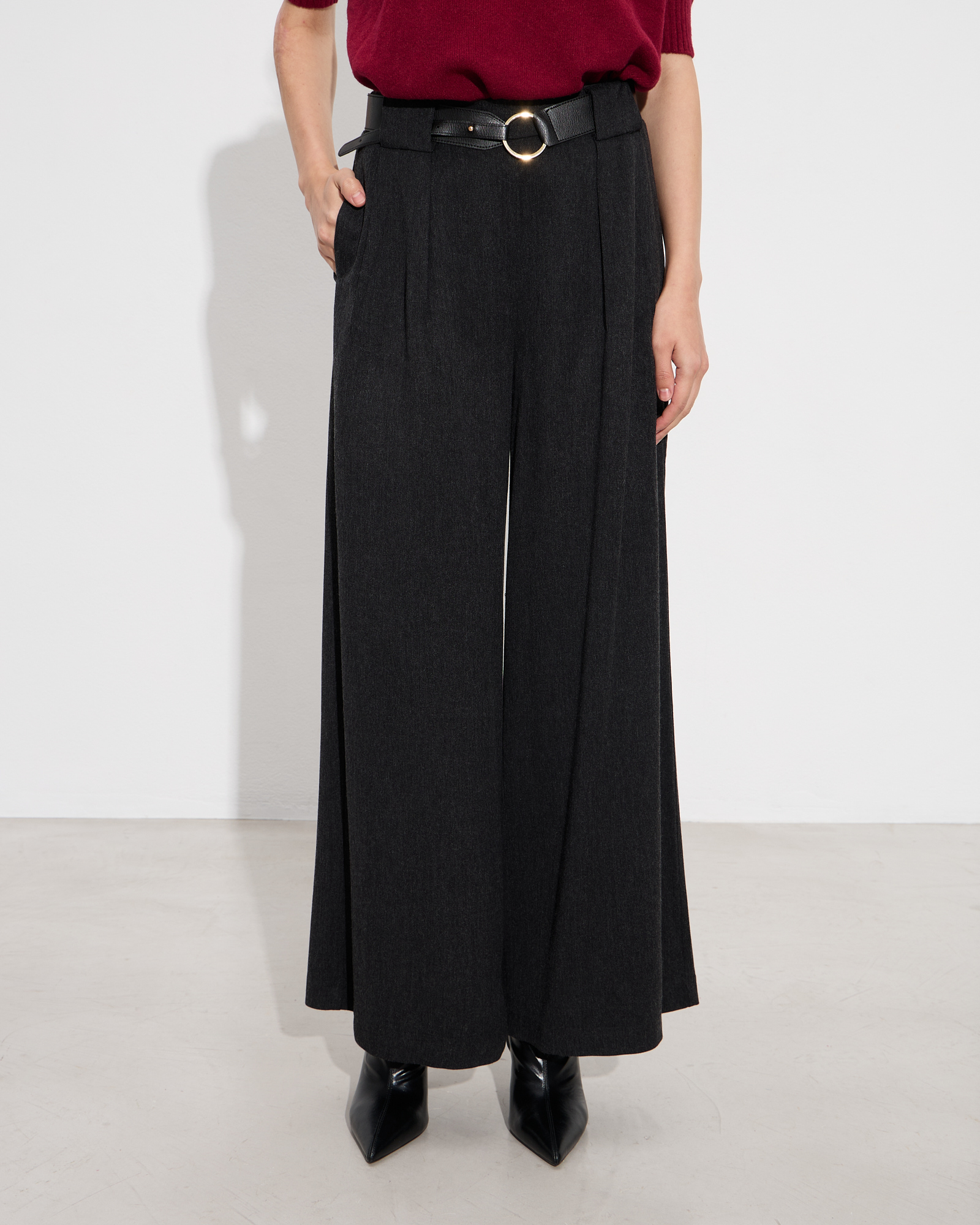 Παντελόνα ψηλόμεση με ζώνη και μπροστινές πιέτες, λάστιχο στη μέση, πλαϊνές τσέπες, φαρδύ μπατζάκι, σε μαλακό βισκόζ ύφασμα, σε άνετη γραμμή