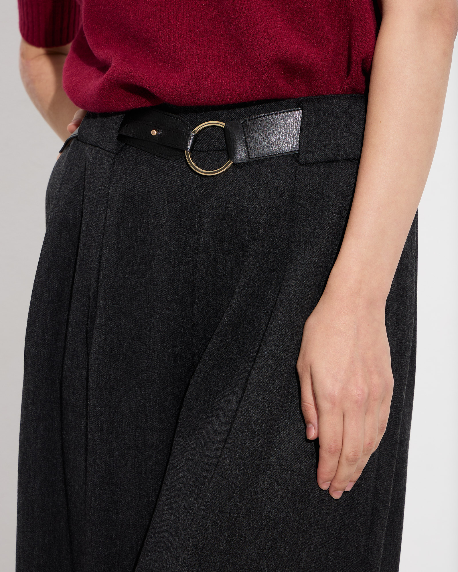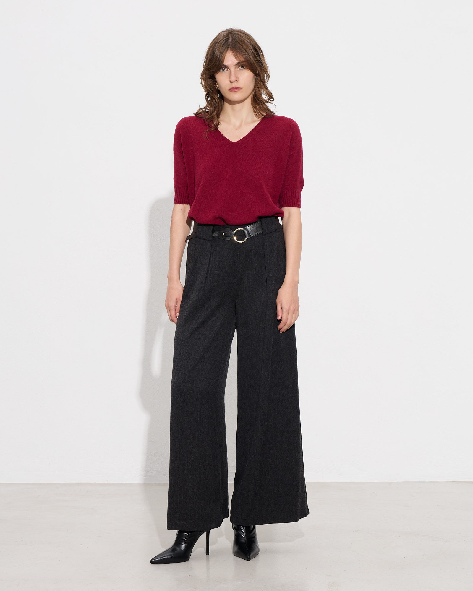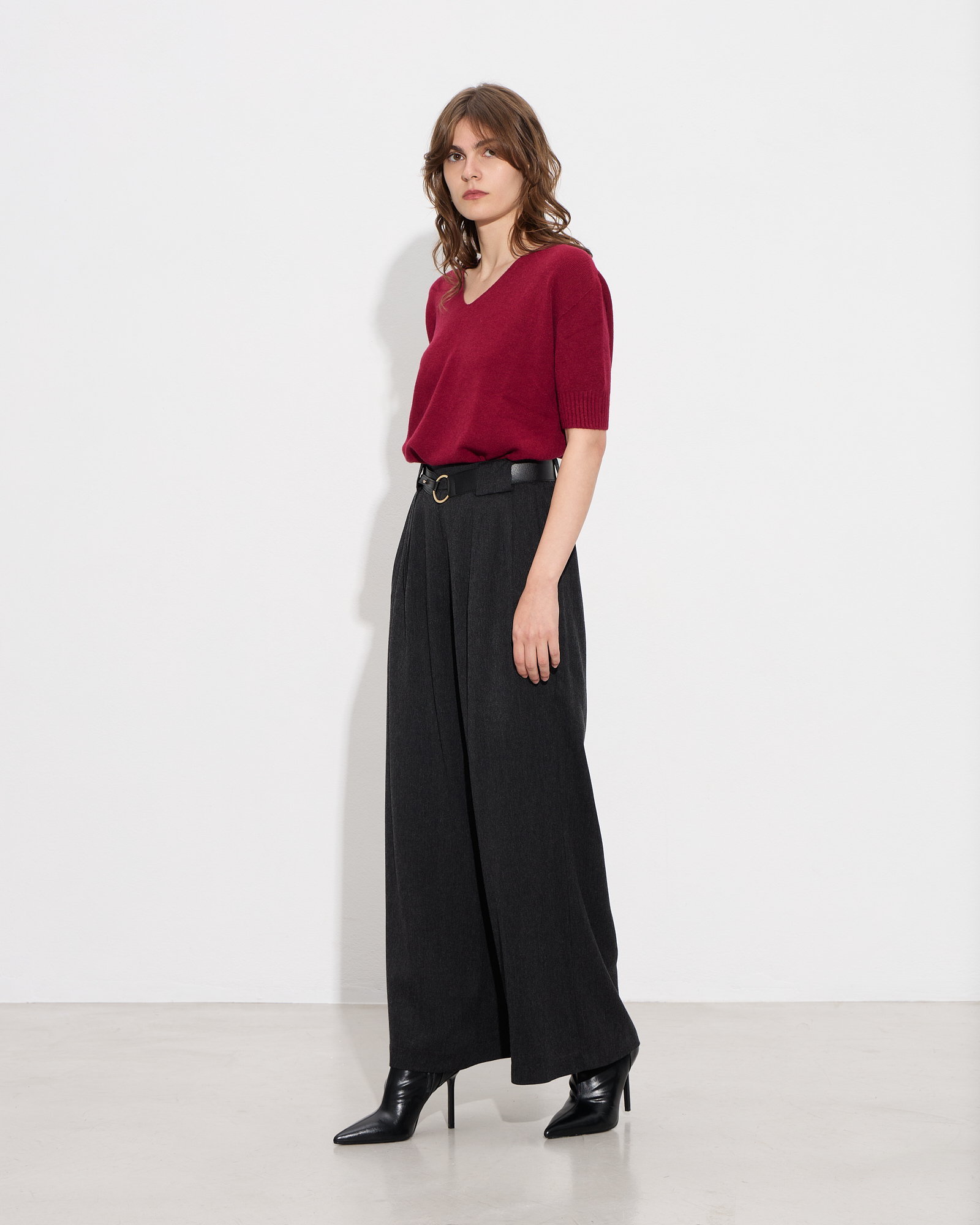 Παντελόνα ψηλόμεση με ζώνη και μπροστινές πιέτες, λάστιχο στη μέση, πλαϊνές τσέπες, φαρδύ μπατζάκι, σε μαλακό βισκόζ ύφασμα, σε άνετη γραμμή
