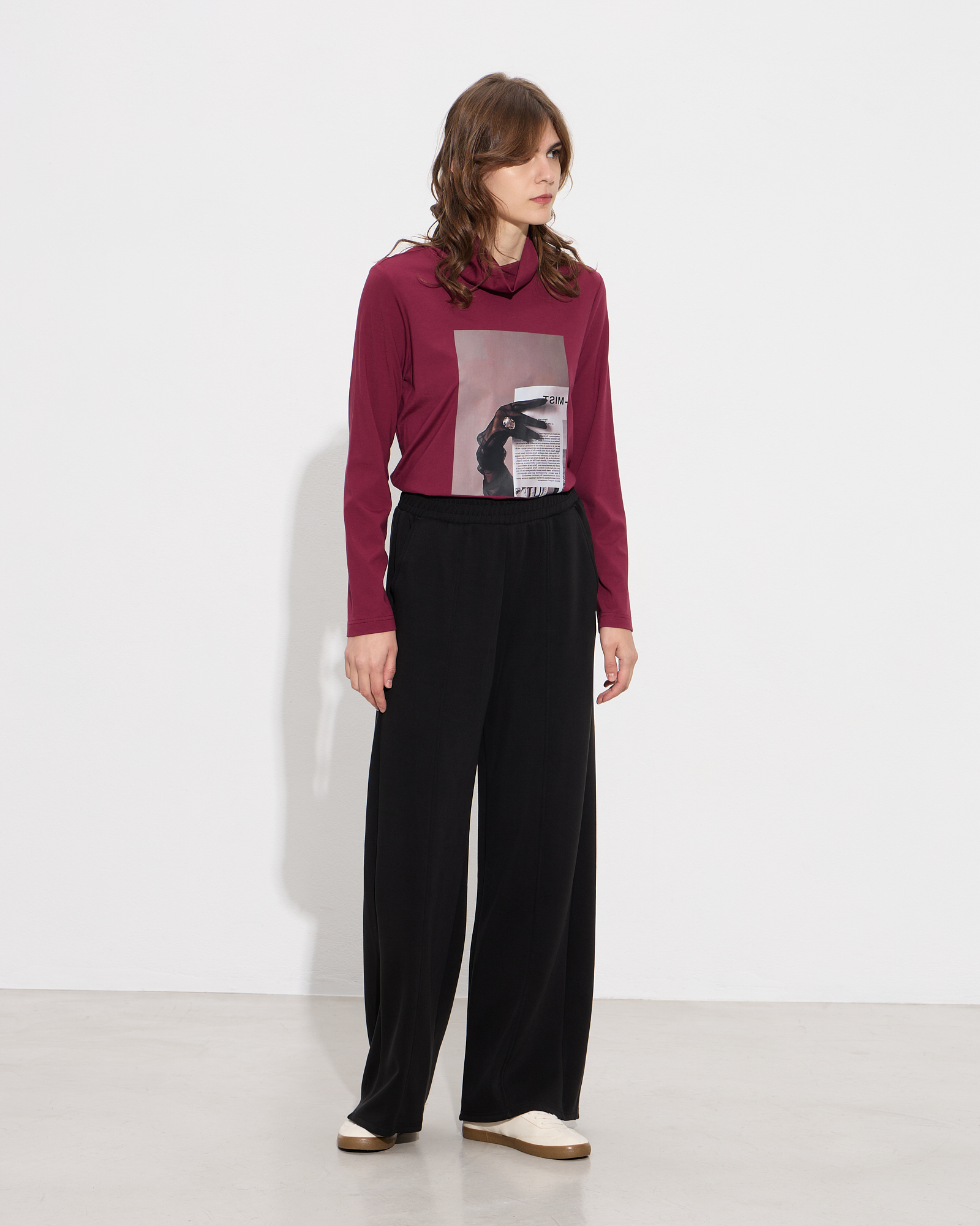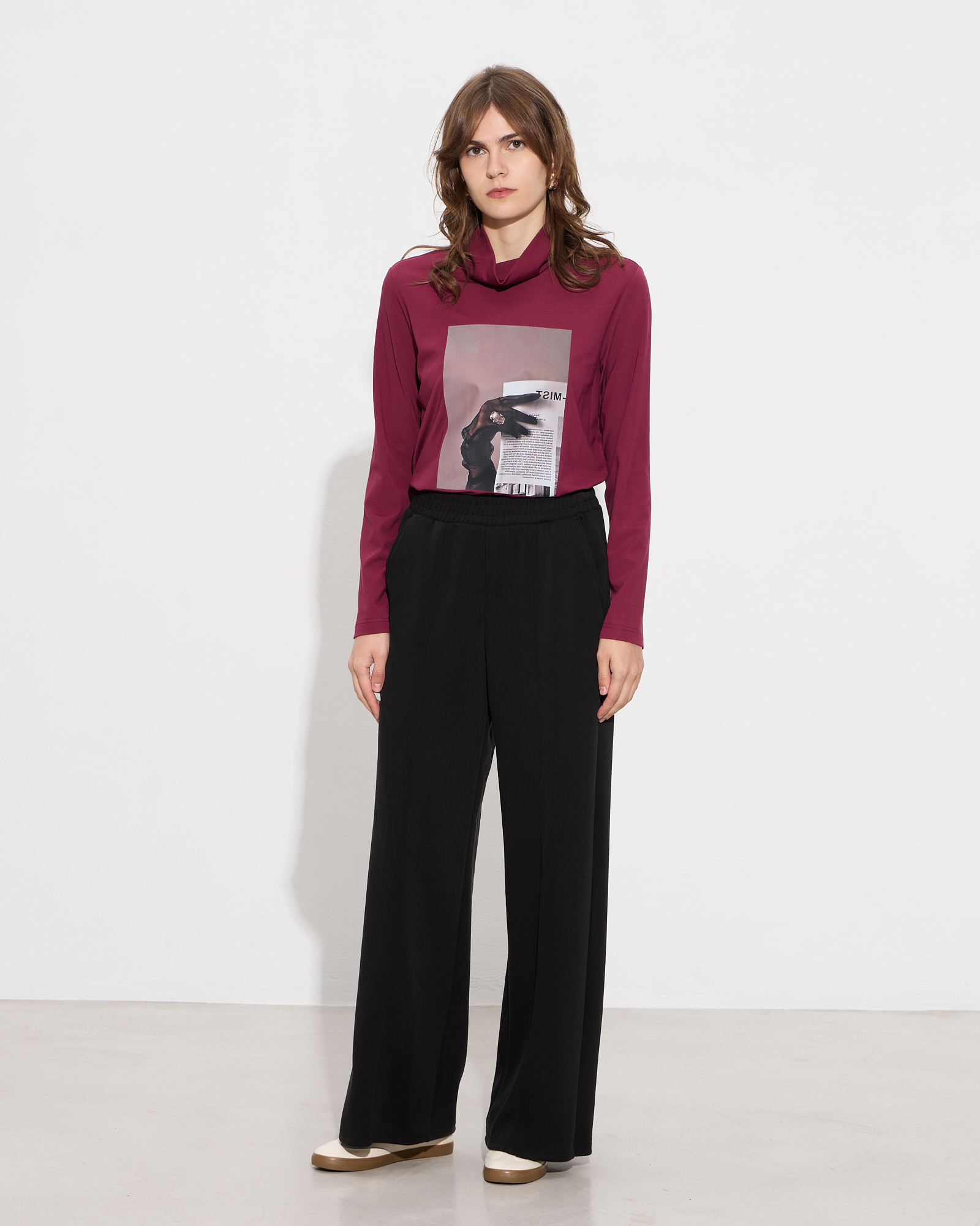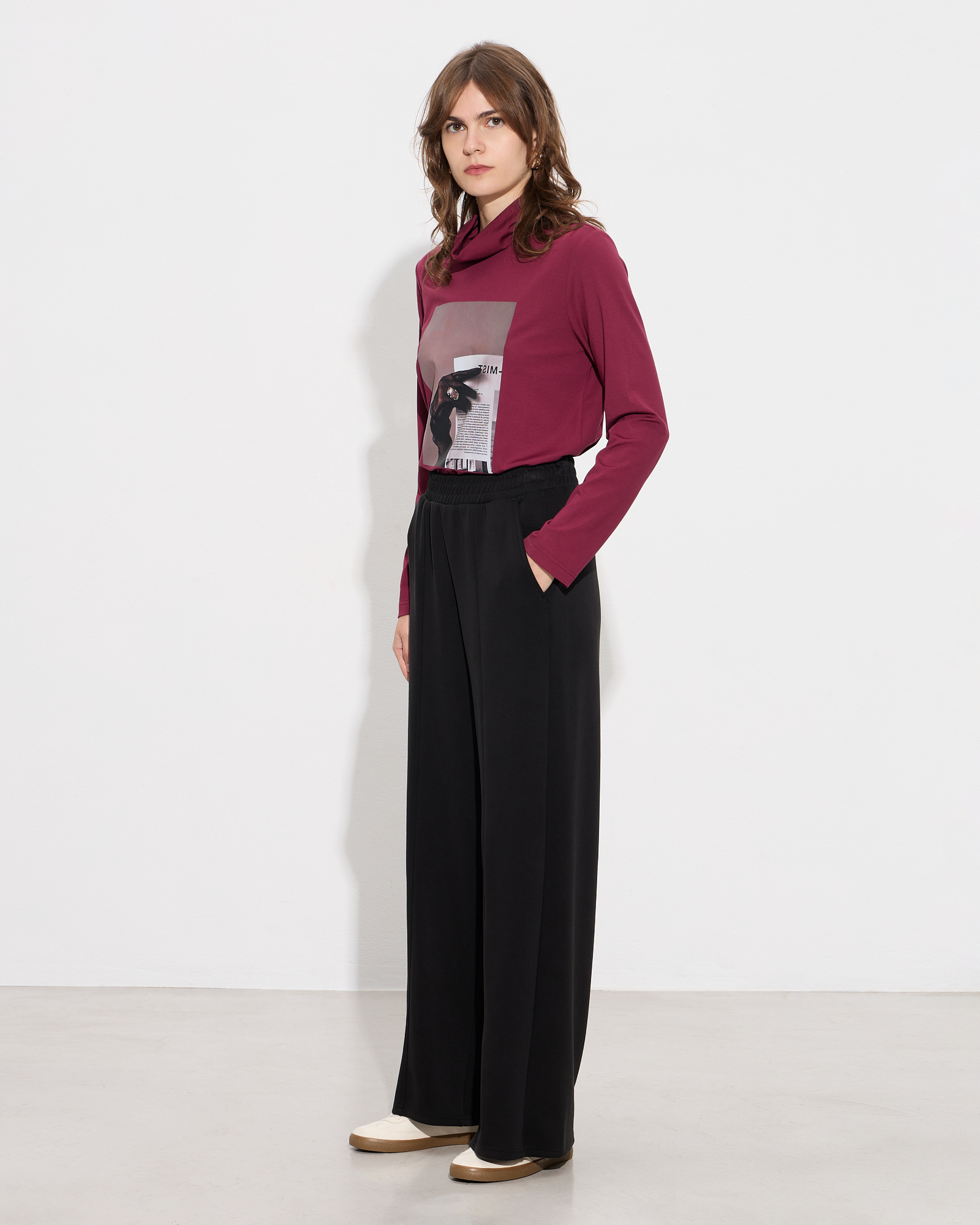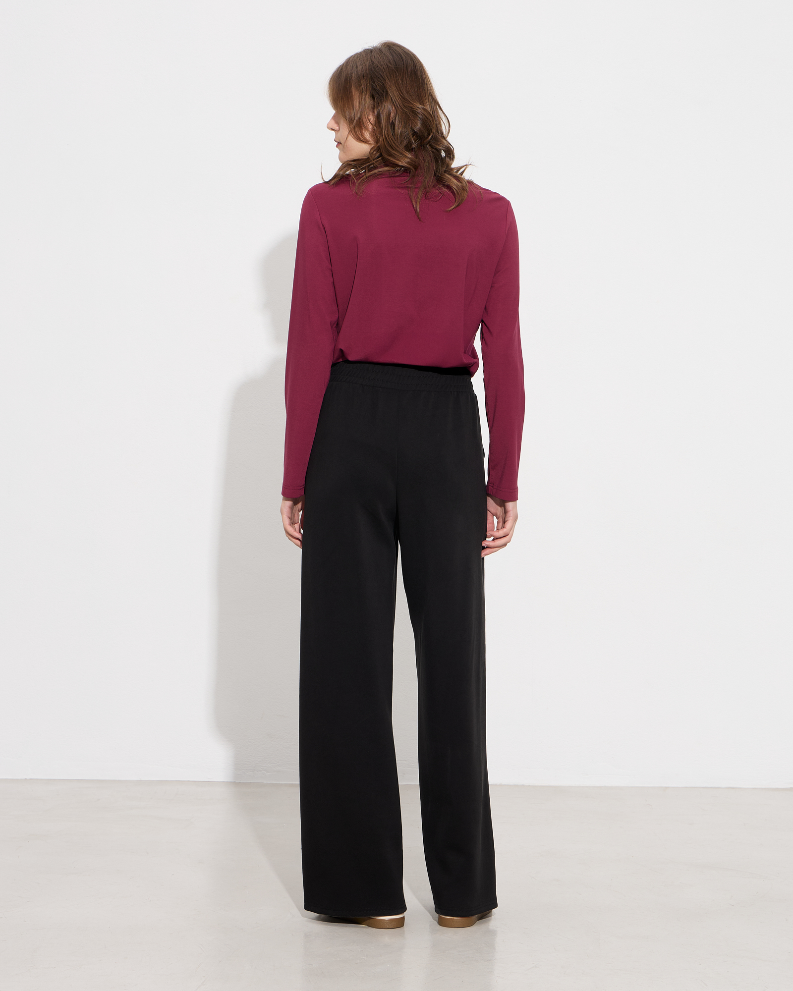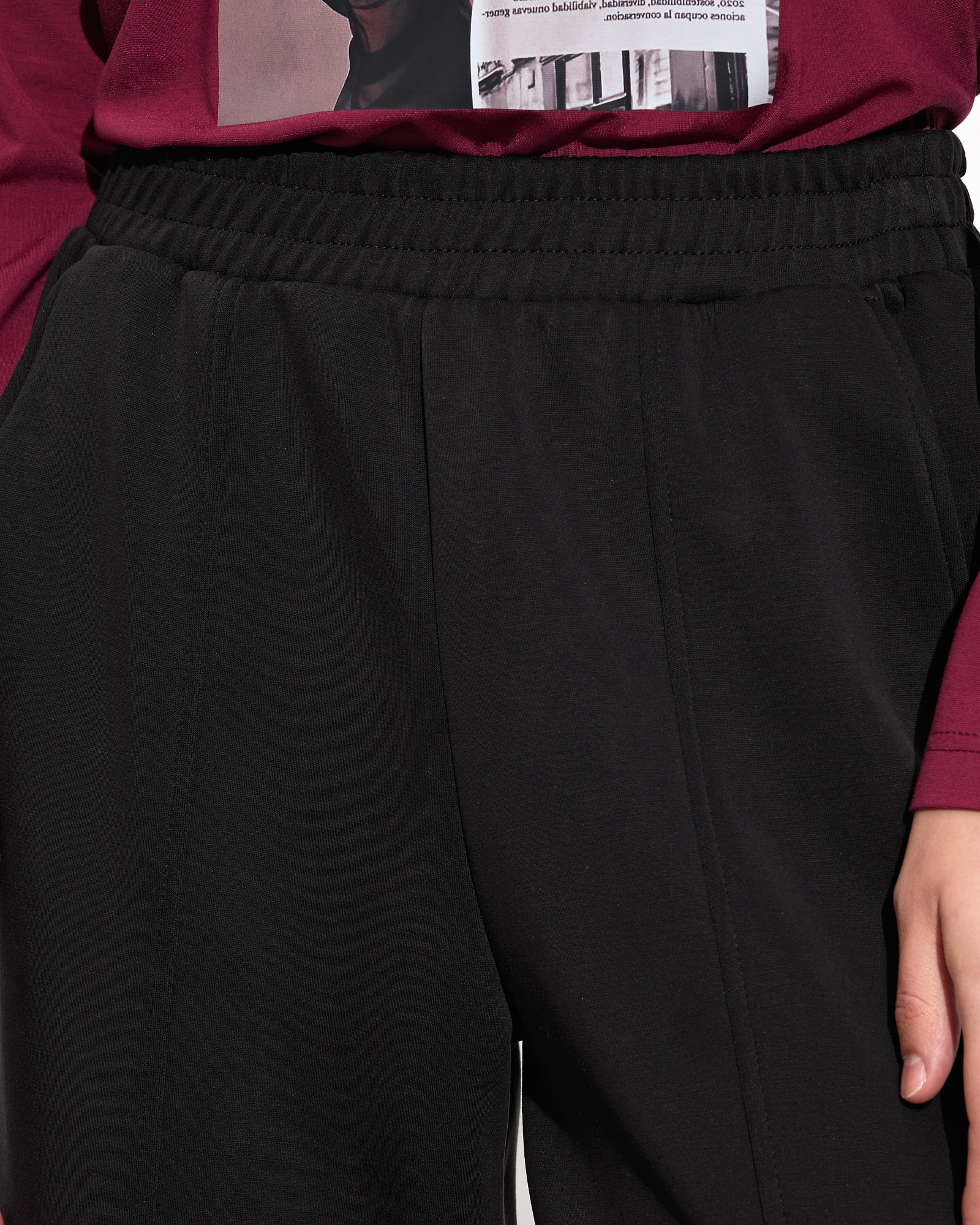 Παντελόνι ψηλόμεσο με λάστιχο στη μέση, πλαϊνές τσέπες, διακοσμητικές ραφές μπροστά, μαλακό ύφασμα,σε κανονική γραμμη