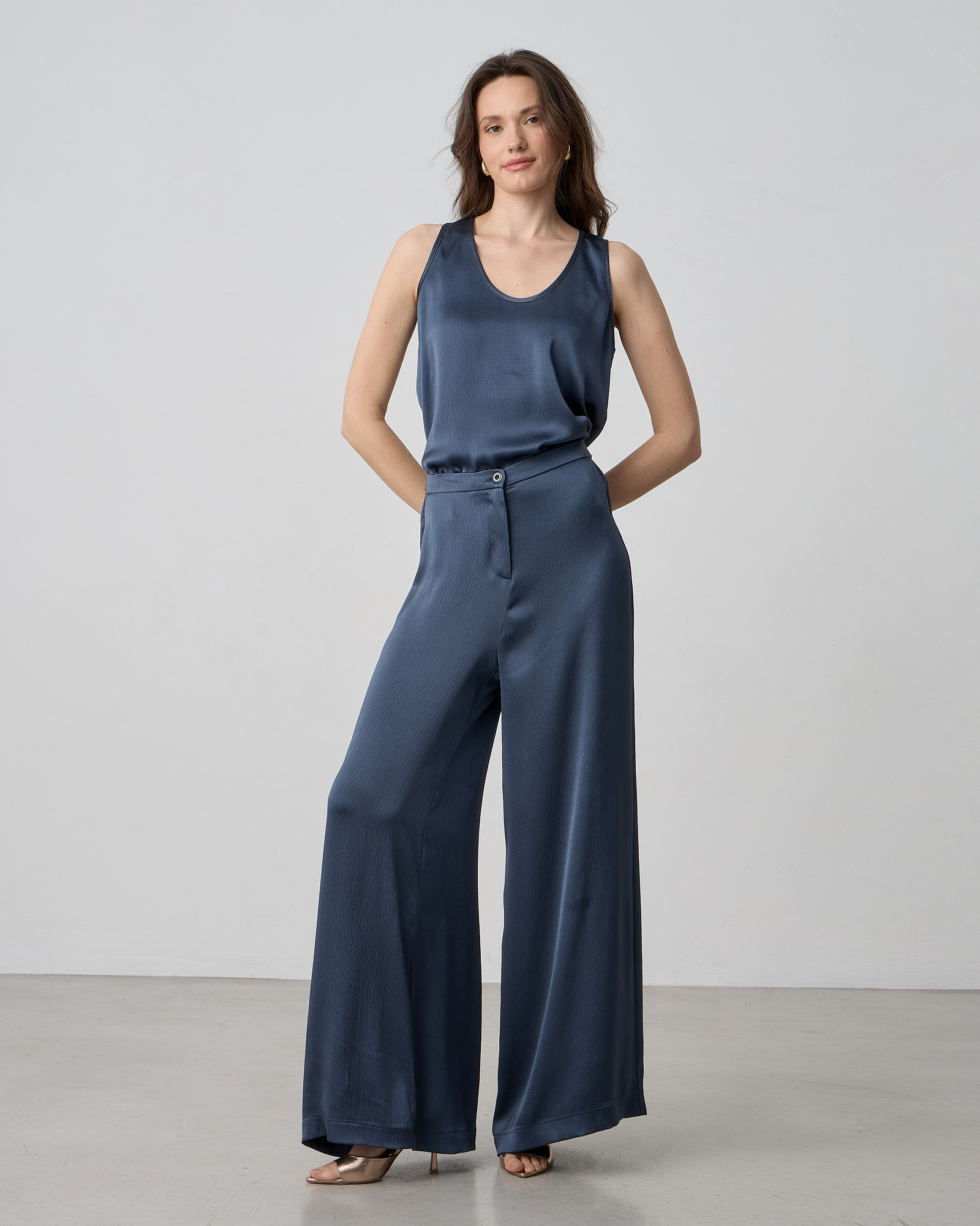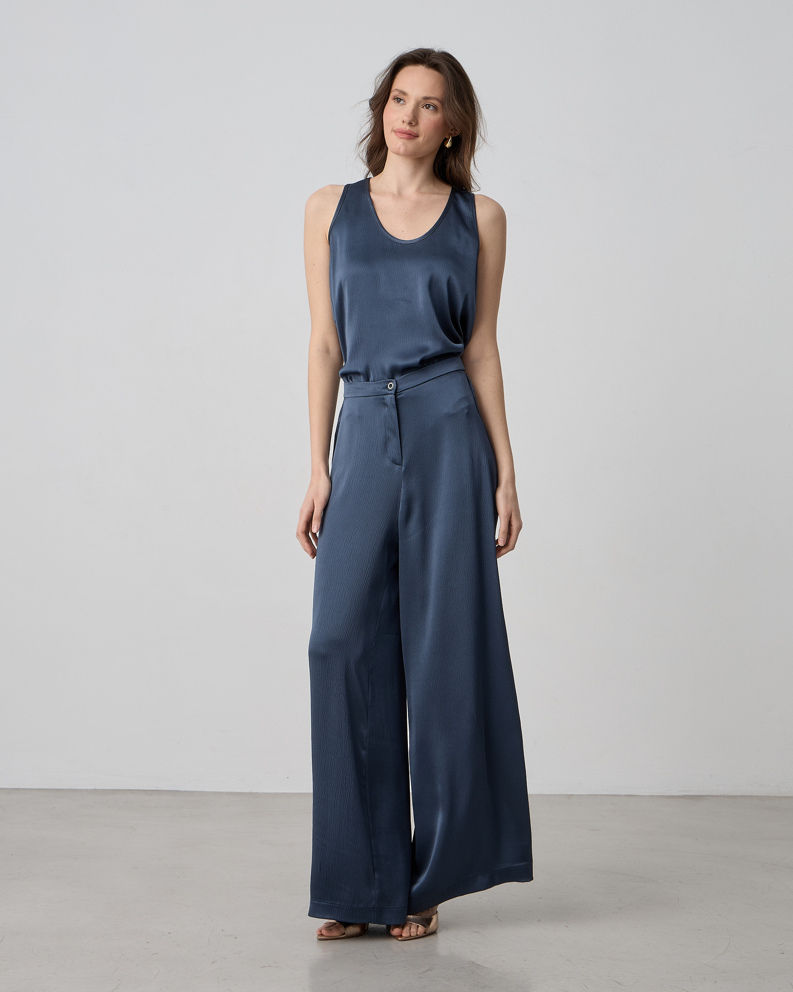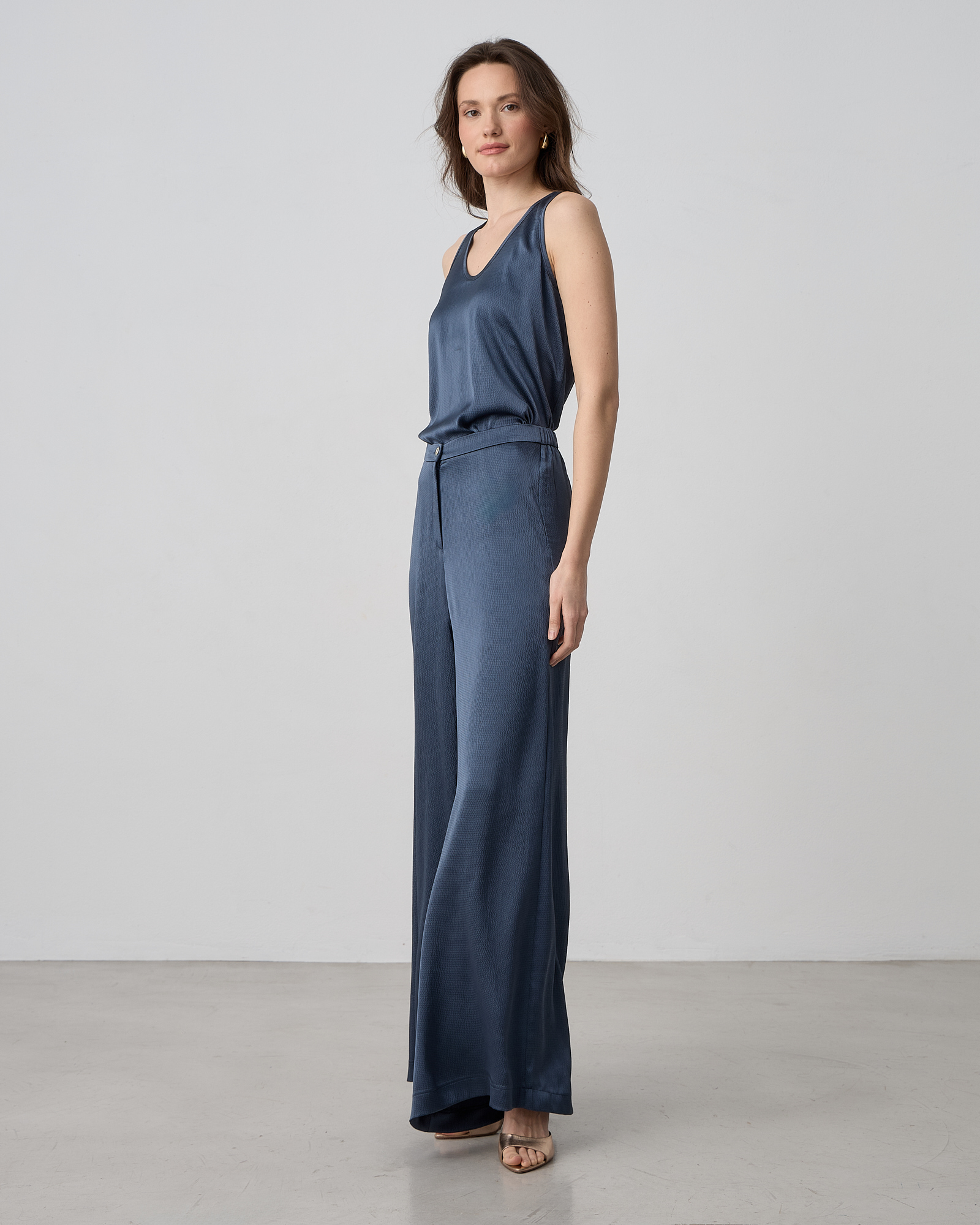 Παντελόνα σατέν με ελαστική μέση, κλείσιμο μπροστά με φερμουάρ και κουμπί, σε σατέν υφή, κανονική γραμμή