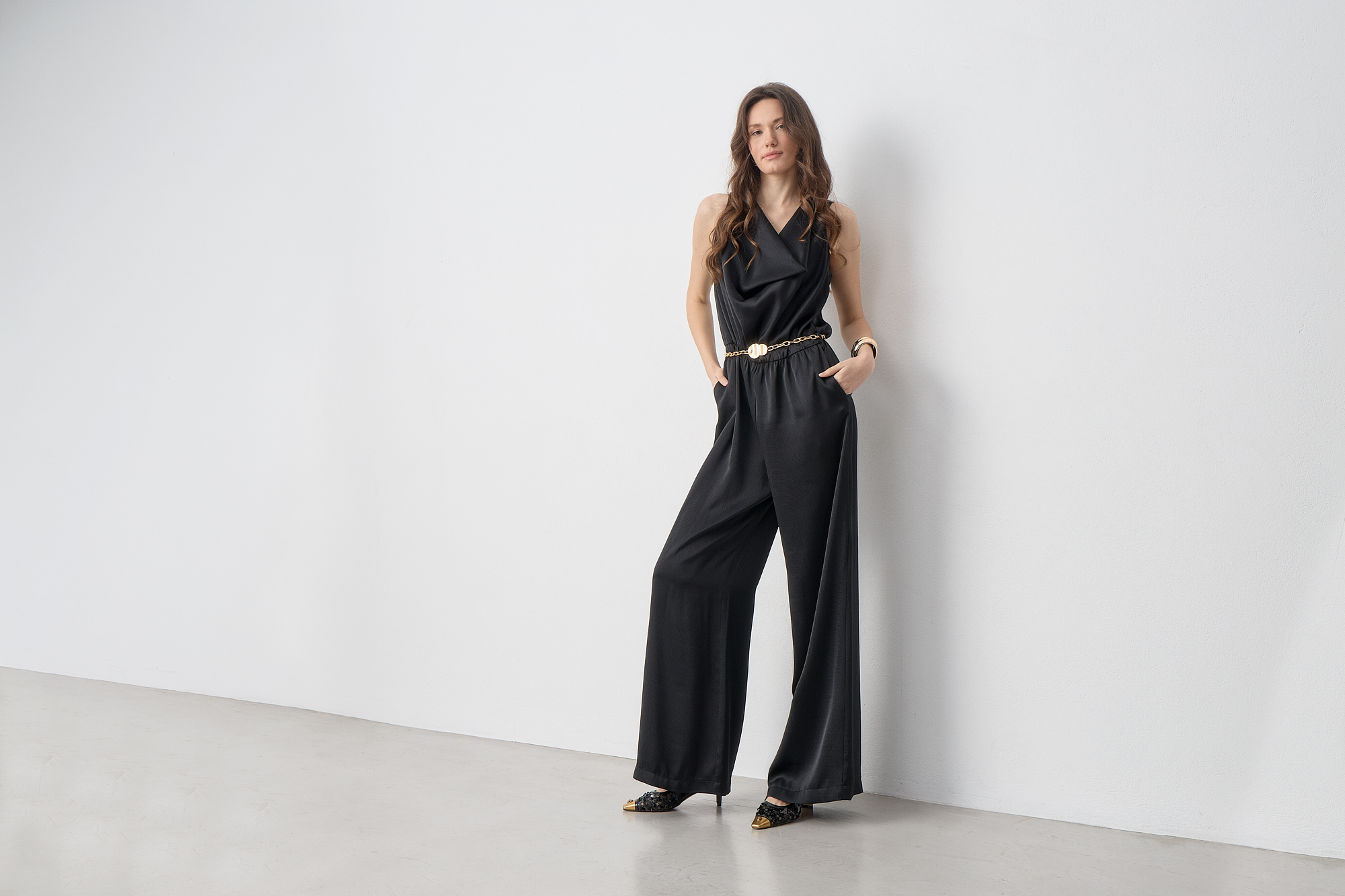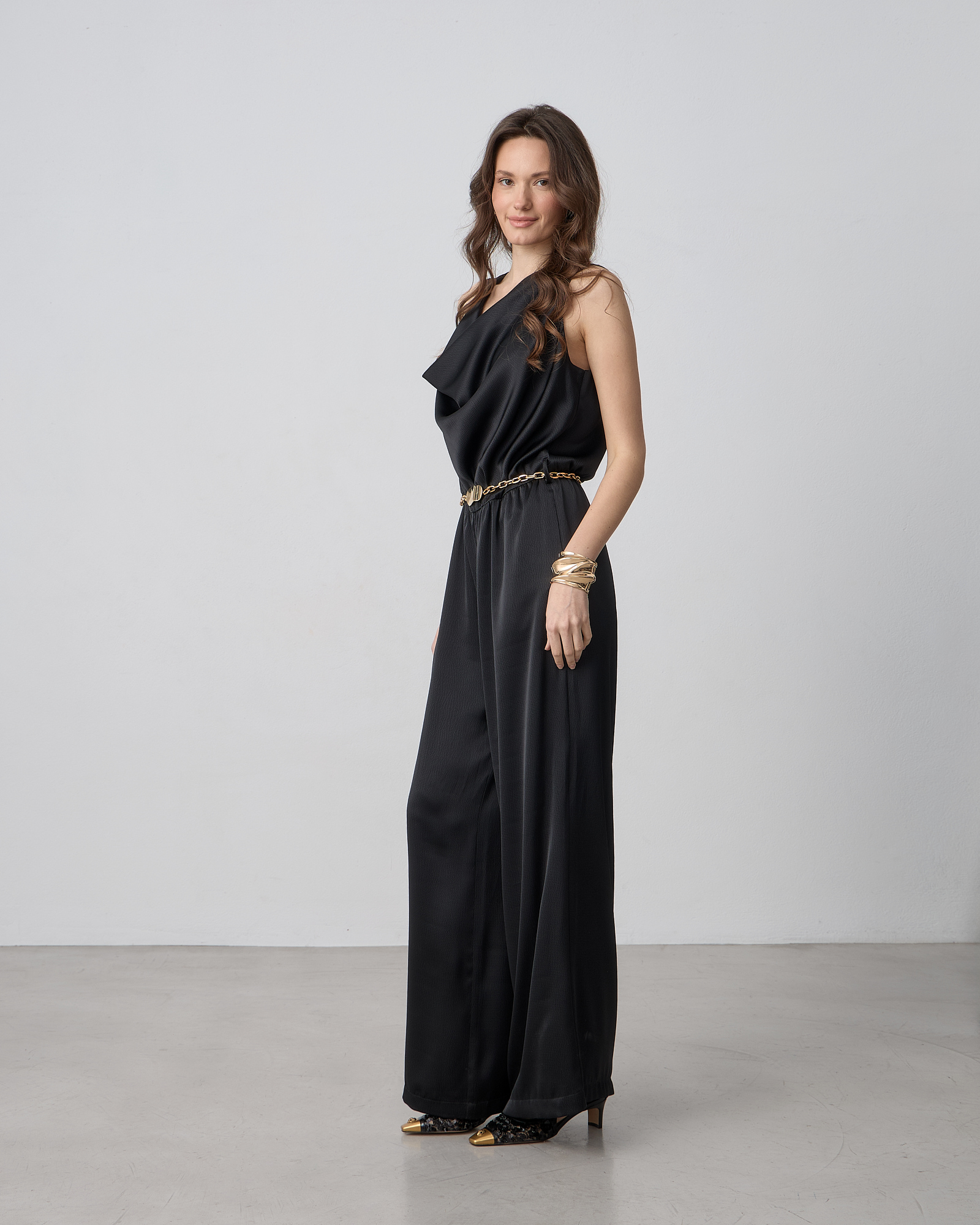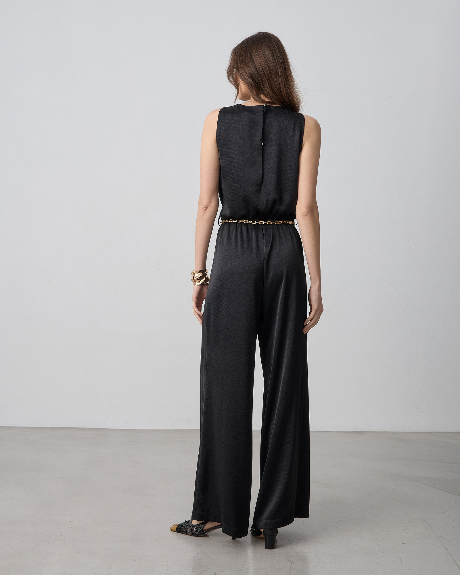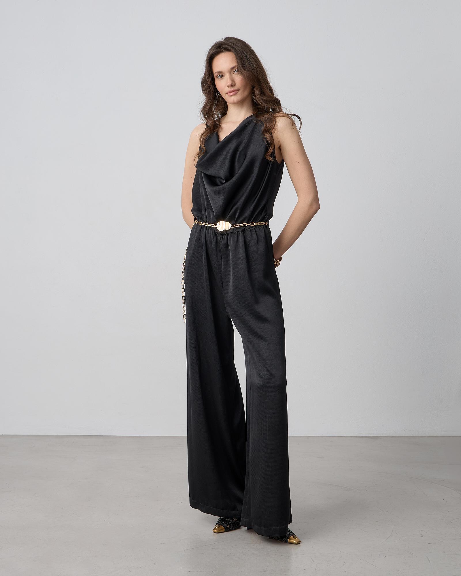 Φόρμα ολόσωμη αμάνικη με ντραπέ ντεκολτέ, διακοσμητική μεταλλική αλυσίδα στη μέση, κλείσιμο με κουμπιά στην πλάτη, σε σατέν υφή, κανονική εφαρμογή