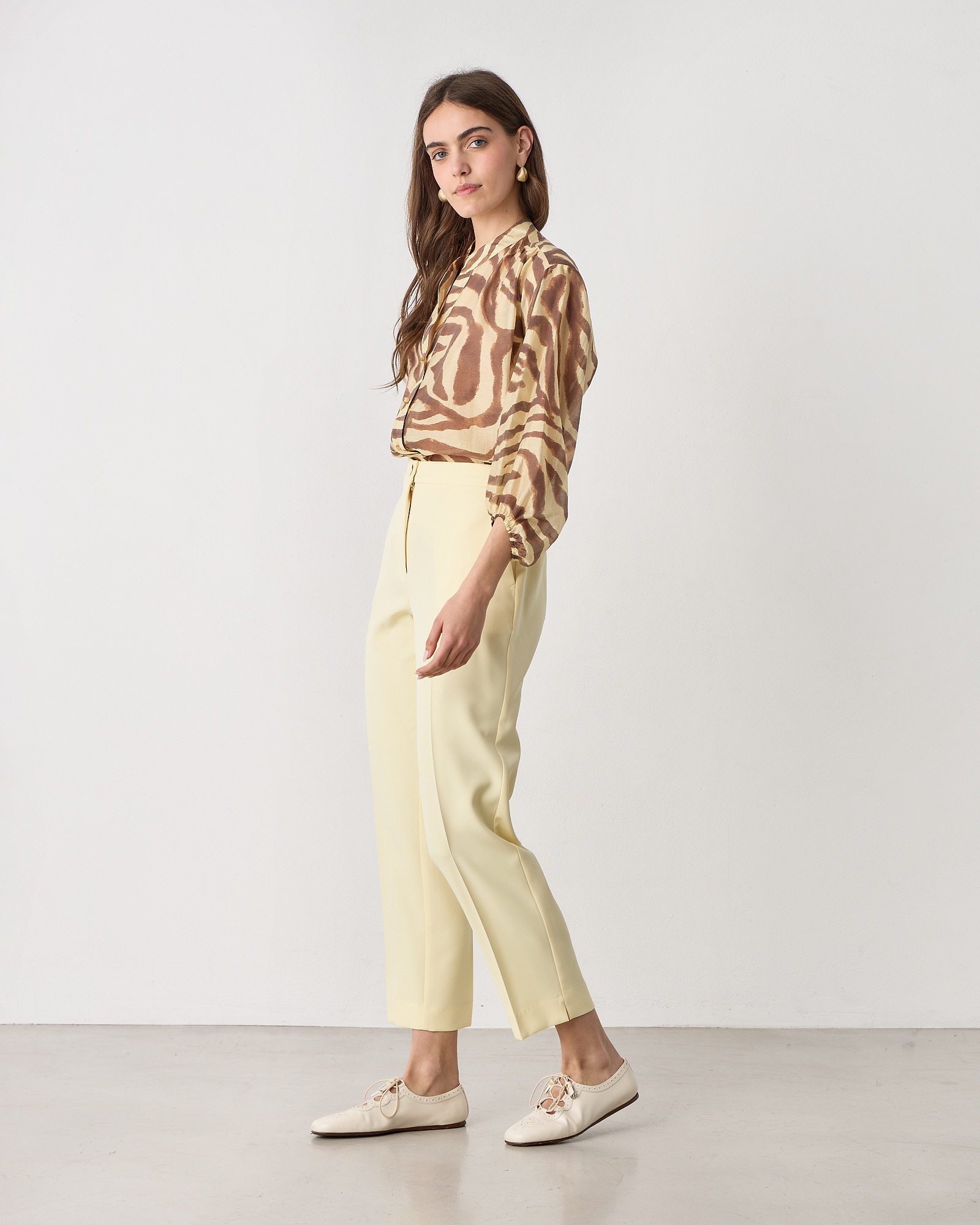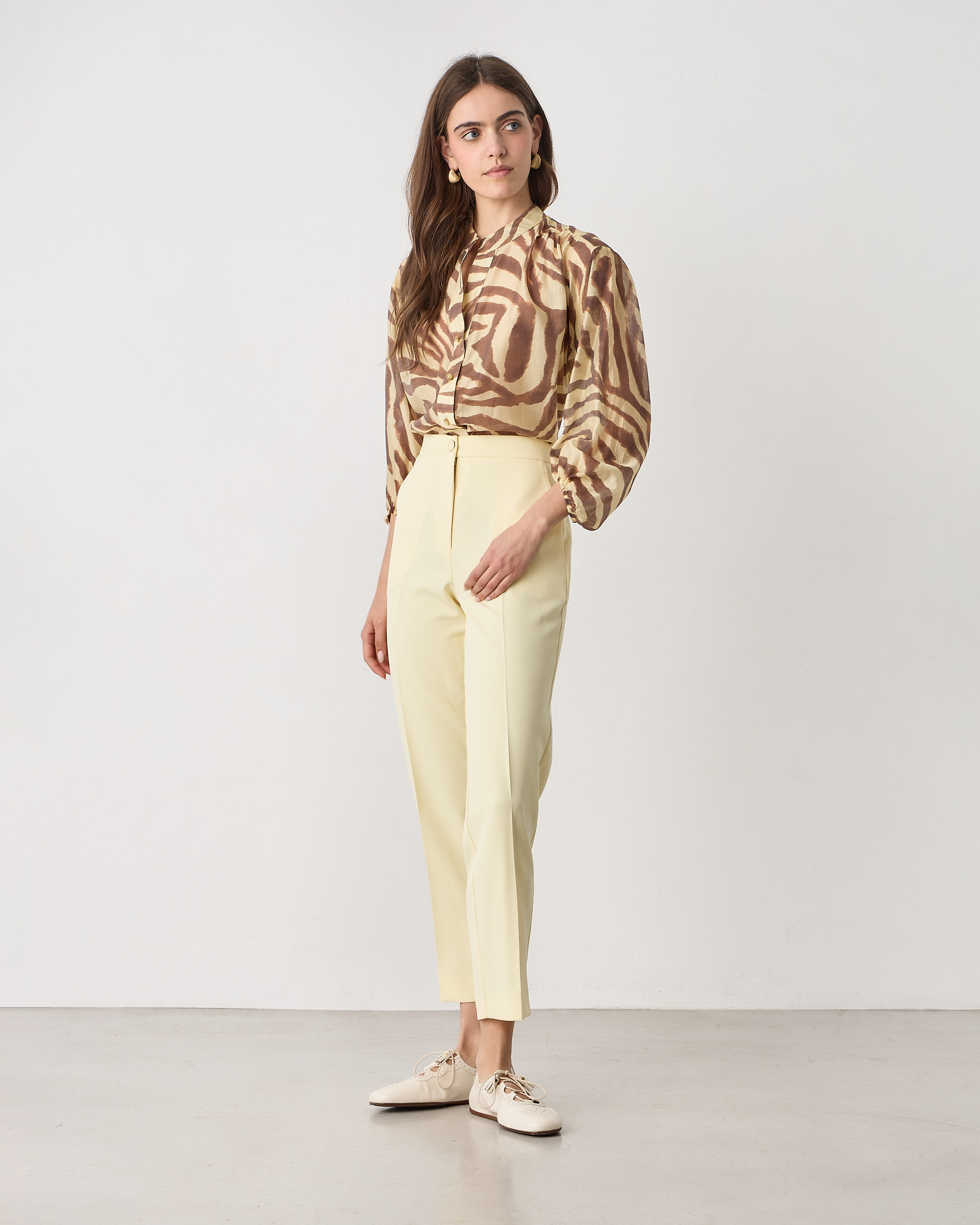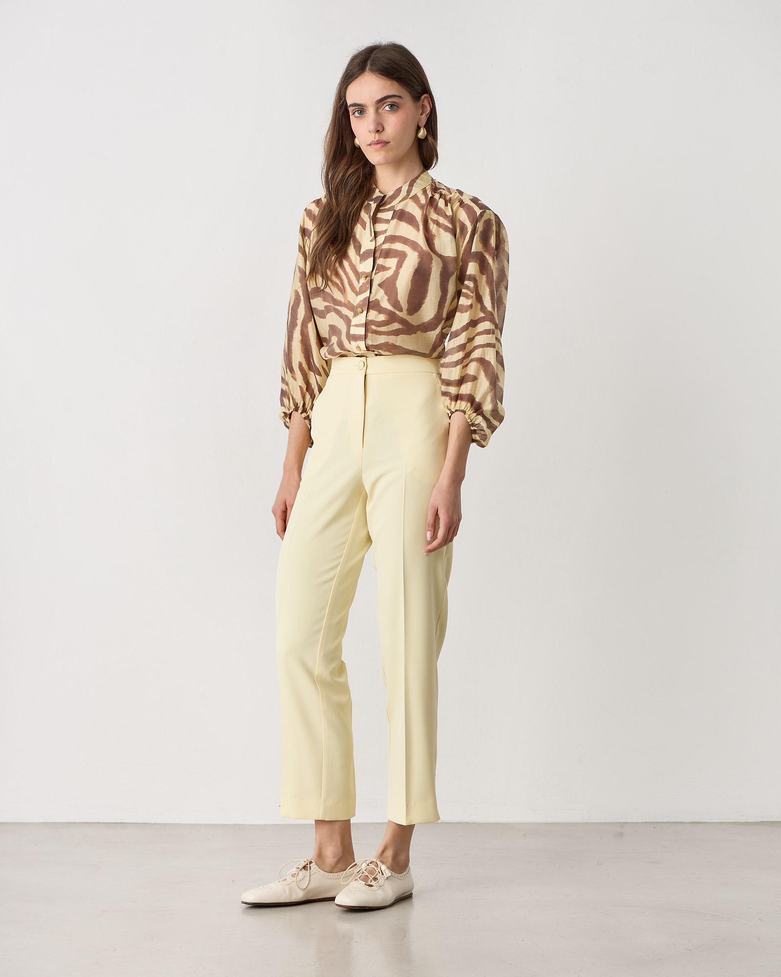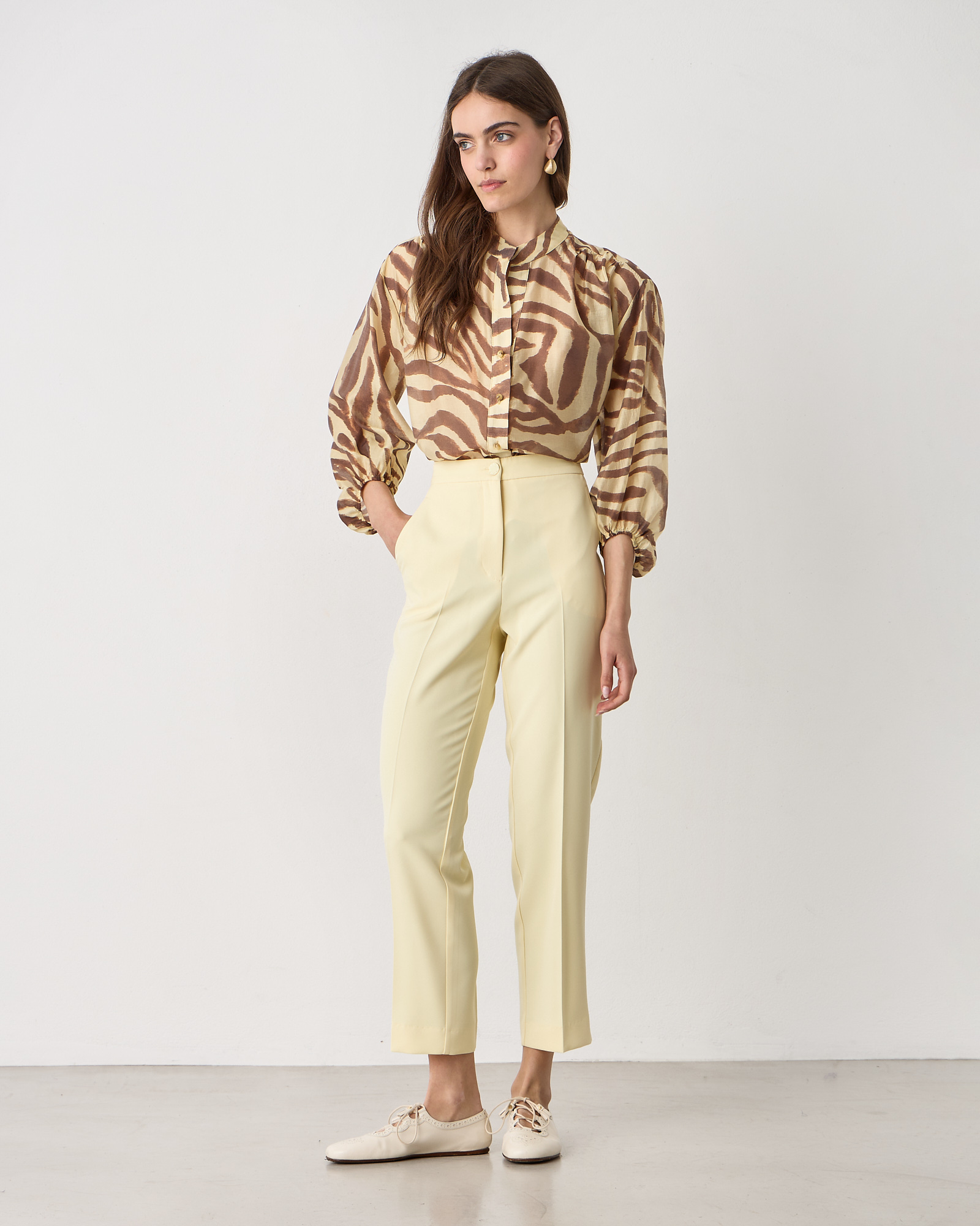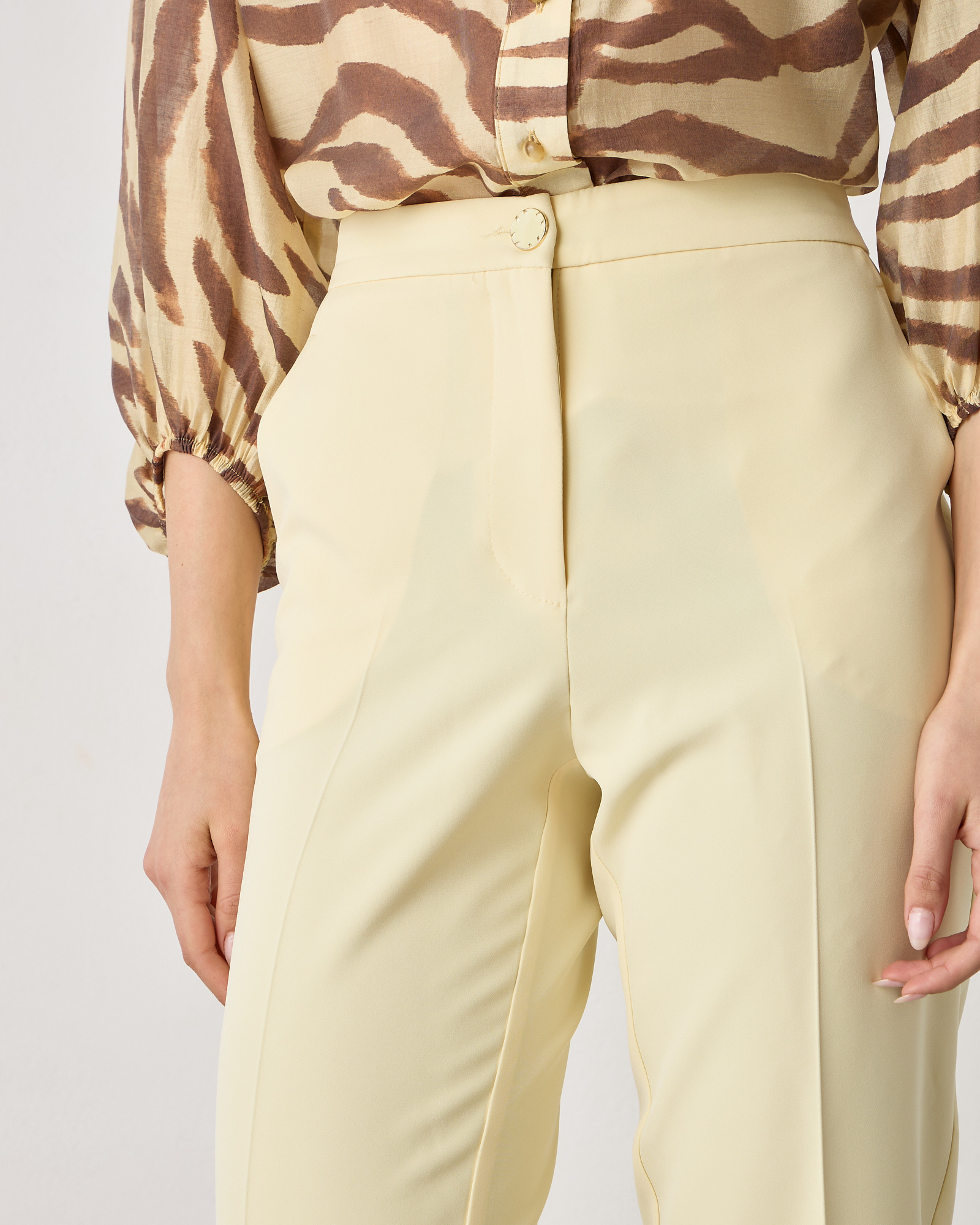 Παντελόνι ψηλόμεσο με λάστιχο στα πλαΐνά, κλείσιμο μπροστά με φερμουάρ και κουμπί, τσέπες στο πλάι, σε κρεπ υφή, σε κανονική γραμμή