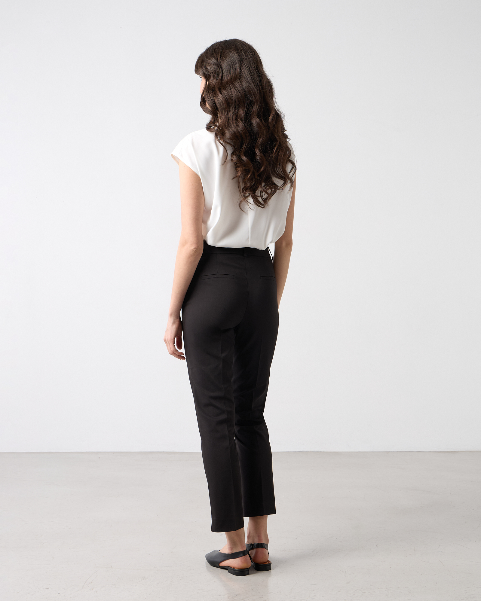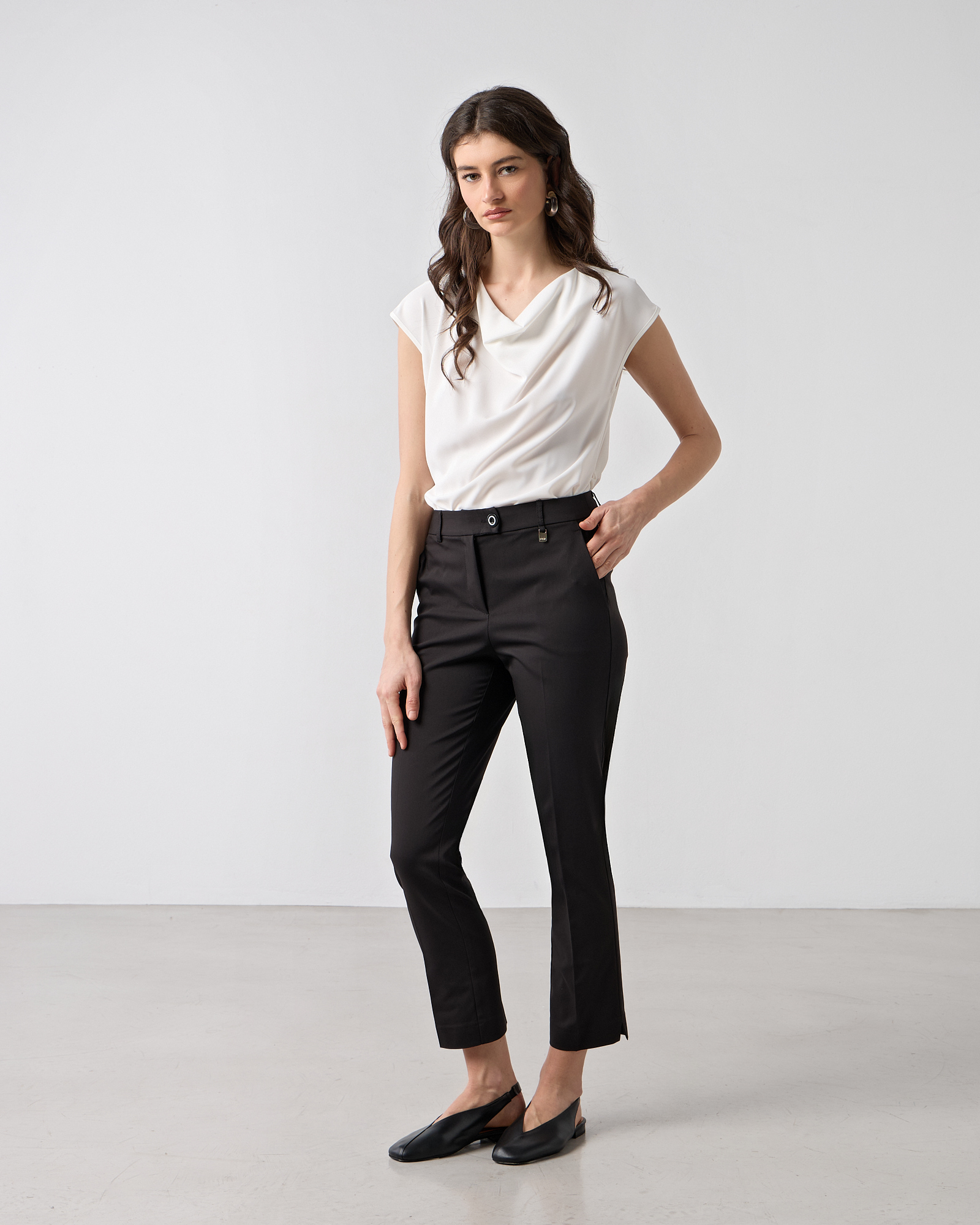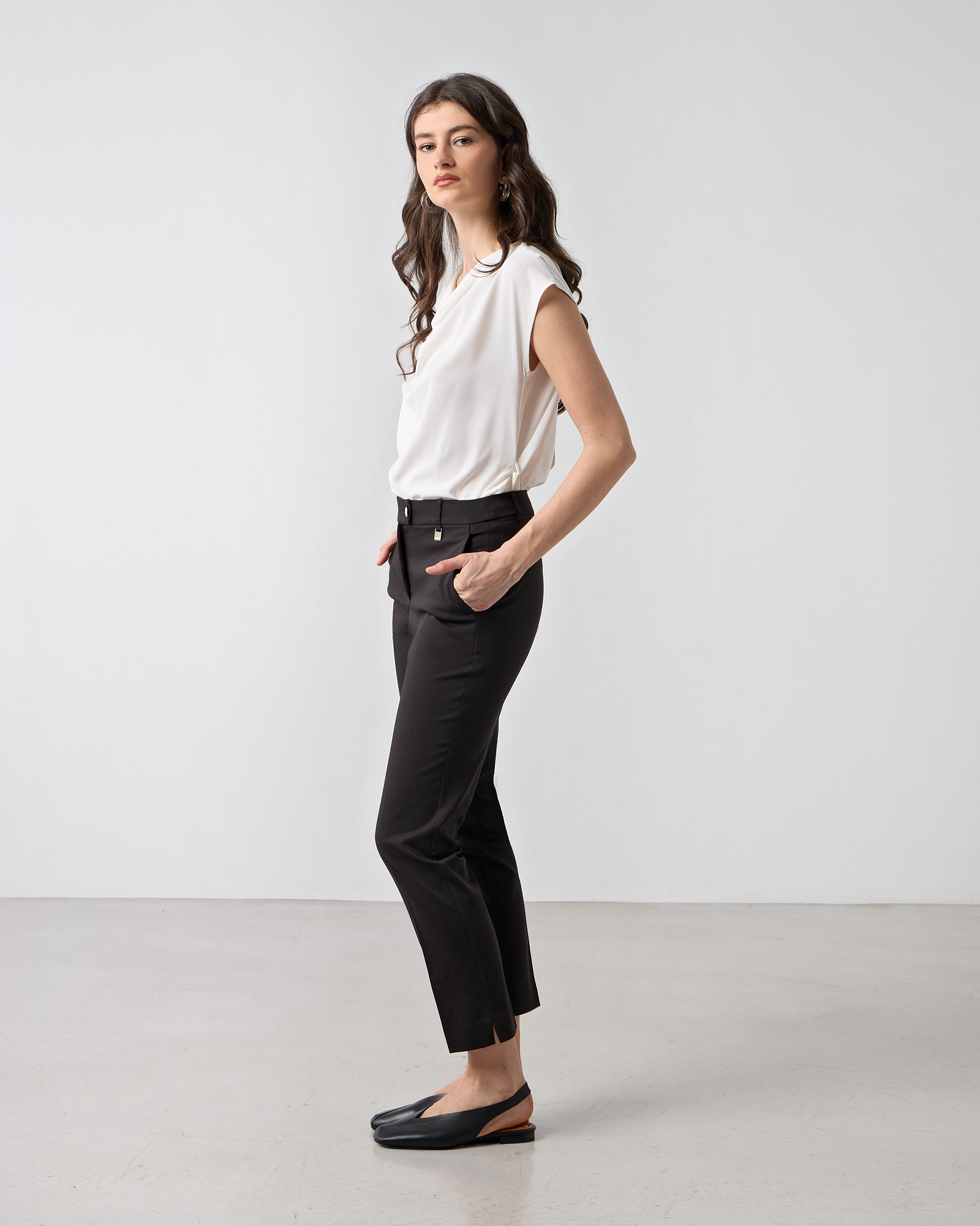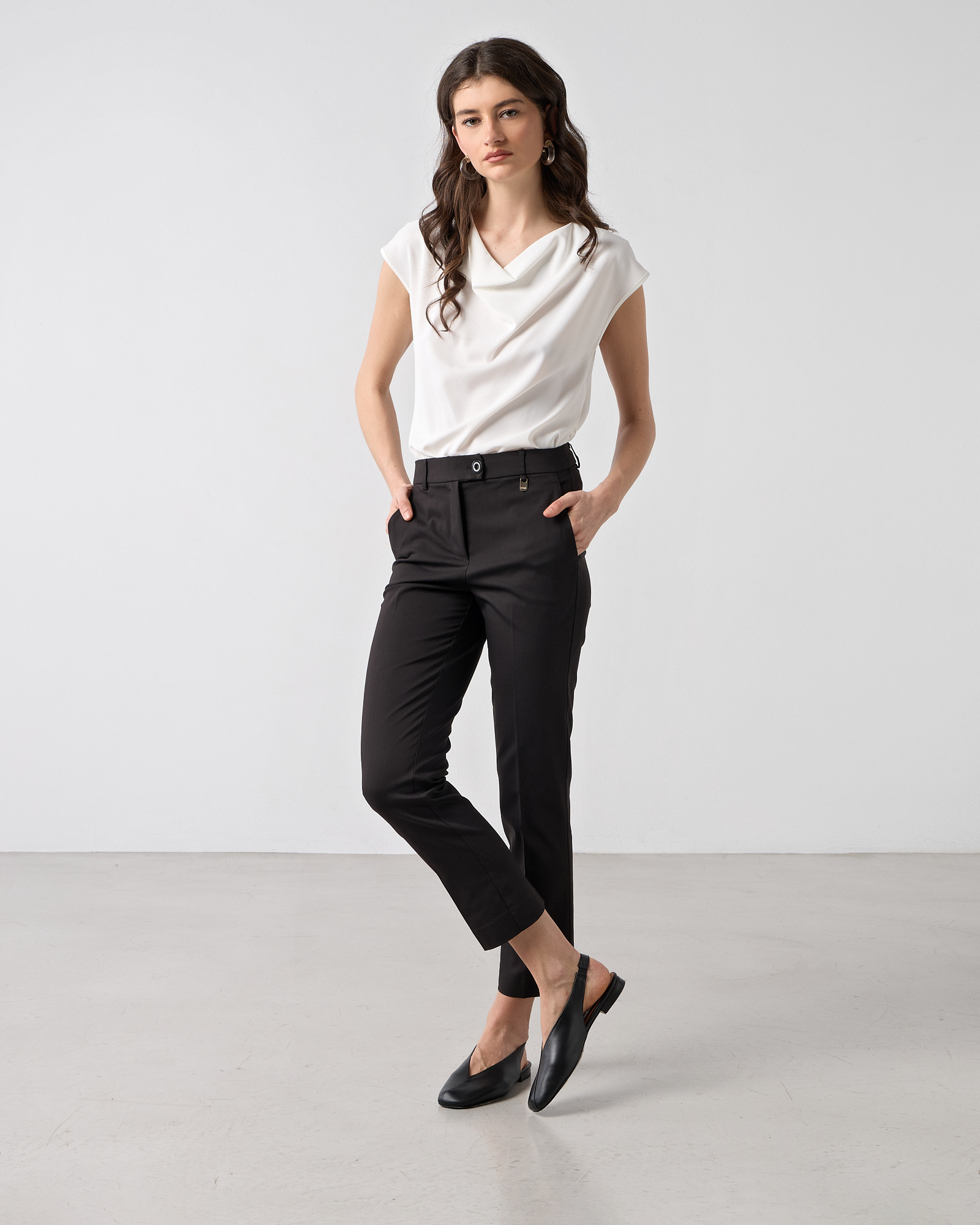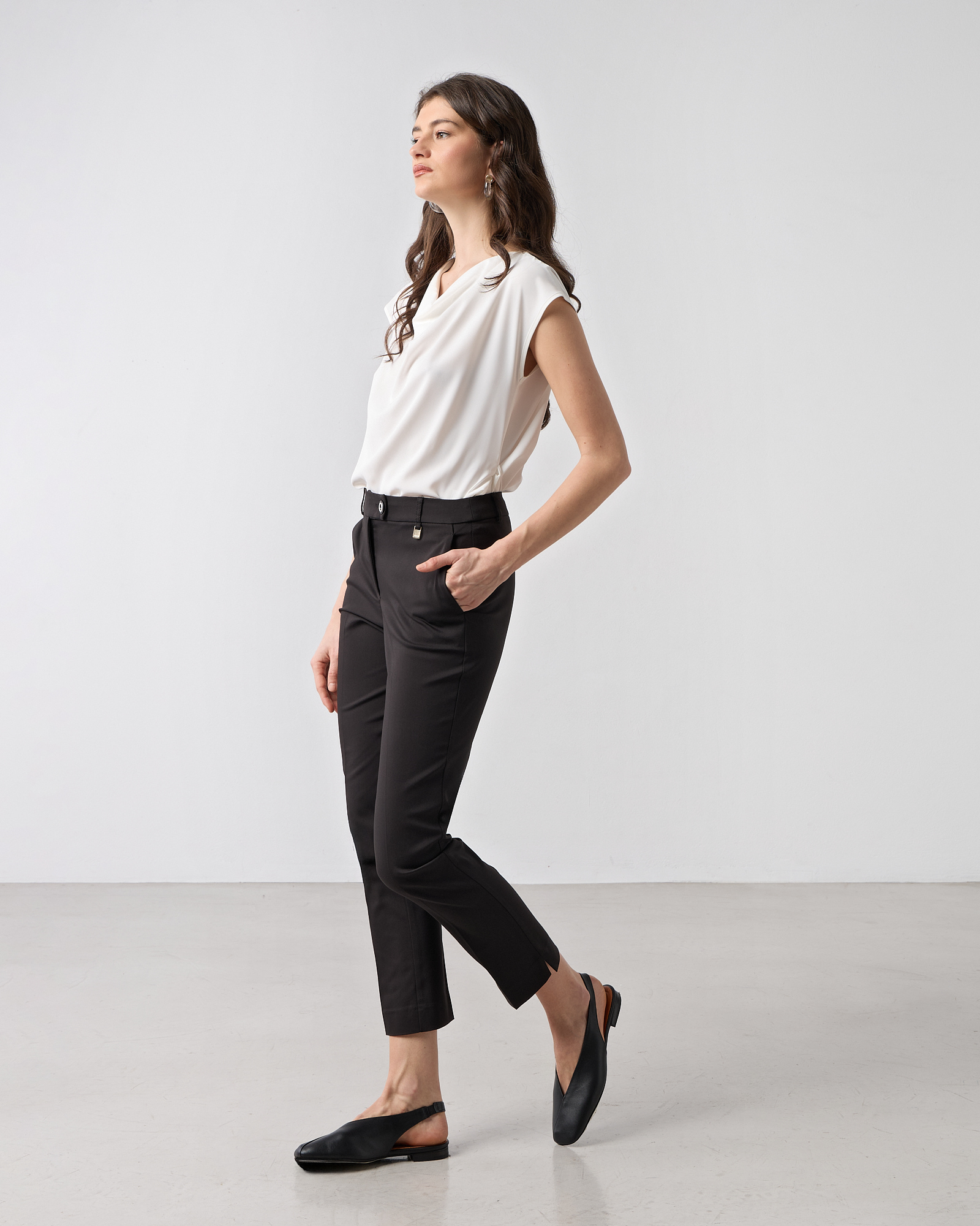 Παντελόνι cigarette σε υφή καπαρντίνα, κλείσιμο μπροστά με φερμουάρ και κουμπί, με πλαΐνές τσέπες, σε κανονική γραμμή