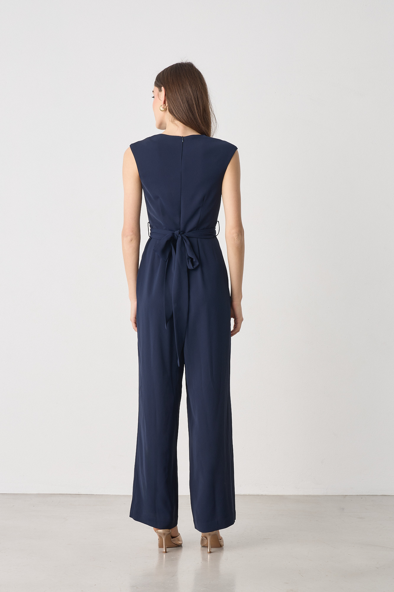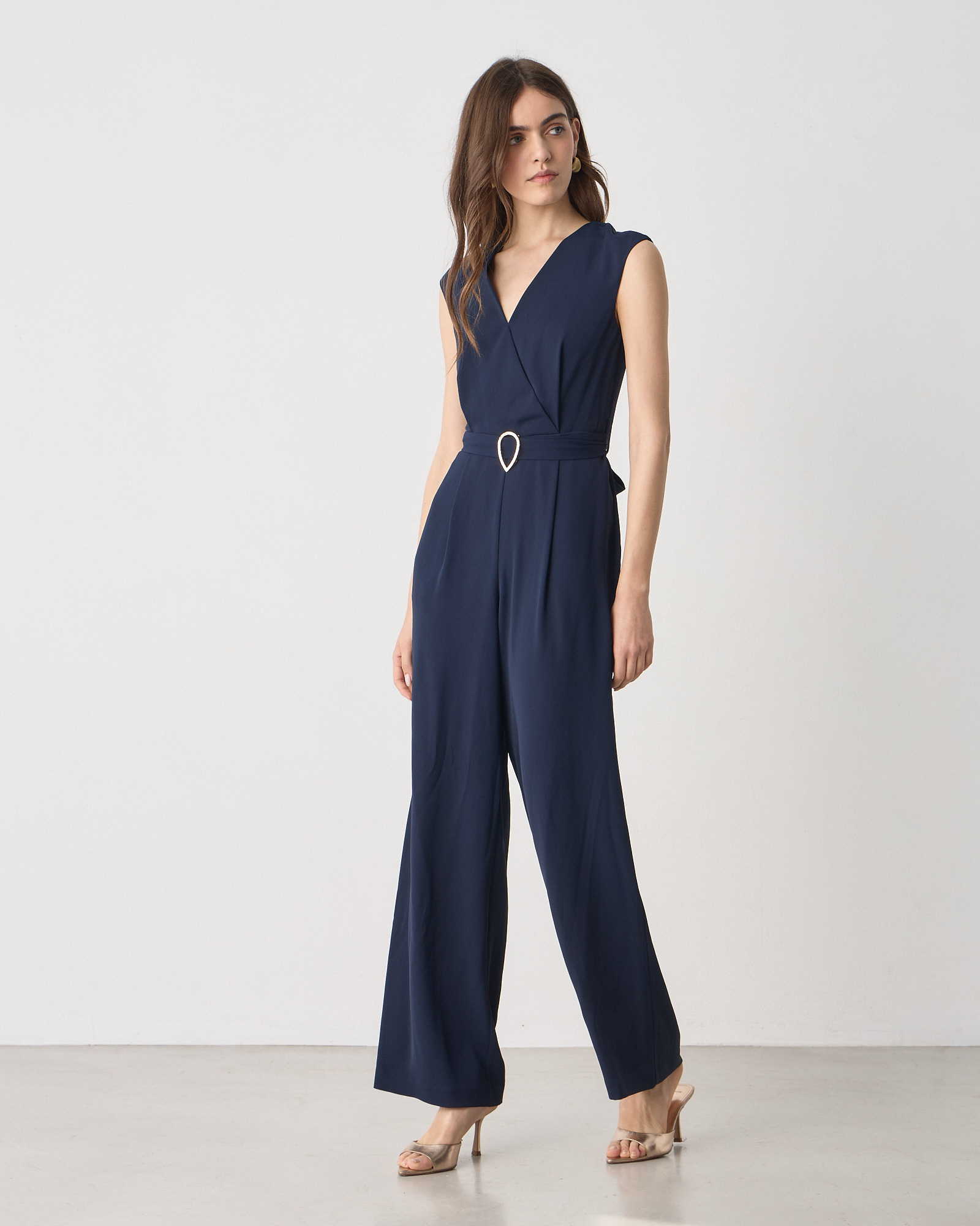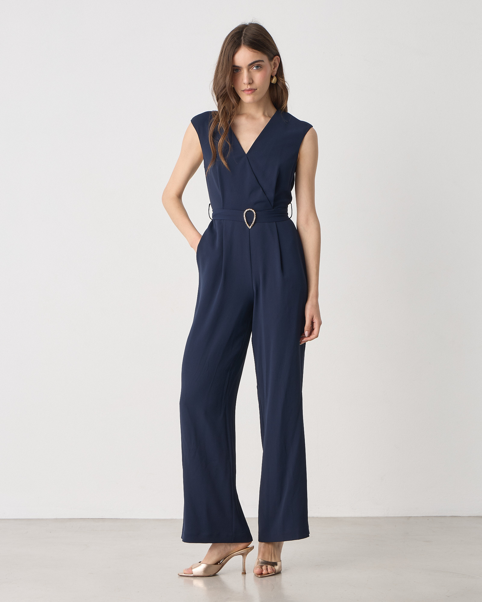 Ολόσωμη φόρμα κοντομάνικη με V λαιμόκοψη, κρουαζέ, αποσπώμενη ζώνη, wide leg, κλείσιμο με φερμουάρ στο πίσω μέρος, σε κανονική γραμμή