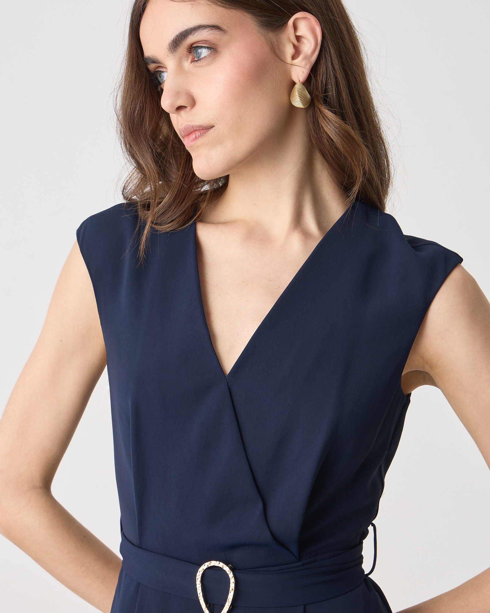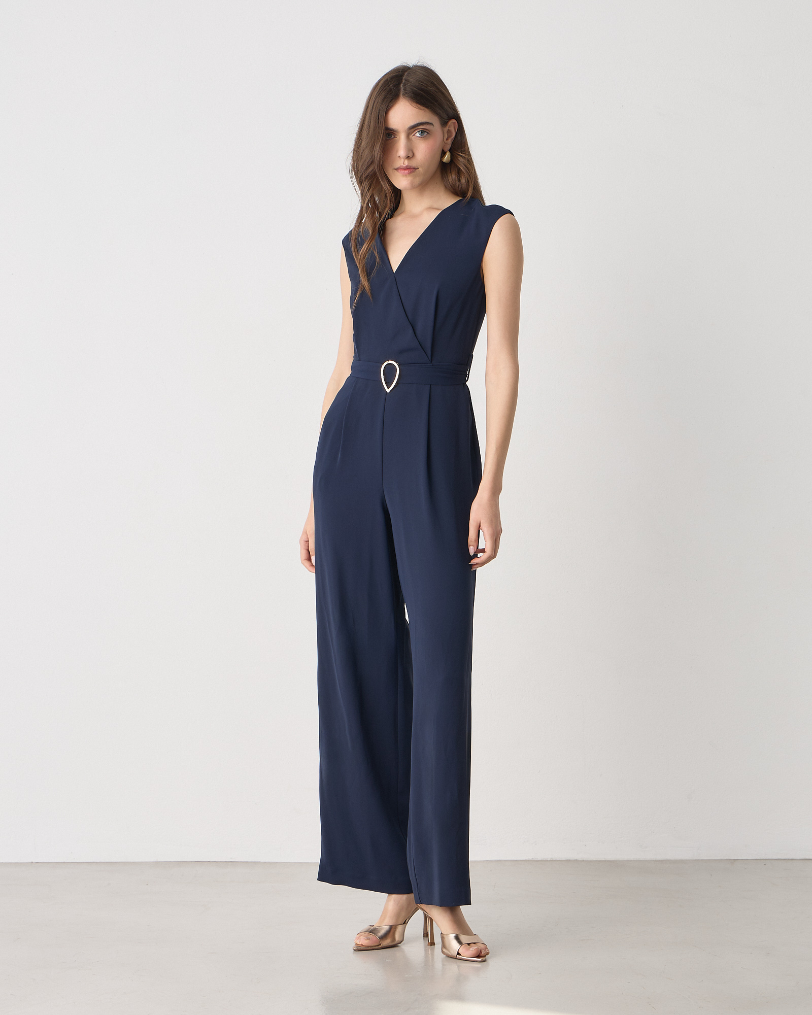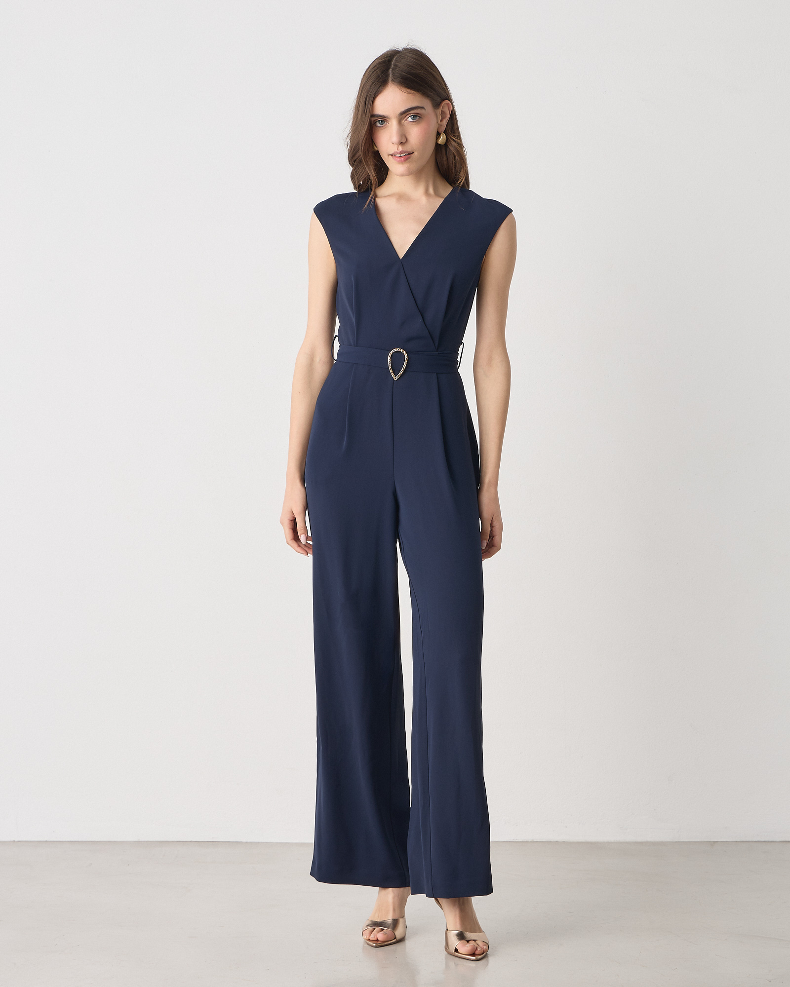 Ολόσωμη φόρμα κοντομάνικη με V λαιμόκοψη, κρουαζέ, αποσπώμενη ζώνη, wide leg, κλείσιμο με φερμουάρ στο πίσω μέρος, σε κανονική γραμμή