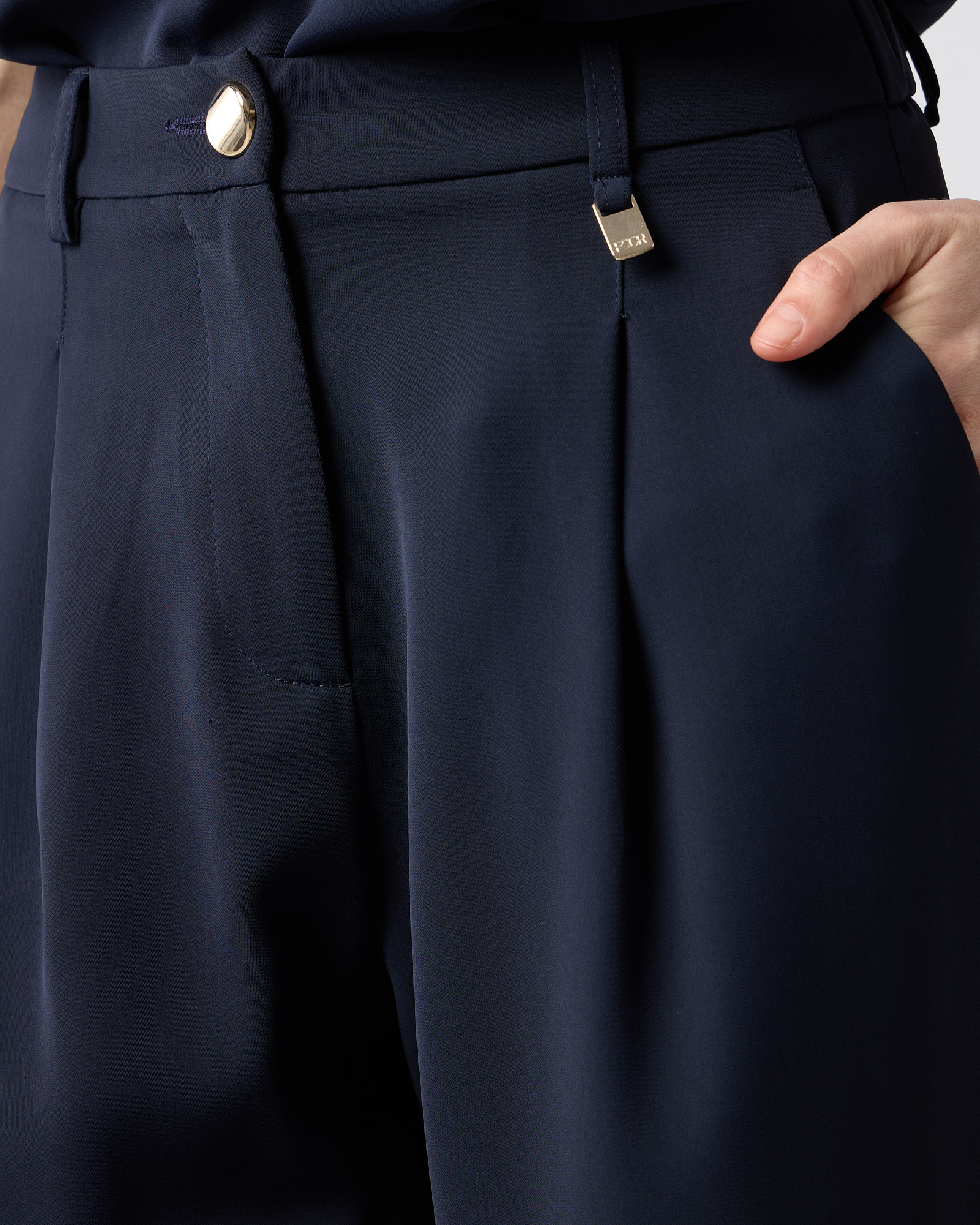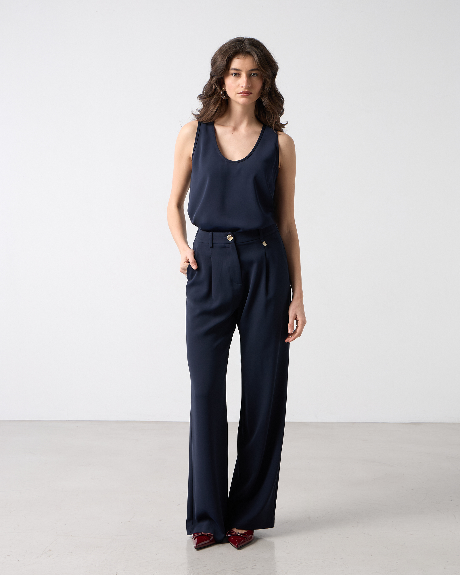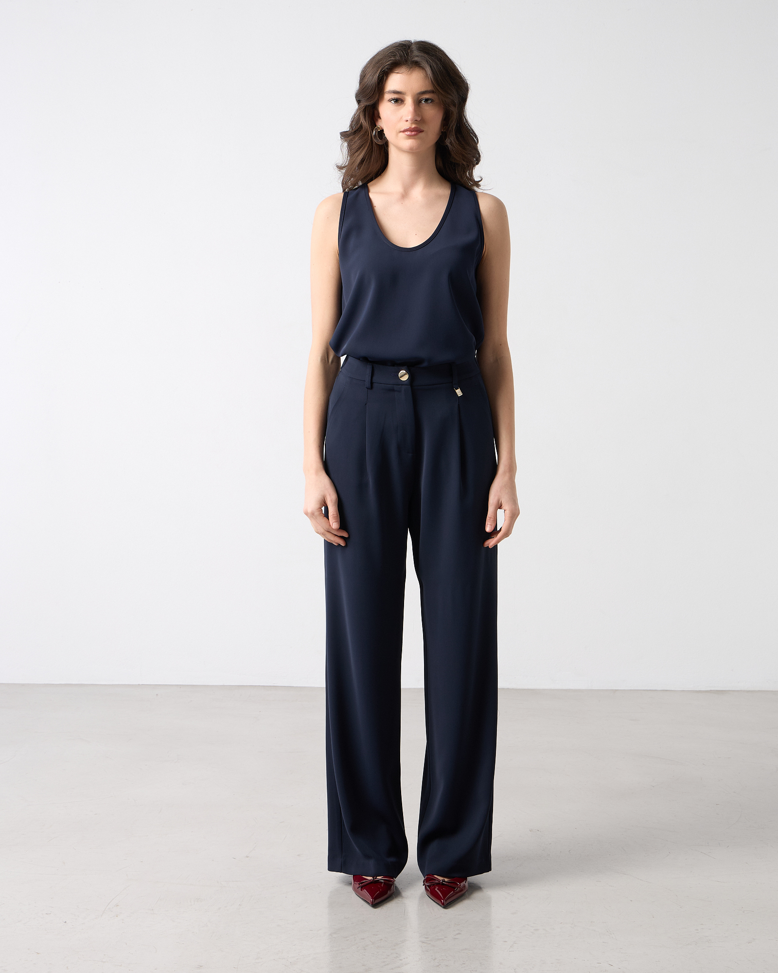 Παντελόνα ψηλόμεση με πιέτες, κλείσιμο μπροστά με φερμουάρ και κουμπί, πλαΐνές τσέπες σε κρεπ υφή, σε κανονική γραμμή