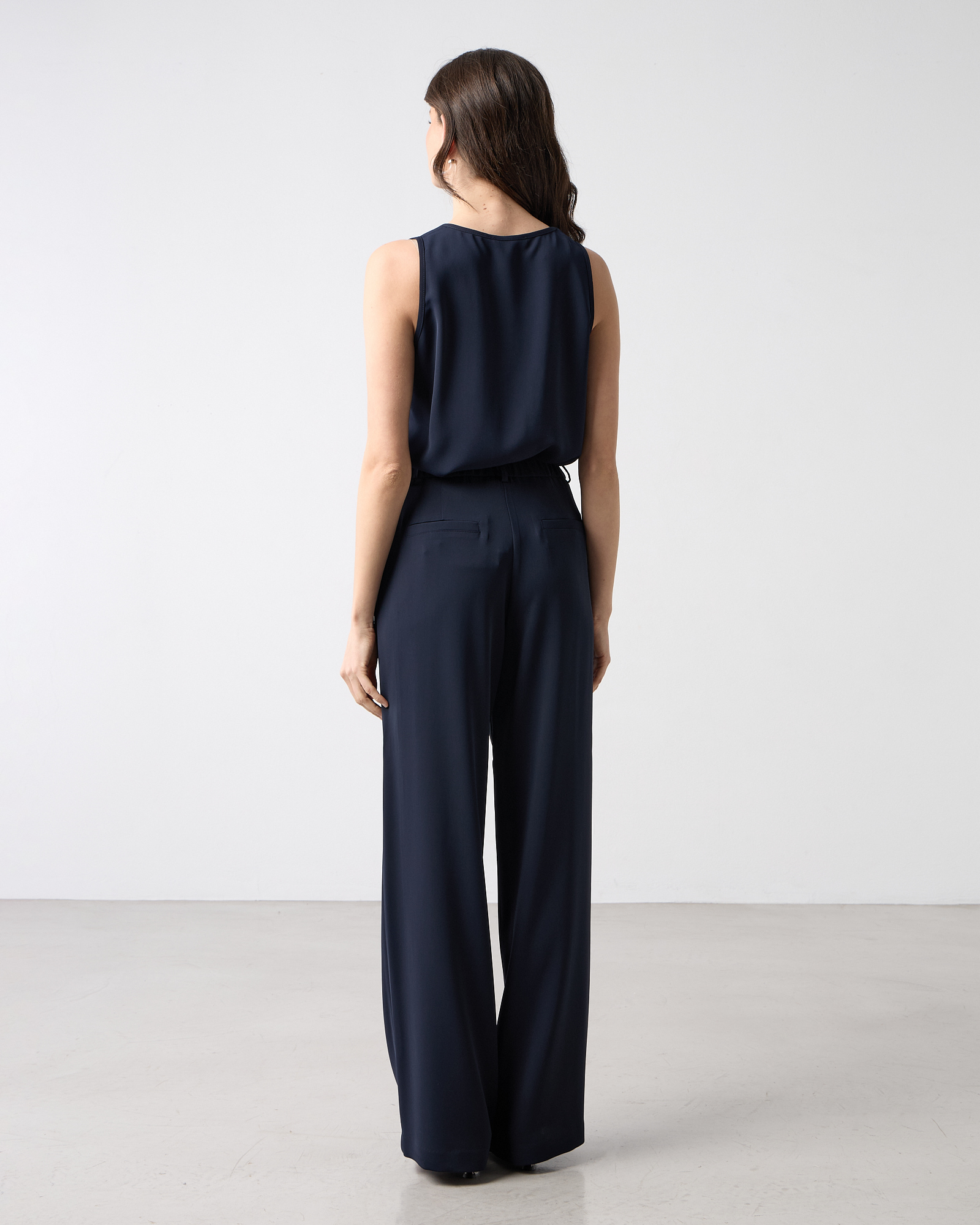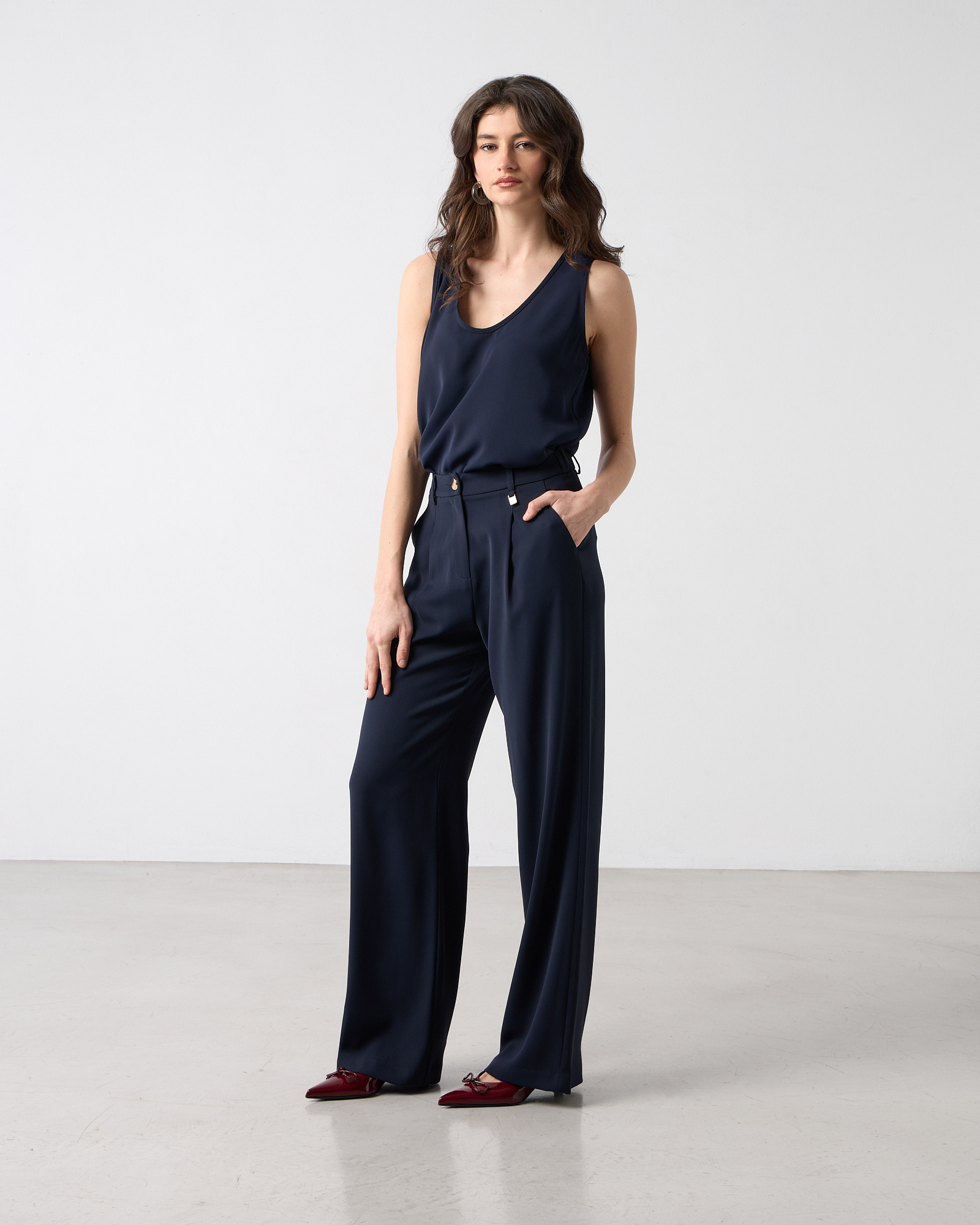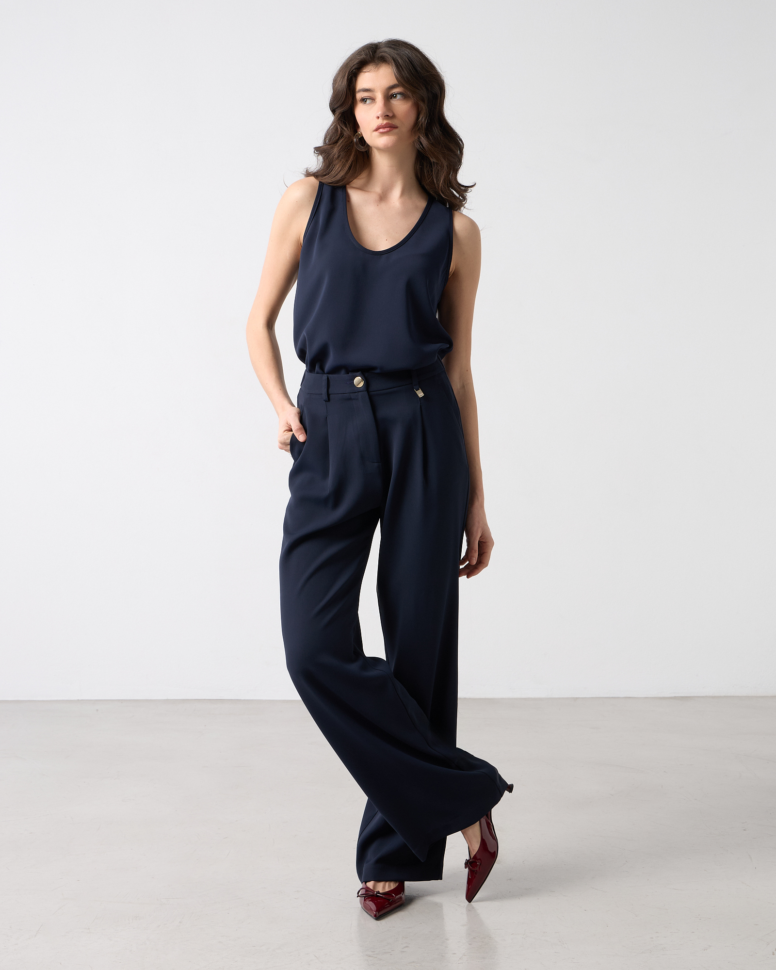 Παντελόνα ψηλόμεση με πιέτες, κλείσιμο μπροστά με φερμουάρ και κουμπί, πλαΐνές τσέπες σε κρεπ υφή, σε κανονική γραμμή