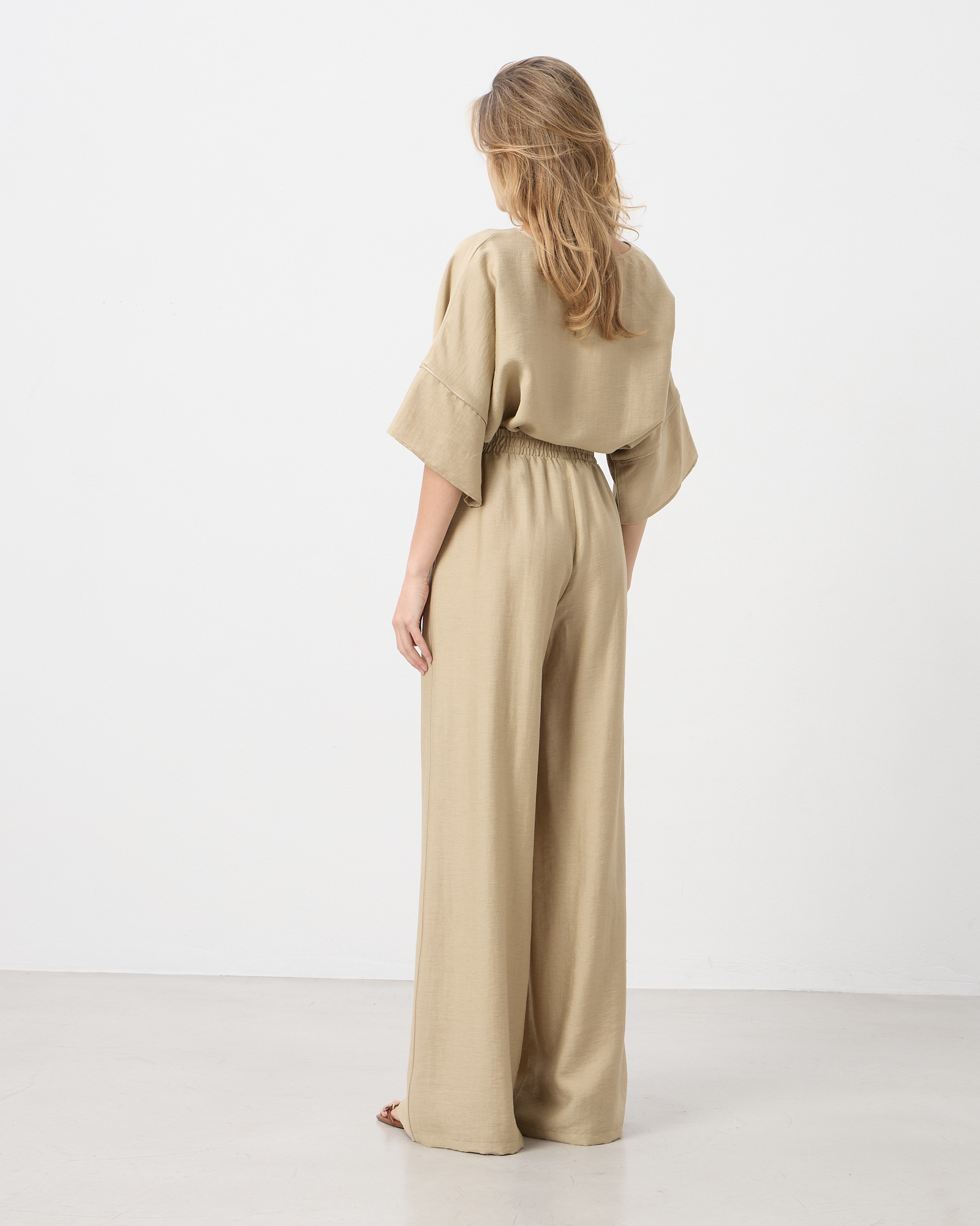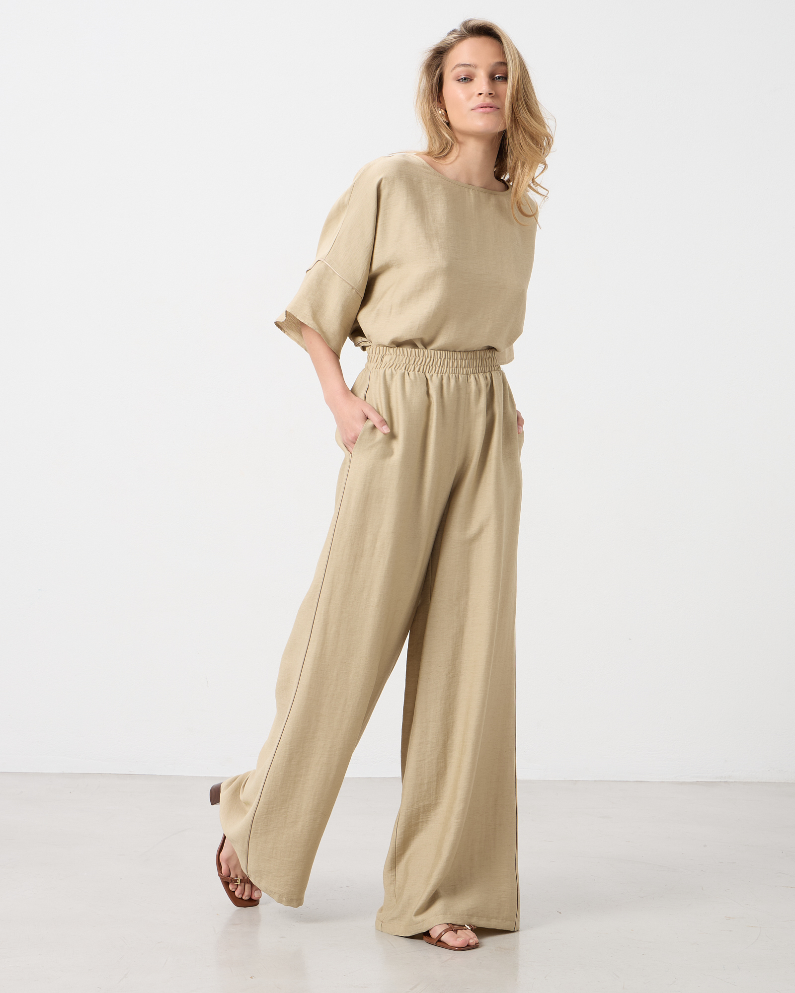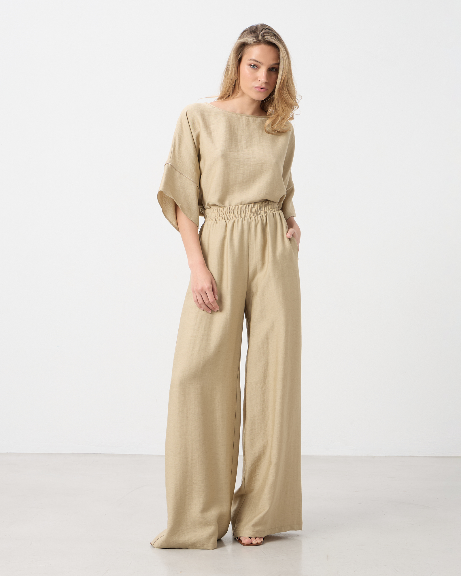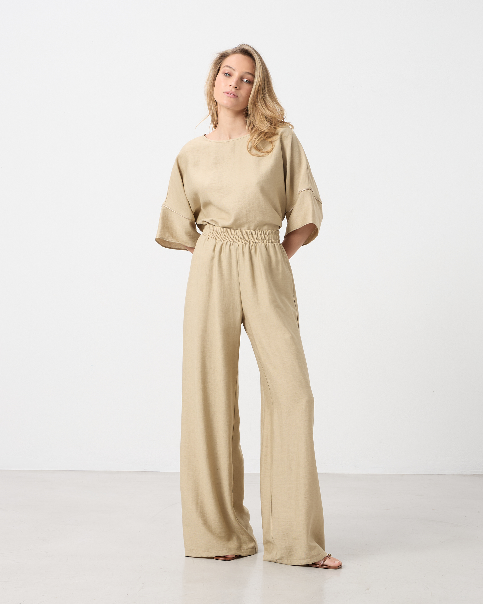 Παντελόνα ψηλόμεση με λάστιχο στη μέση, τσέπες στο πλάι, λινή όψη σε κανονική εφαρμογή