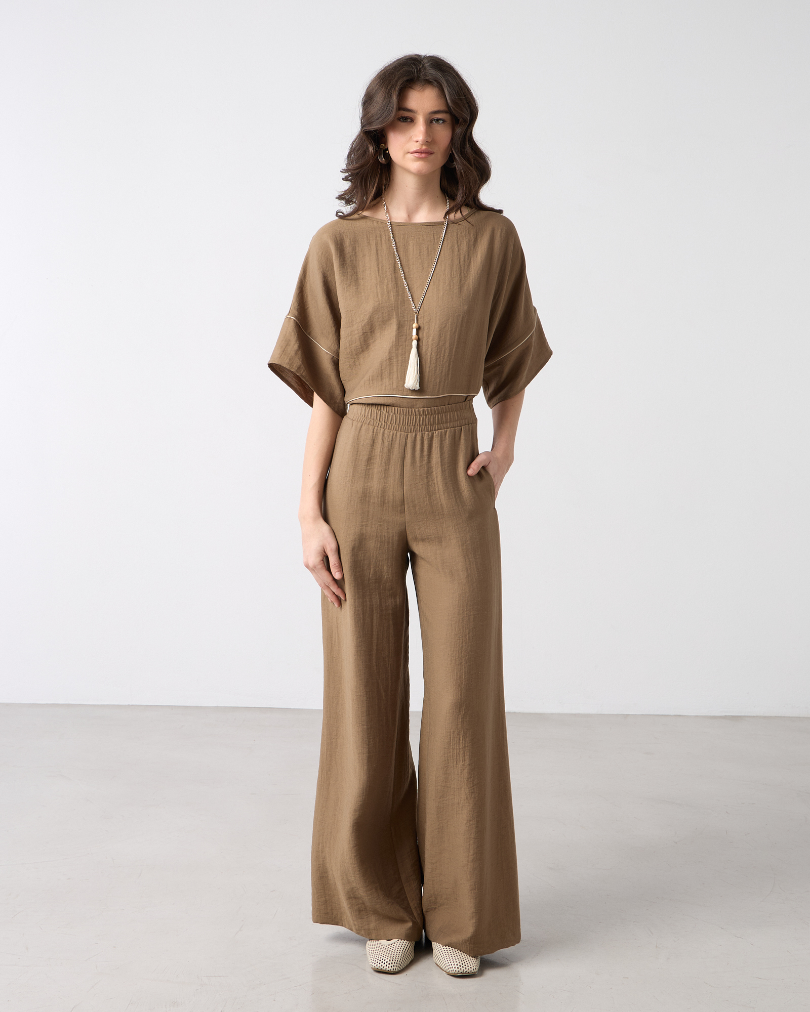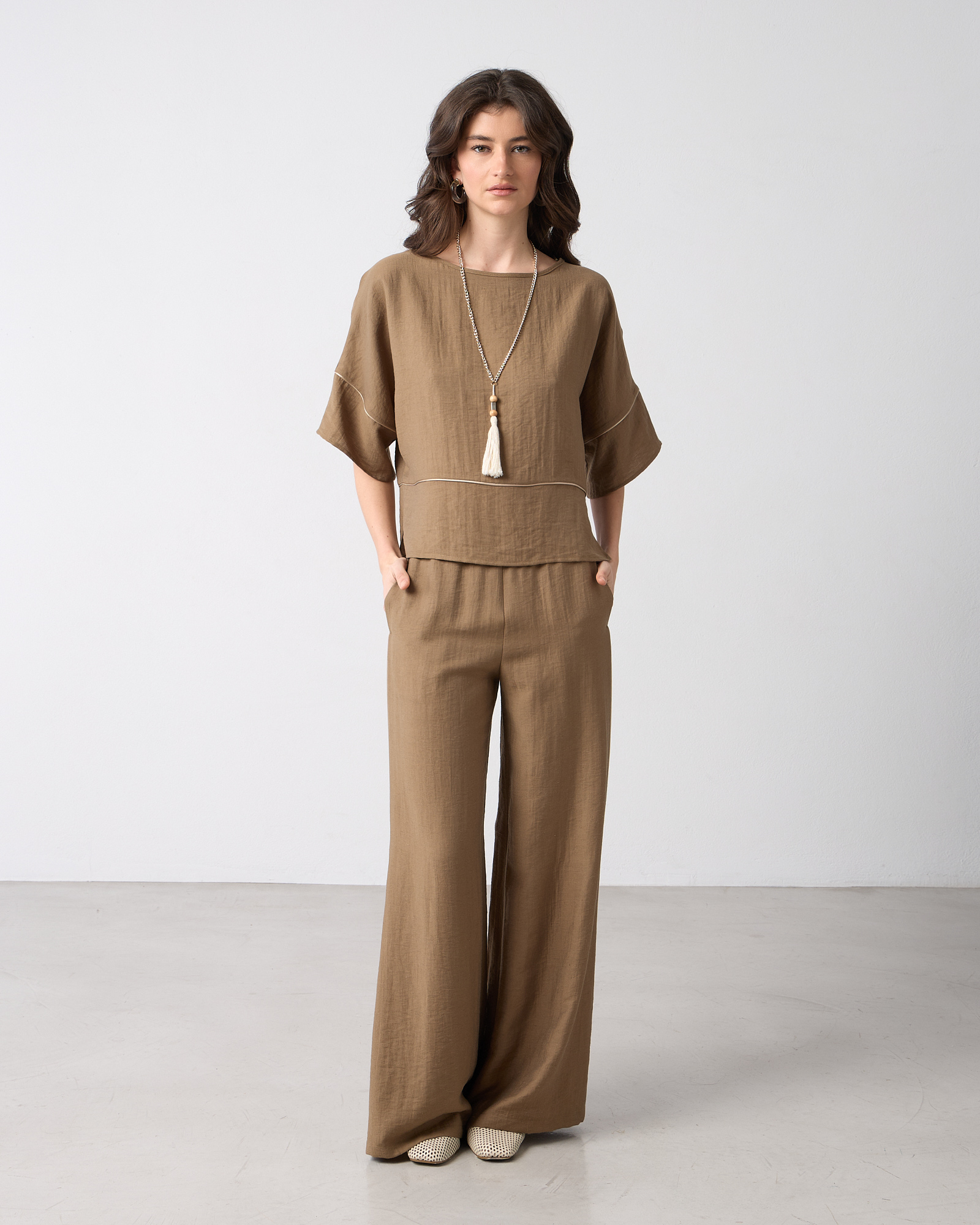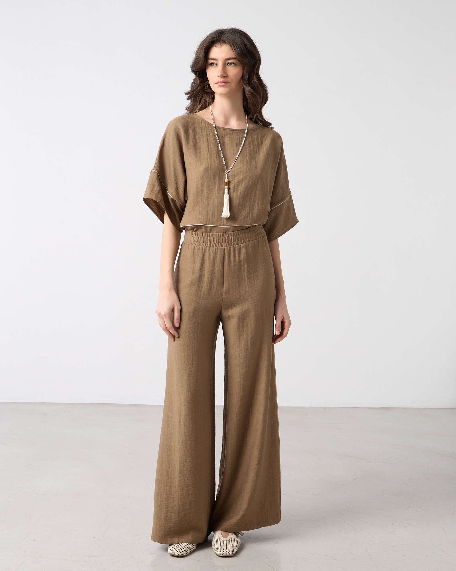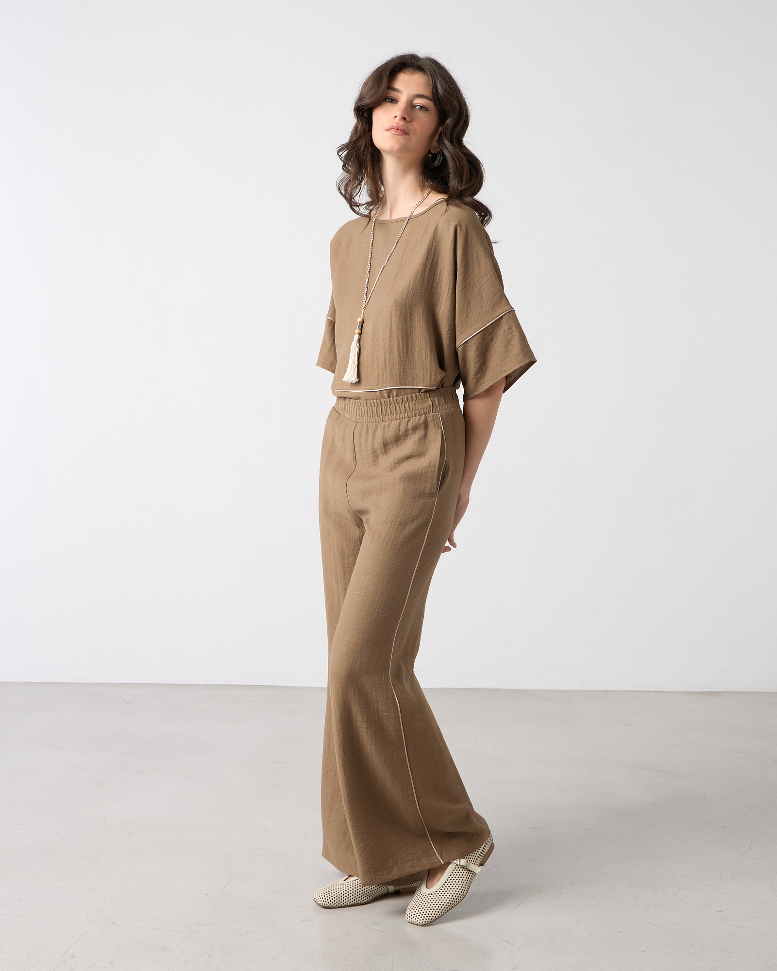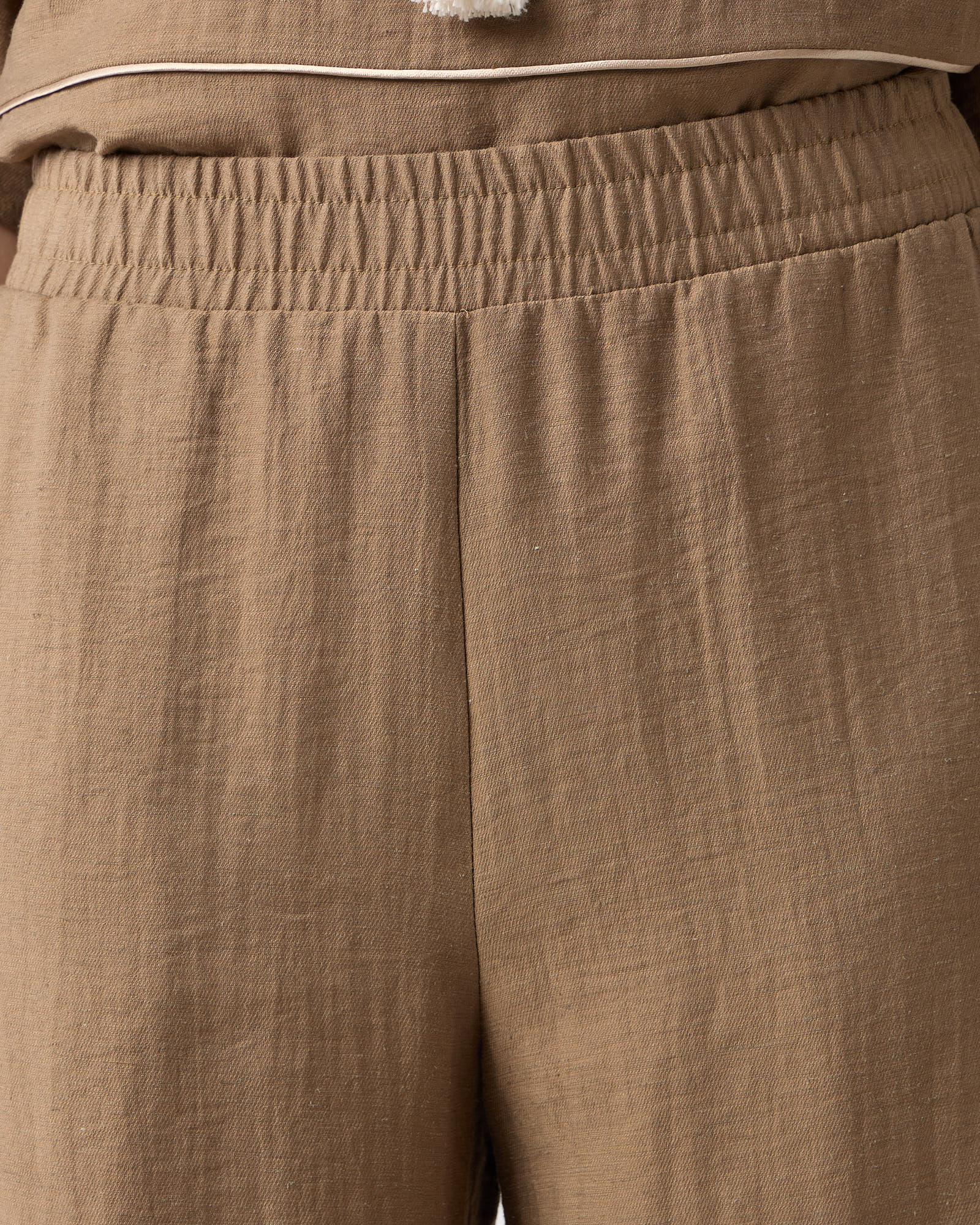 Παντελόνα ψηλόμεση με λάστιχο στη μέση, τσέπες στο πλάι, λινή όψη σε κανονική εφαρμογή