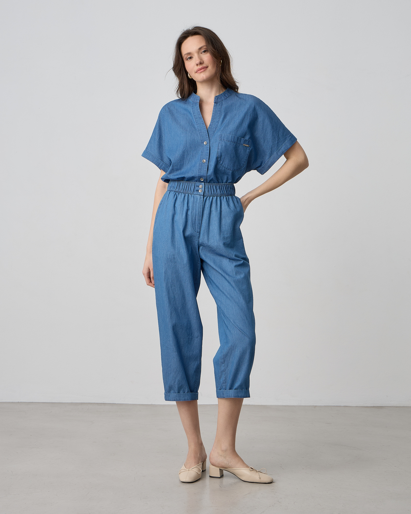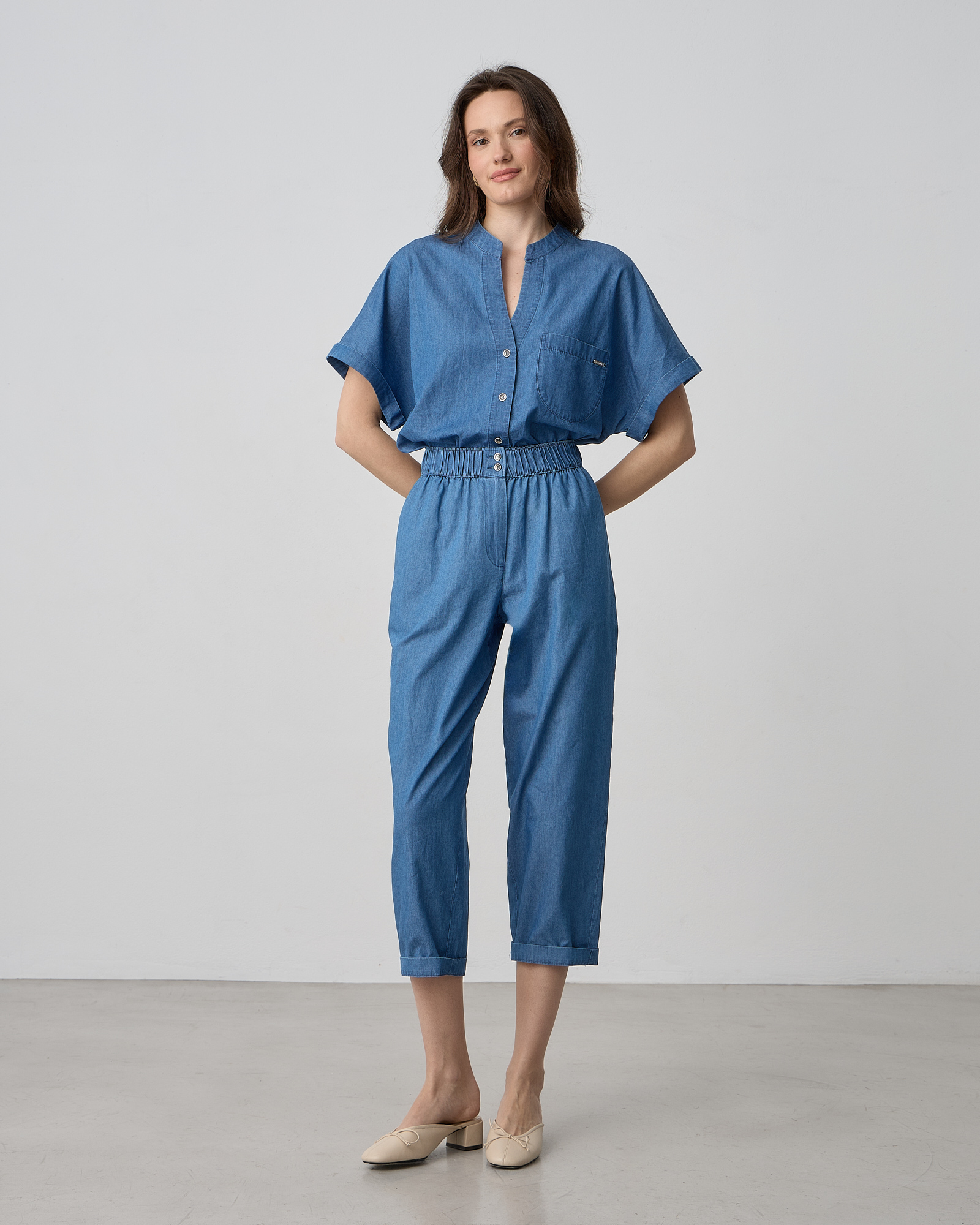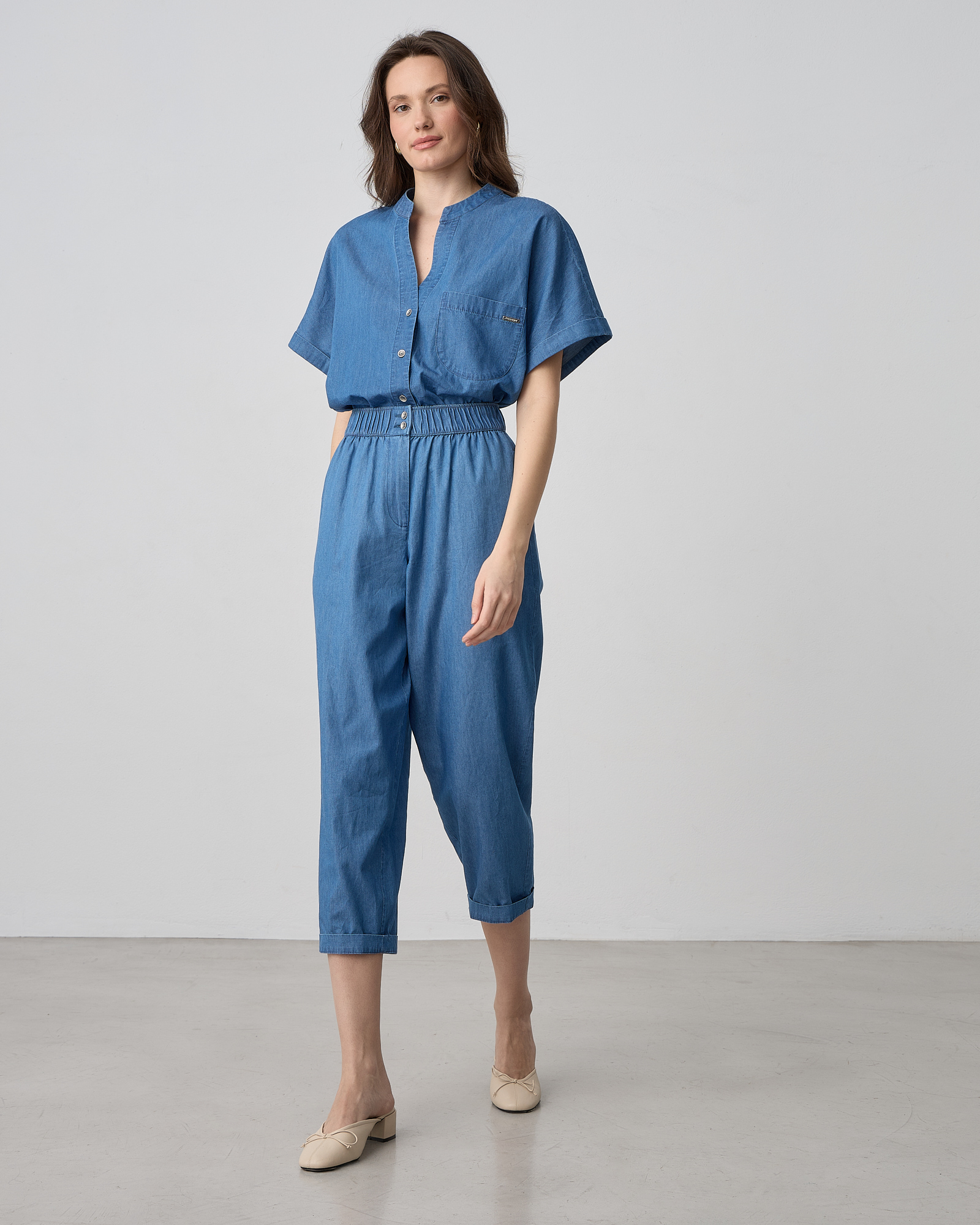 Παντελόνι σε denim όψη, ψηλόμεσο με ελαστική μέση, κλείσιμο με κουμπιά και φερμουάρ, cropped, βαμβακερό σε άνετη γραμμή
