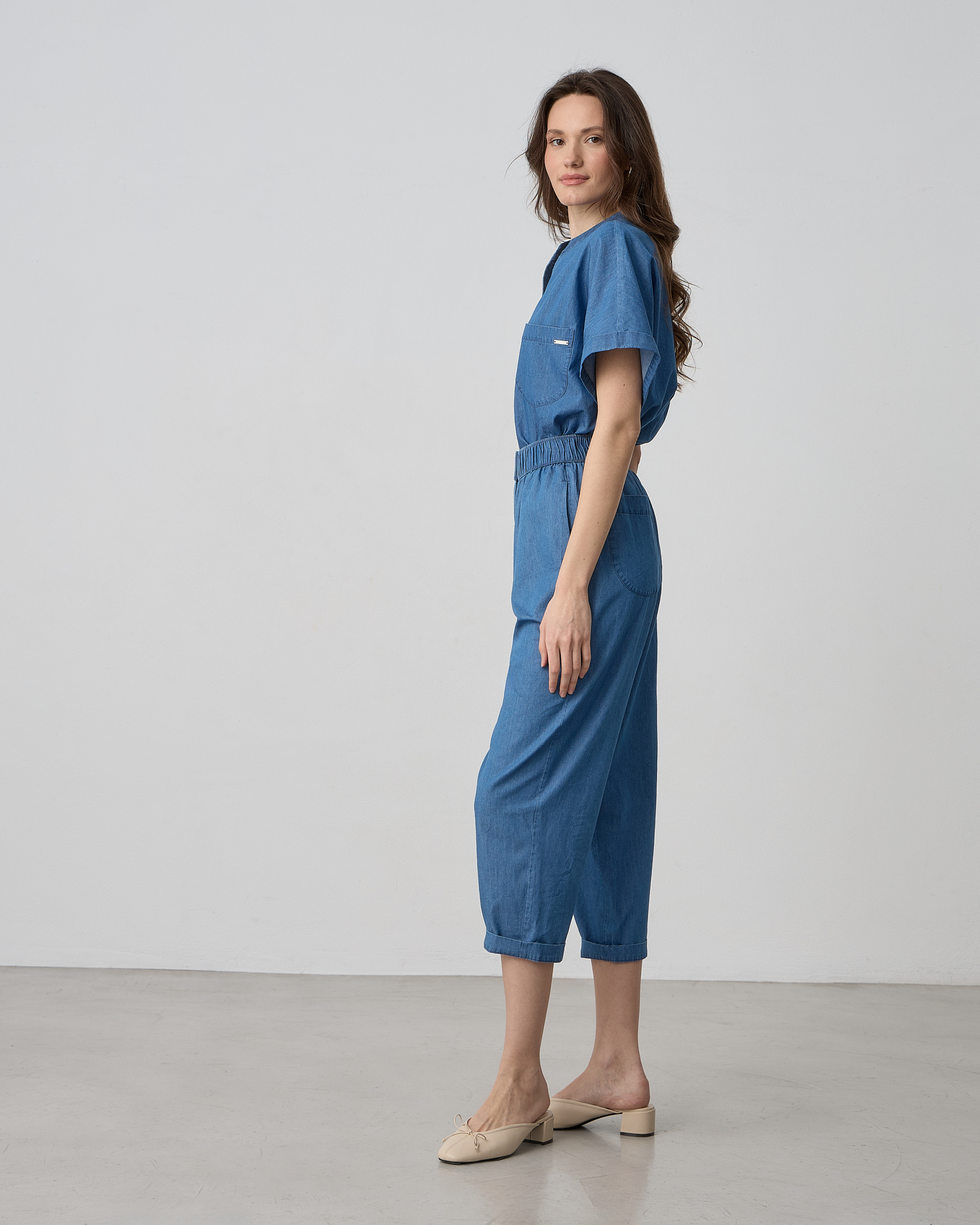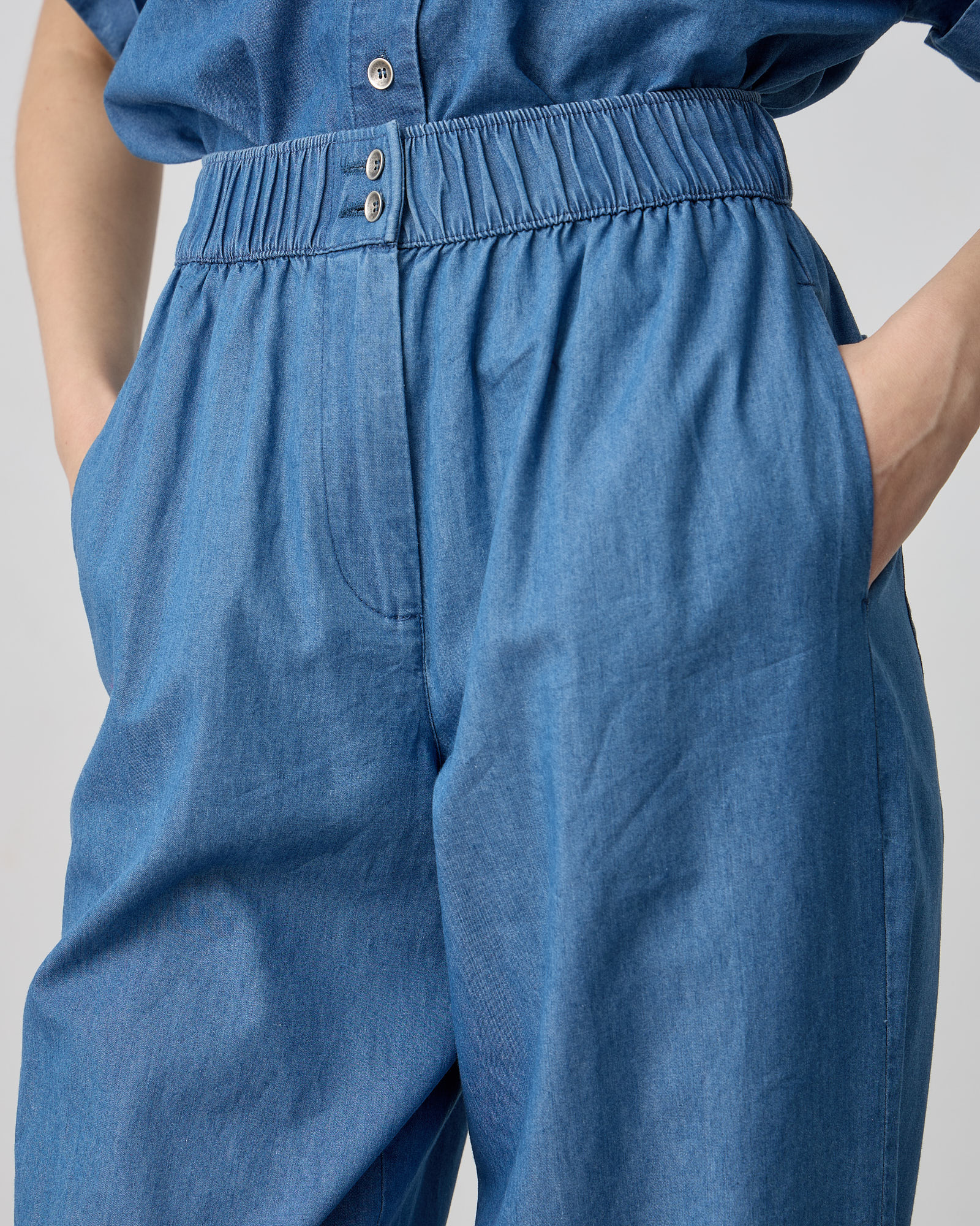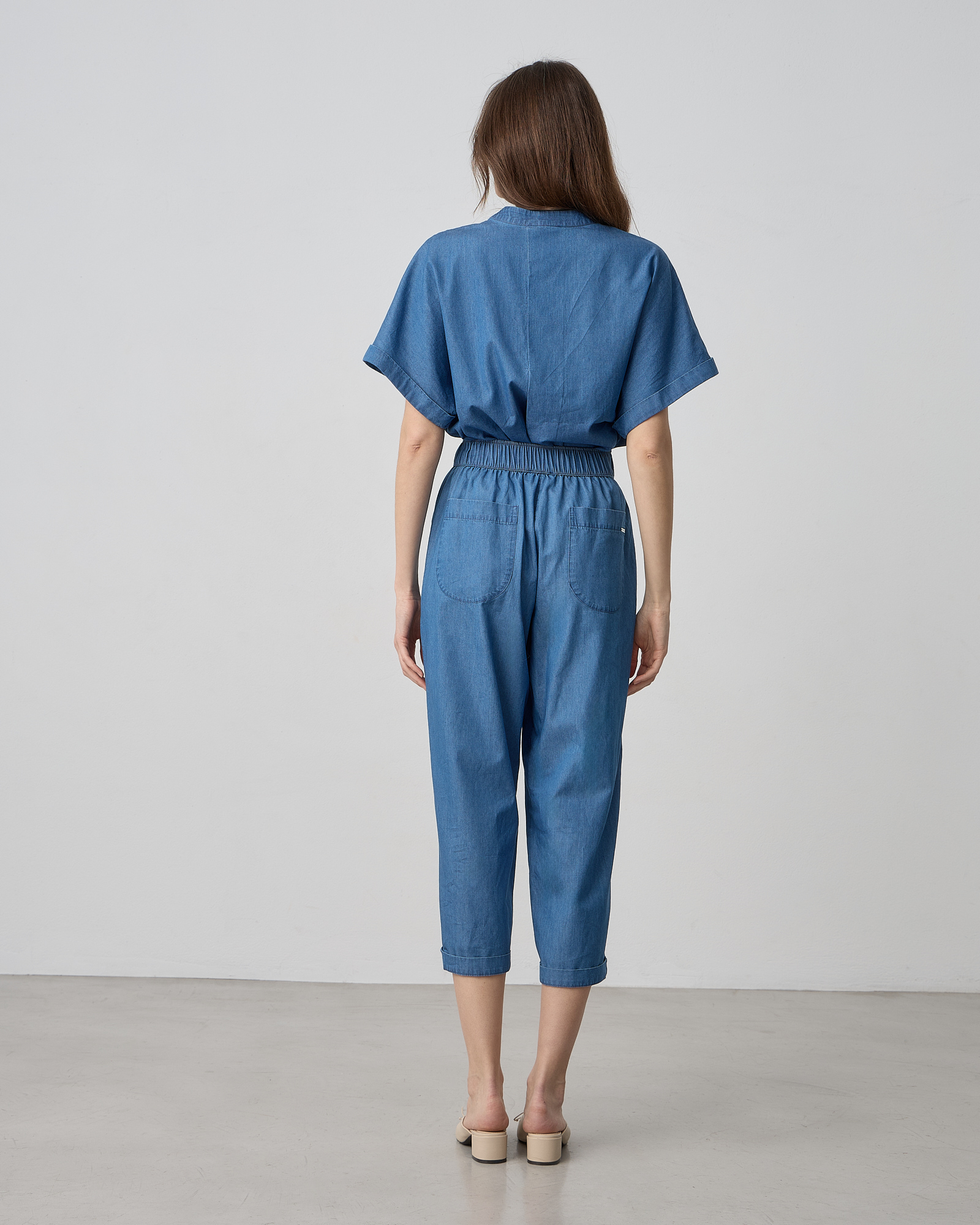 Παντελόνι σε denim όψη, ψηλόμεσο με ελαστική μέση, κλείσιμο με κουμπιά και φερμουάρ, cropped, βαμβακερό σε άνετη γραμμή