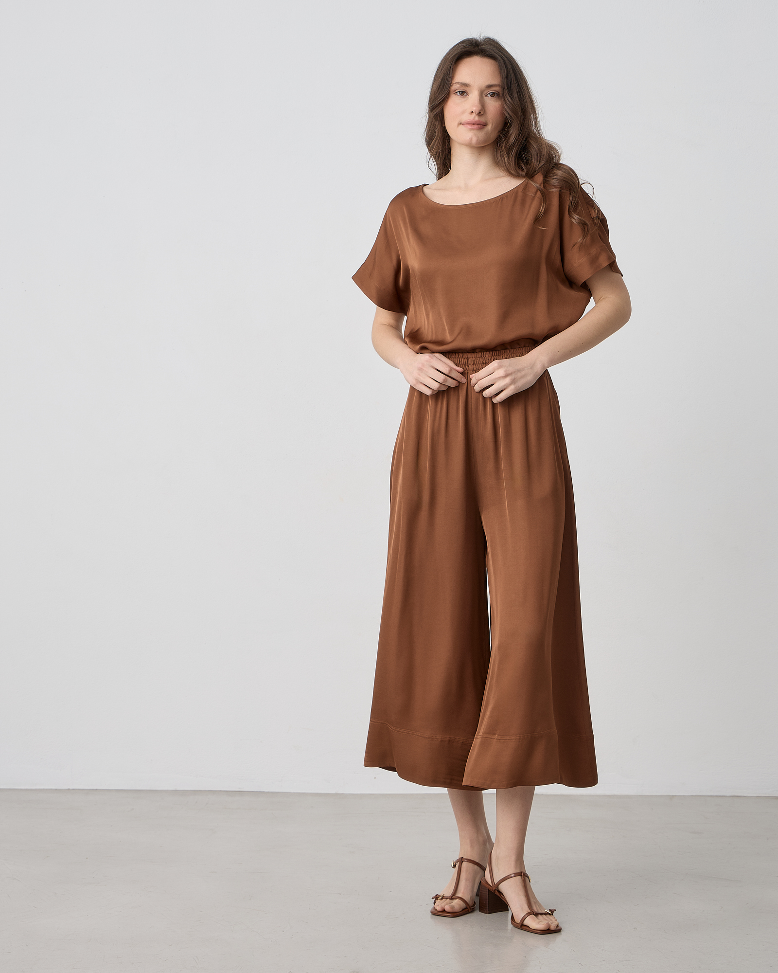 Παντελόνα cropped με ελαστική μέση, midi, εξωτερική τσέπη στο πίσω μέρος, βισκόζ σατέν ύφασμα σε άνετη γραμμή