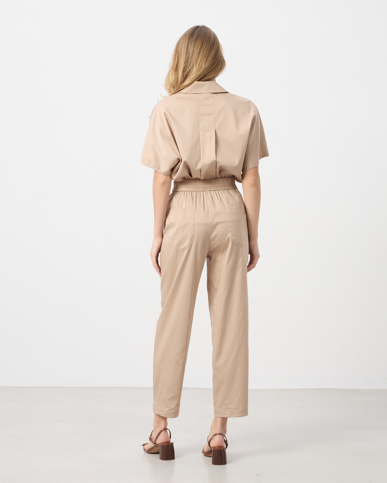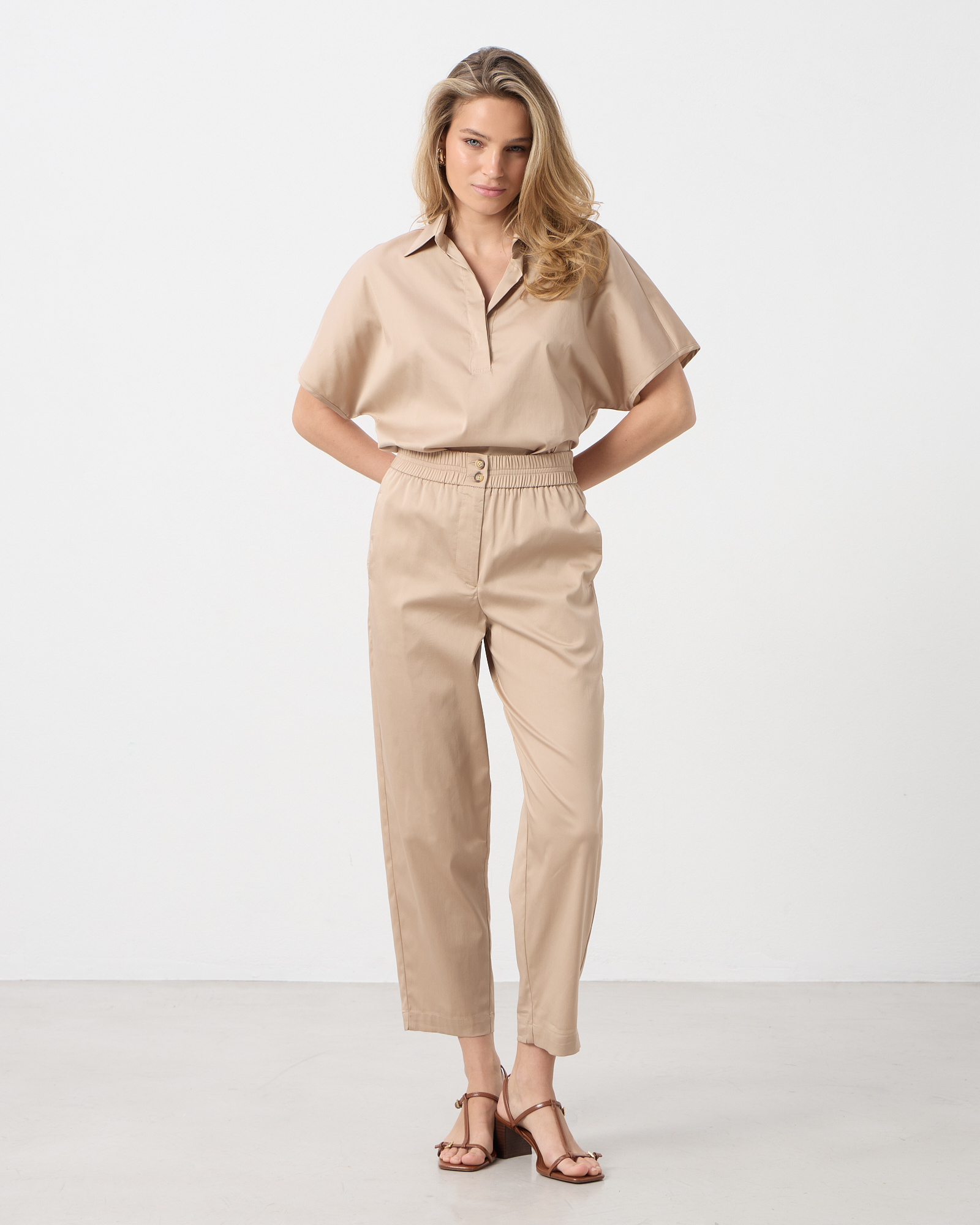 Παντελόνι ποπλίνα ψηλόμεσο με ελαστική μέση, κλείσιμο μπροατά με φερμουάρ και κουμπιά, πλαϊνές τσέπες, εξωτερικές πίσω τσέπες, σε κανονική εφαρμογή