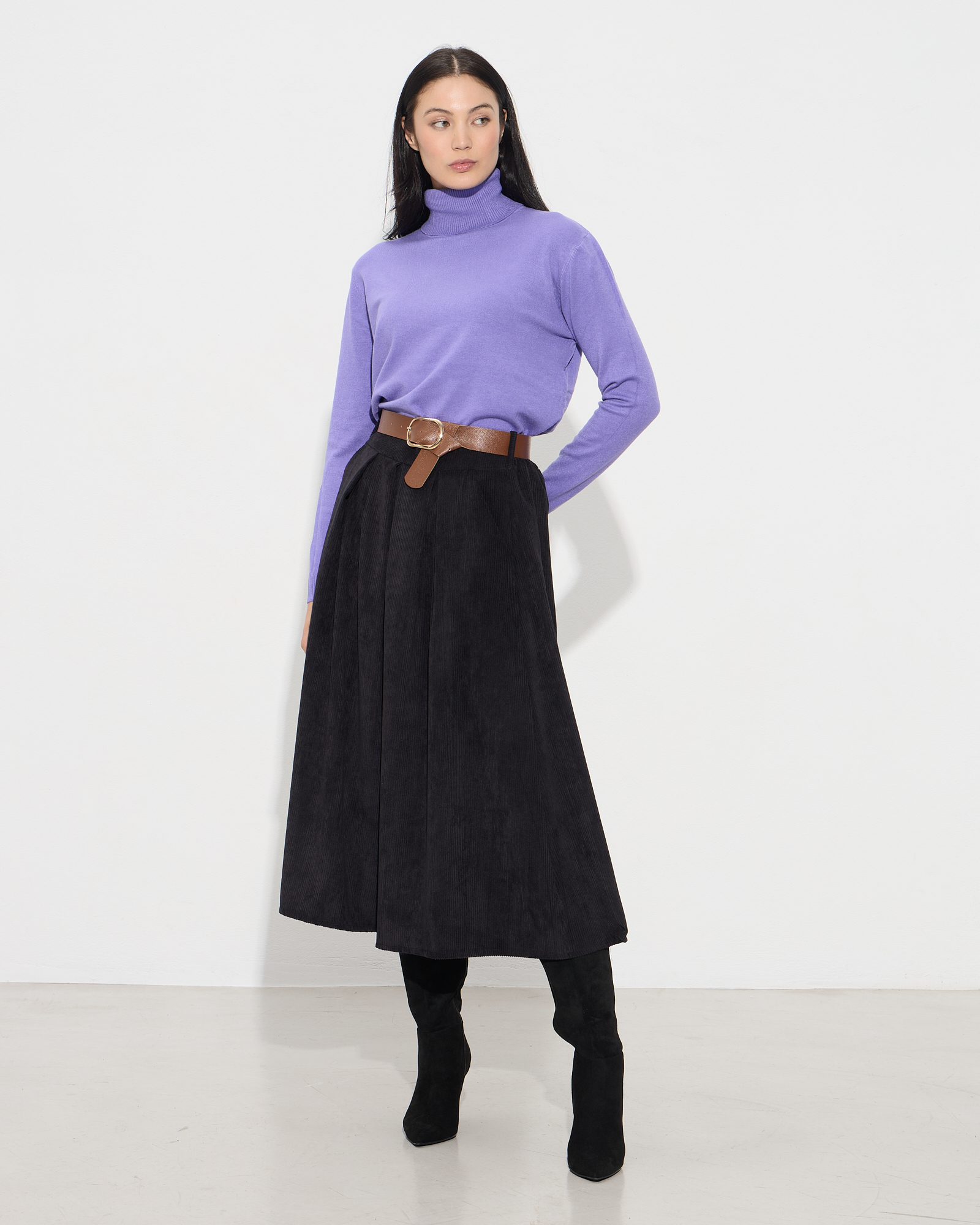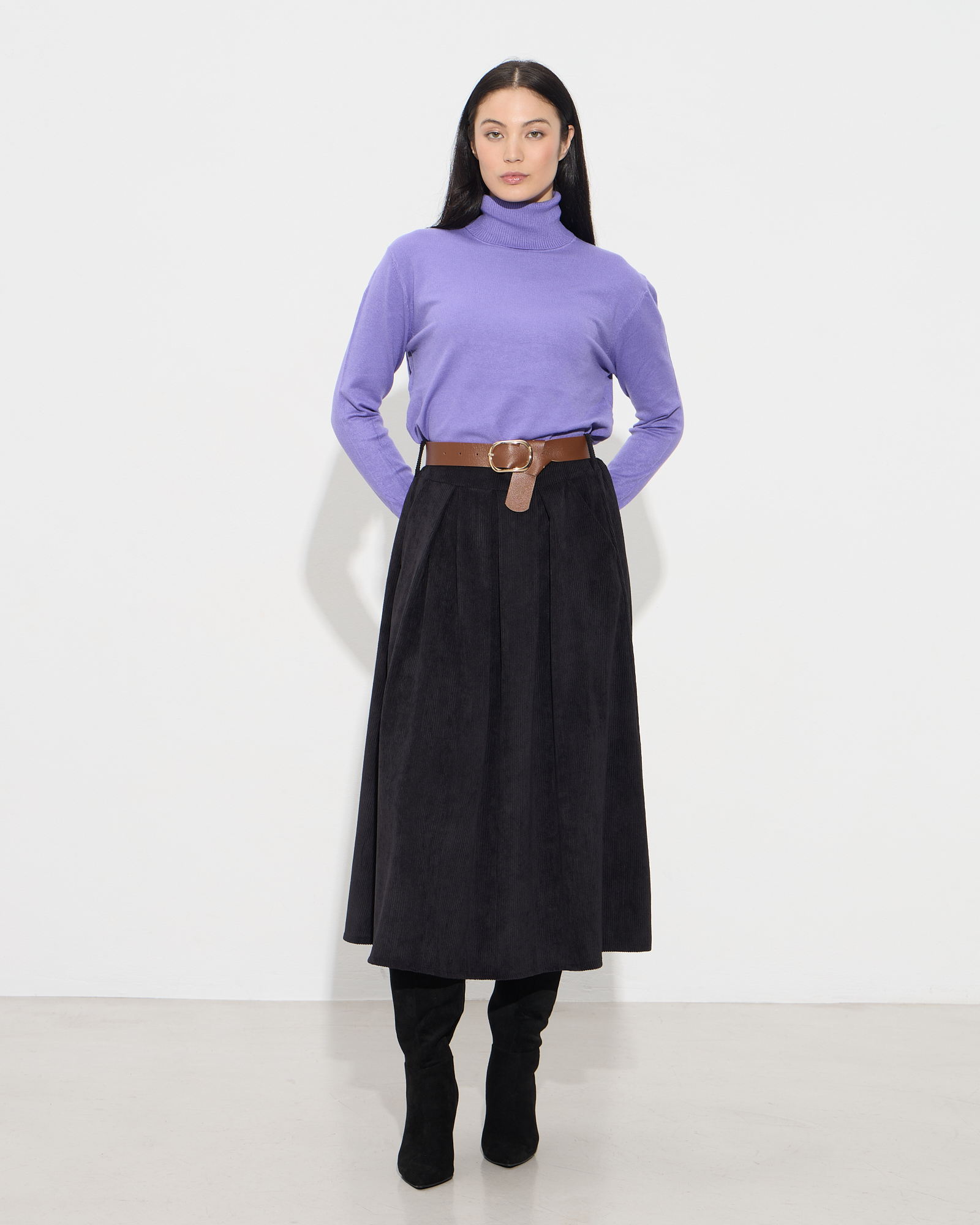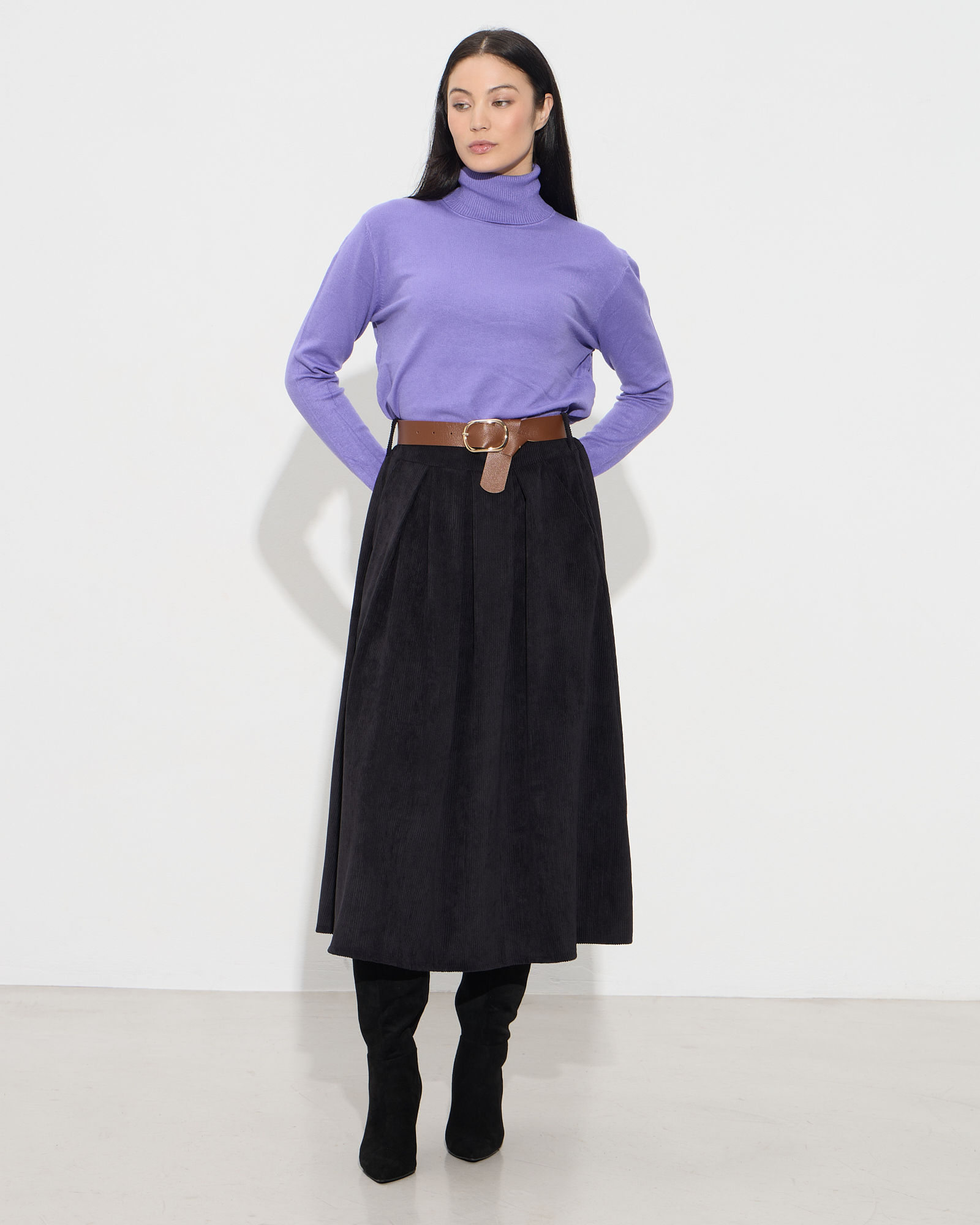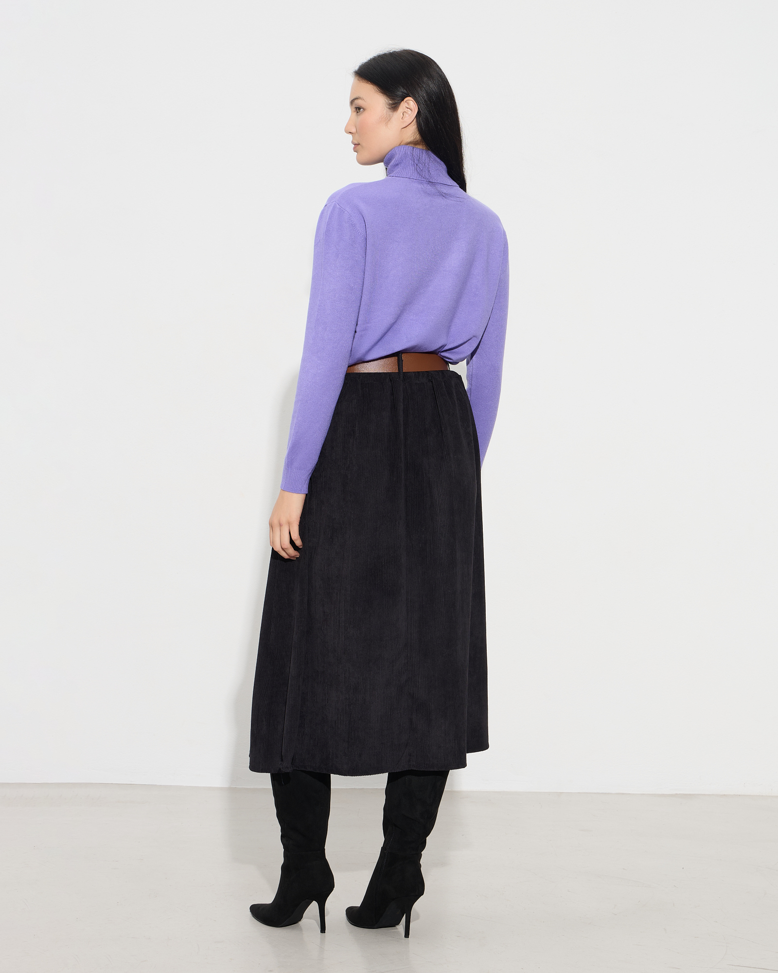 Φούστα midi κοτλέ με πιέτες στο μπροστινό μέρος, αποσπώμενη ζώνη στη μέση, σε άνετη γραμμή