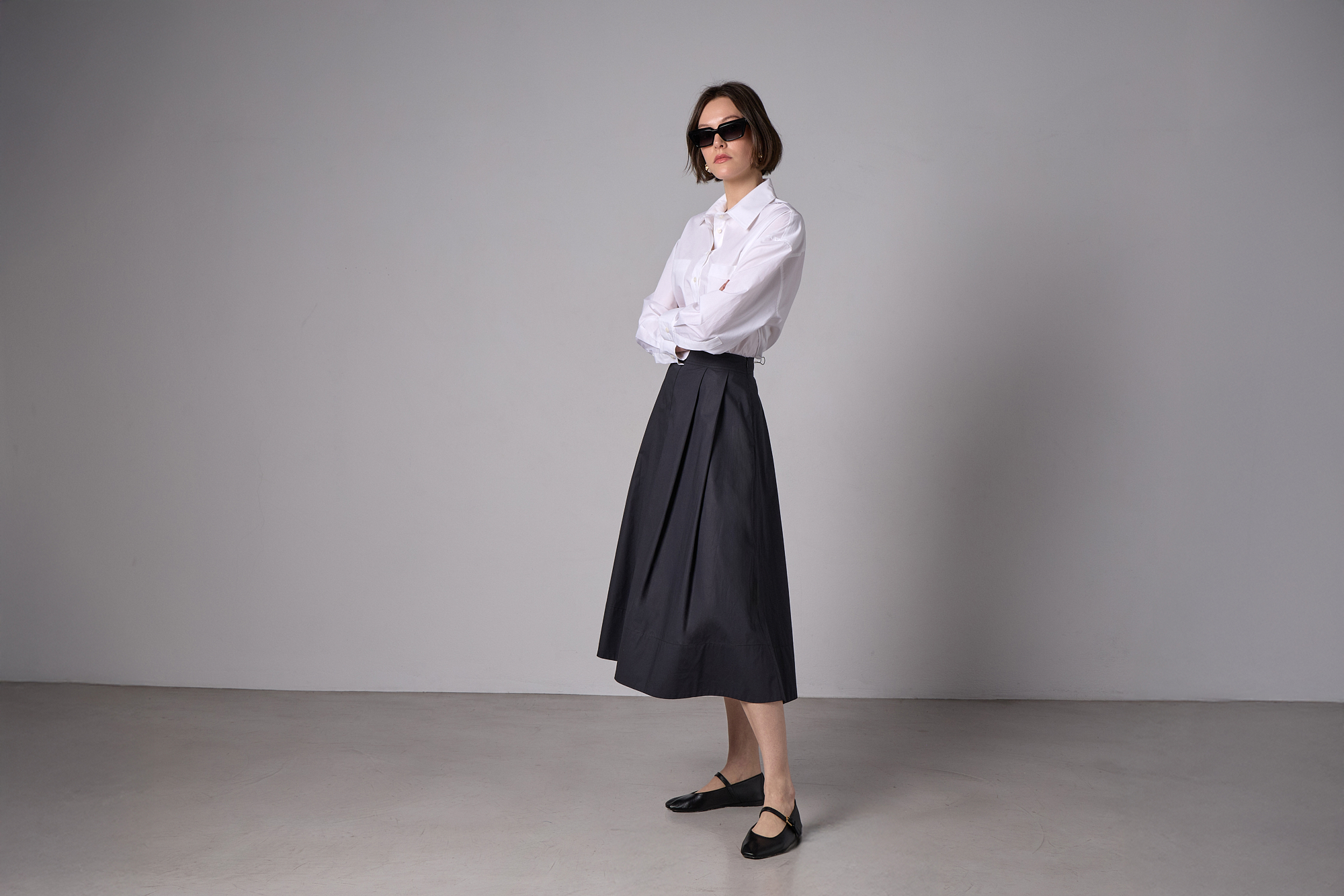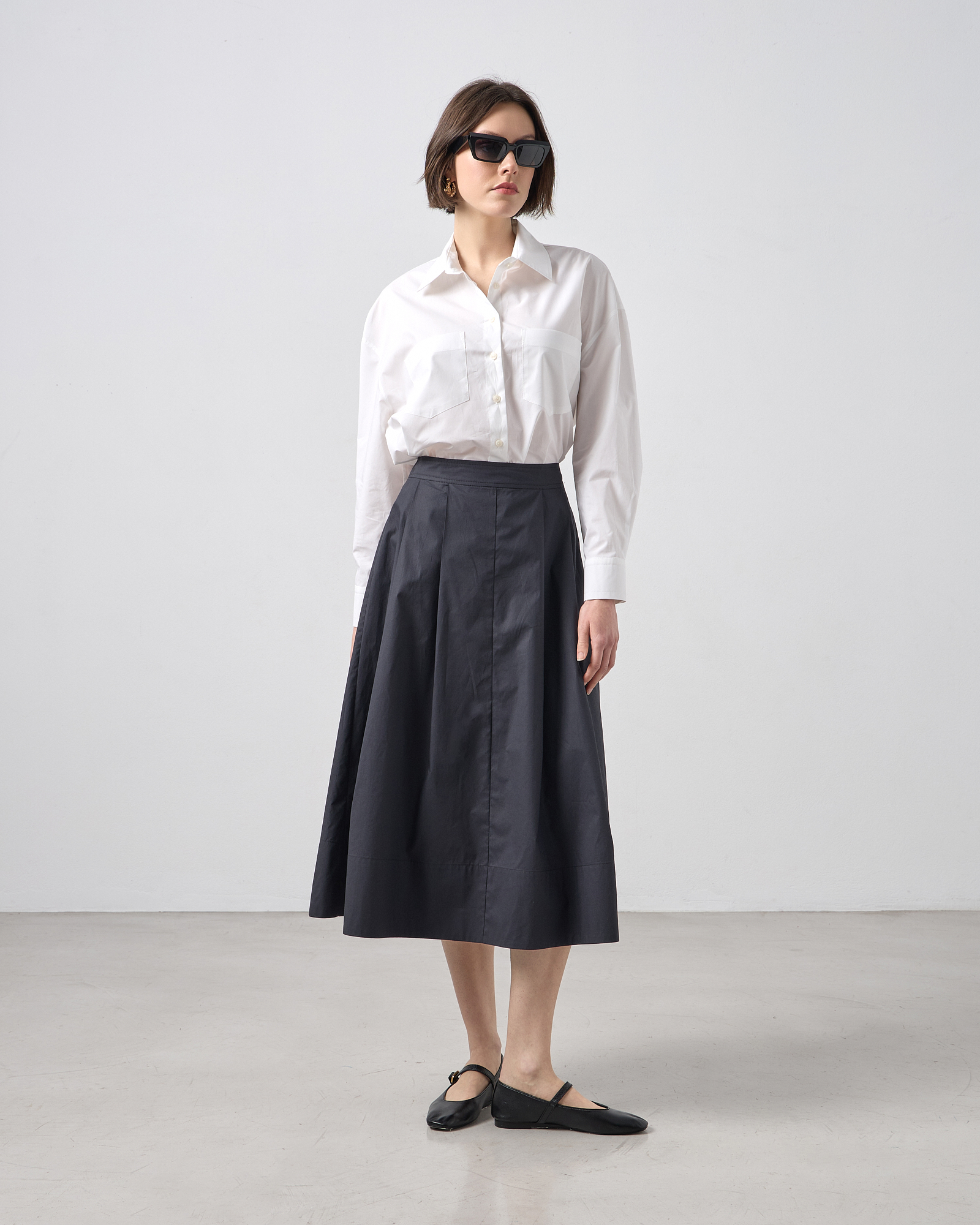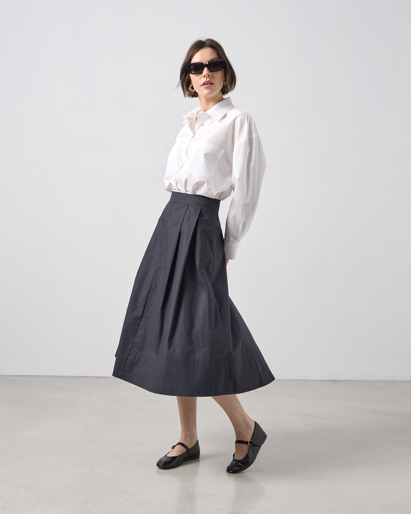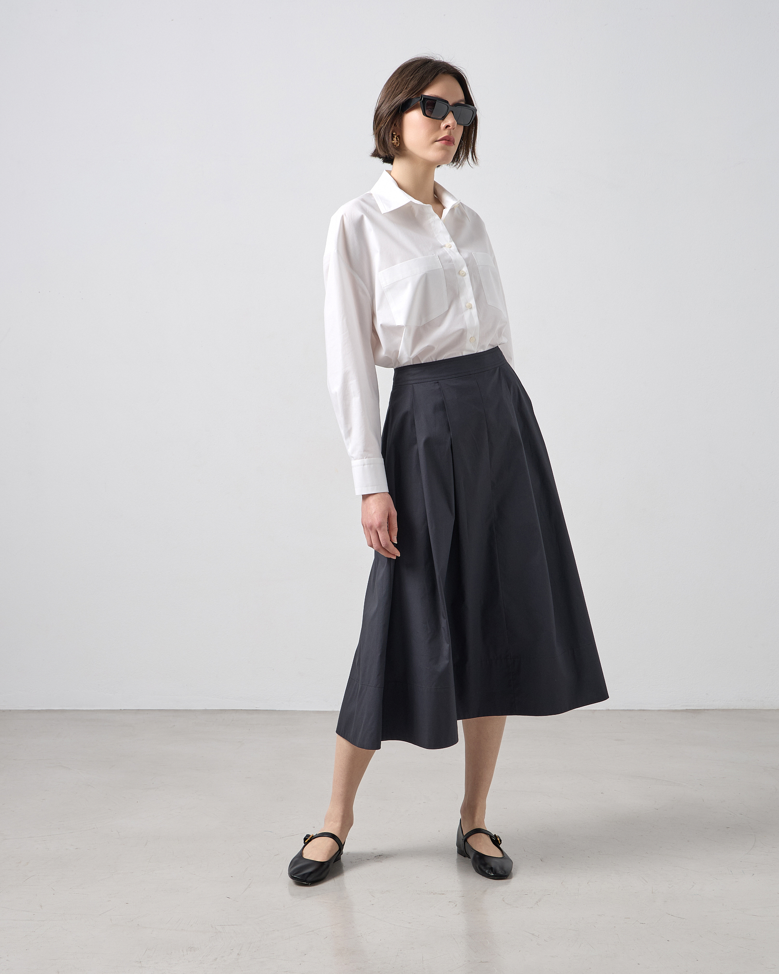Φούστα midi ψηλόμεση με πιέτες σε Α γραμμή,μ κλείσιμο με φερμουάρ στο πλάι, σε βαμβακερό ποπλίνα ύφασμα, κανονική εφαρμογή