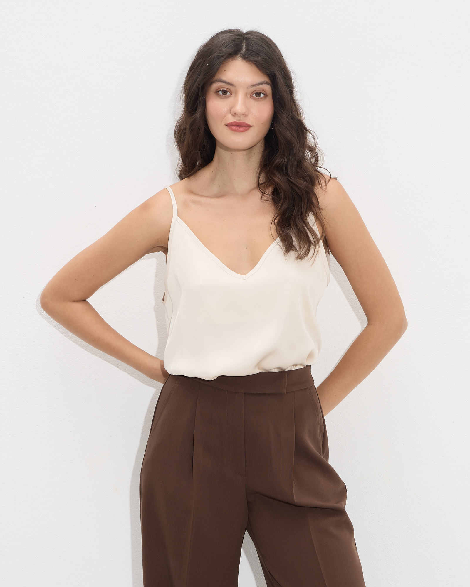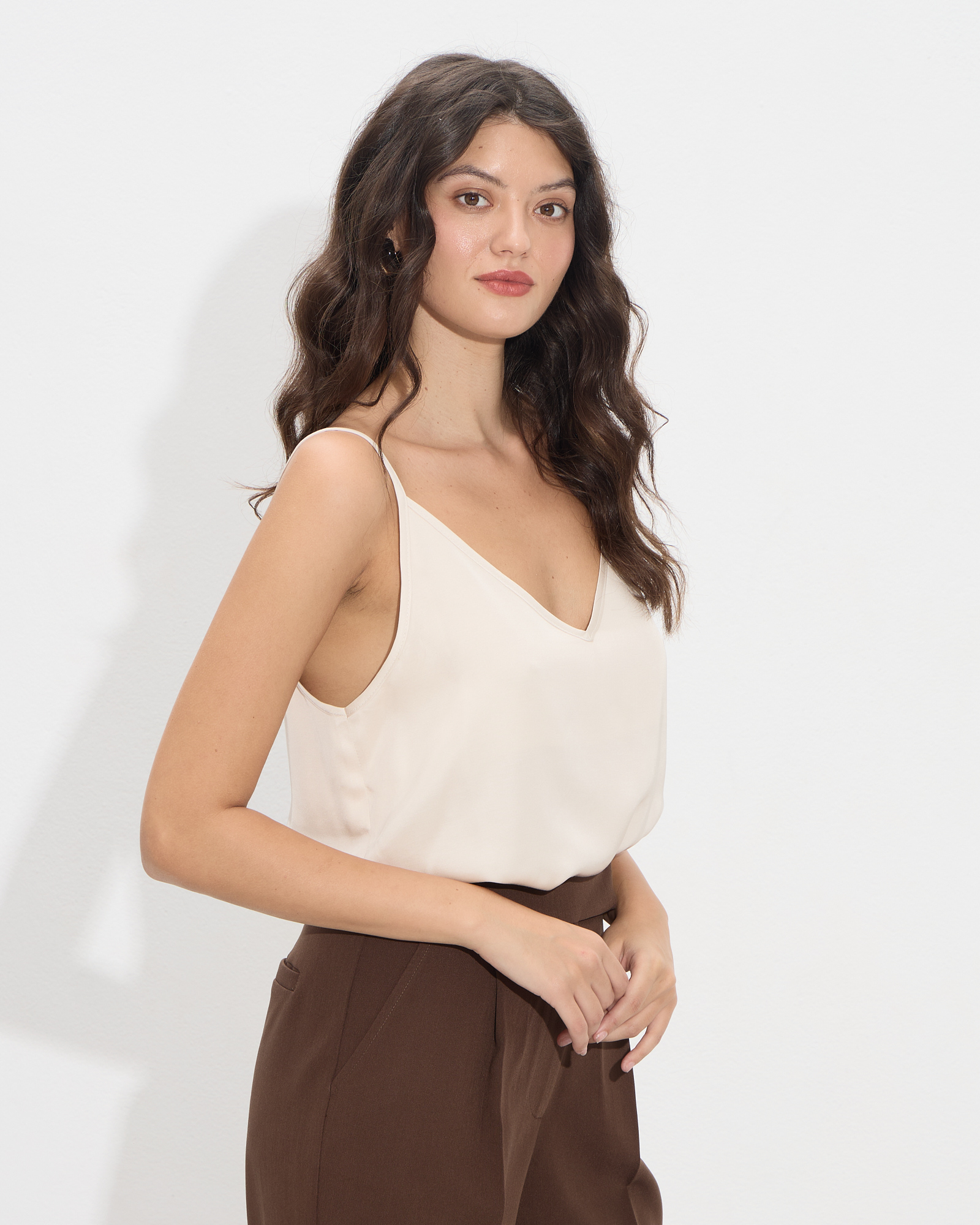 Τοπ με λεπτές τιράντες, V λαιμόκοψη και πλάτη σε σατέν-βισκόζ μονόχρωμο ύφασμα, σε κανονική γραμμή