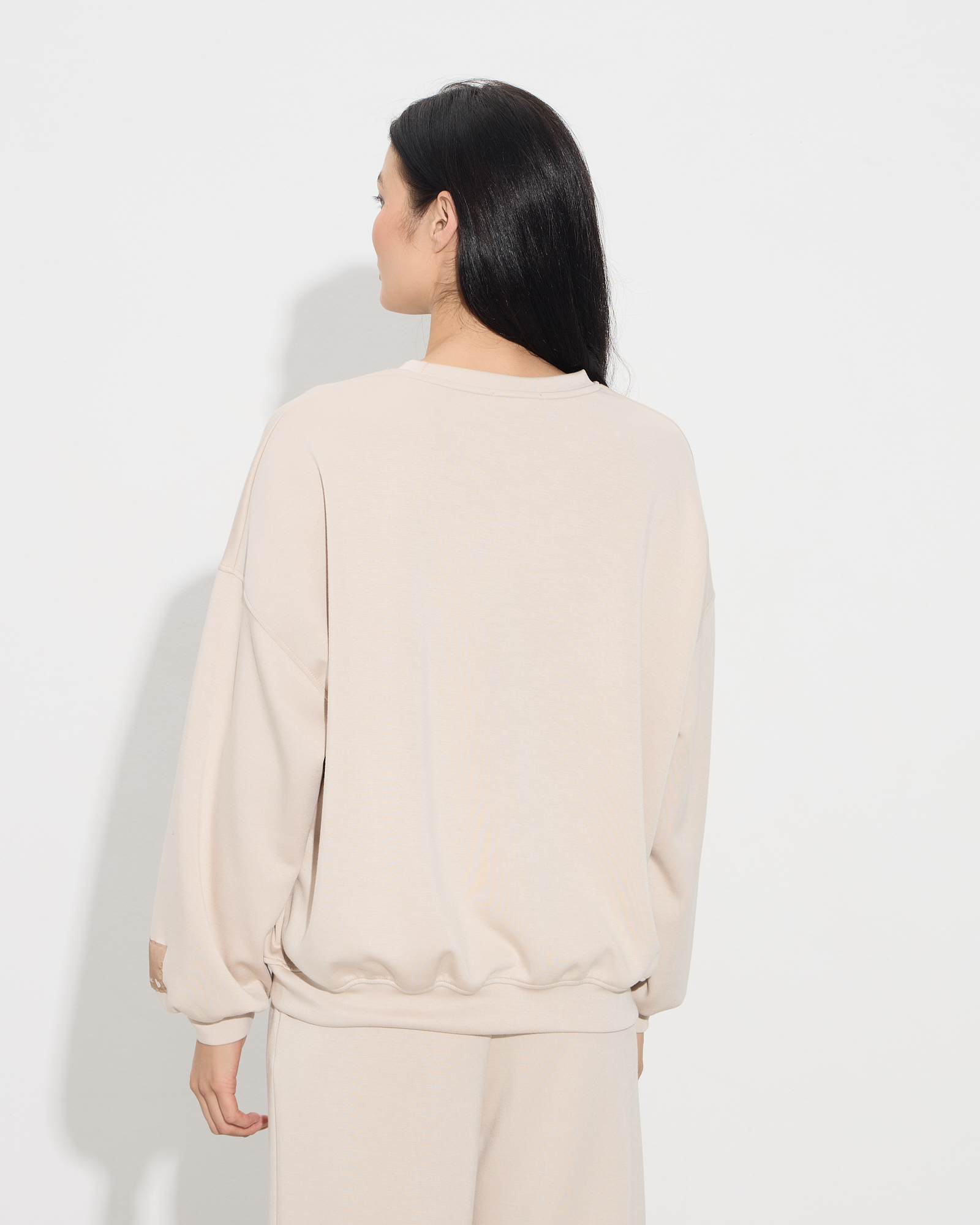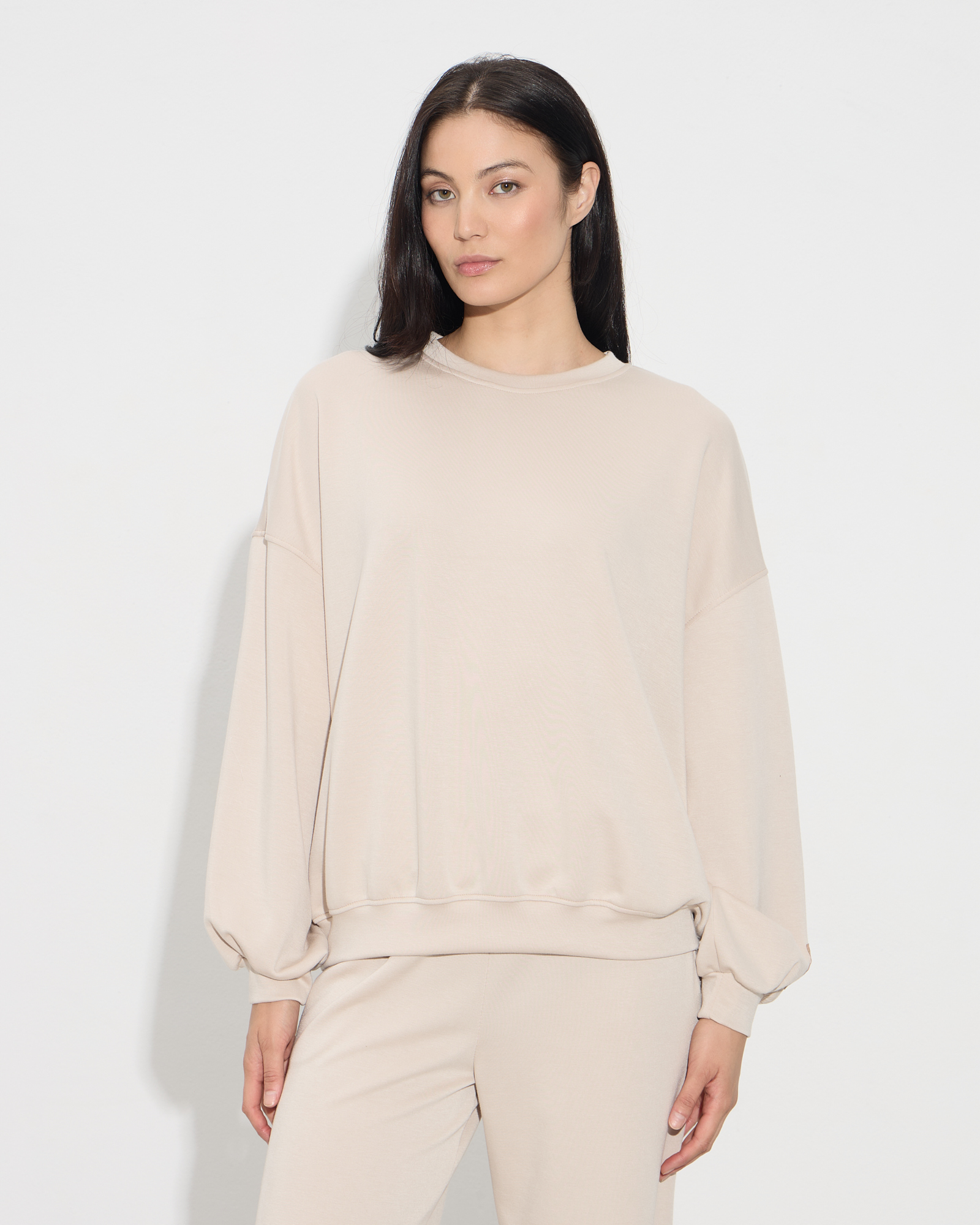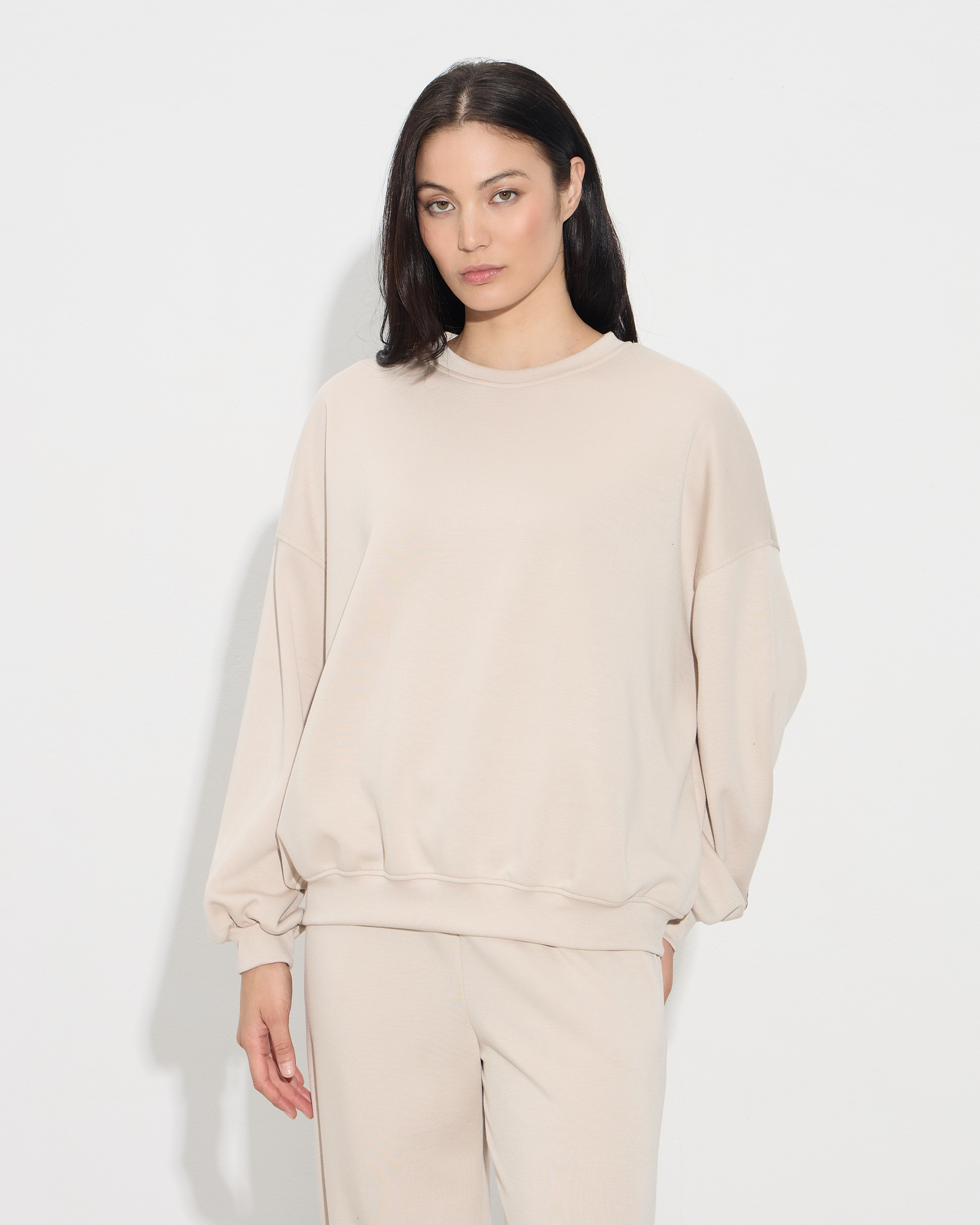 Μπλούζα oversized τύπου φούτερ, στρογγυλή λαιμόκοψη, λάστιχο στο τελείωμα στα μανίκια και στο τελείωμα της μπλούζας, σε άνετη γραμμή