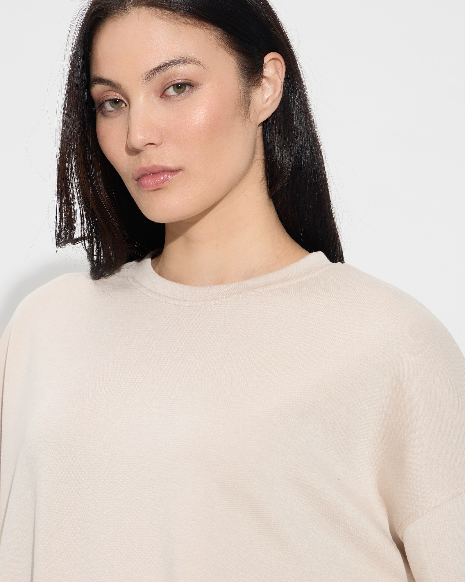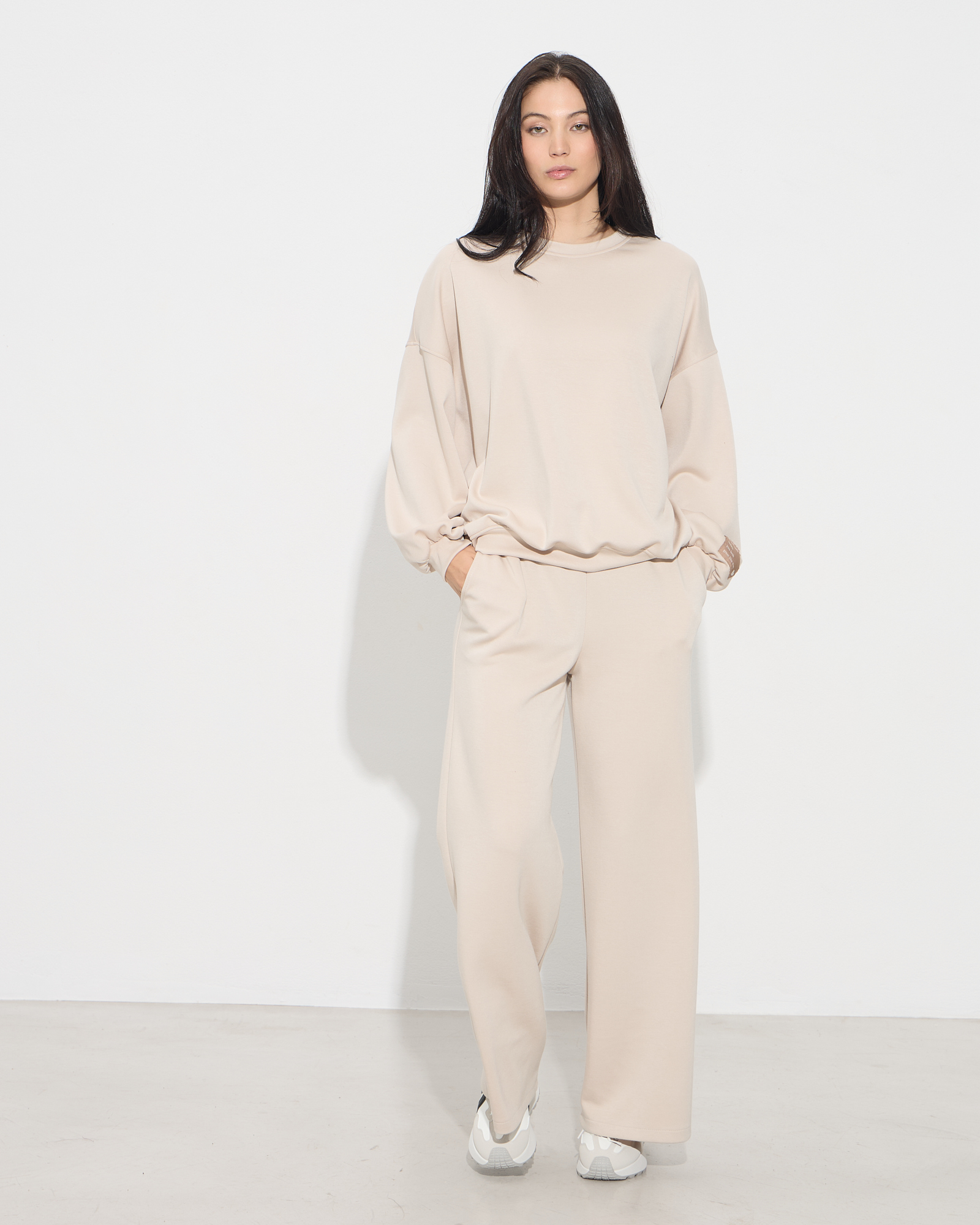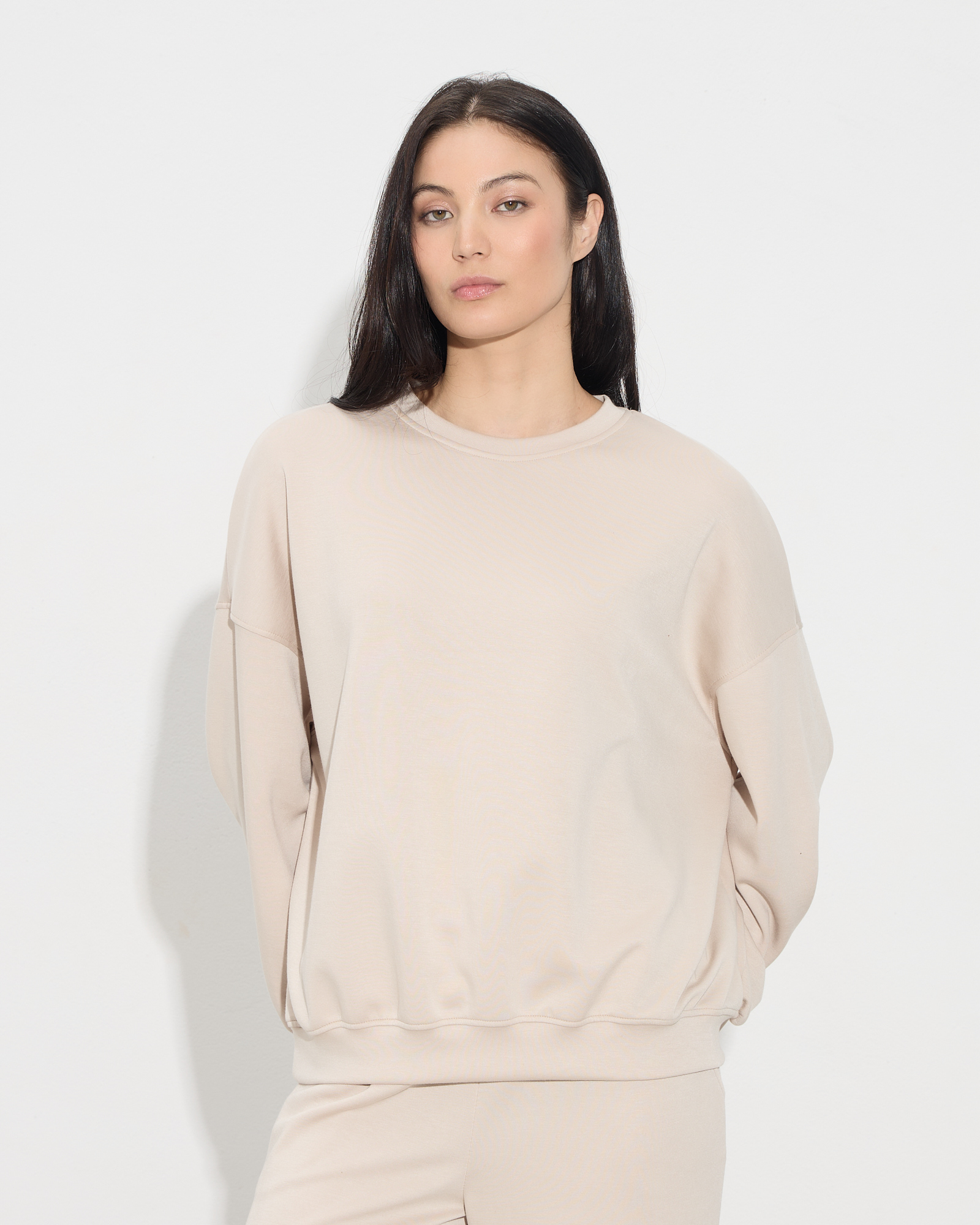 Μπλούζα oversized τύπου φούτερ, στρογγυλή λαιμόκοψη, λάστιχο στο τελείωμα στα μανίκια και στο τελείωμα της μπλούζας, σε άνετη γραμμή