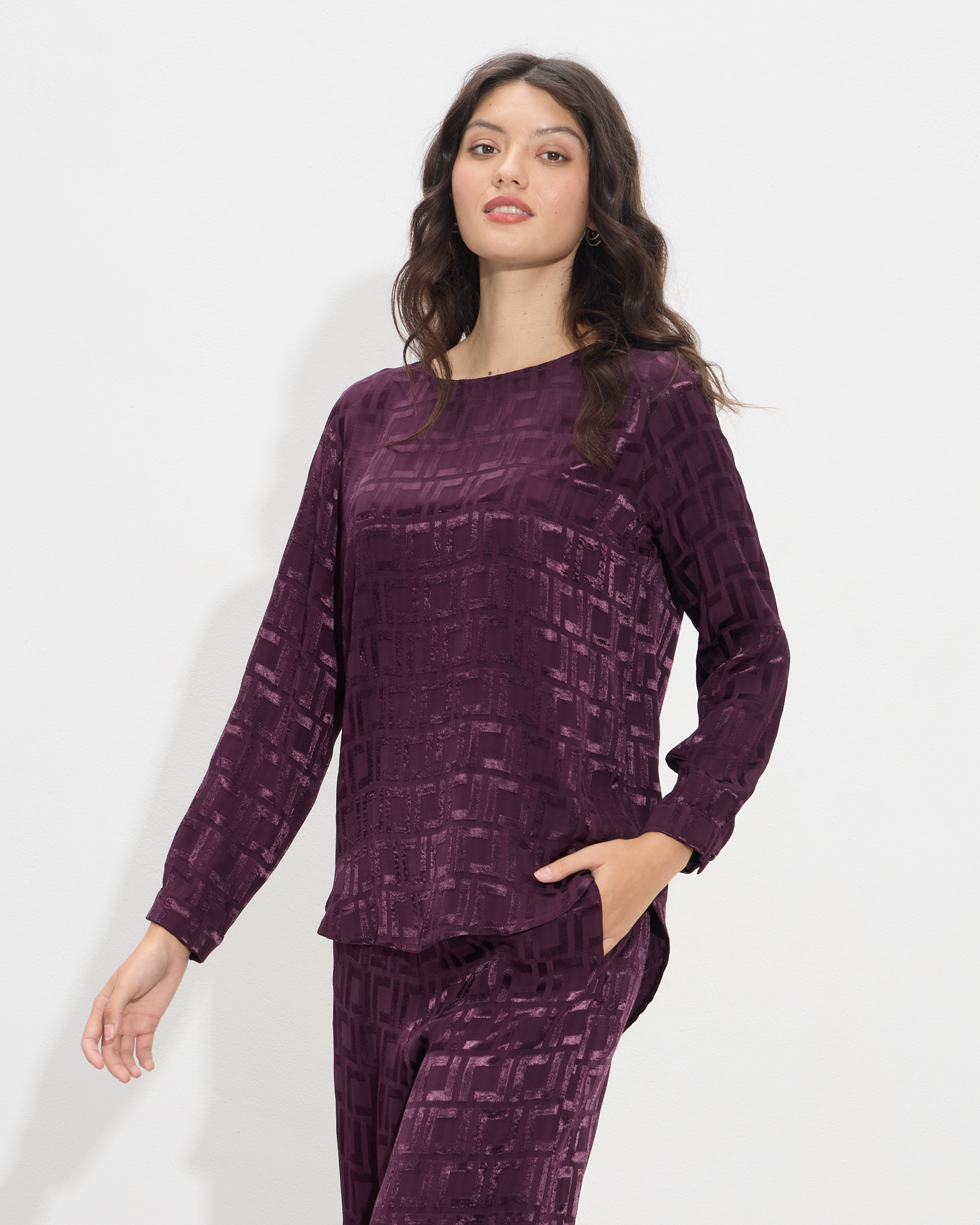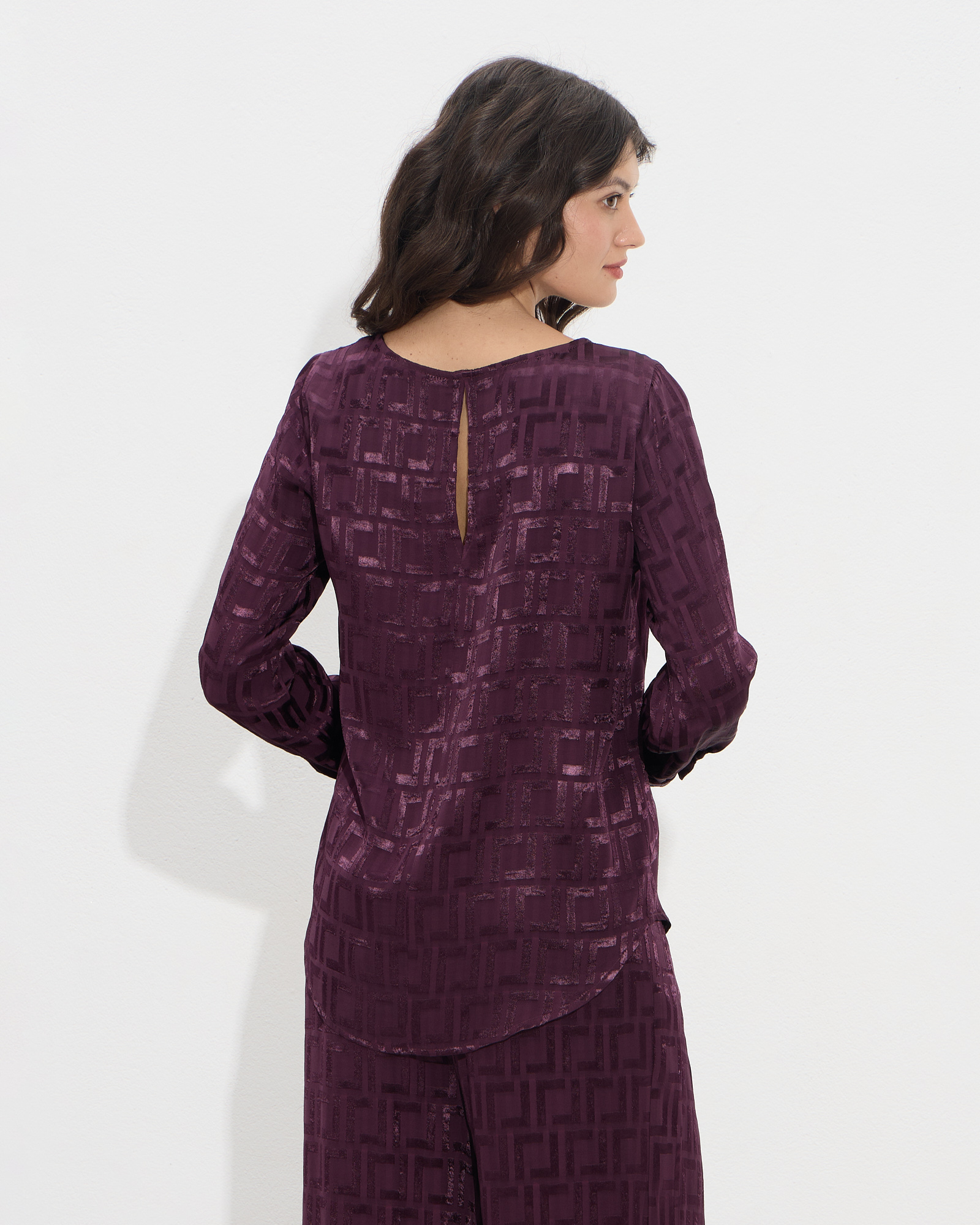 Μπλούζα μακρυμάνικη με στρογγυλή λαιμόκοψη σε ανάγλυφο ύφασμα σατέν-βισκόζ με διακριτκό άνοιγμα πίσω στην πλάτη, με ασύμμετρο τελείωμα, σα κανονική γραμμή