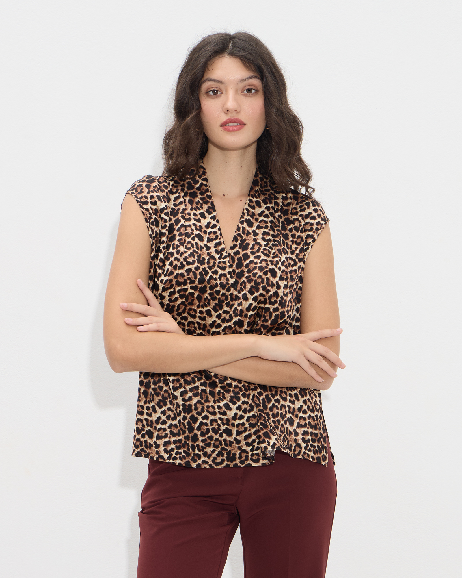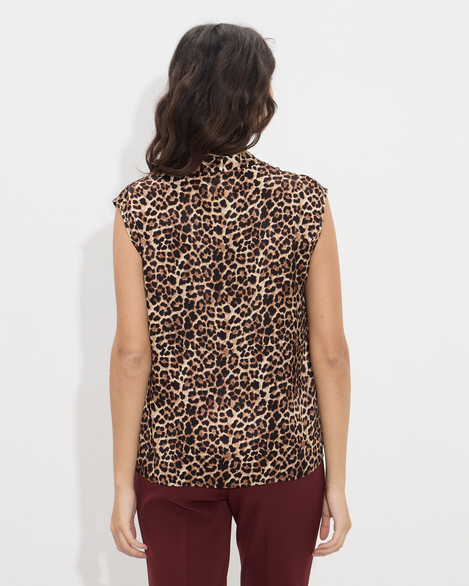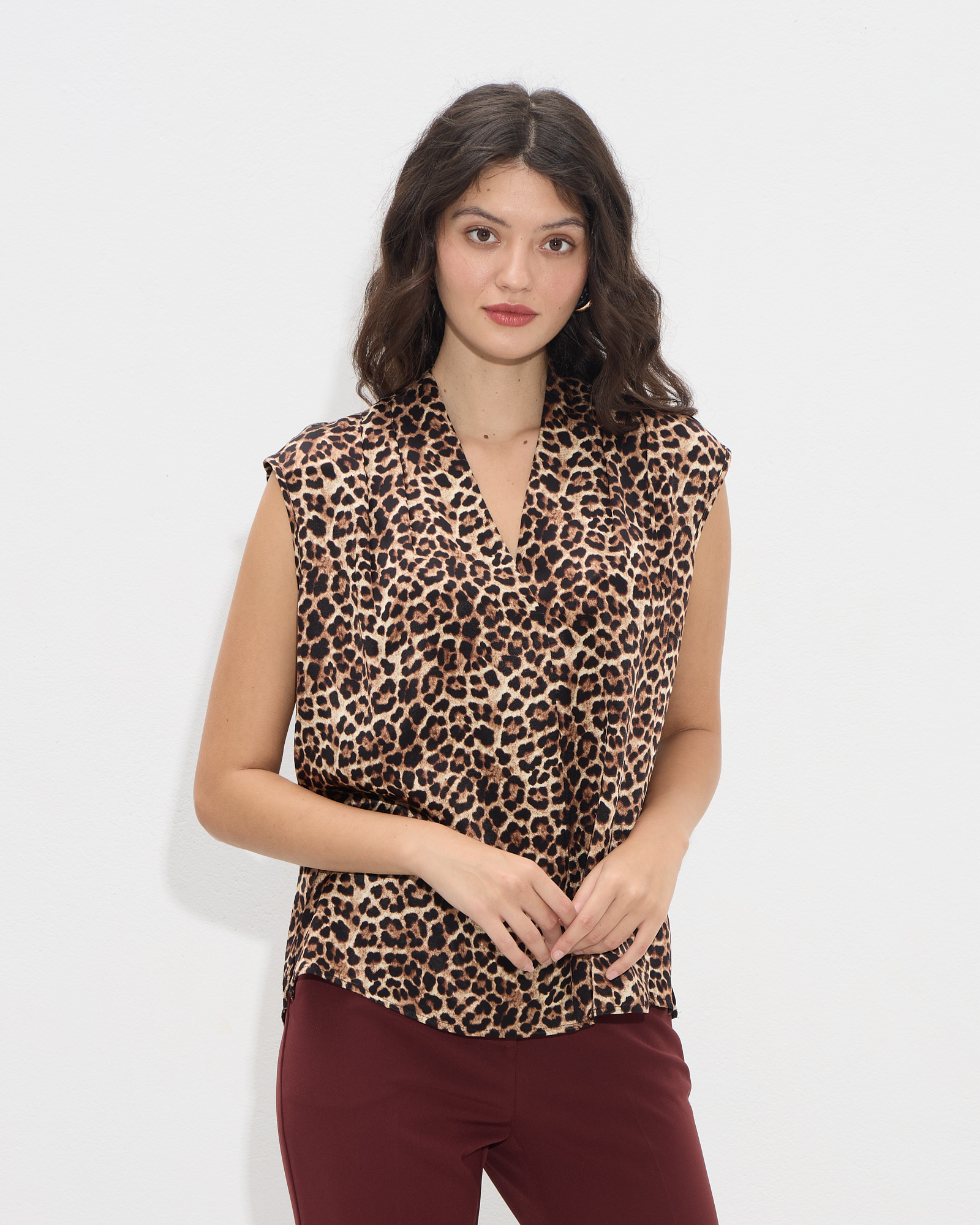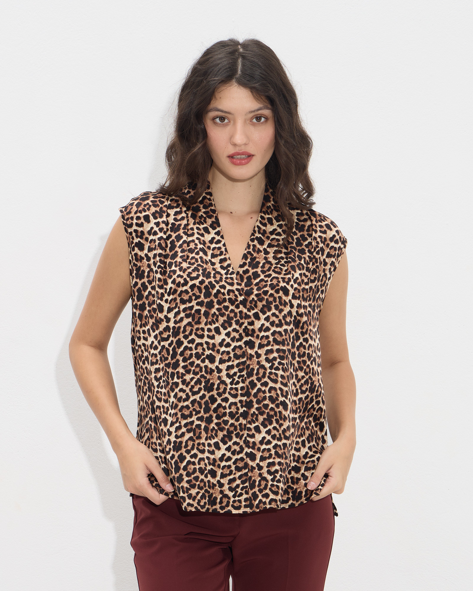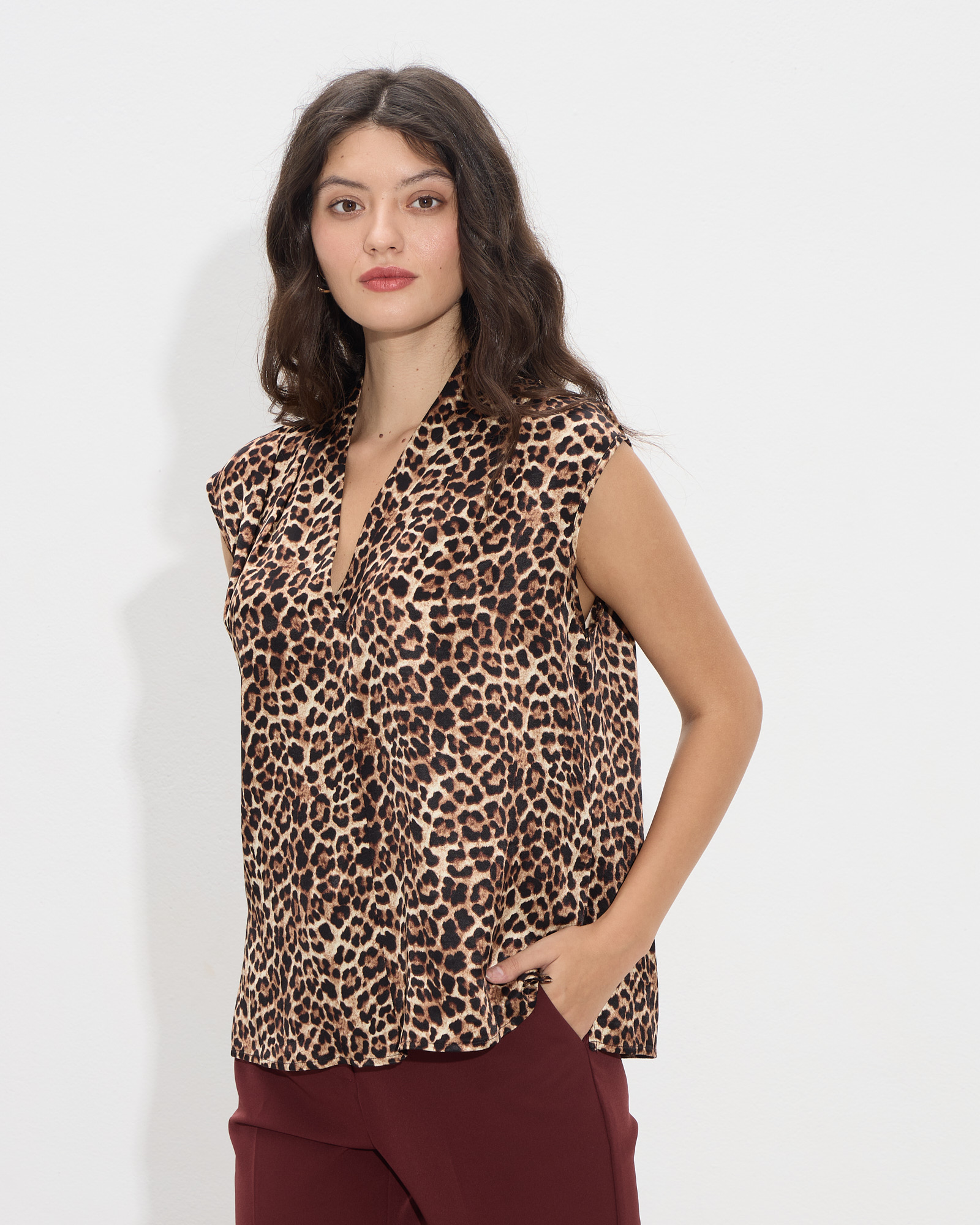 Αμάνικη μπλούζα σε λέοπαρ, με V λαιμόκοψη και πιέτες στους ώμους, σε βισκόζ-σατινέ ύφασμα, σε κανονική γραμμή
