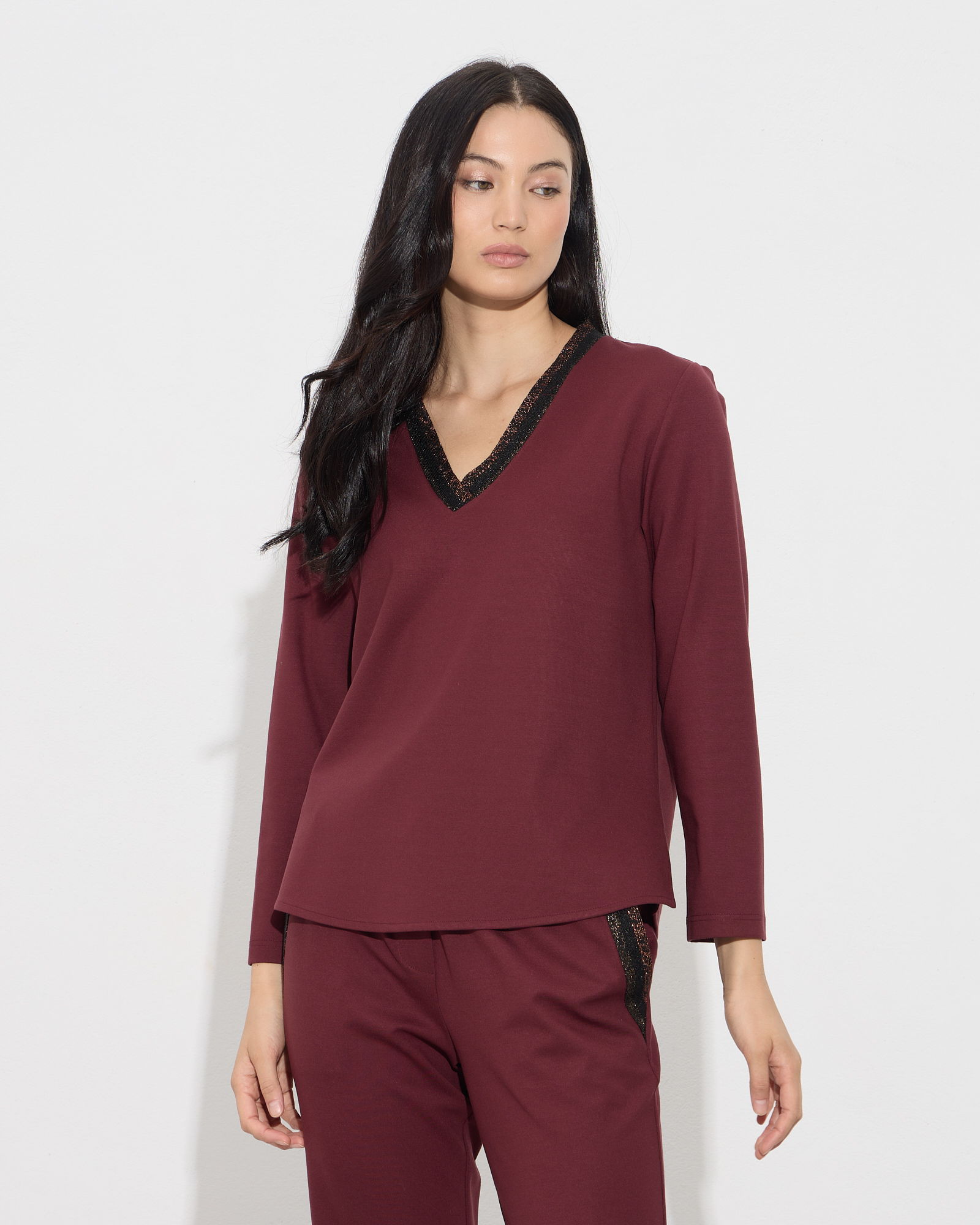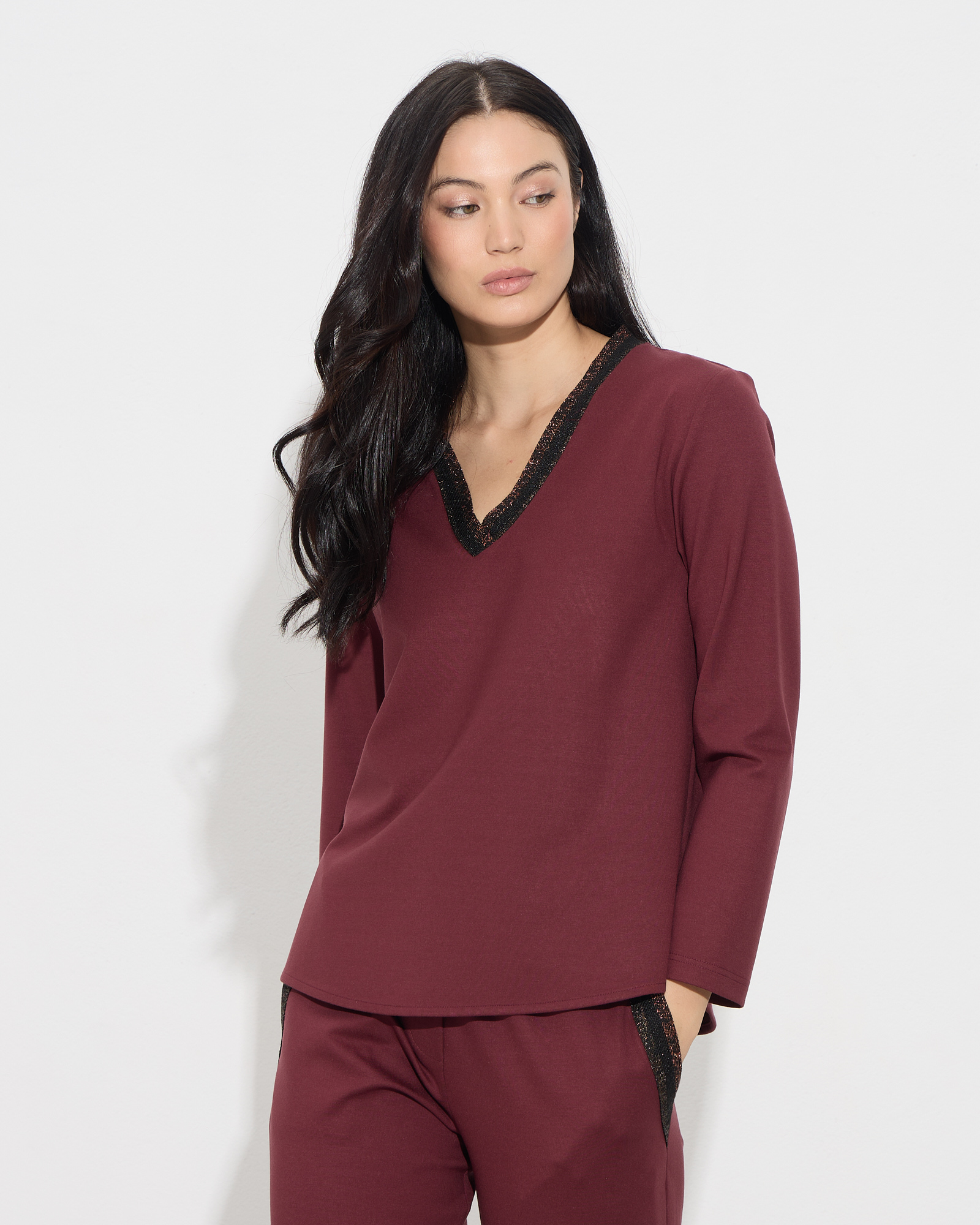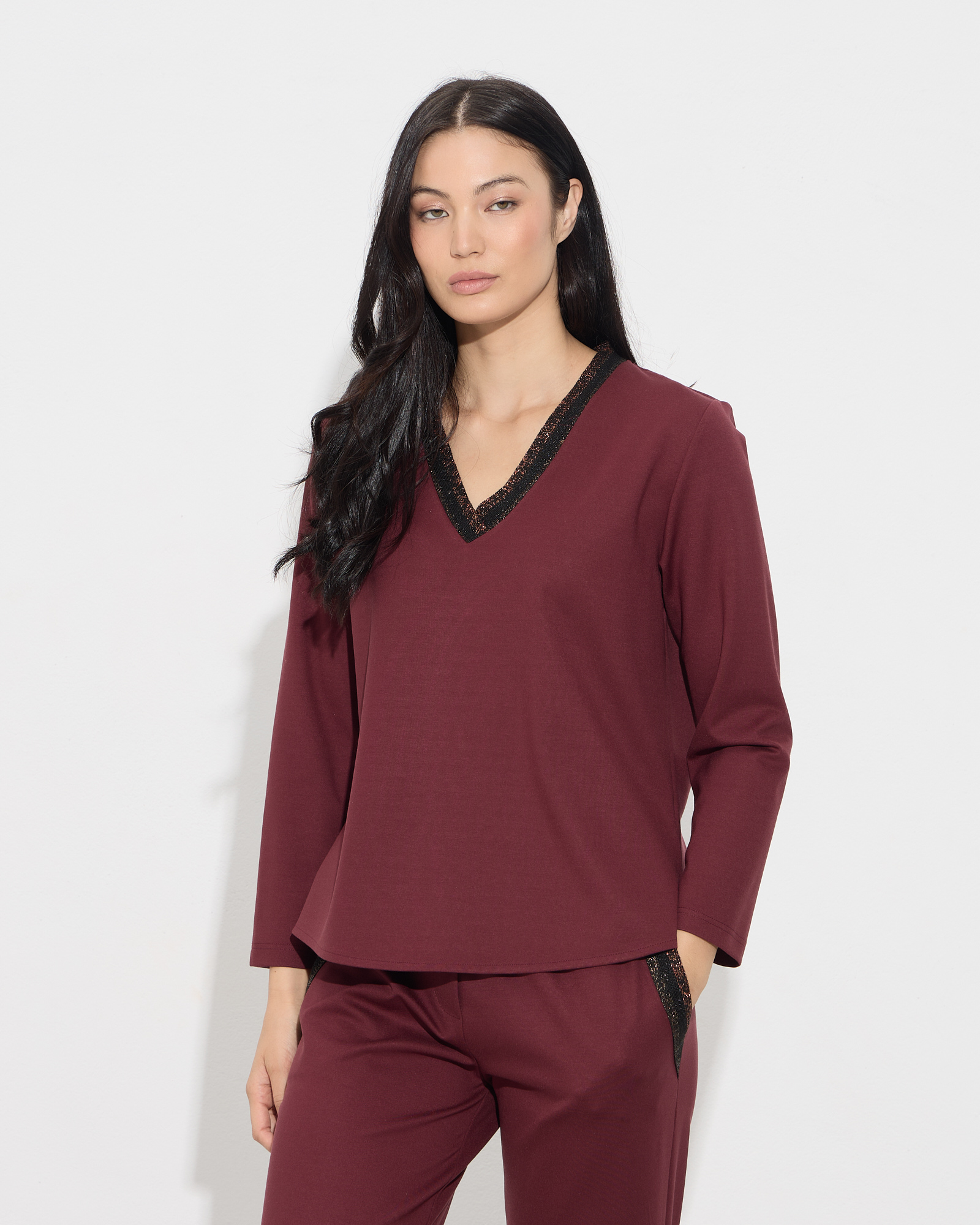 Μπλούζα μακρυμάνικη με V λαιμόκοψη και λεπτομέρεια τρέσας, σε μαλακό ύφασμα, ίσια γραμμή, σε κανονική εφαρμογή