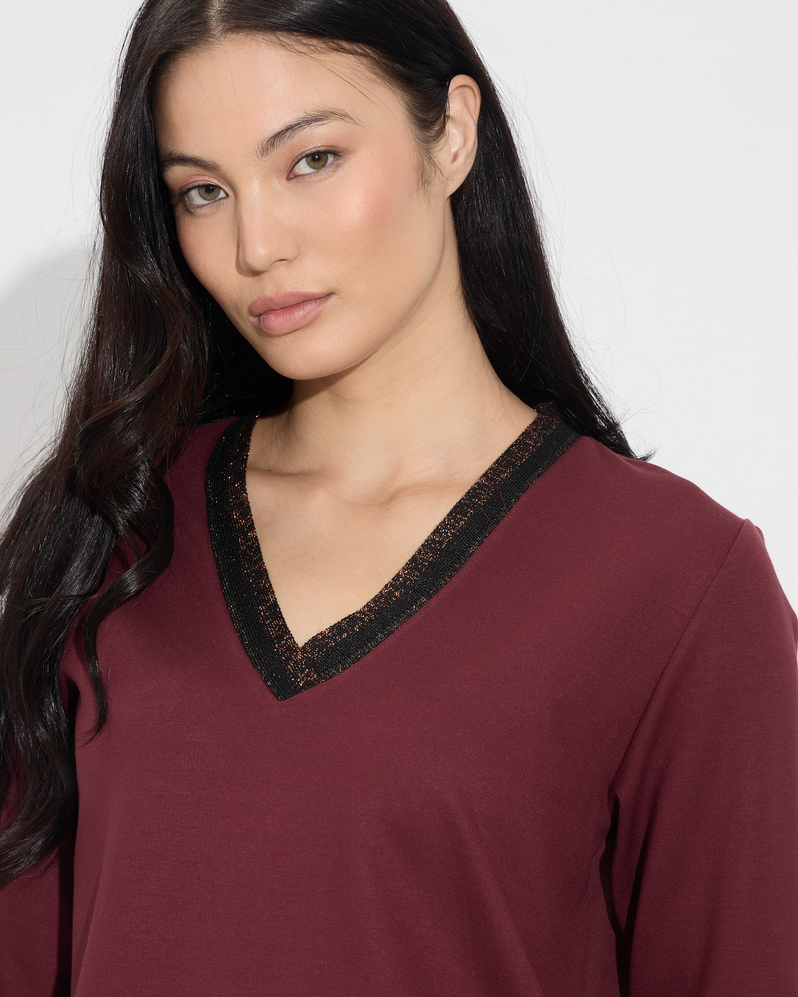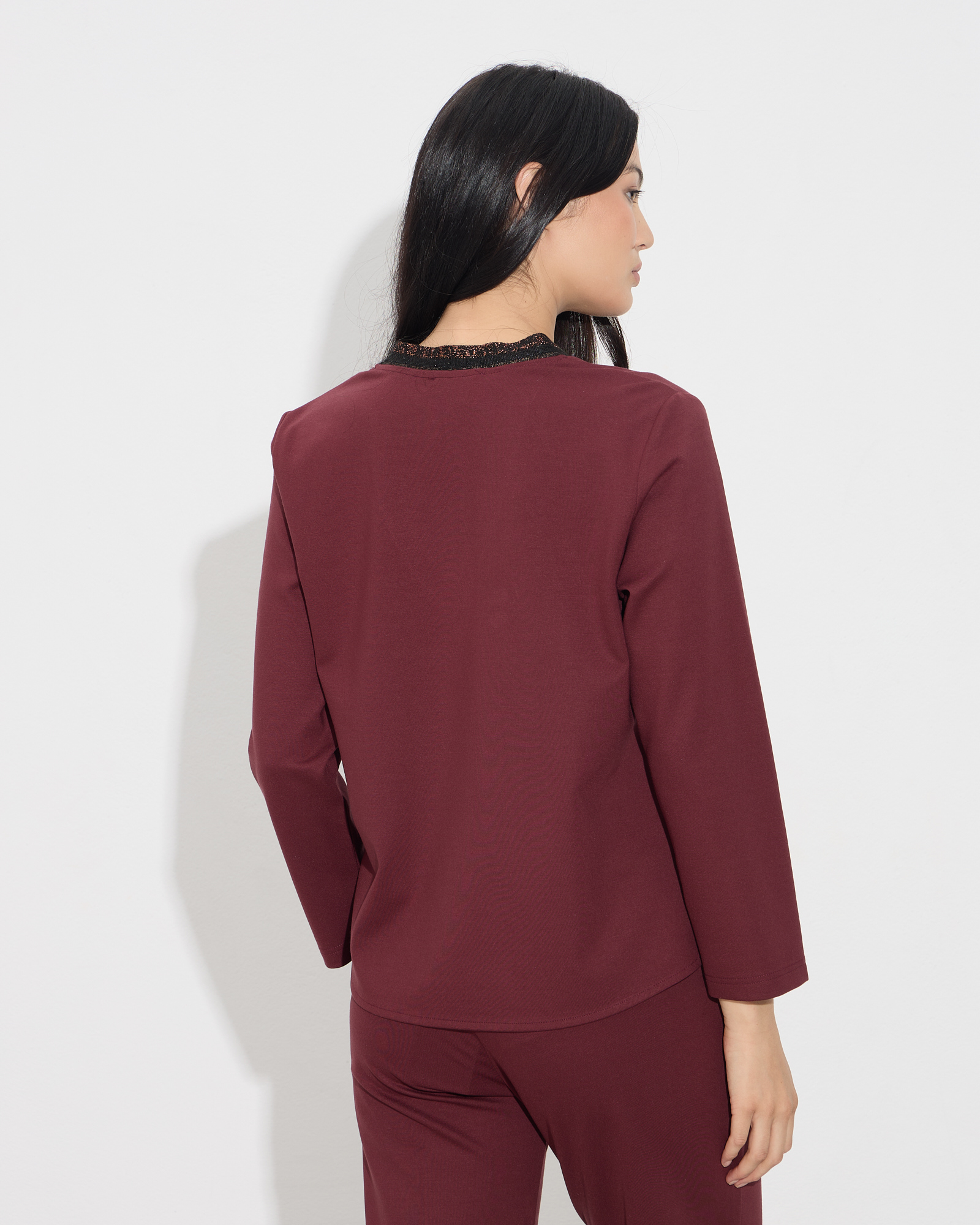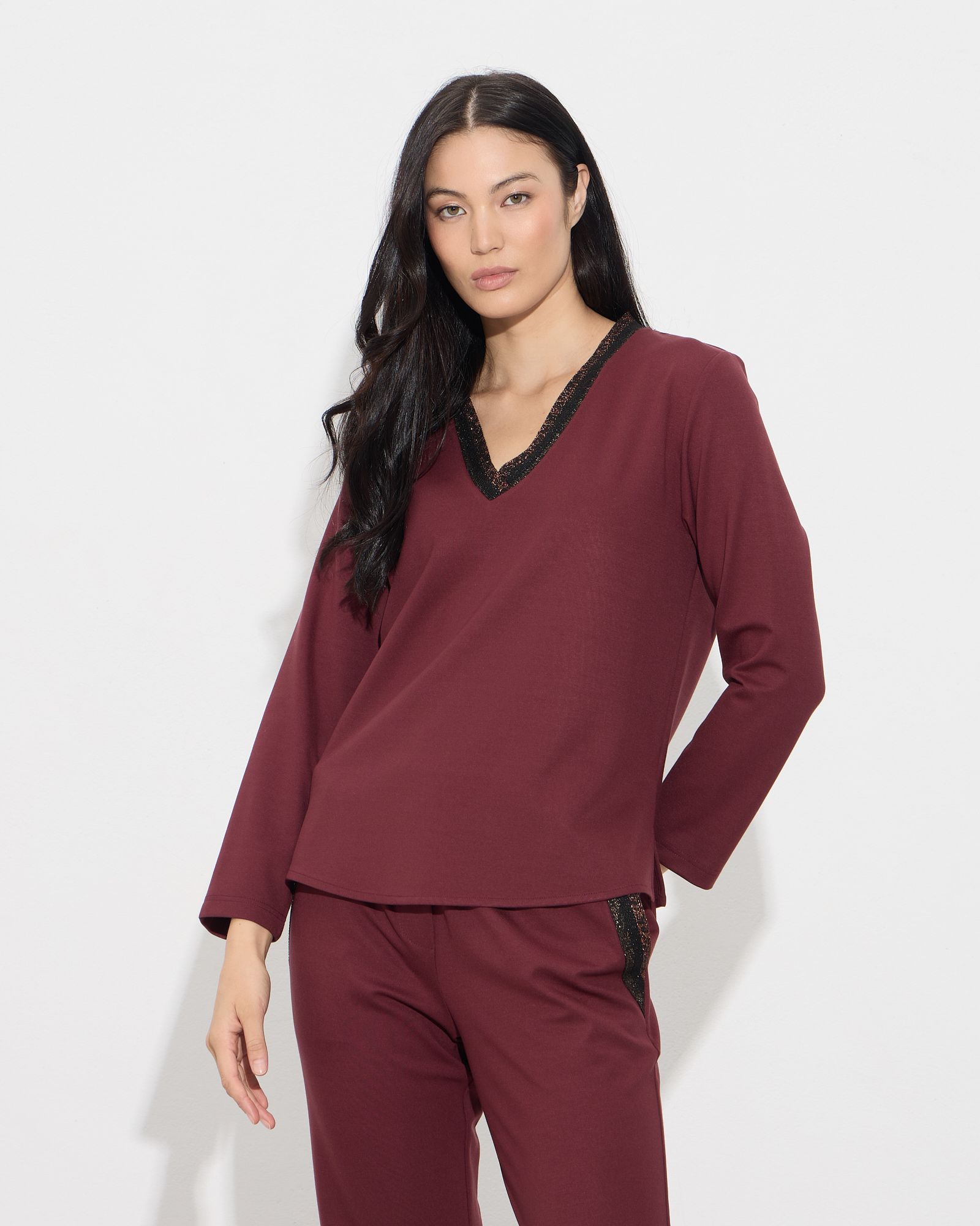 Μπλούζα μακρυμάνικη με V λαιμόκοψη και λεπτομέρεια τρέσας, σε μαλακό ύφασμα, ίσια γραμμή, σε κανονική εφαρμογή