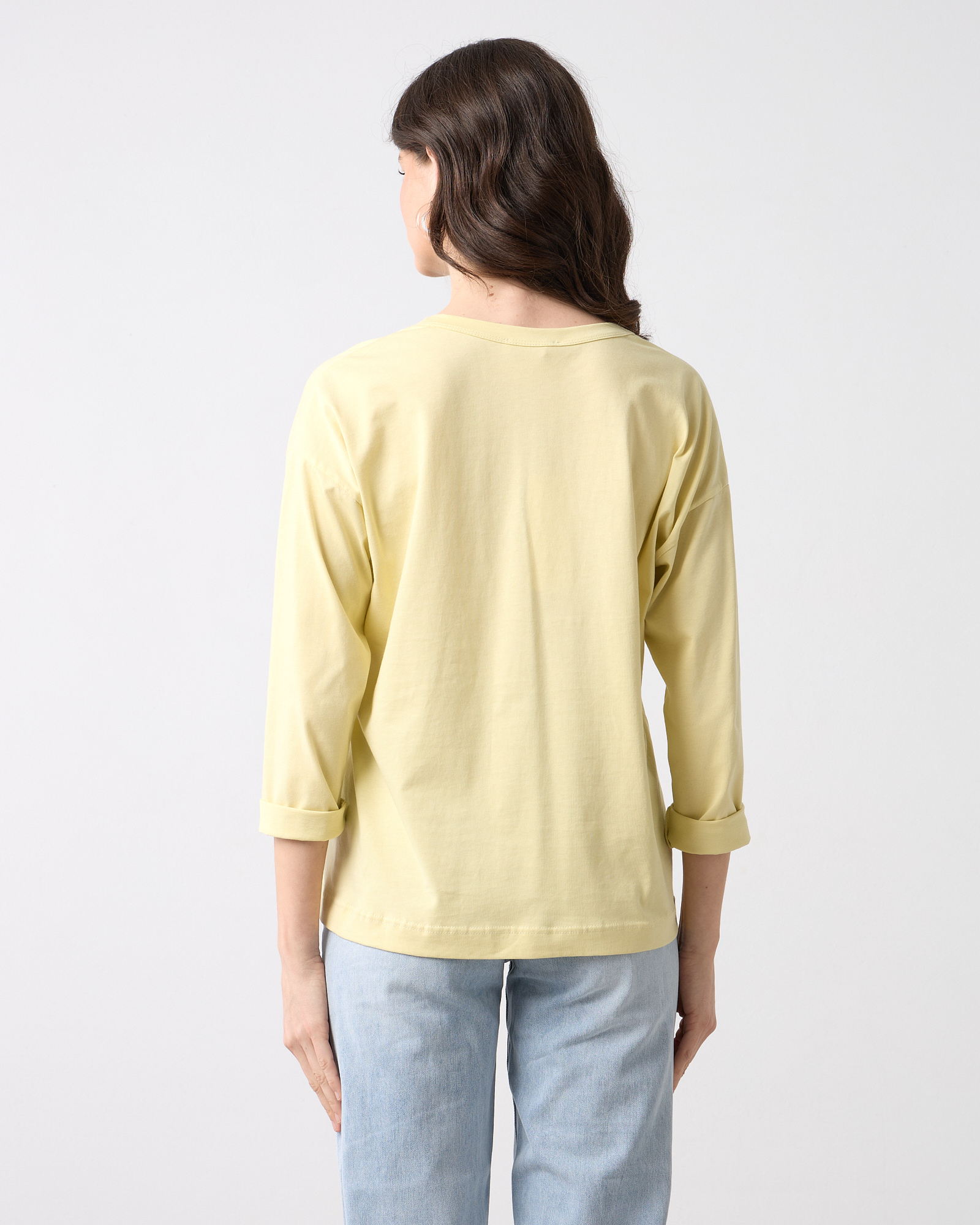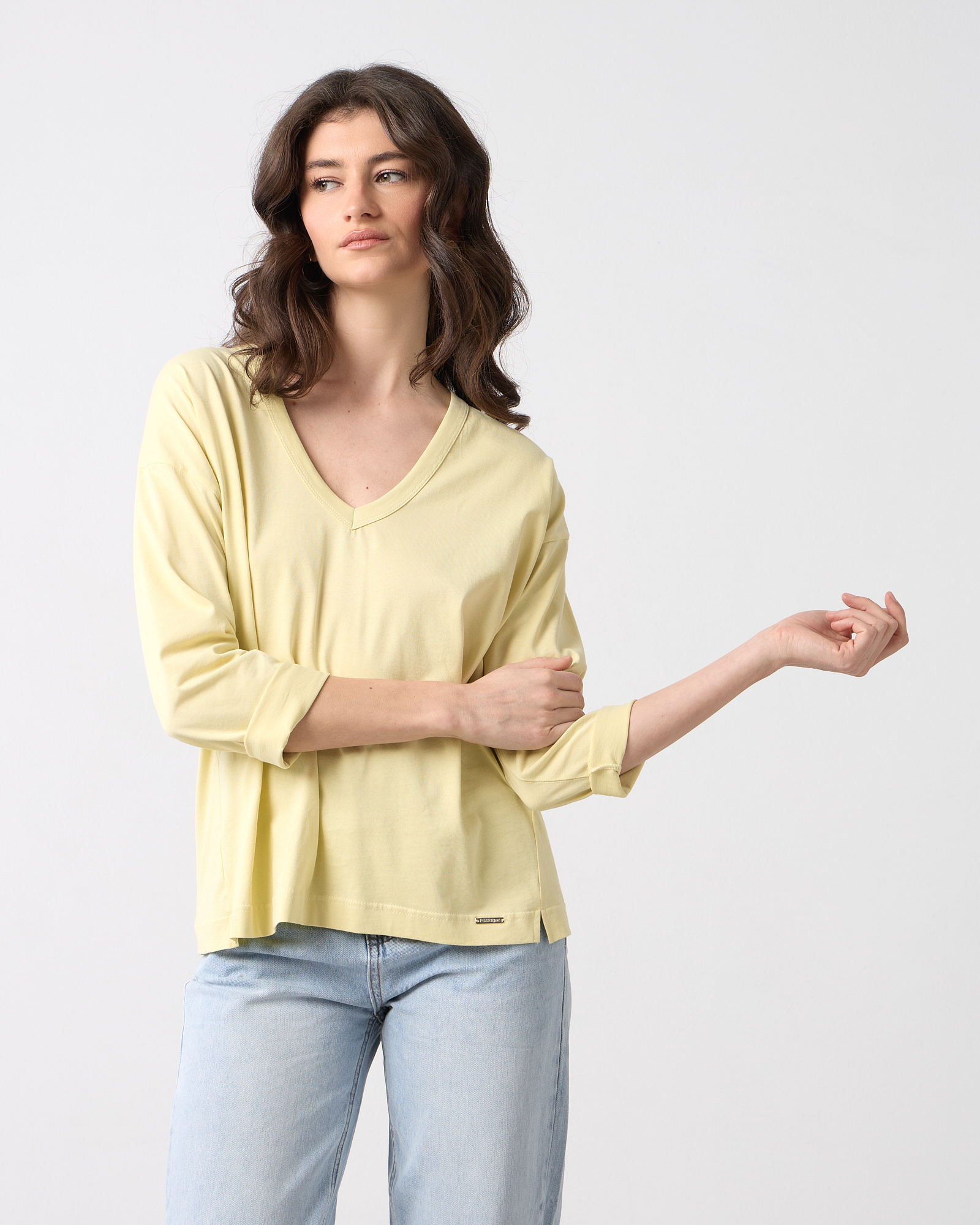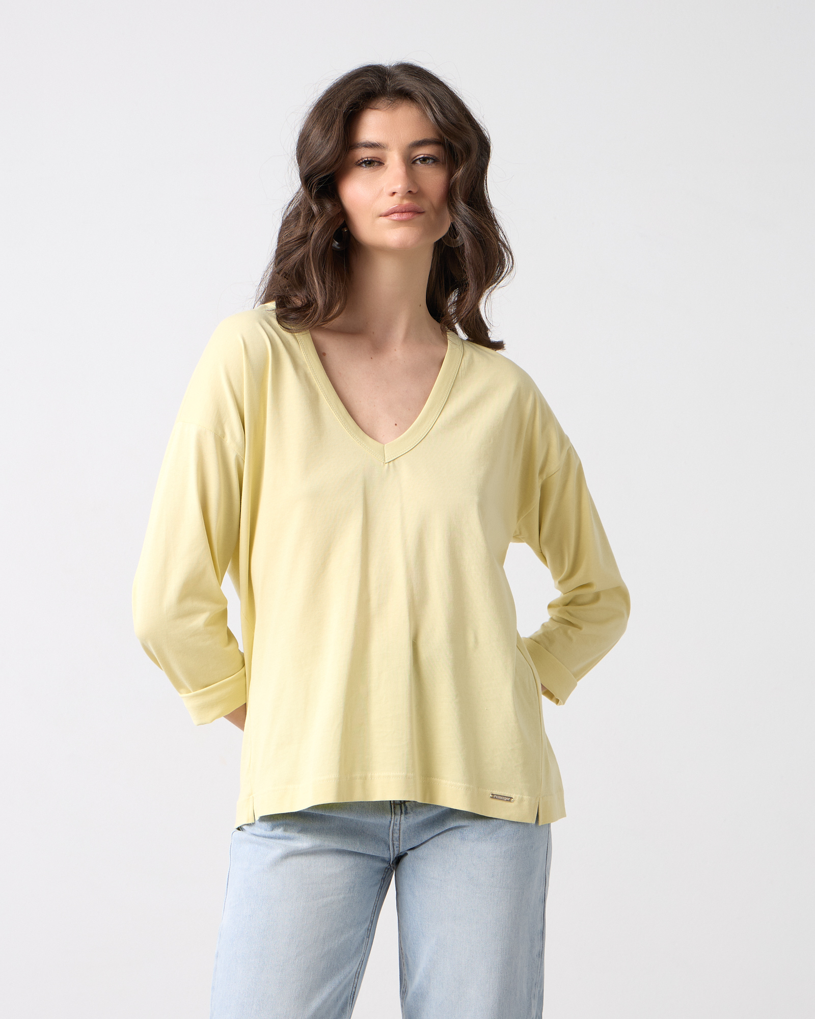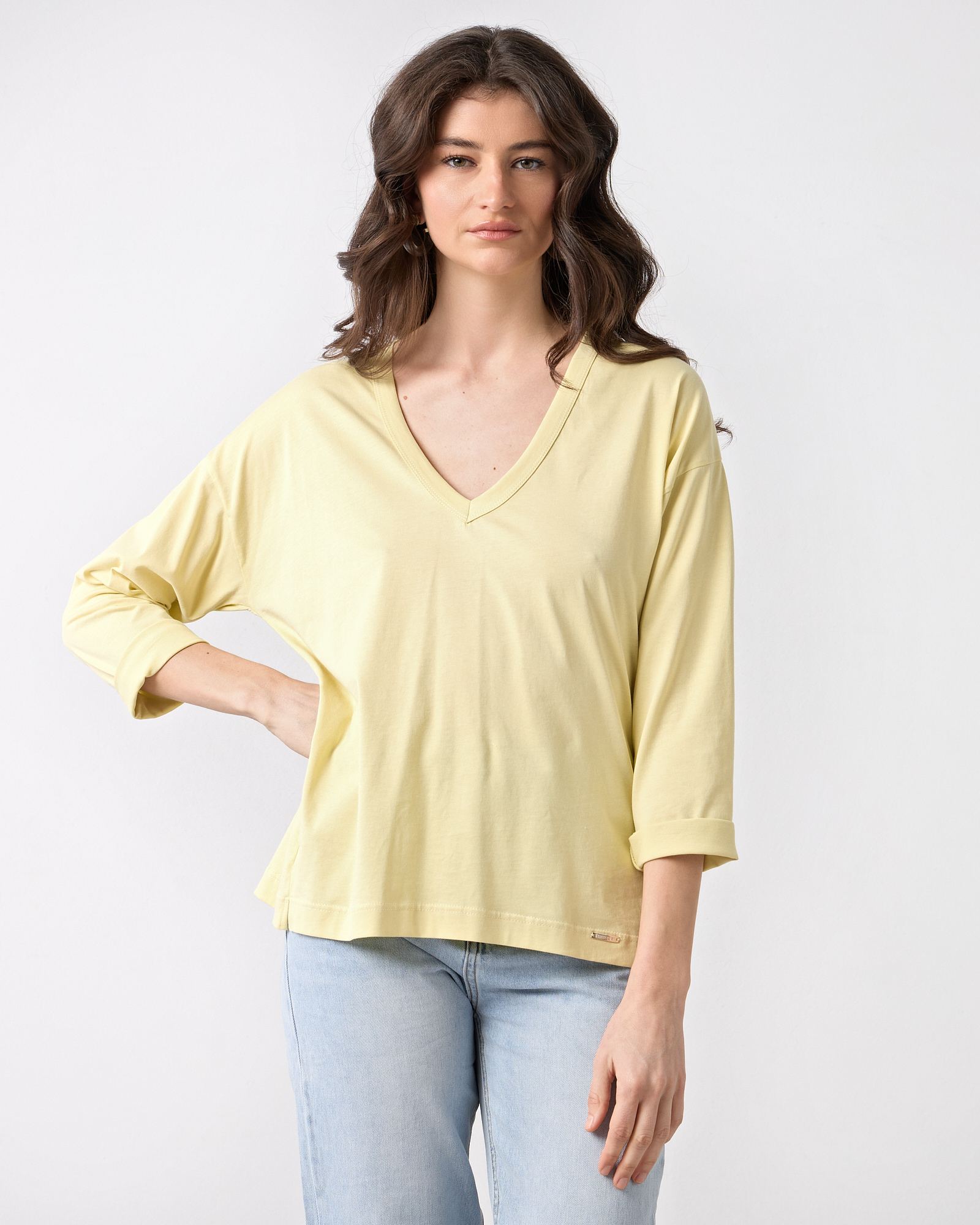 Μπλούζα basic με V λαιμόκοψη, μακρύ μανίκι, μονόχρωμη βαμβακερή, σε άνετη γραμμή