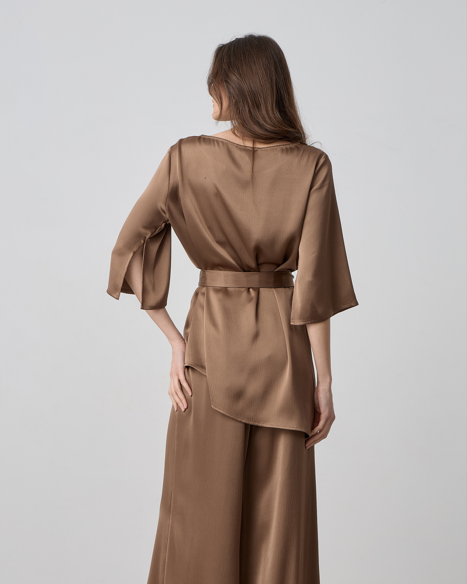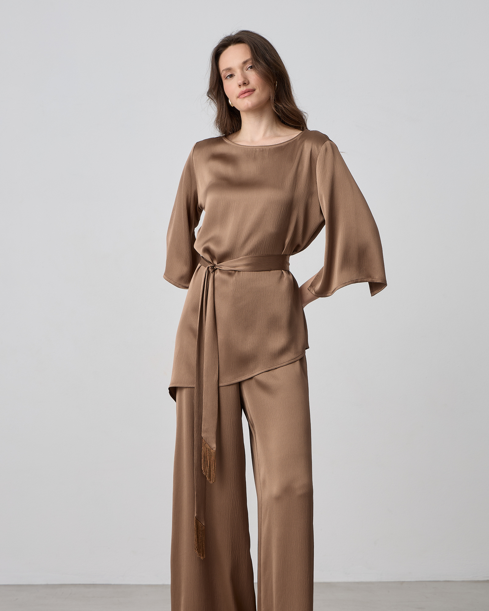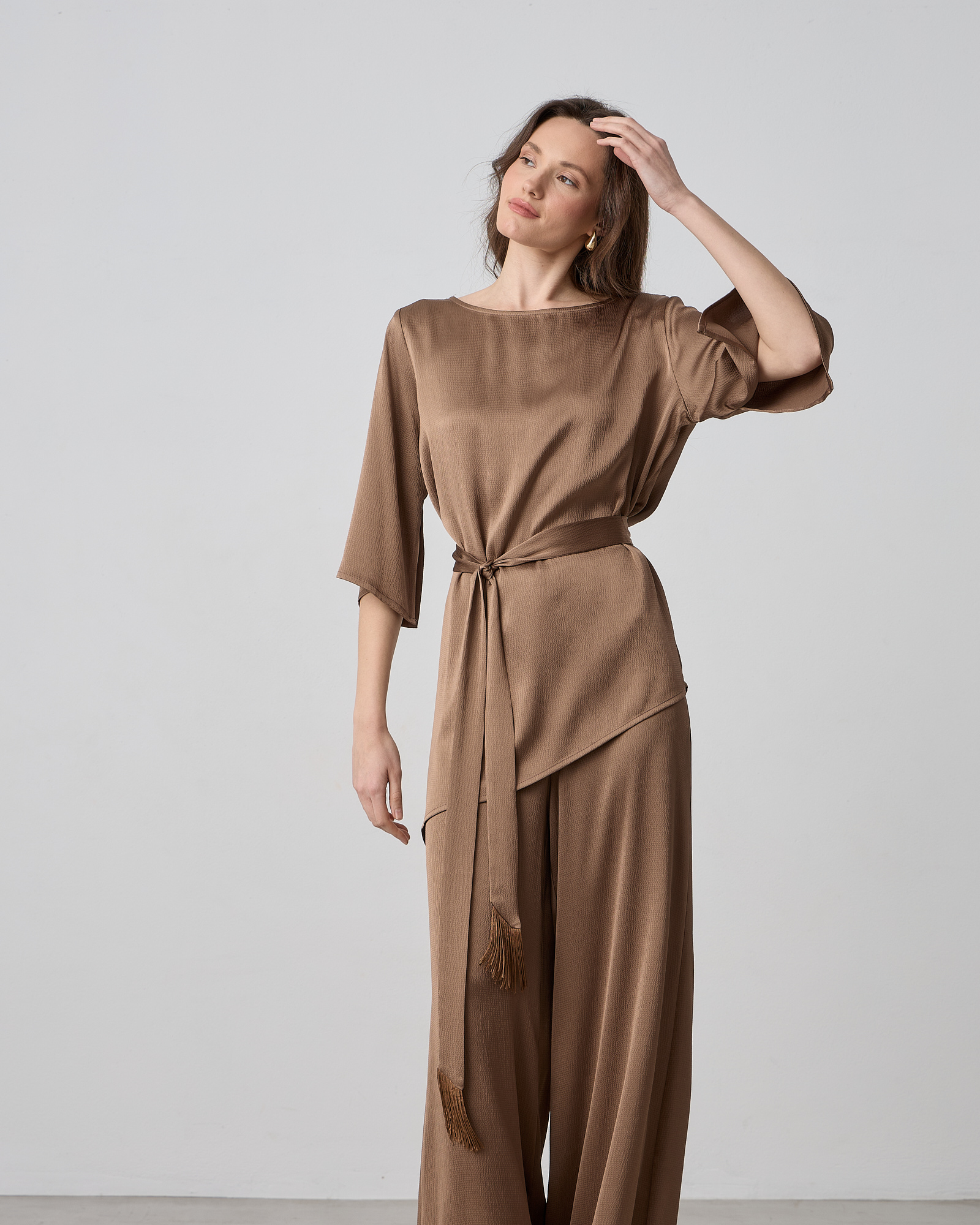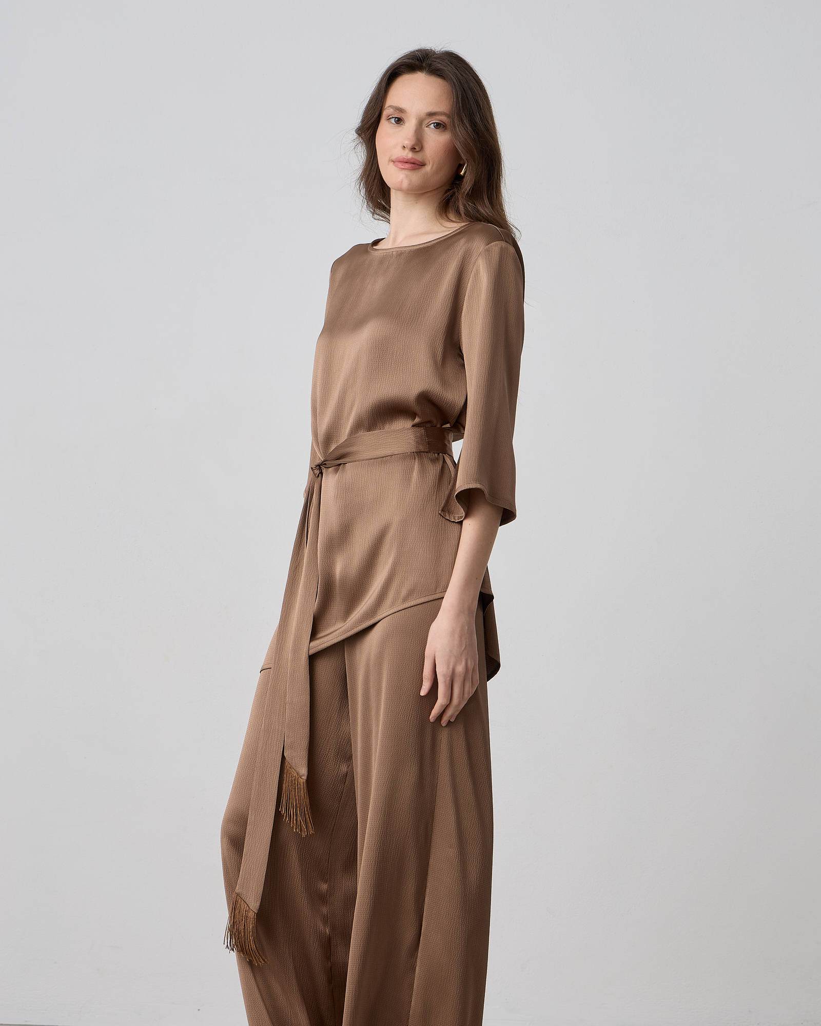 Μπλούζα σατέν με στρογγυλή λαιμόκοψη, μανίκι 3/4 με σκίσιμο, αποσπώμενη ζώνη με κρόσσια στο τελείωμα, σε άνετη γραμμή
