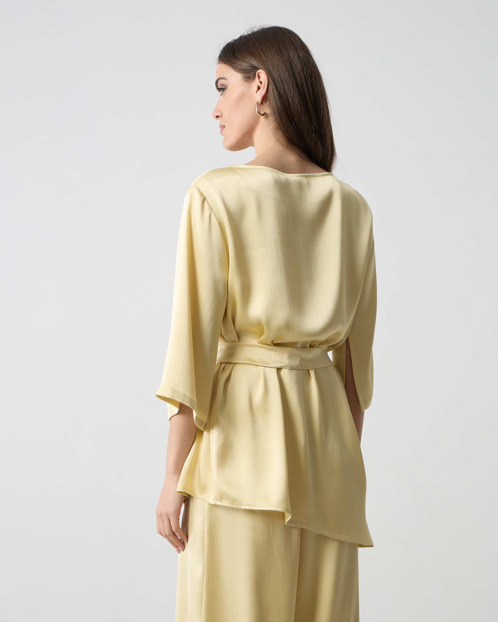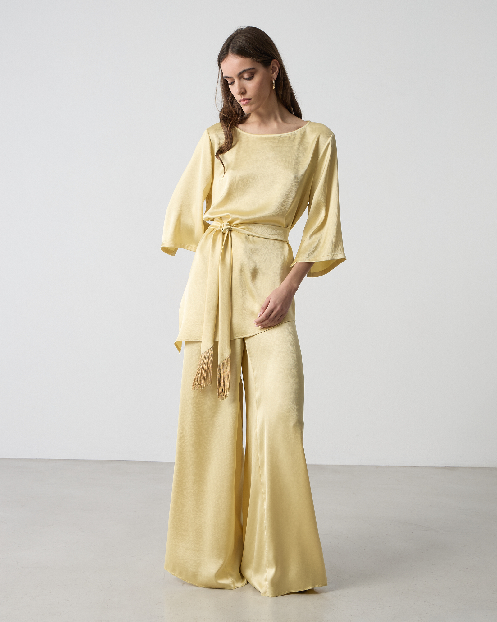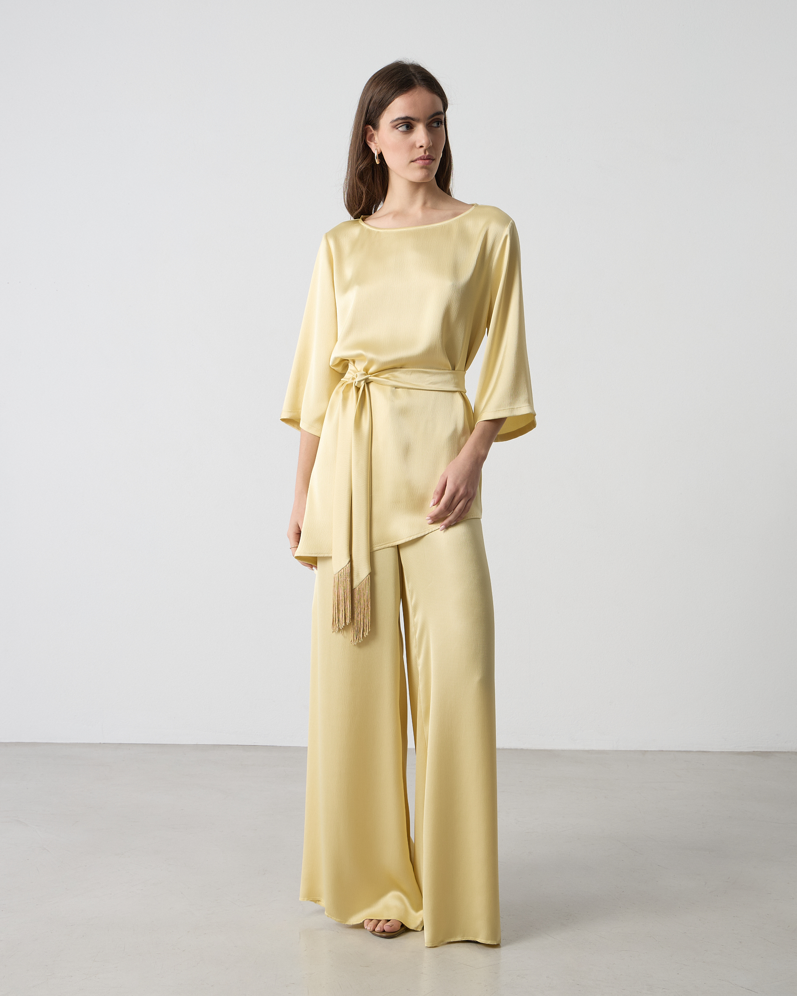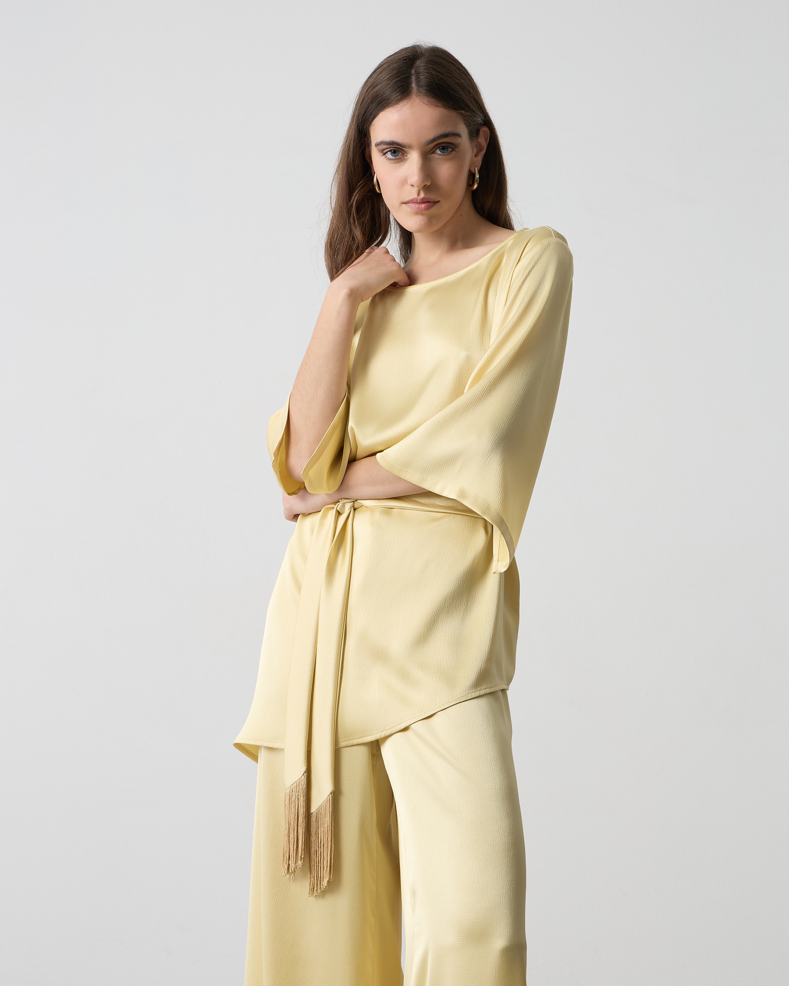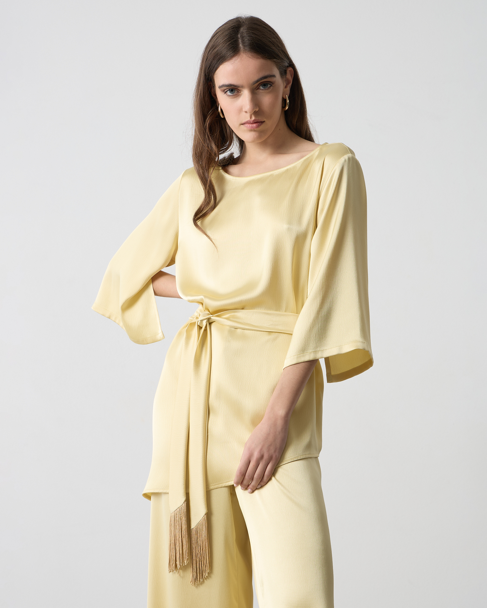 Μπλούζα σατέν με στρογγυλή λαιμόκοψη, μανίκι 3/4 με σκίσιμο, αποσπώμενη ζώνη με κρόσσια στο τελείωμα, σε άνετη γραμμή