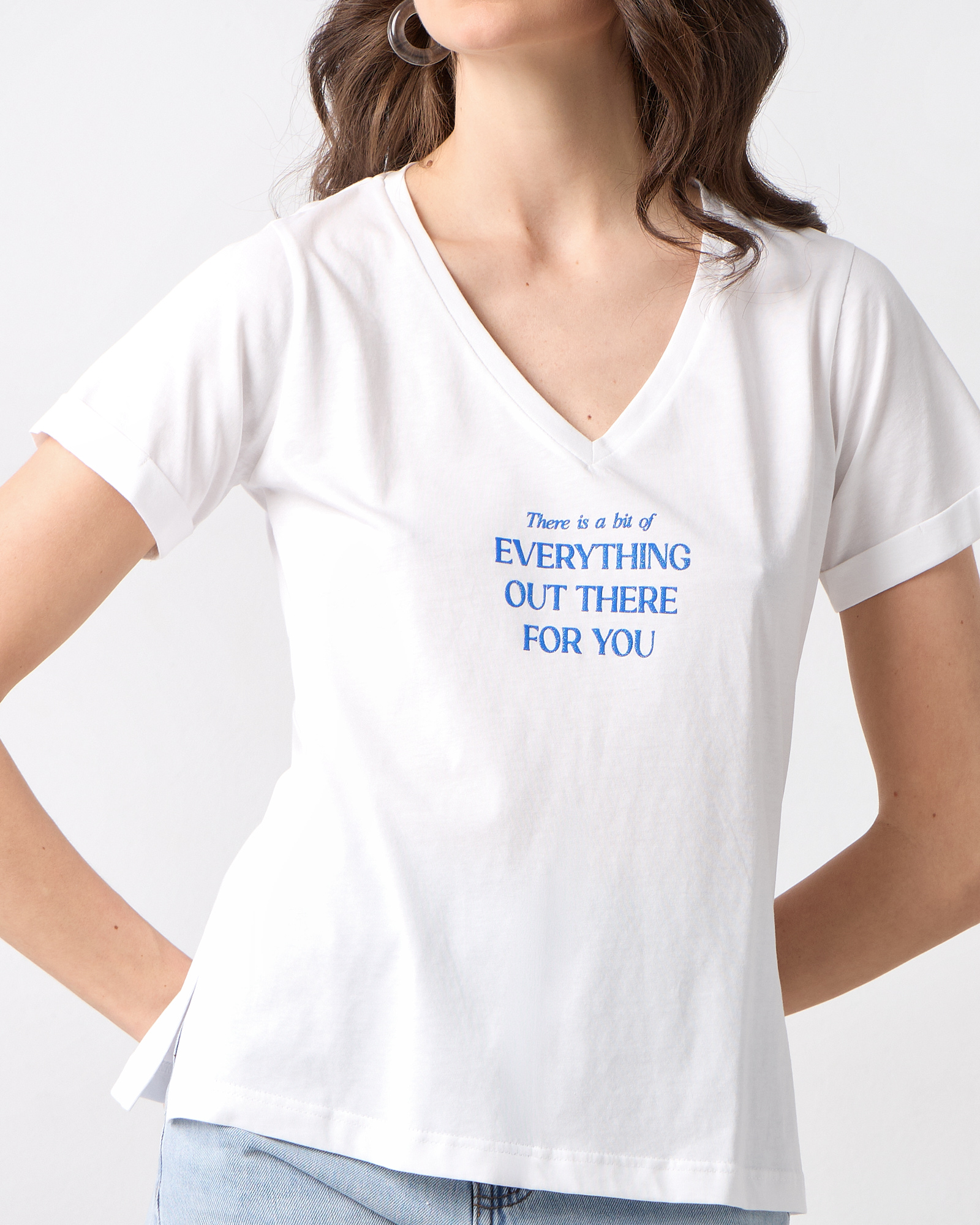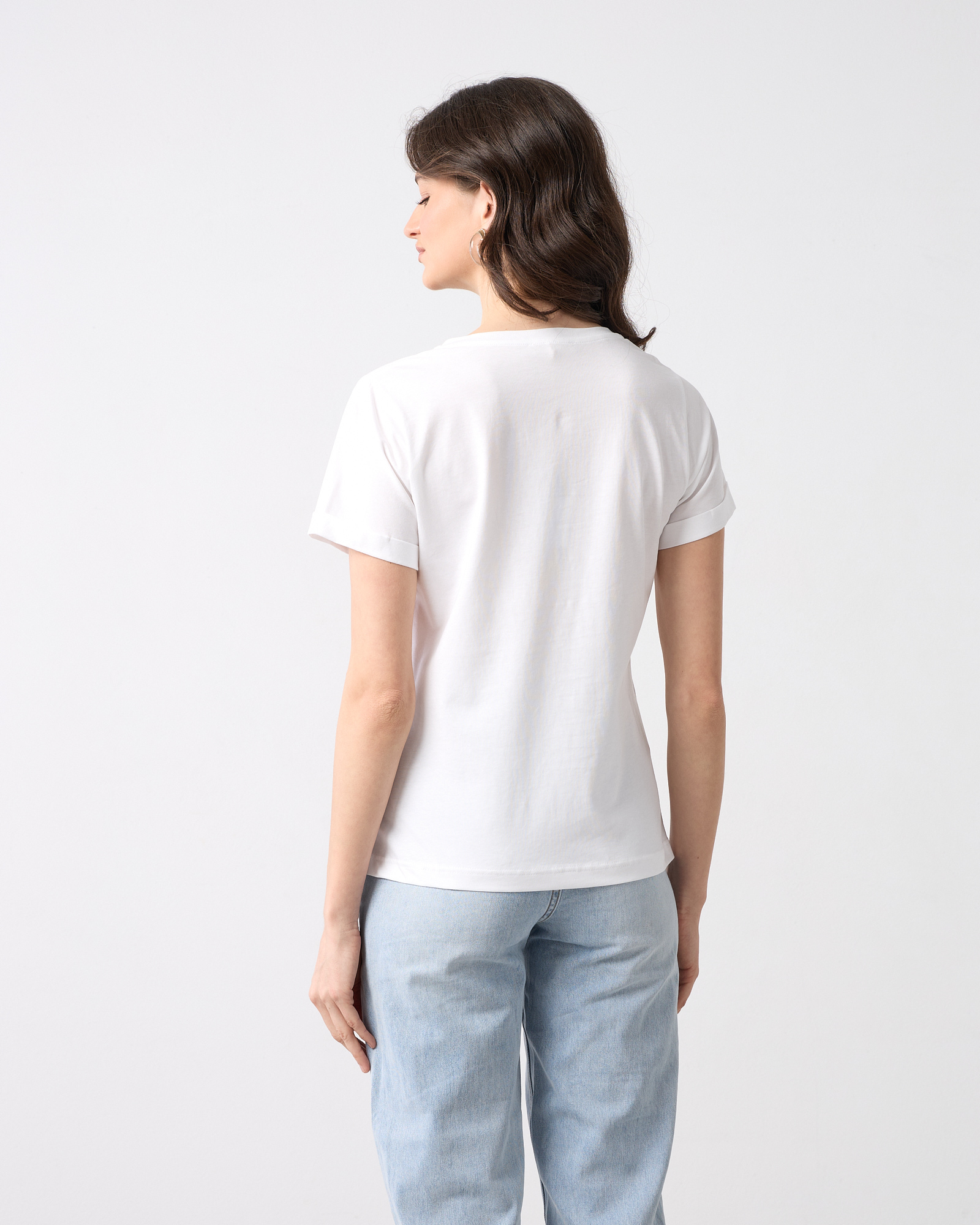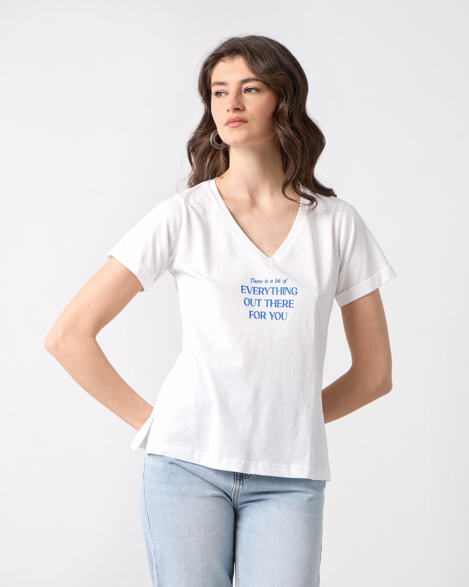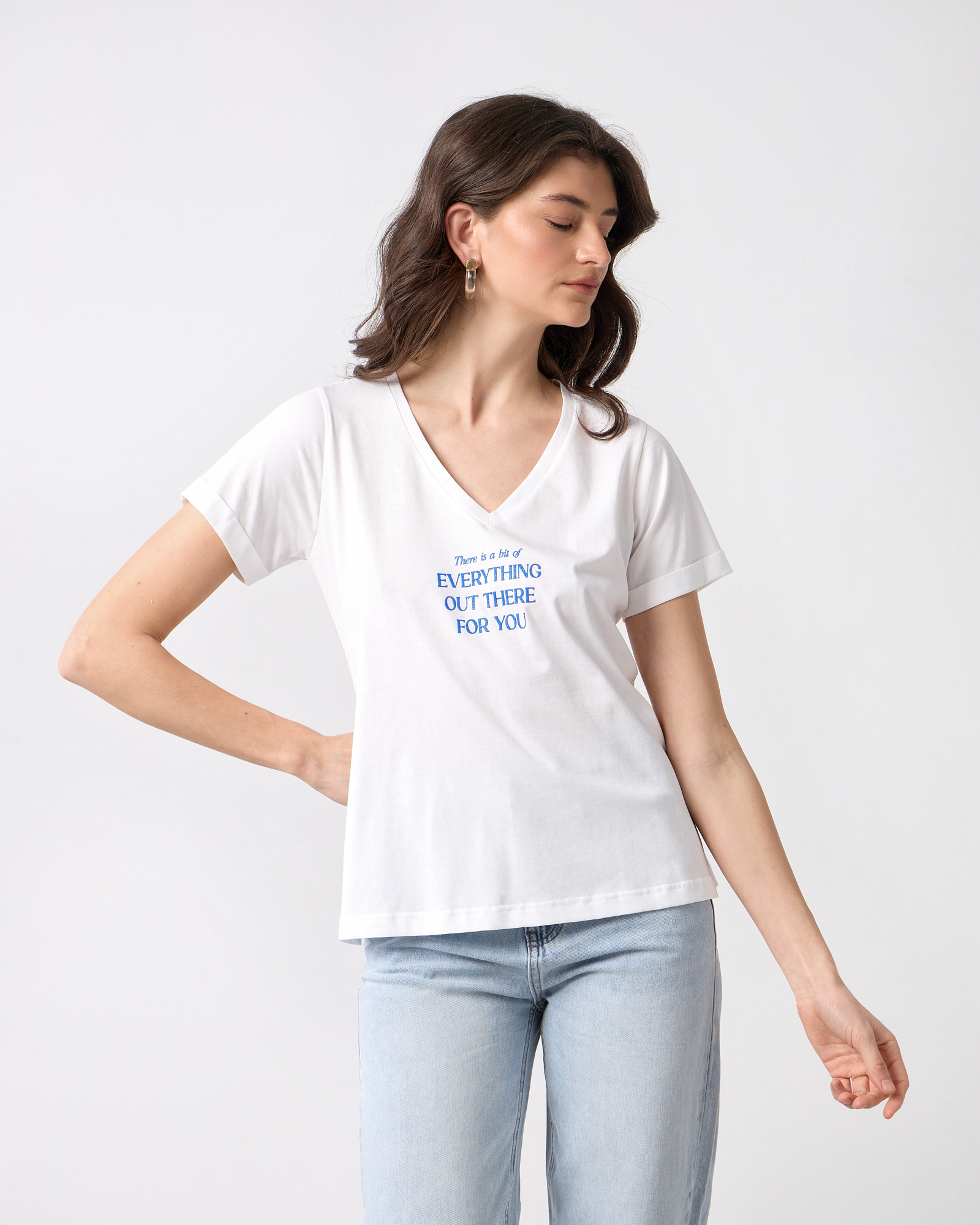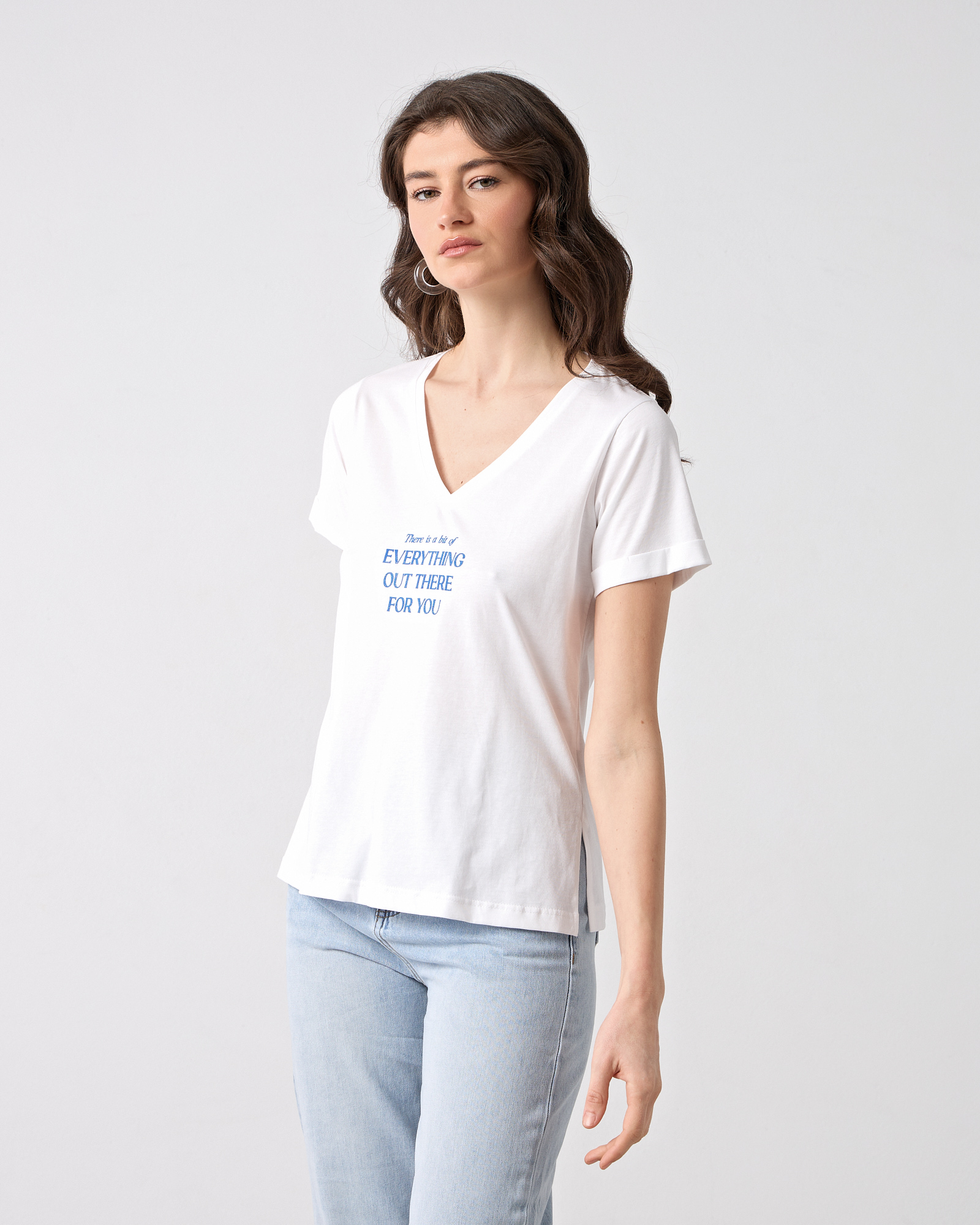 T-shirt με V λαιμόκοψη, κοντό μανίκι με ρεβέρ, τύπωμα μπροστά, βαμβακερό, σε κανονική εφαρμογή