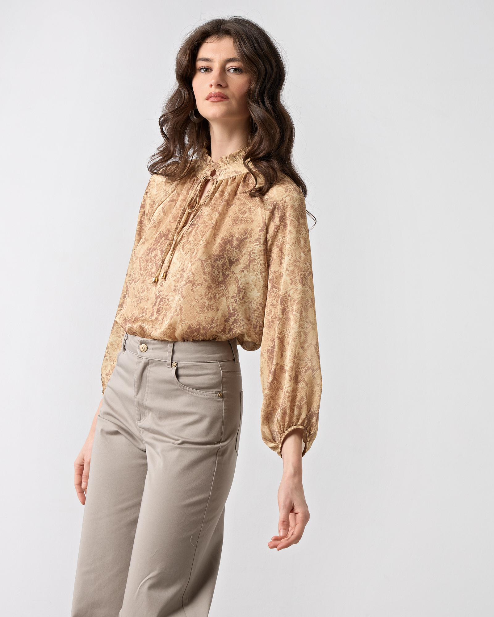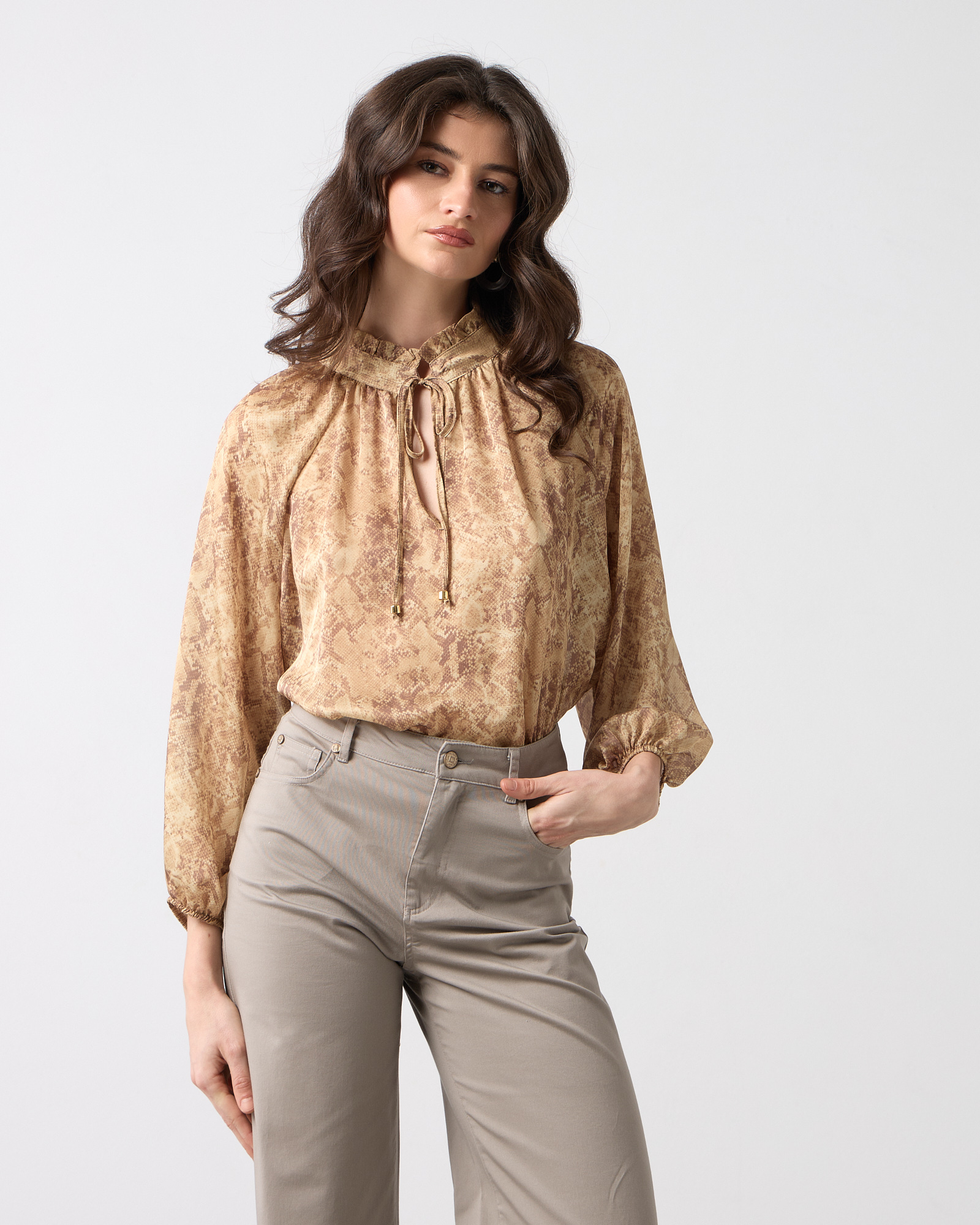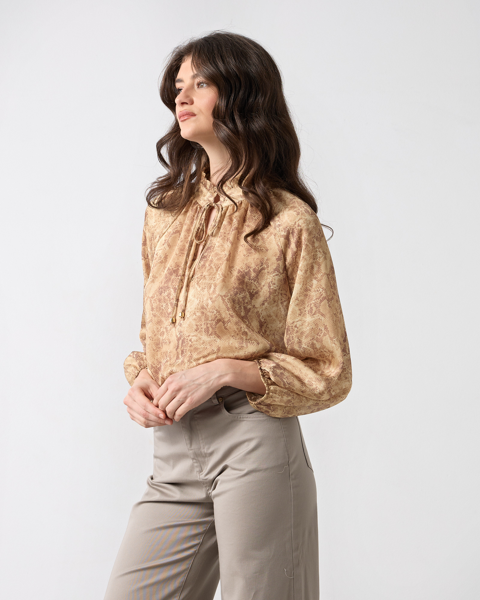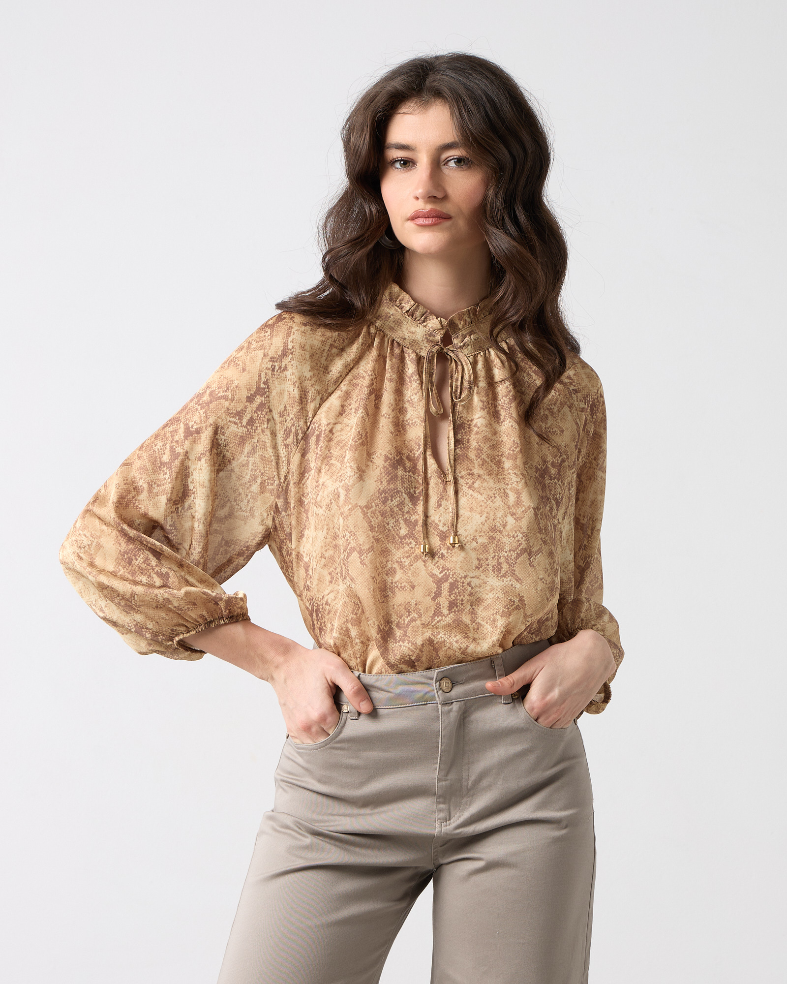 Μπλούζα animal print με μαο γιακά και μικρό φραμπαλά, μακρύ μανίκι με λάστιχο στο τελείωμα, αέρινο ύφασμα, άνετη εφαρμογή
