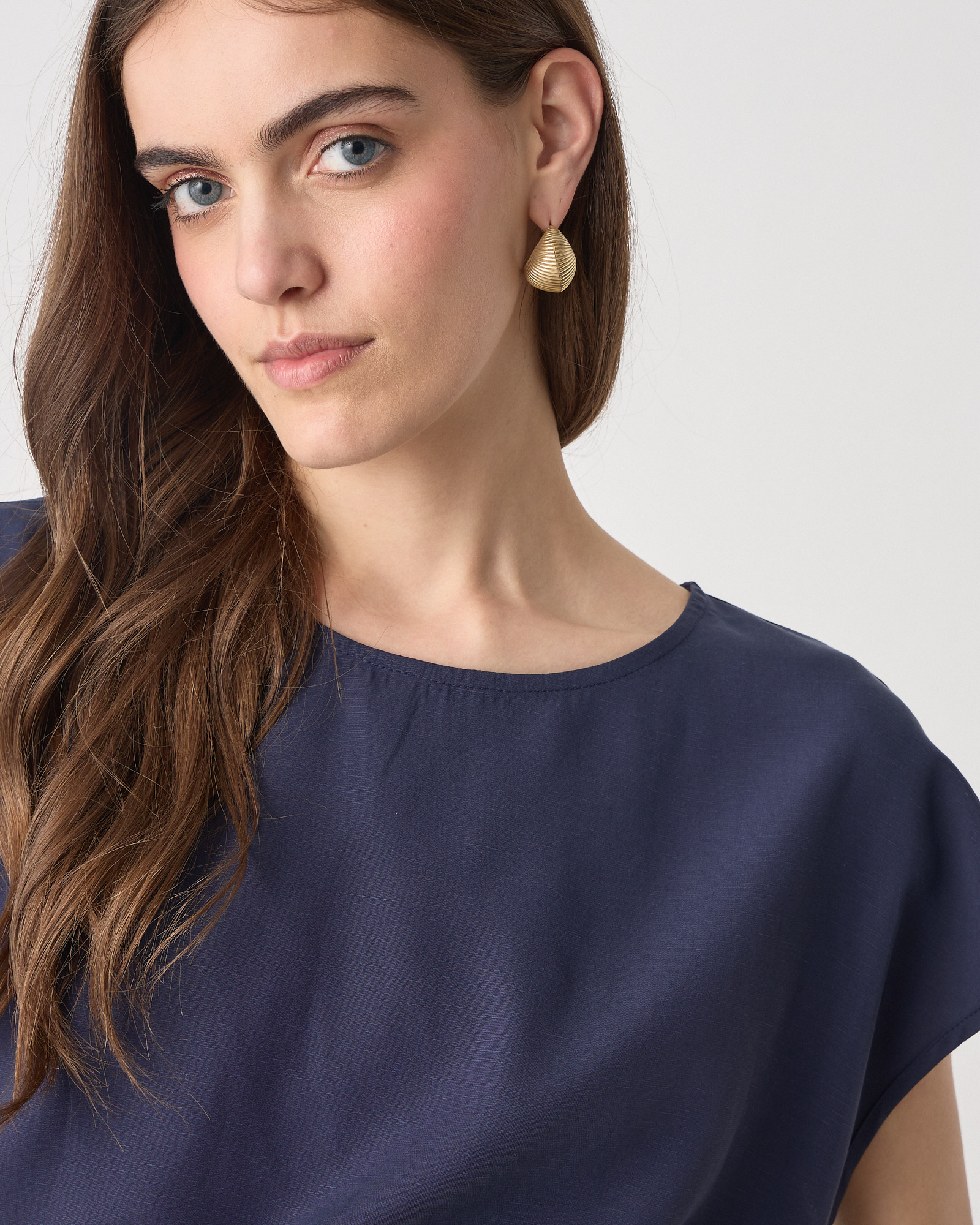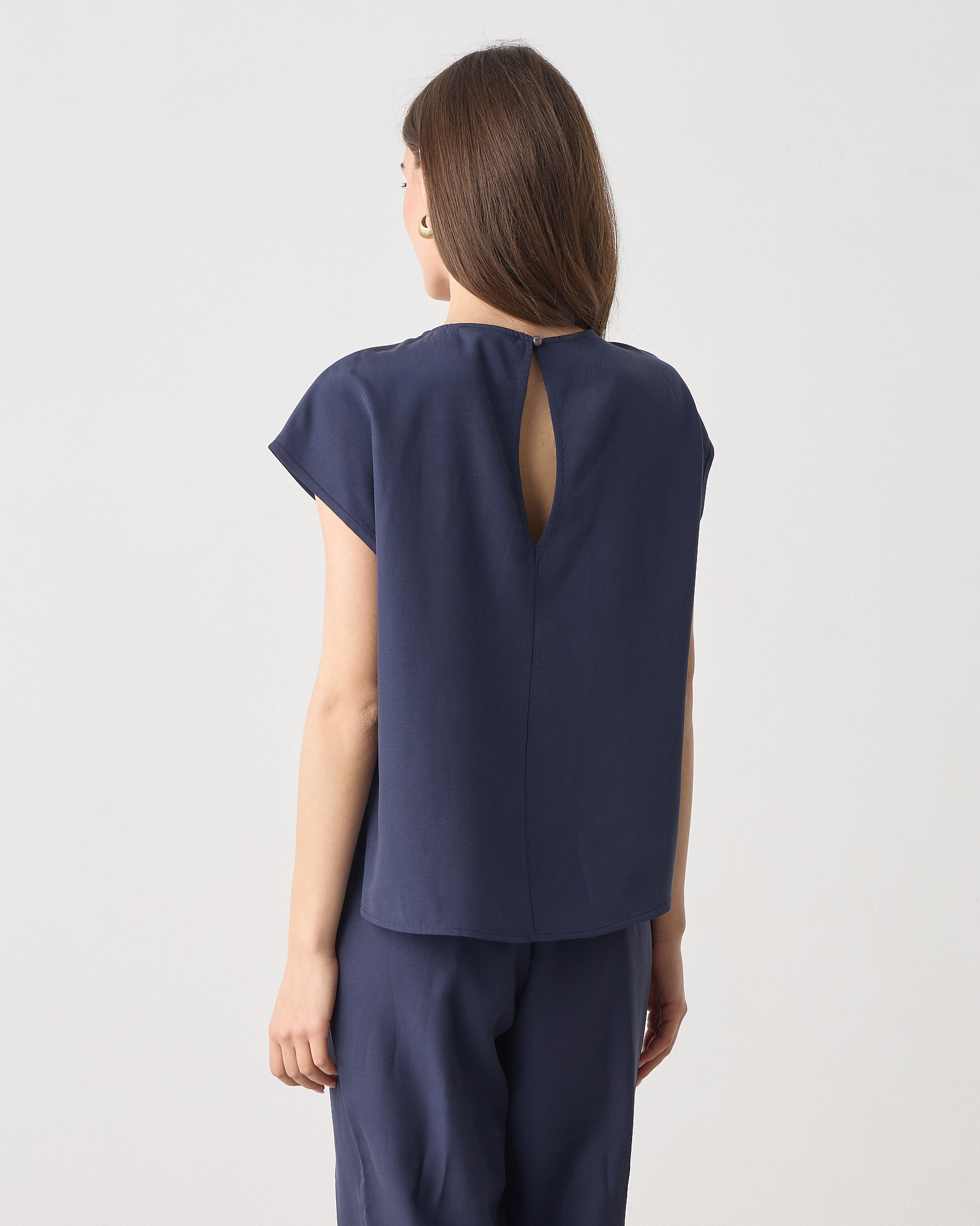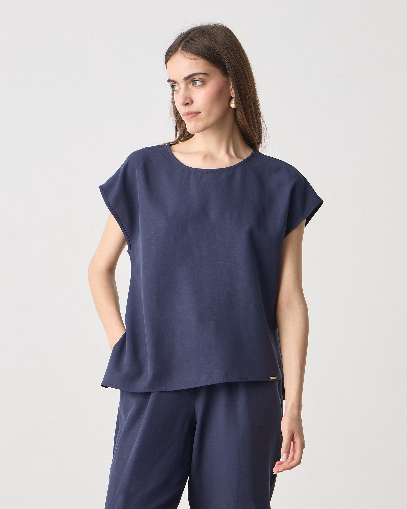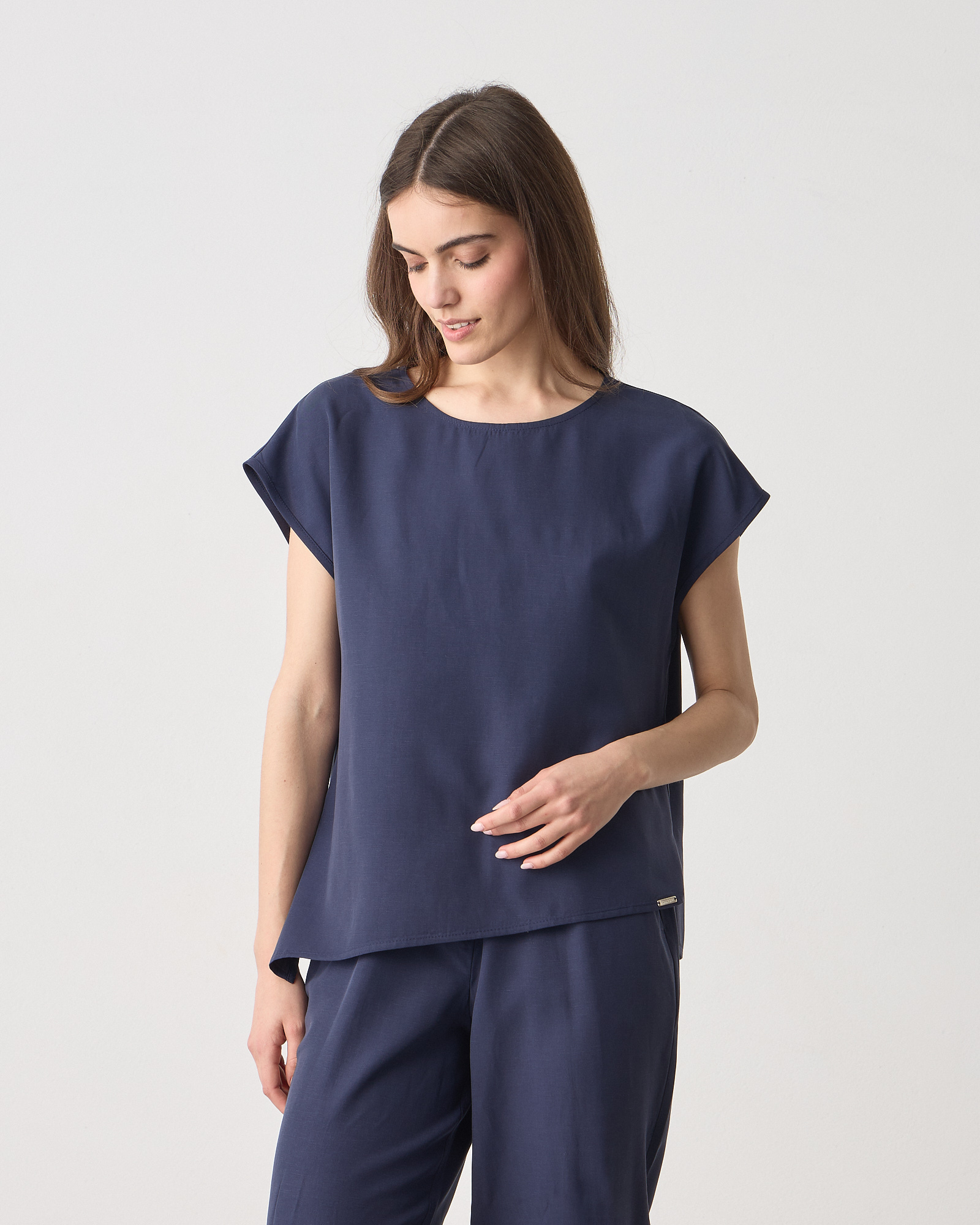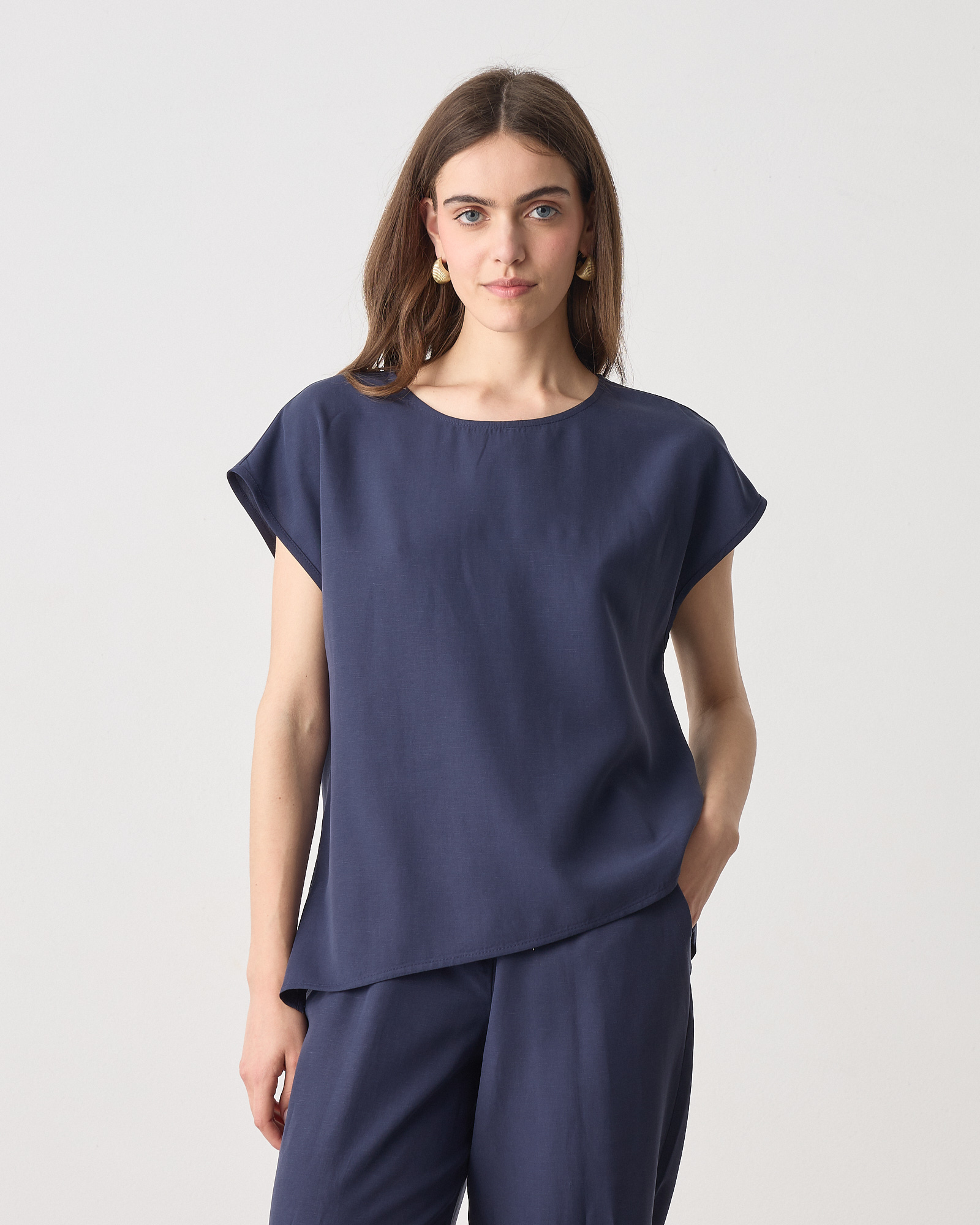Μπλούζα με κοντό μανίκι, στρογγυλή λαιμόκοψη, άνοιγμα στο πίσω μέρος και κλείσιμο με κουμπί, ασυμμετρία στο τελείωμα, σε κανονική εφαρμογή