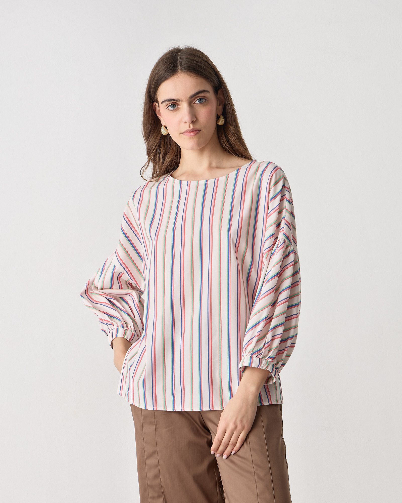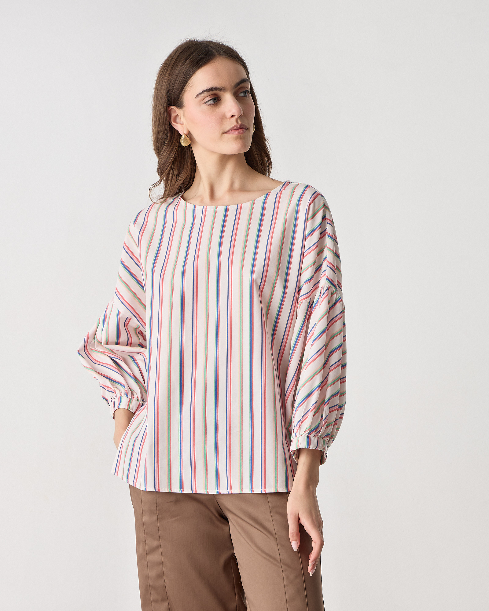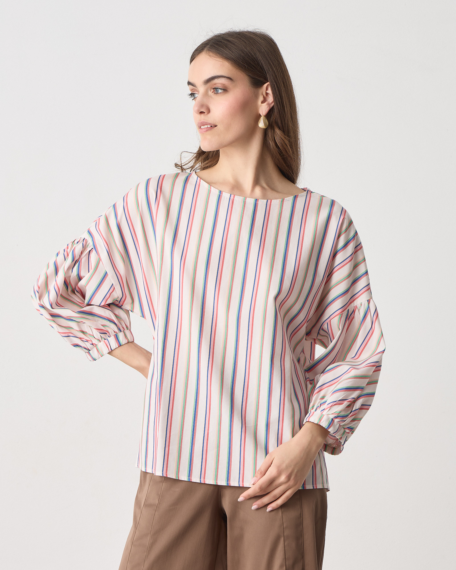 Μπλούζα ριγέ με balloon μανίκια, στρογγυλή λαιμόκοψη, βαμβακερή σε loose γραμμή