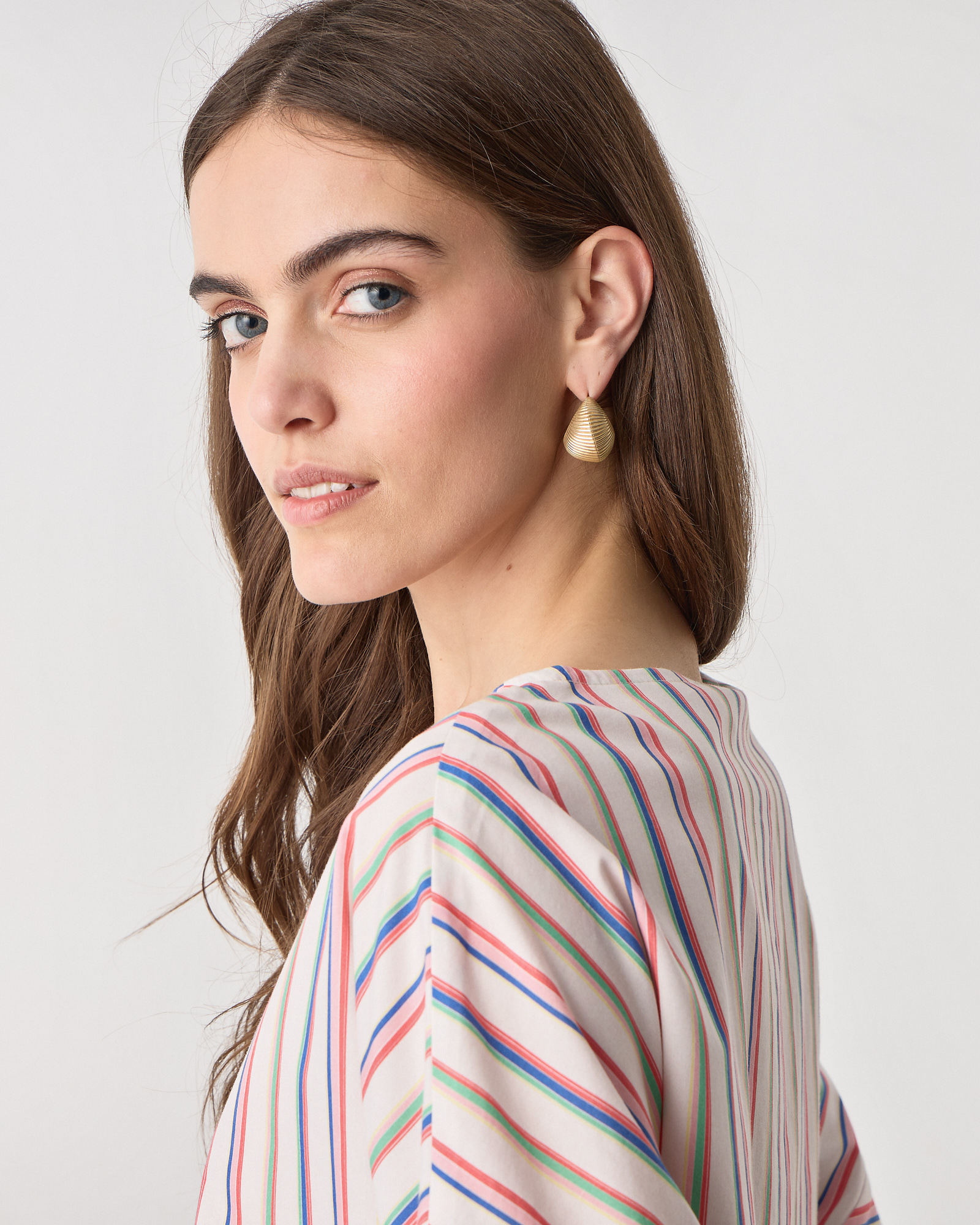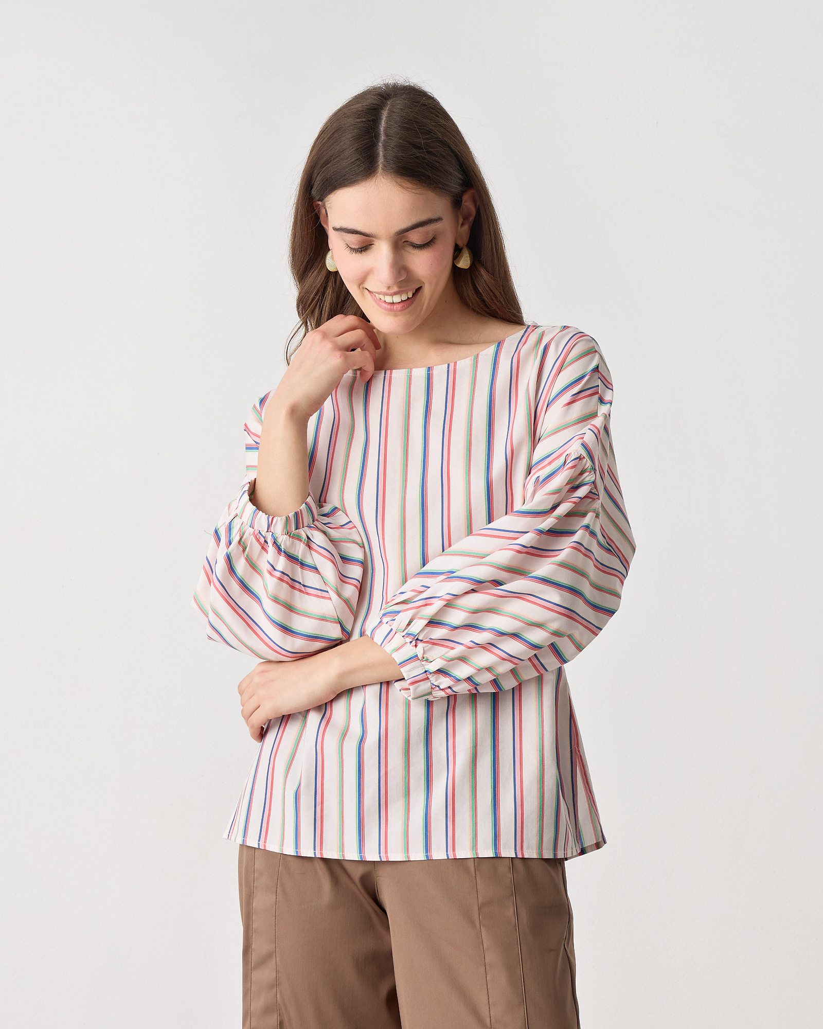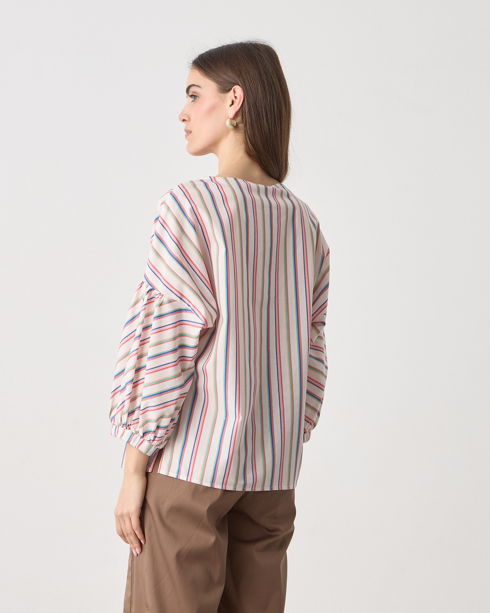 Μπλούζα ριγέ με balloon μανίκια, στρογγυλή λαιμόκοψη, βαμβακερή σε loose γραμμή