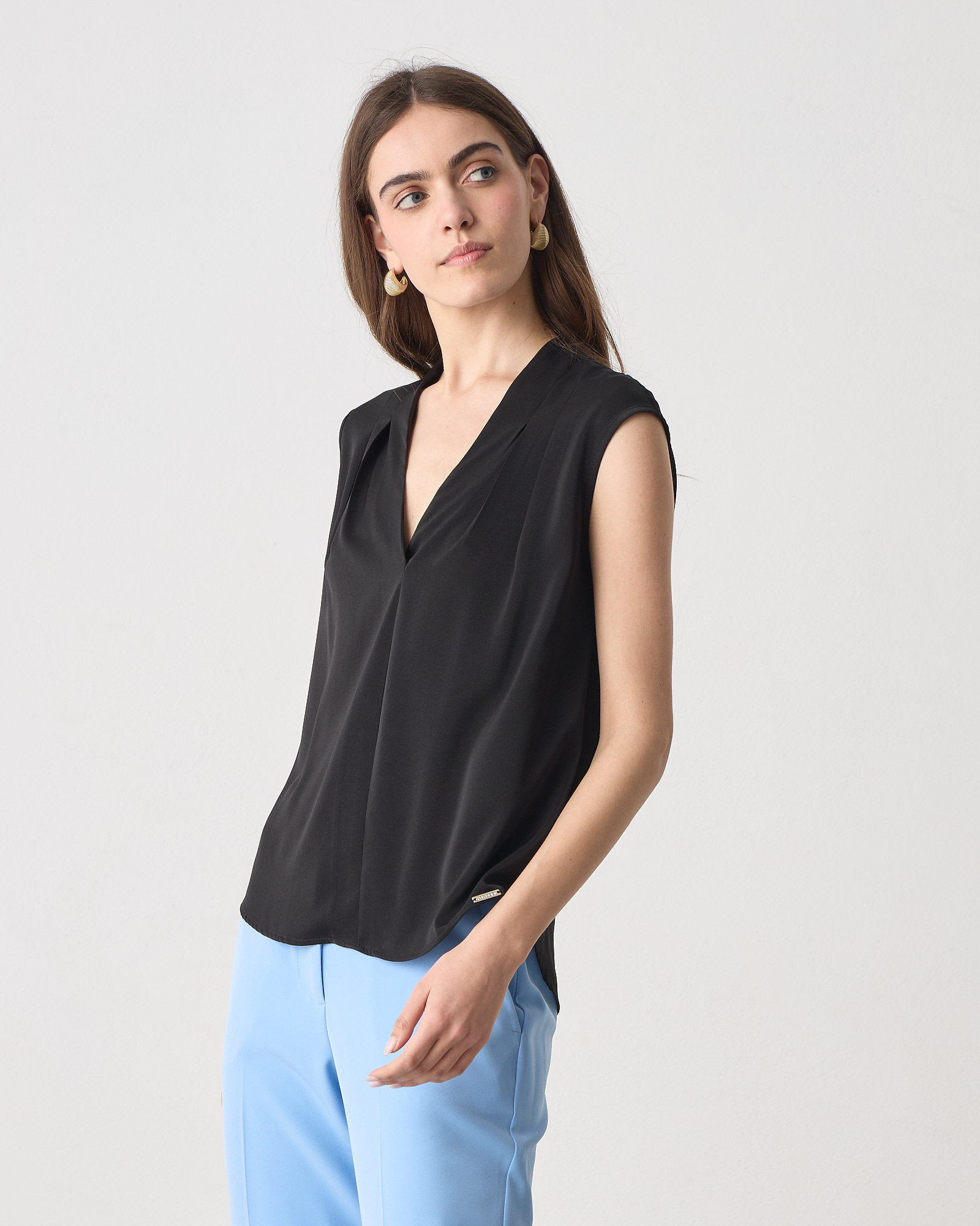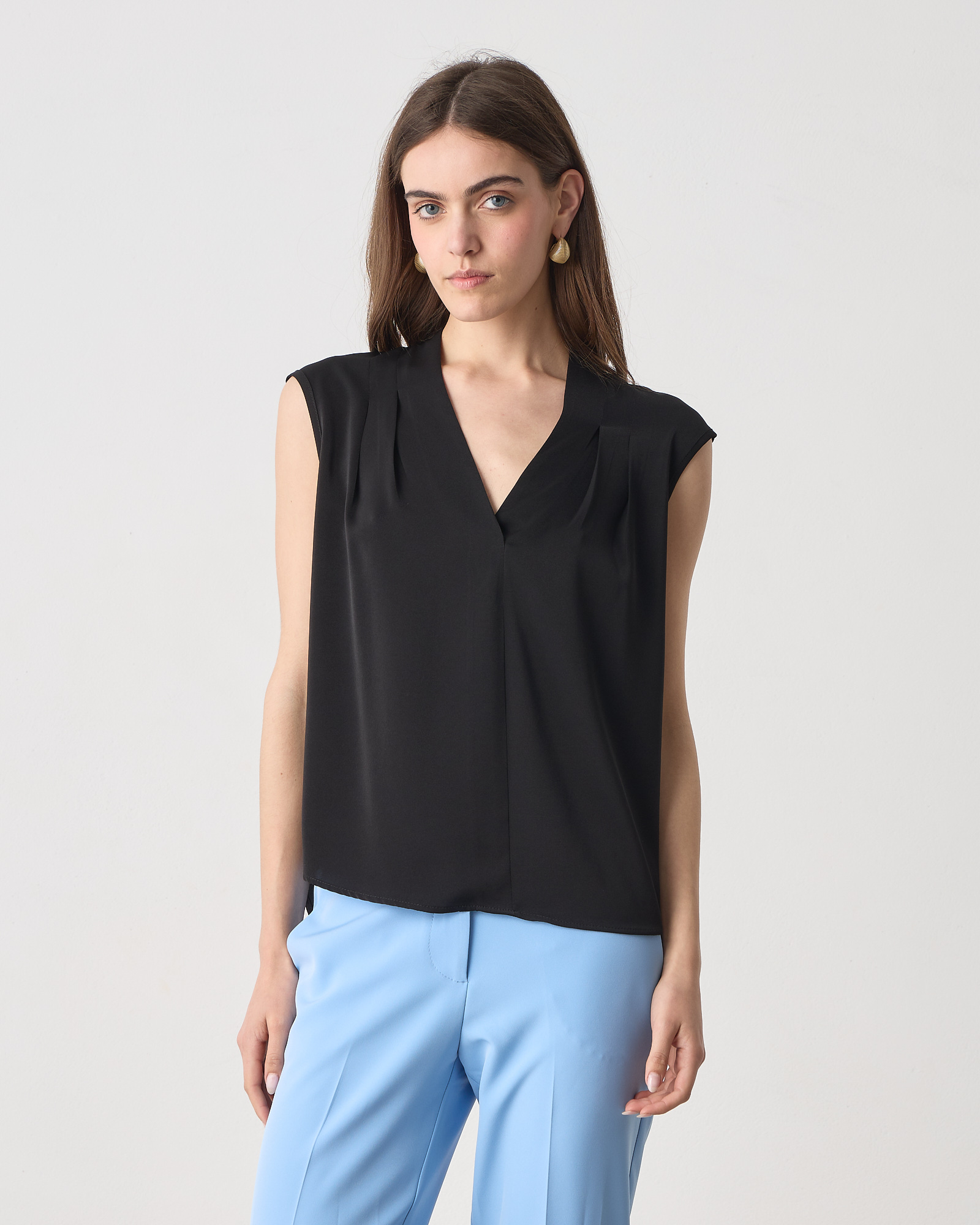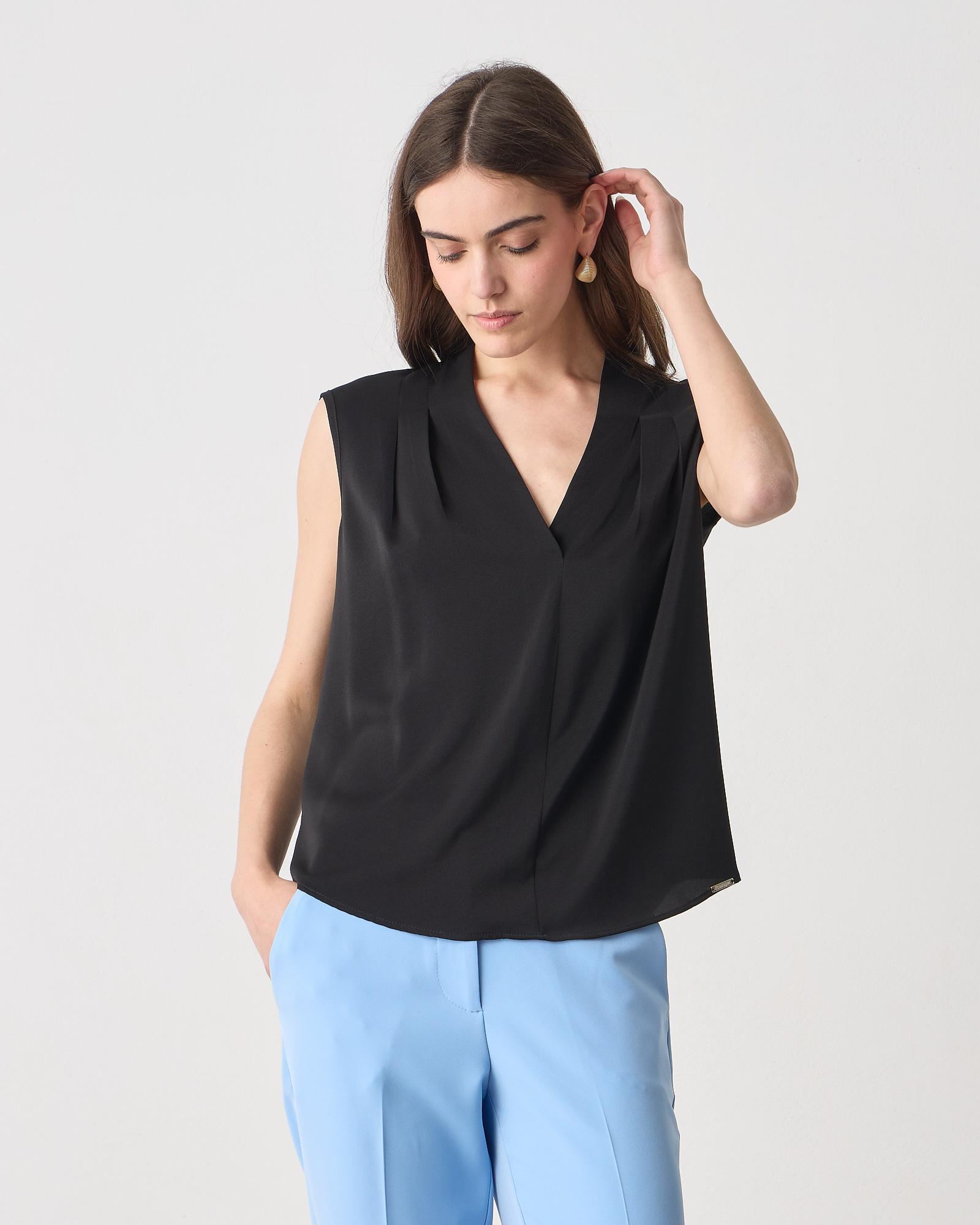 Μπλούζα αμάνικη με V λαιμόκοψη, πιέτες στους ώμους, σε αέρινο ύφασμα, κανονική εφαρμογή