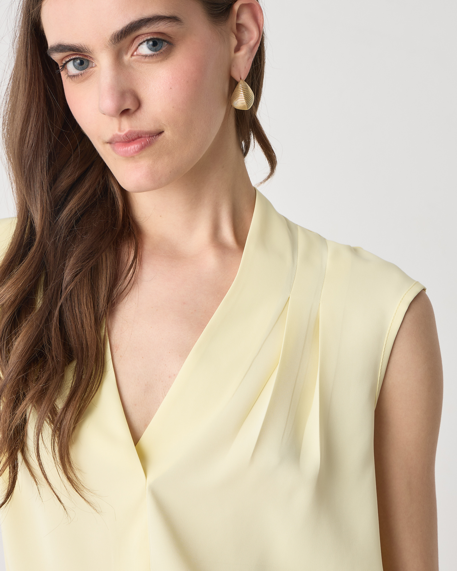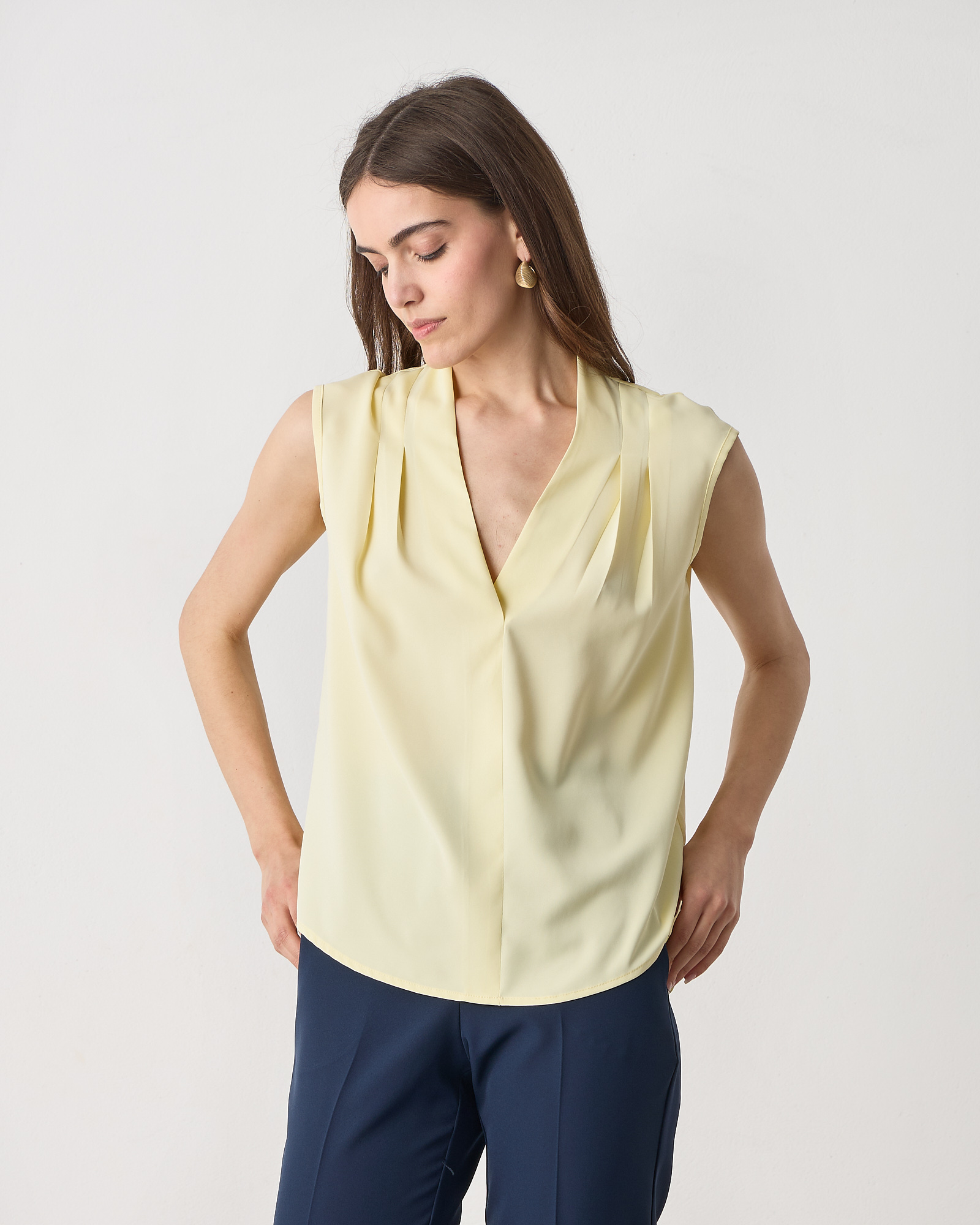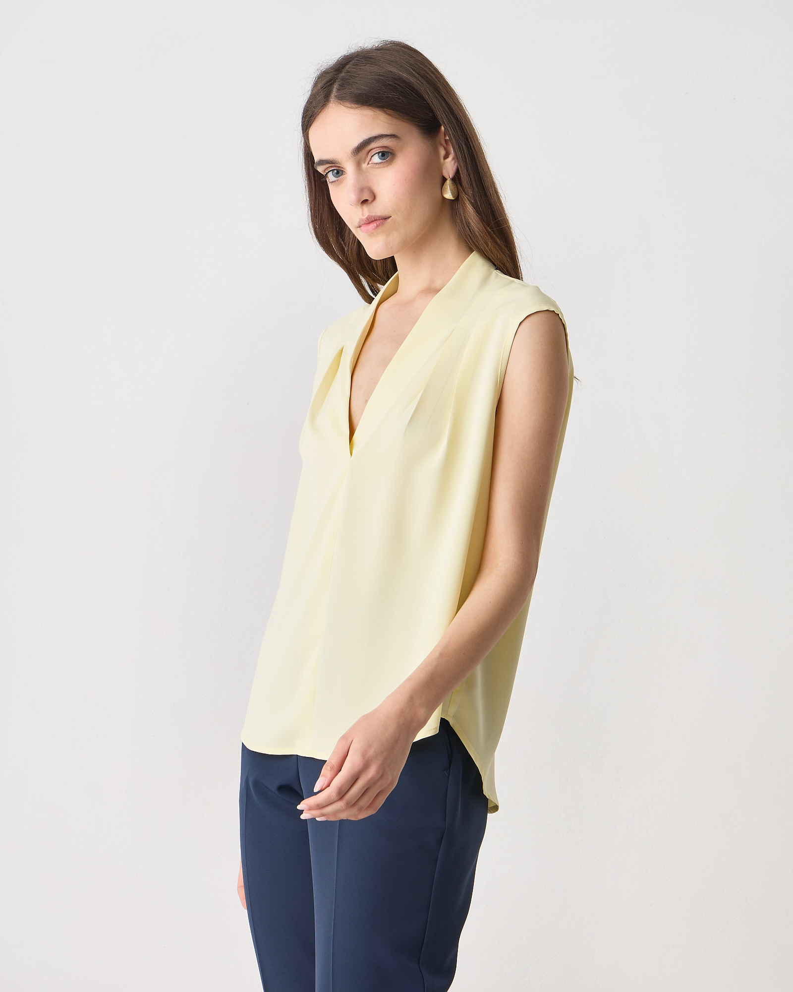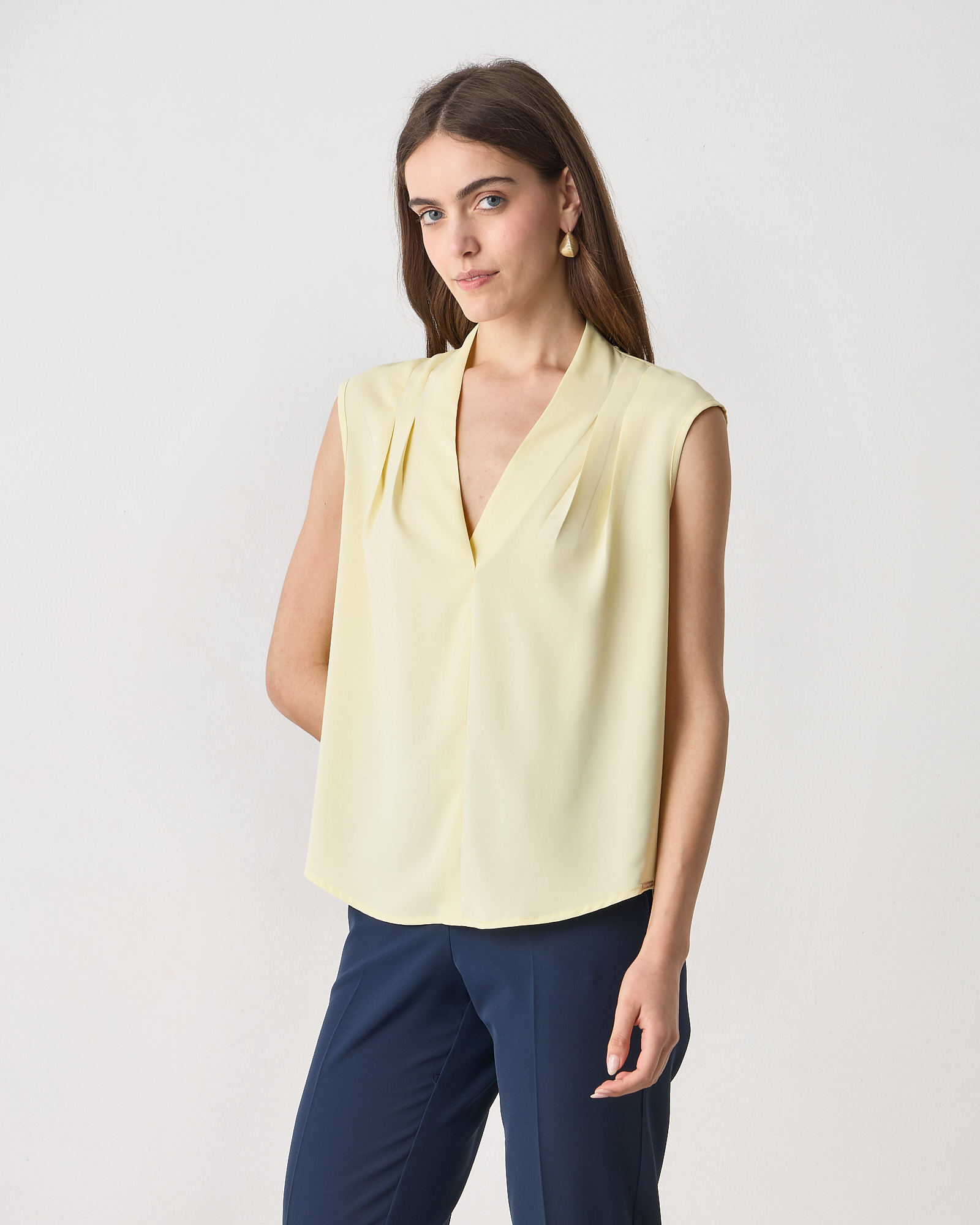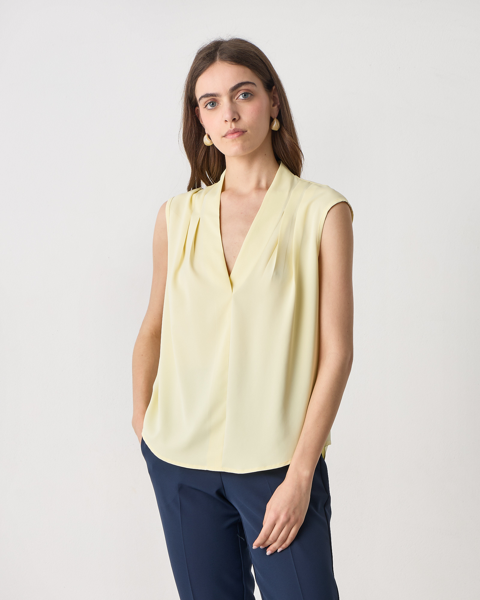 Μπλούζα αμάνικη με V λαιμόκοψη, πιέτες στους ώμους, σε αέρινο ύφασμα, κανονική εφαρμογή